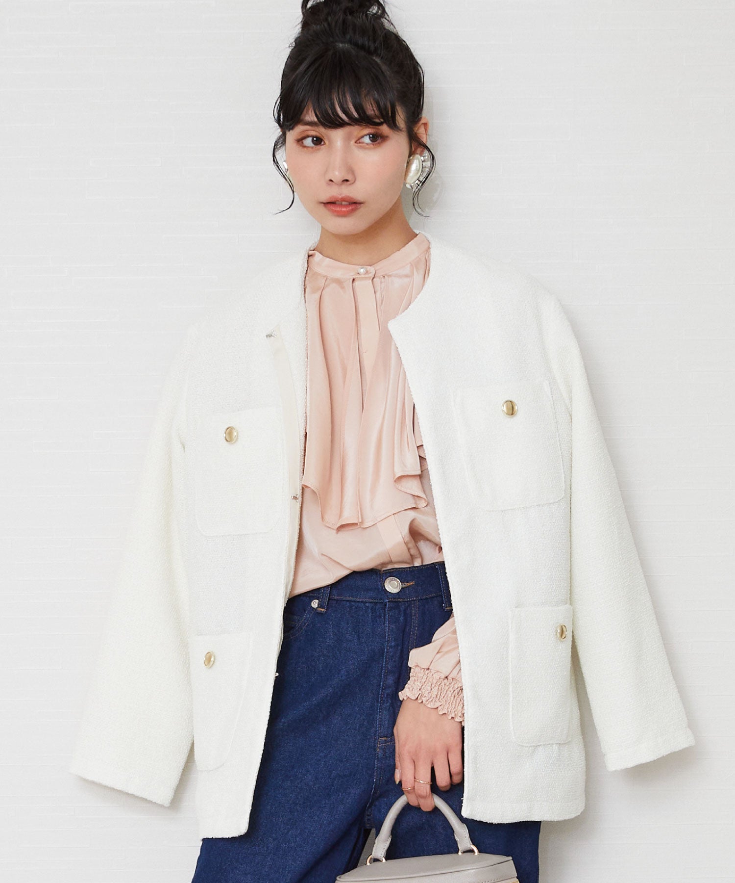 モコモコとした生地感が大人フェミニンな印象のツイードジャケット。