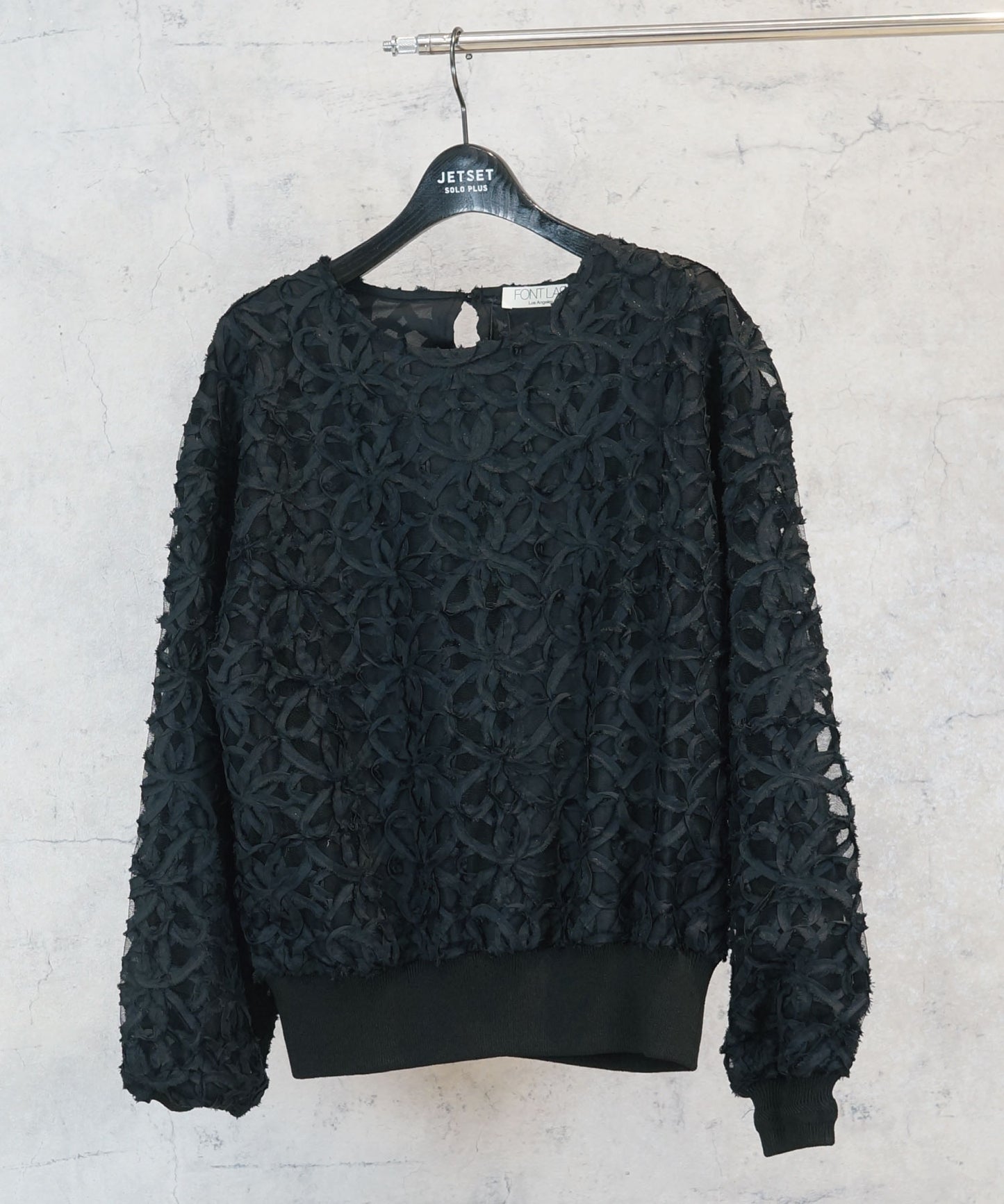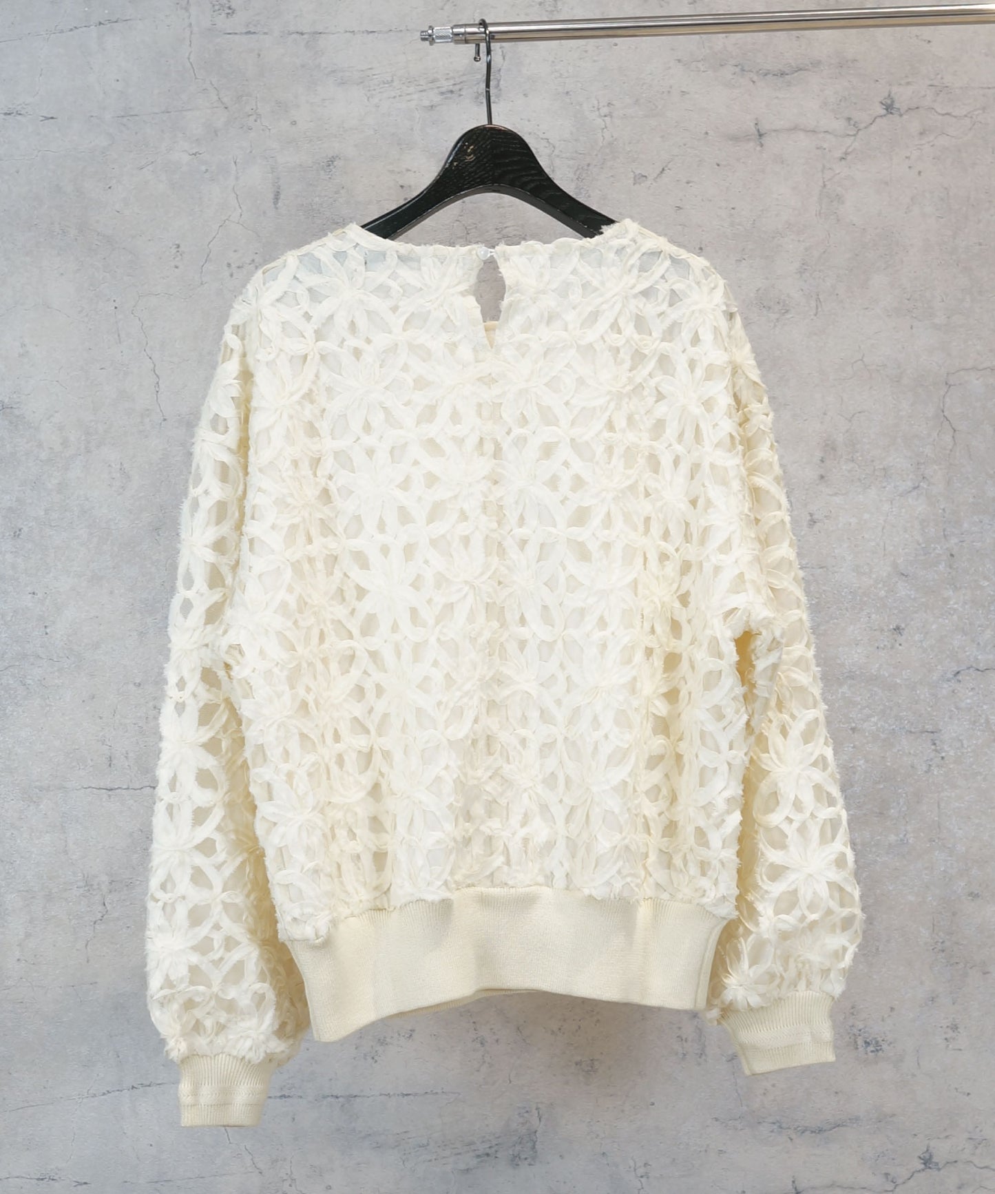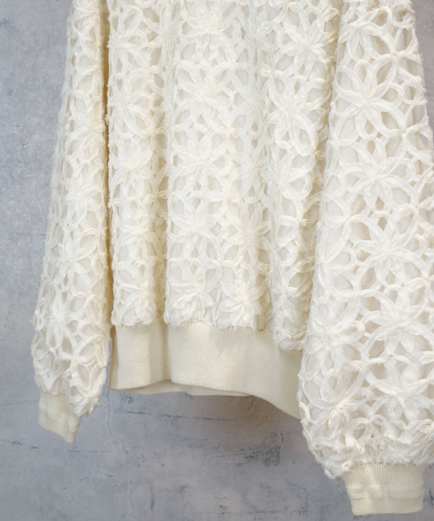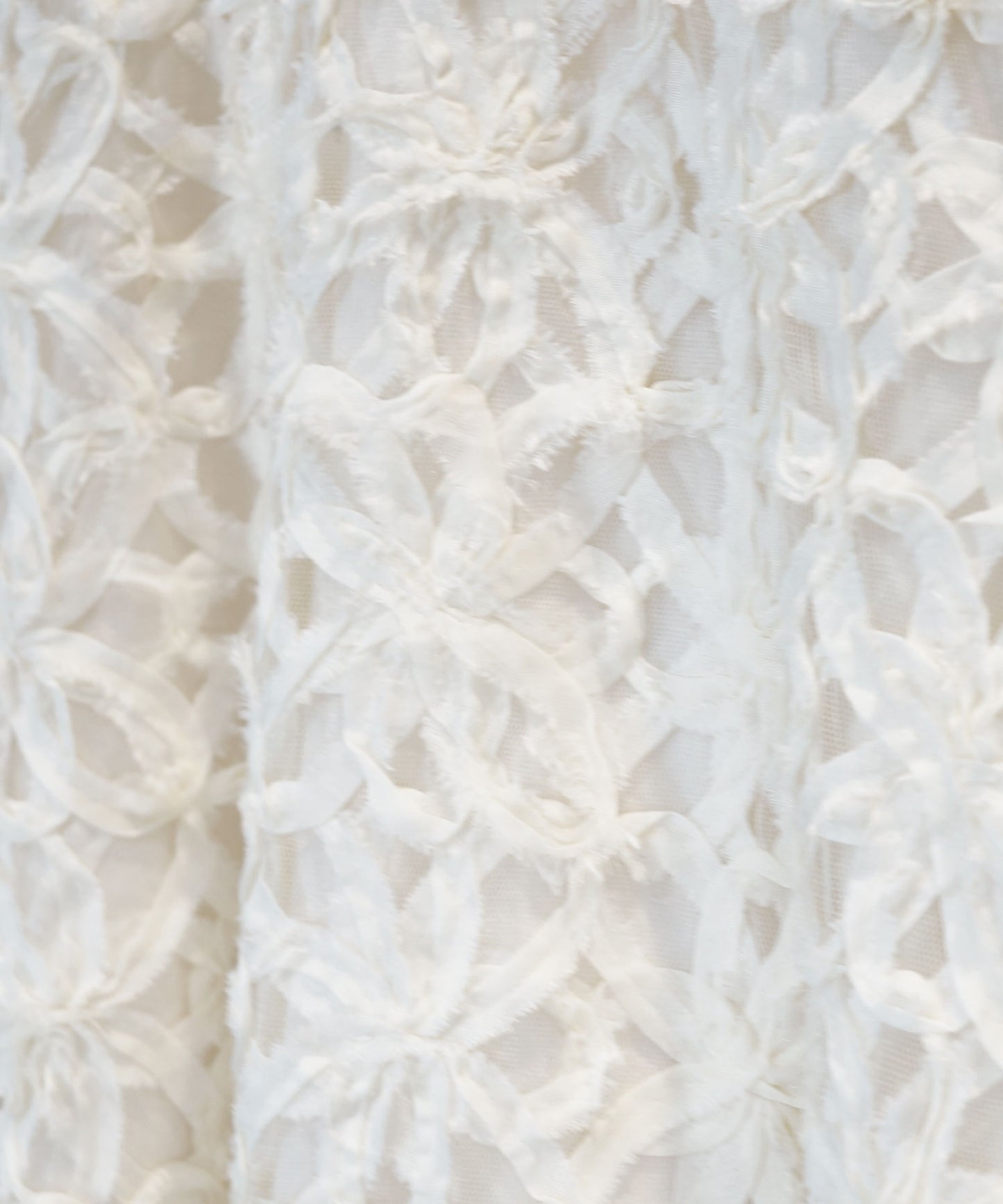 チュールの上に裁ち切りのテープをフラワーのように刺繡した、立体的なデザインが特徴です。