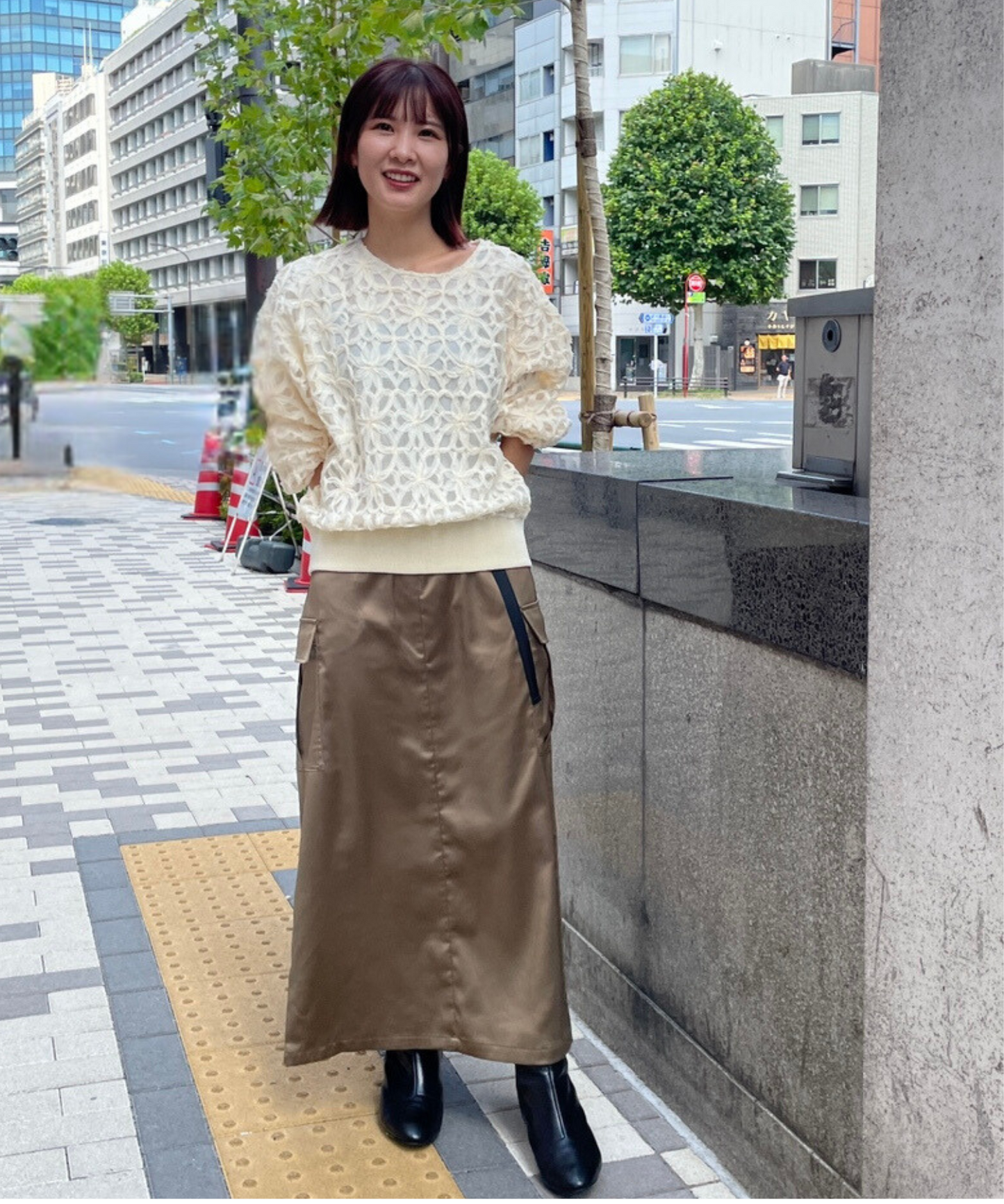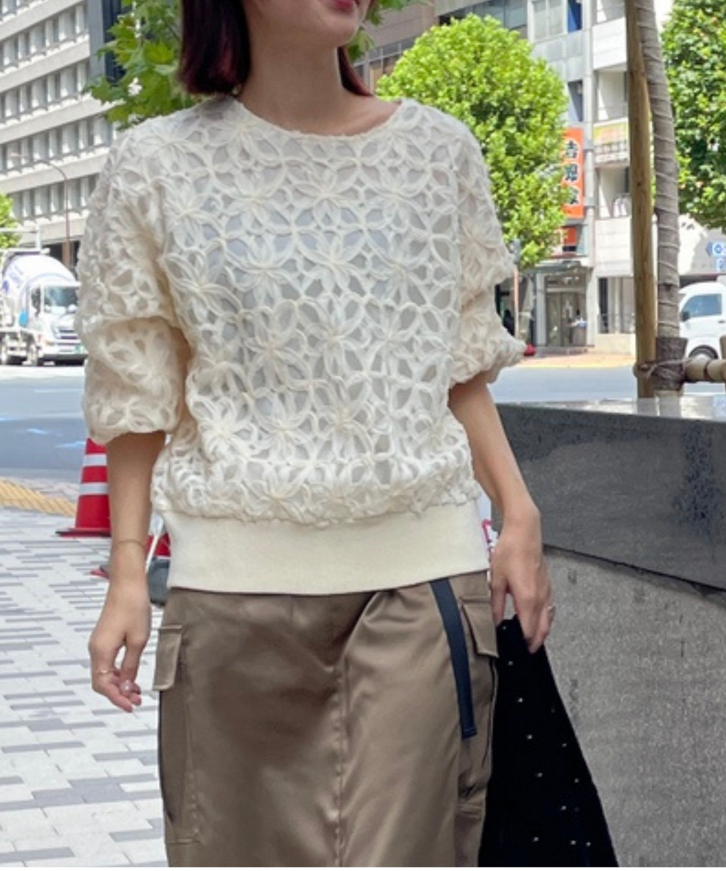 同色の異素材使いと切りっぱなし感で、フラワーモチーフでも甘くなりすぎないのがポイント。