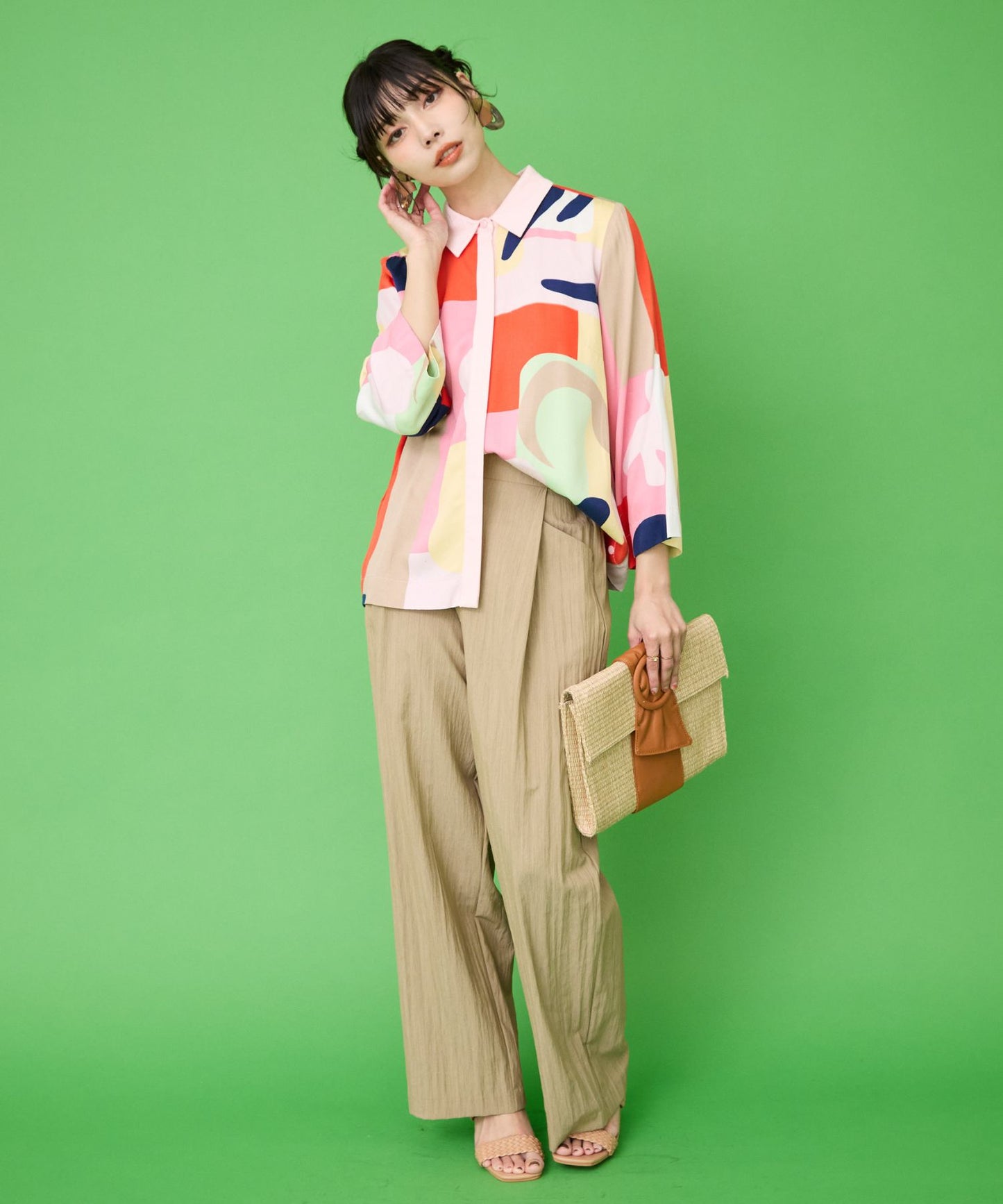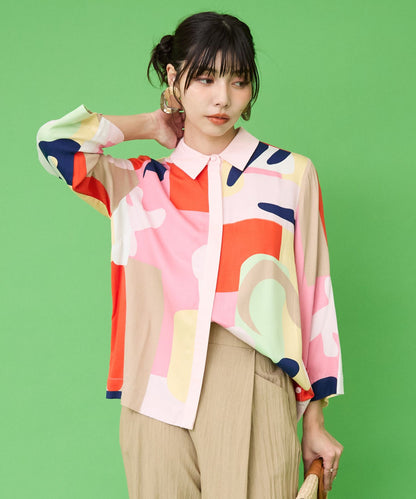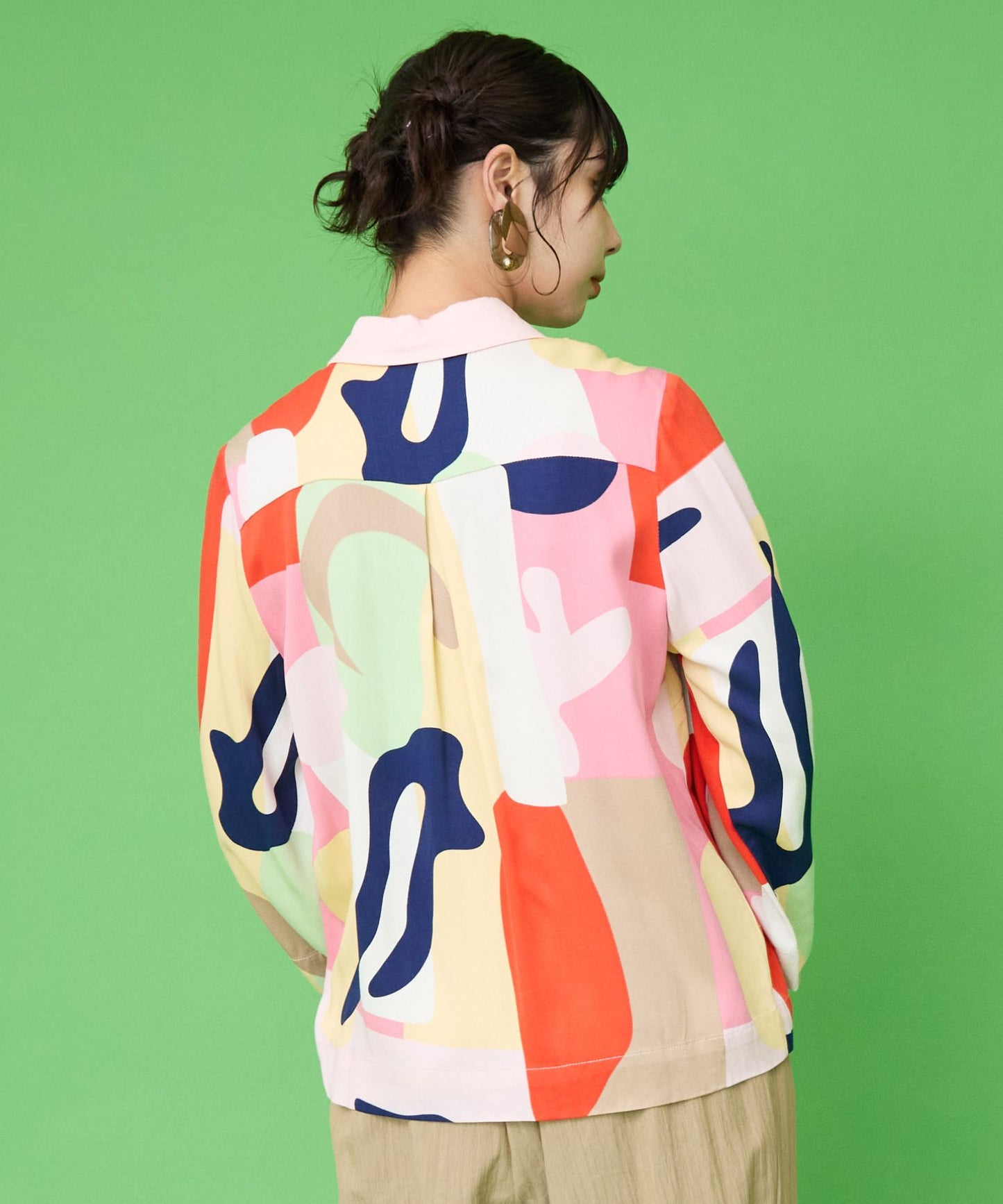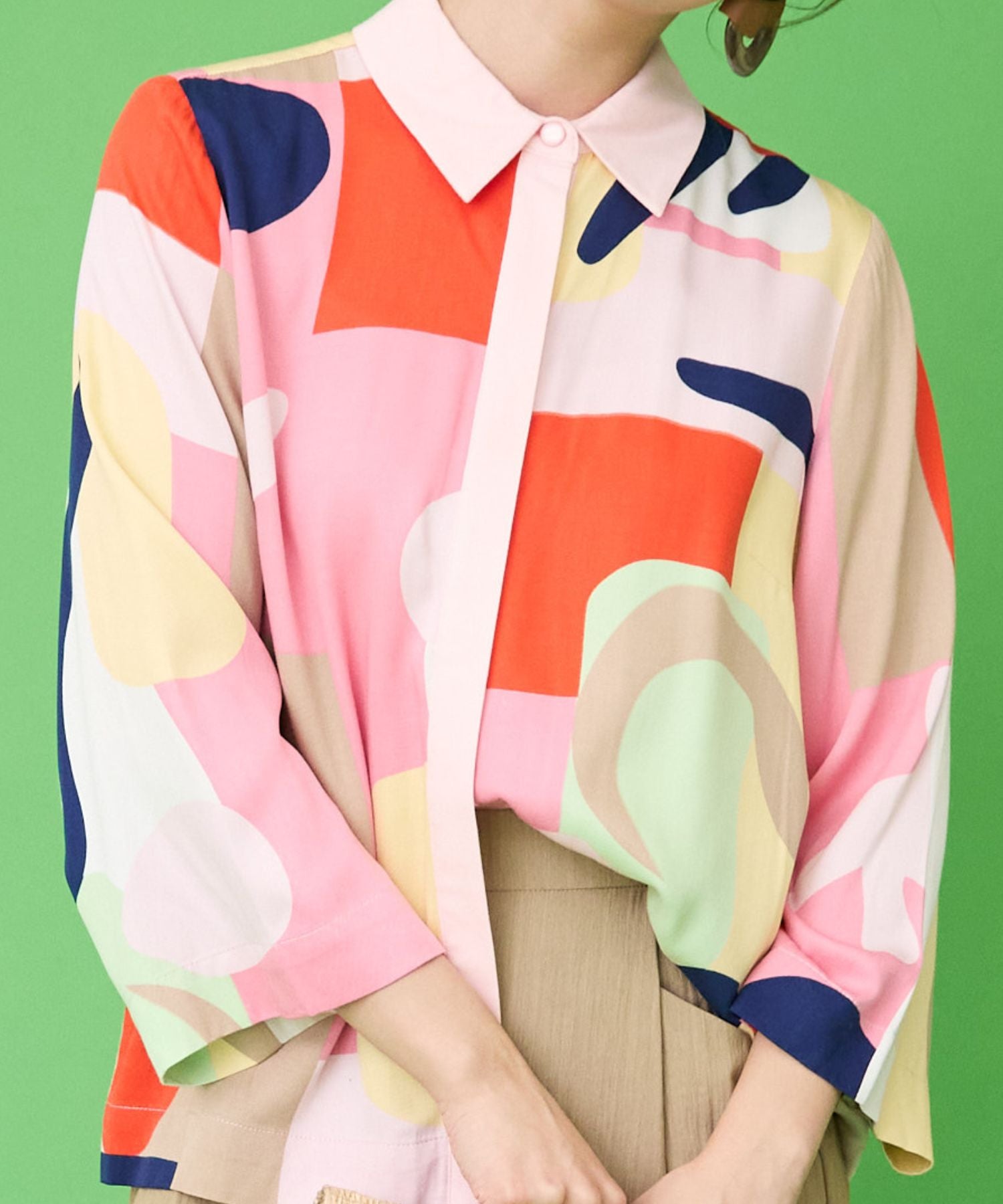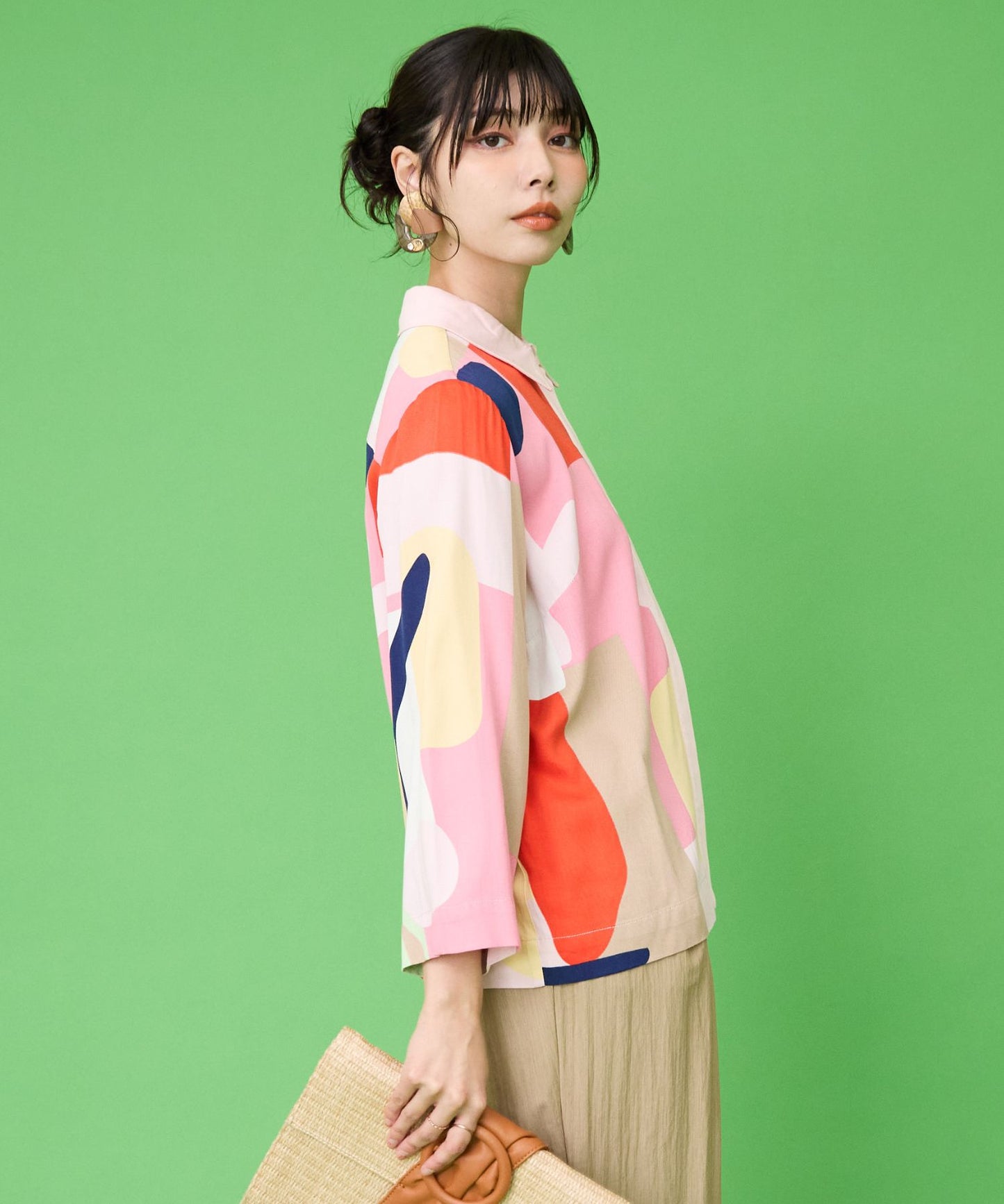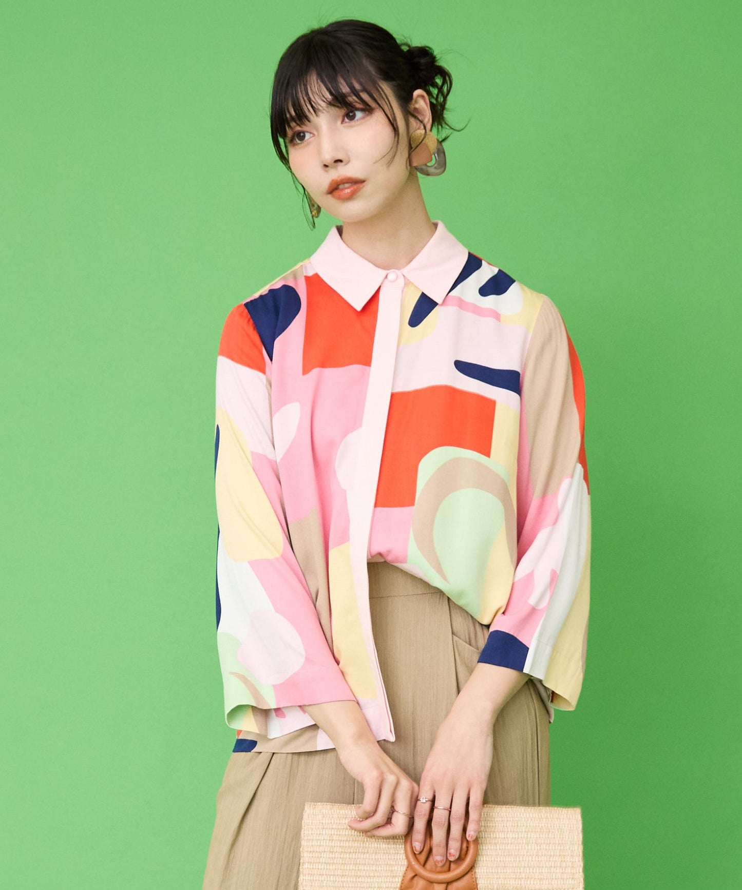 目を惹くカラフルなアート柄が魅力のブラウス。