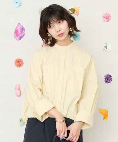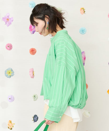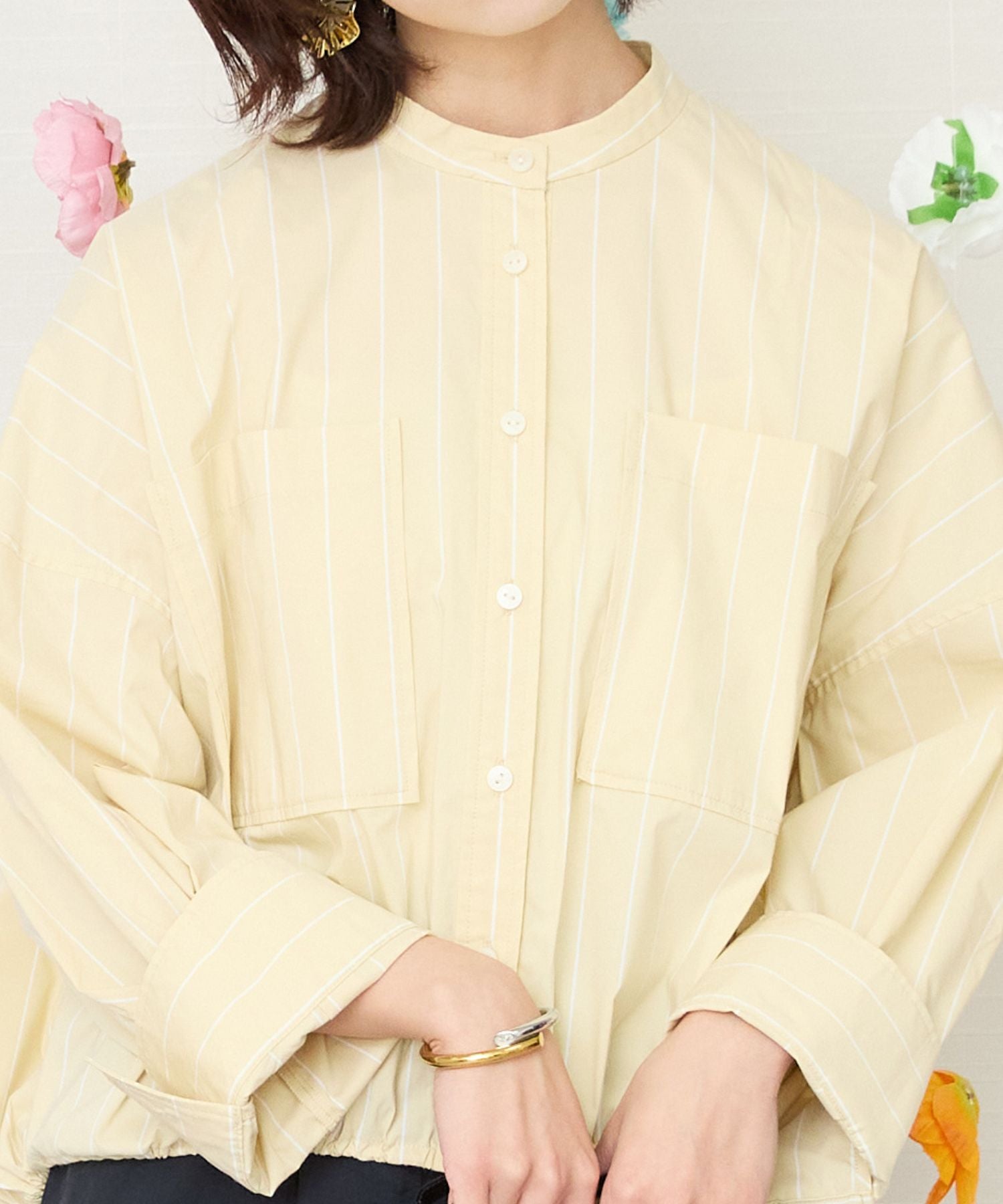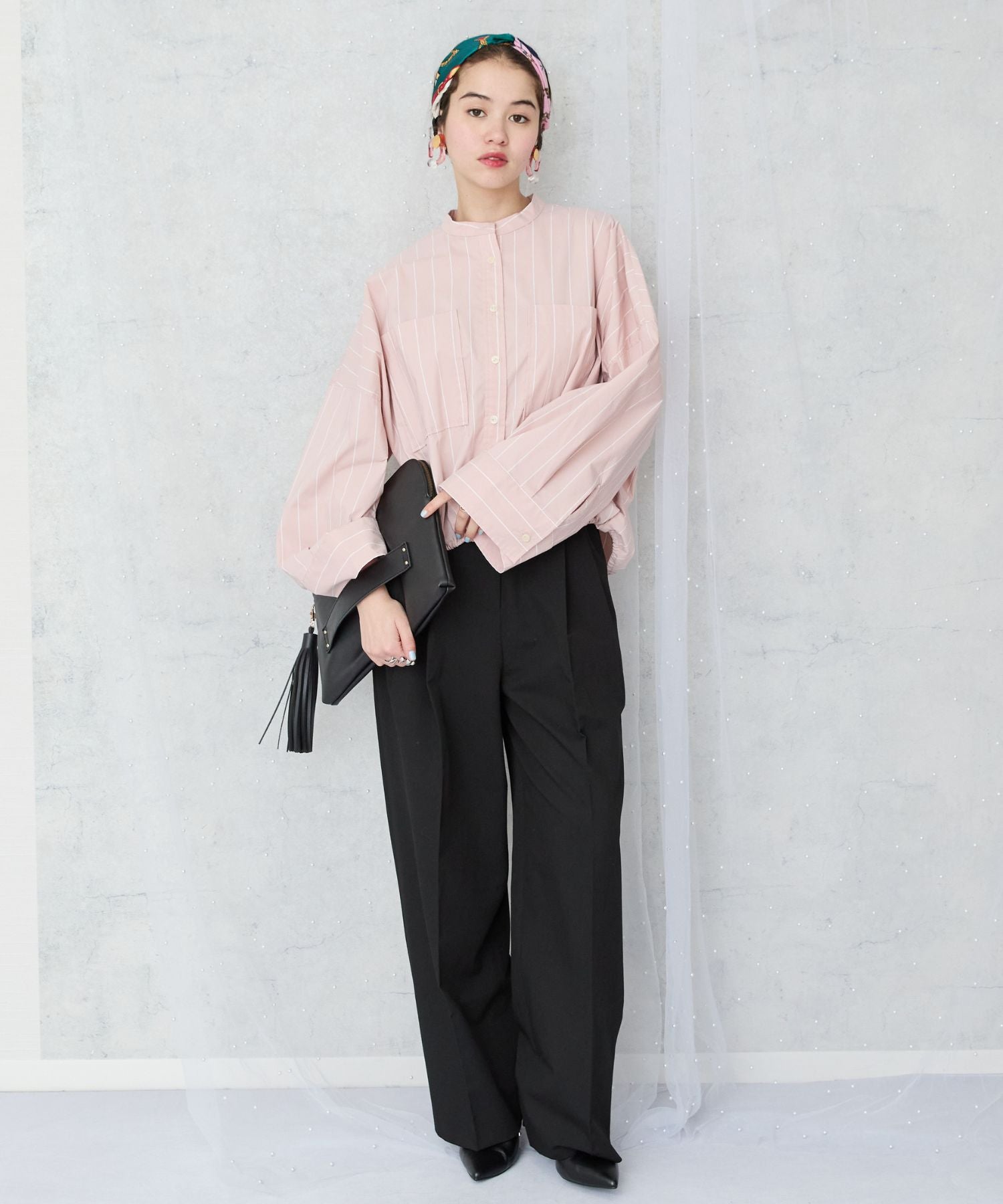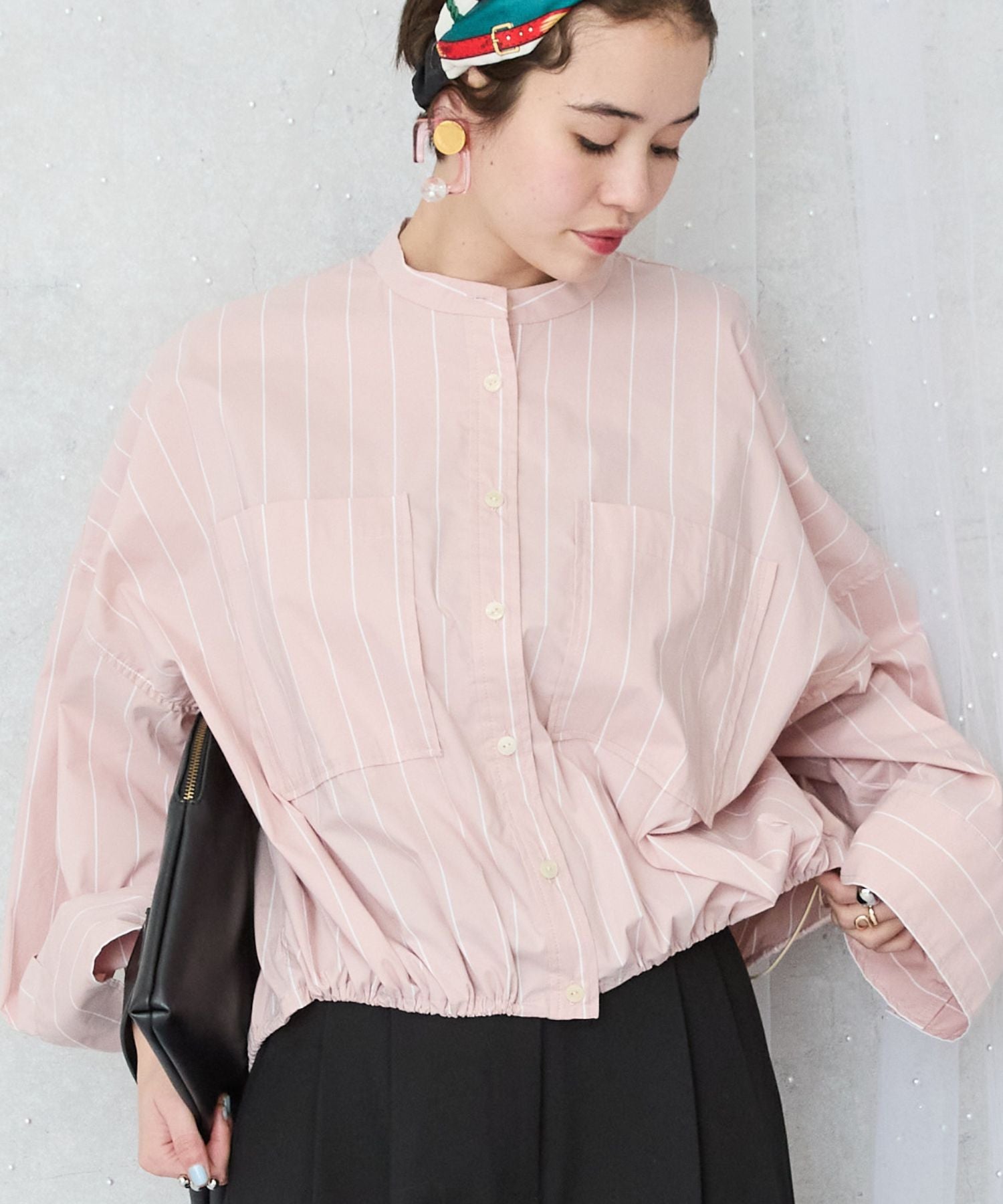 ワイドなシルエットとショート丈が魅力のバンドカラーシャツ。