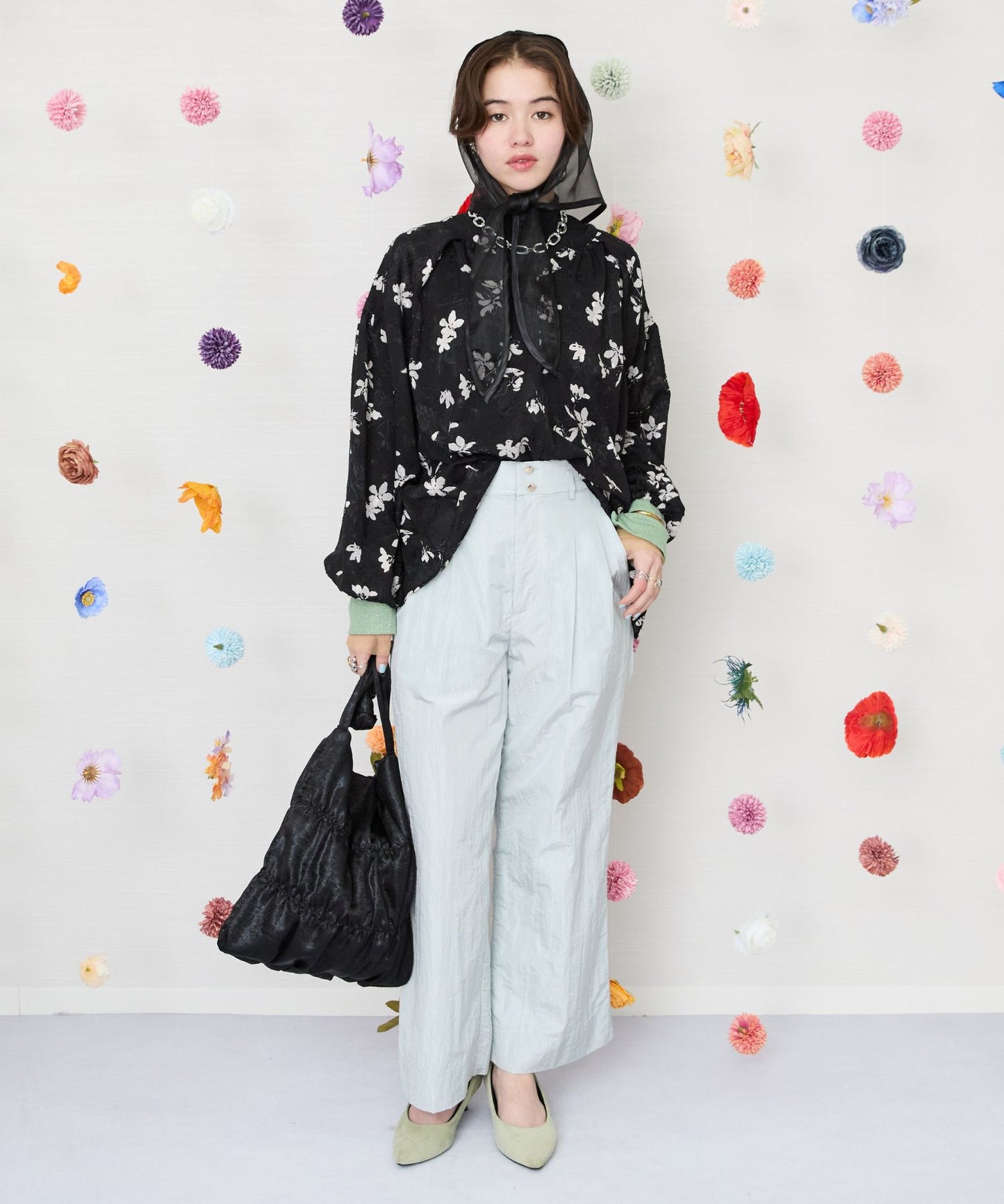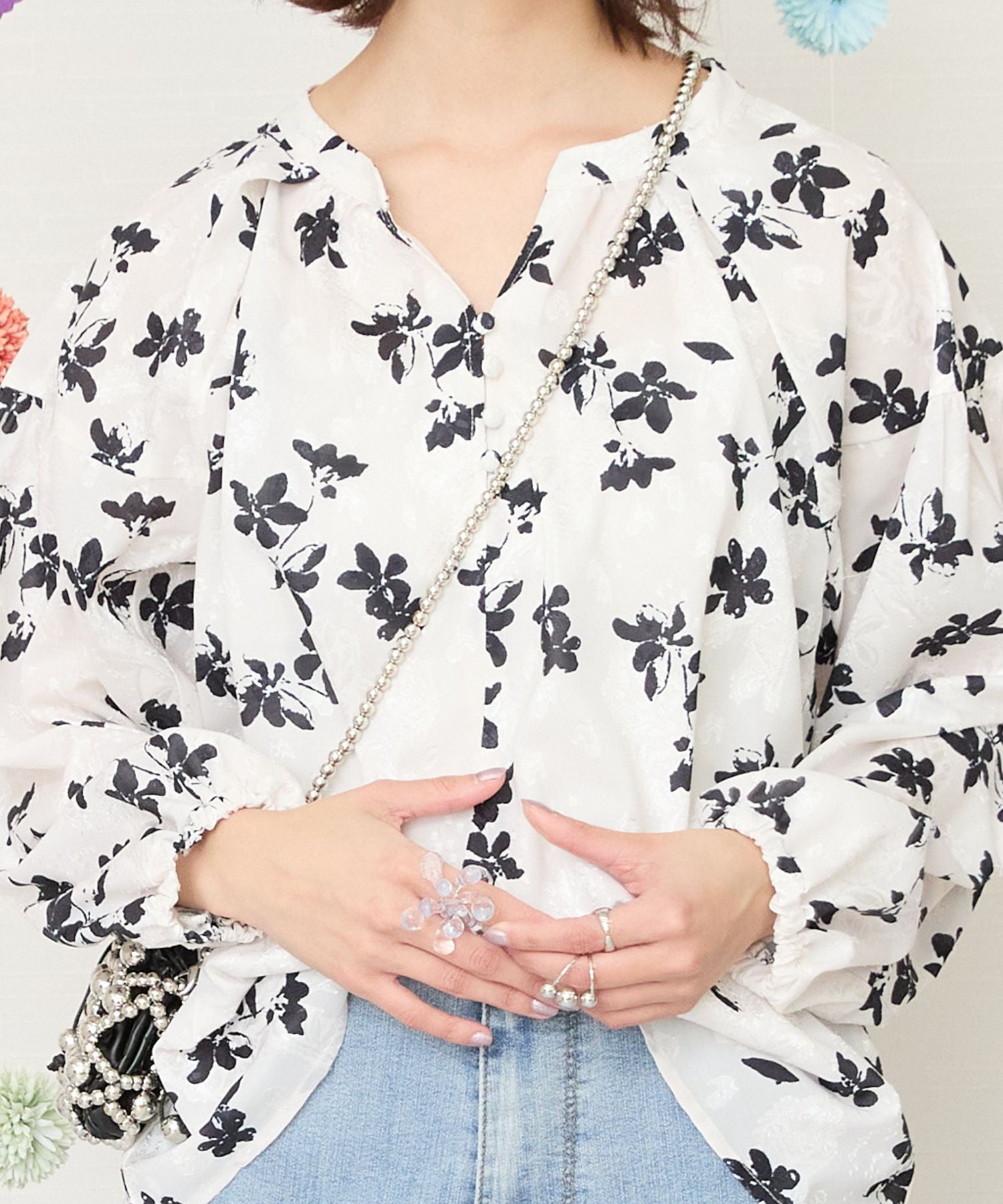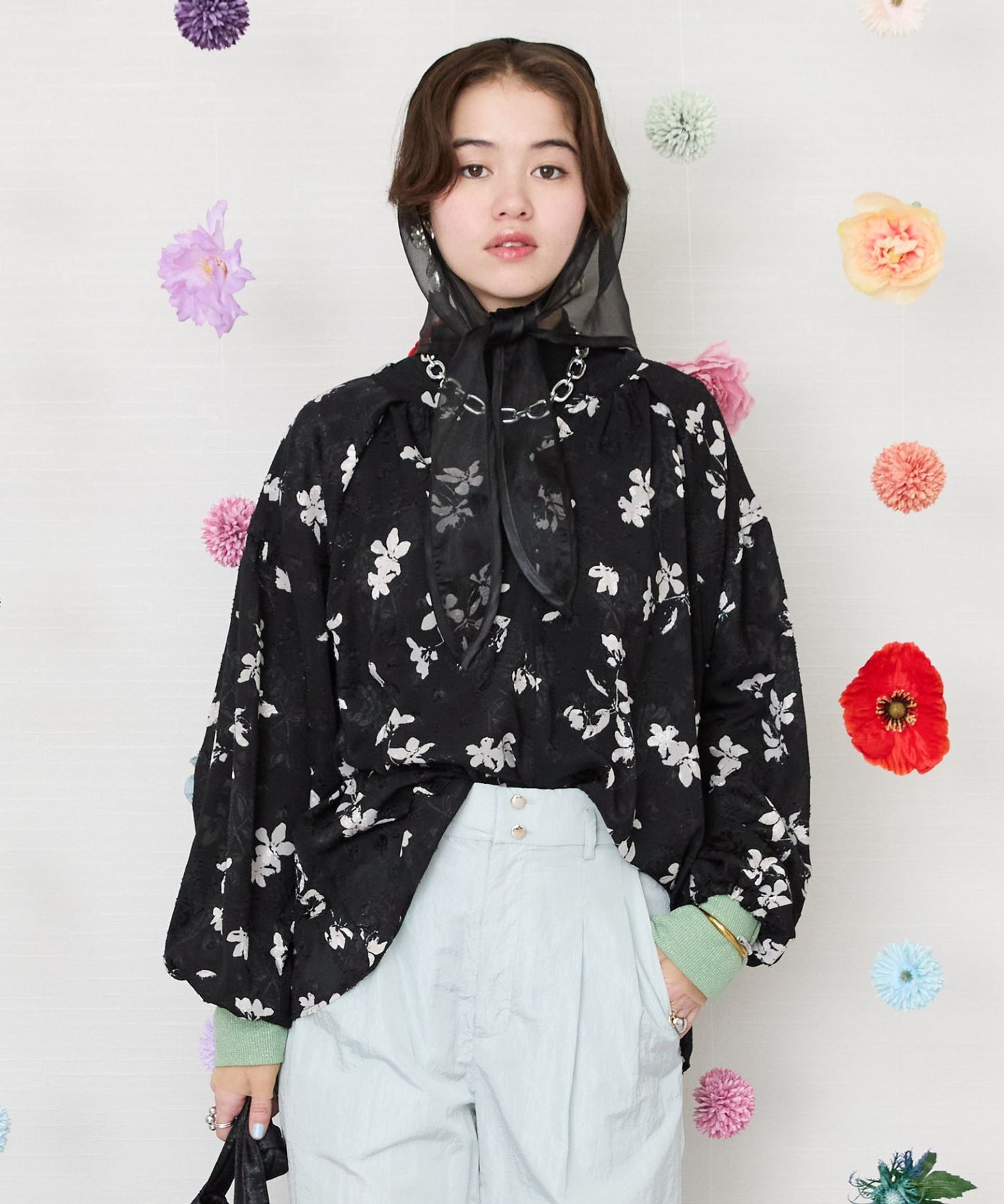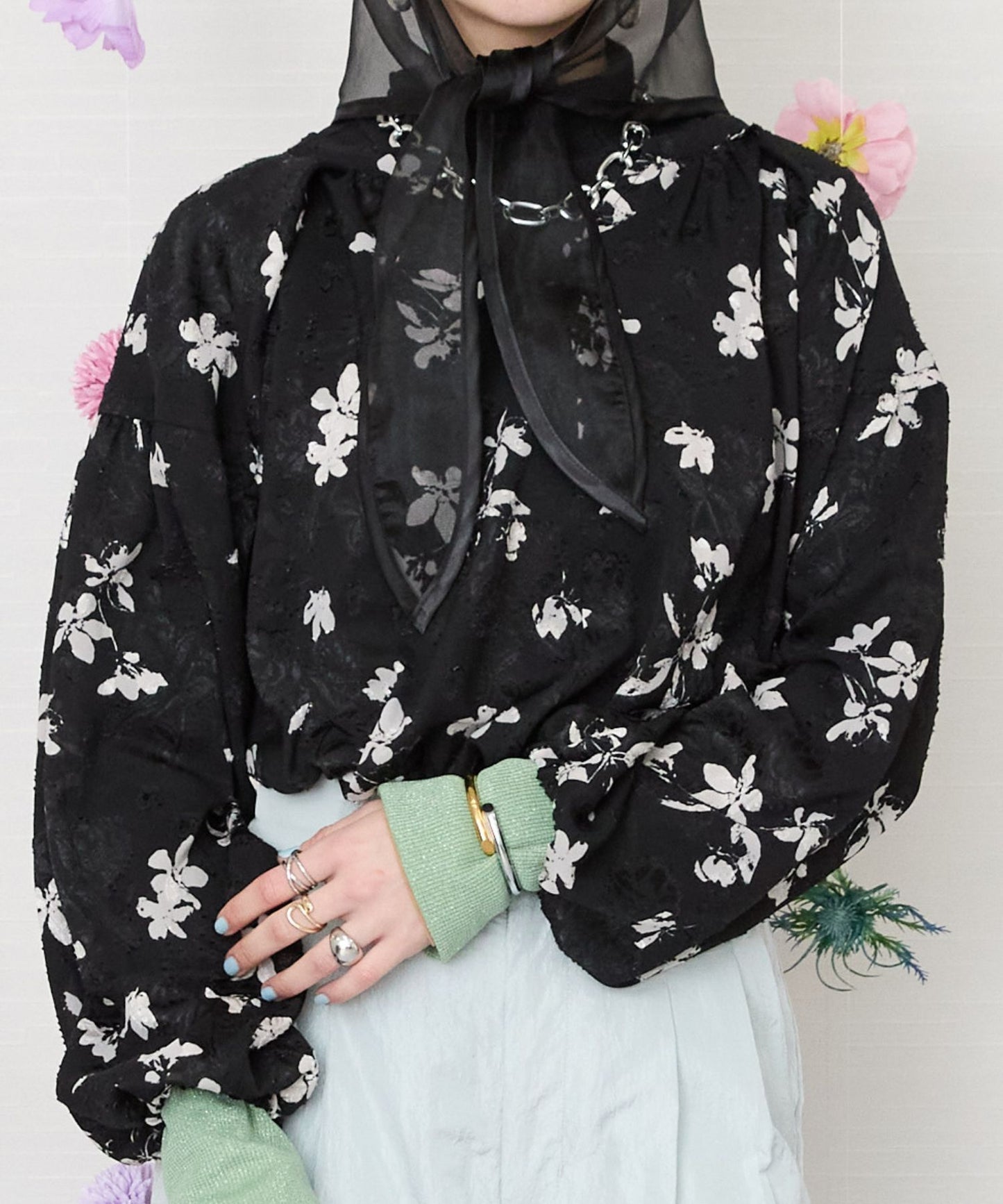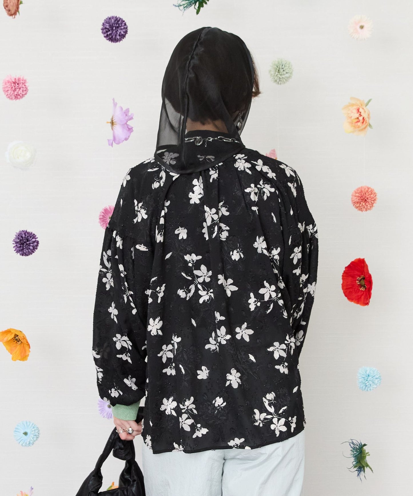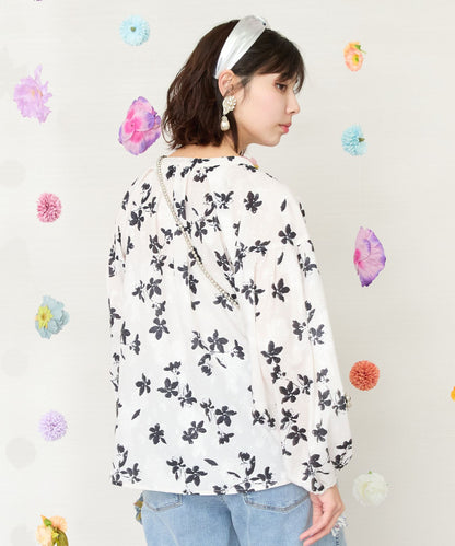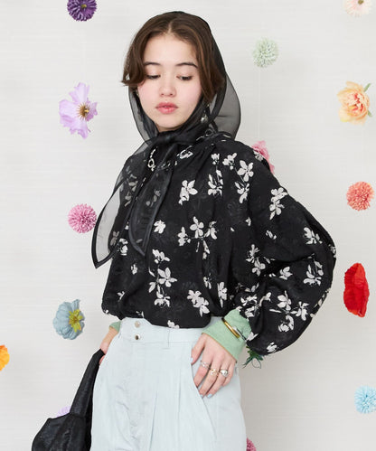 凹凸感のあるジャガード織りのシフォンにモノトーンのフラワープリントを施したクラシカルなブラウス。