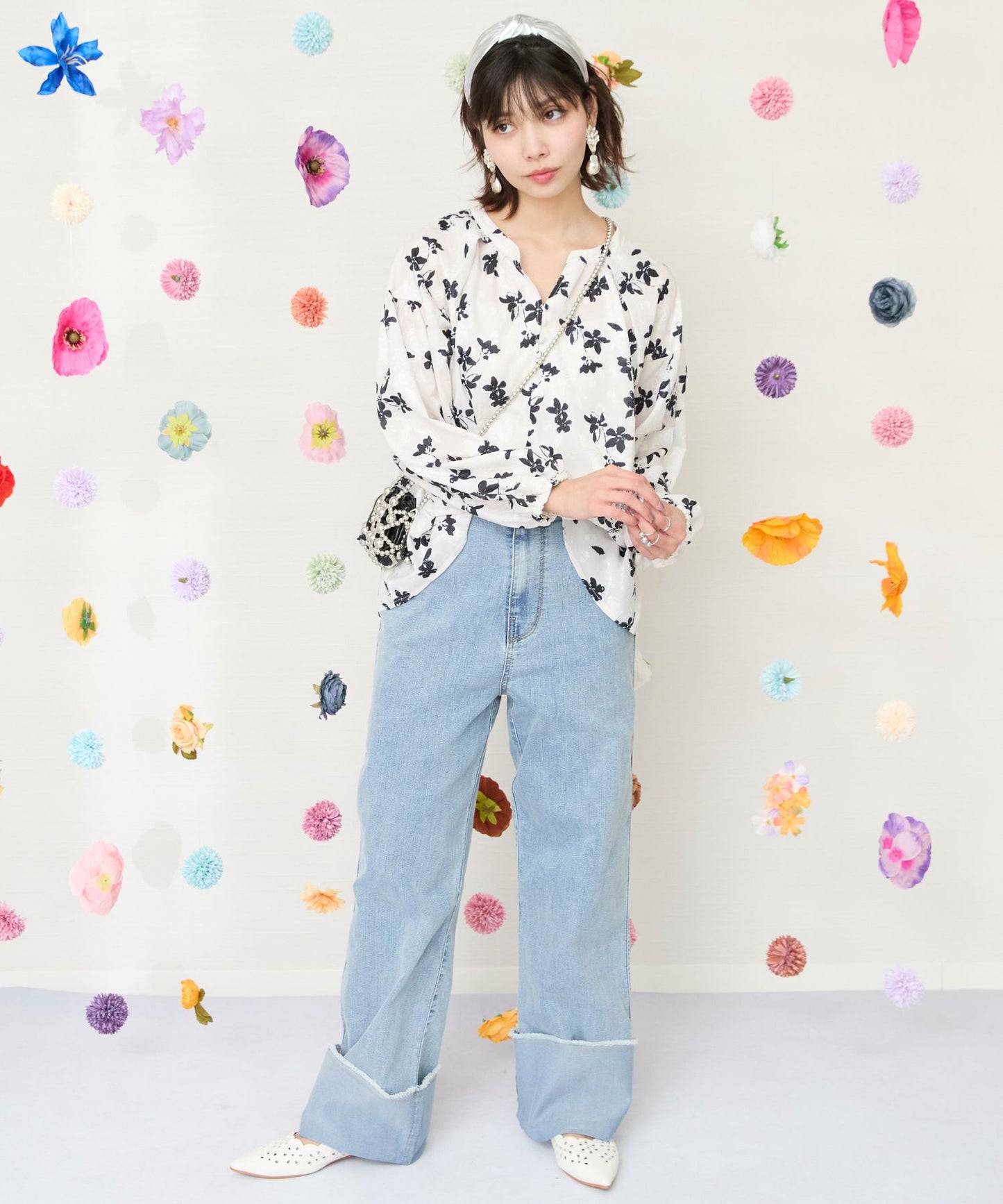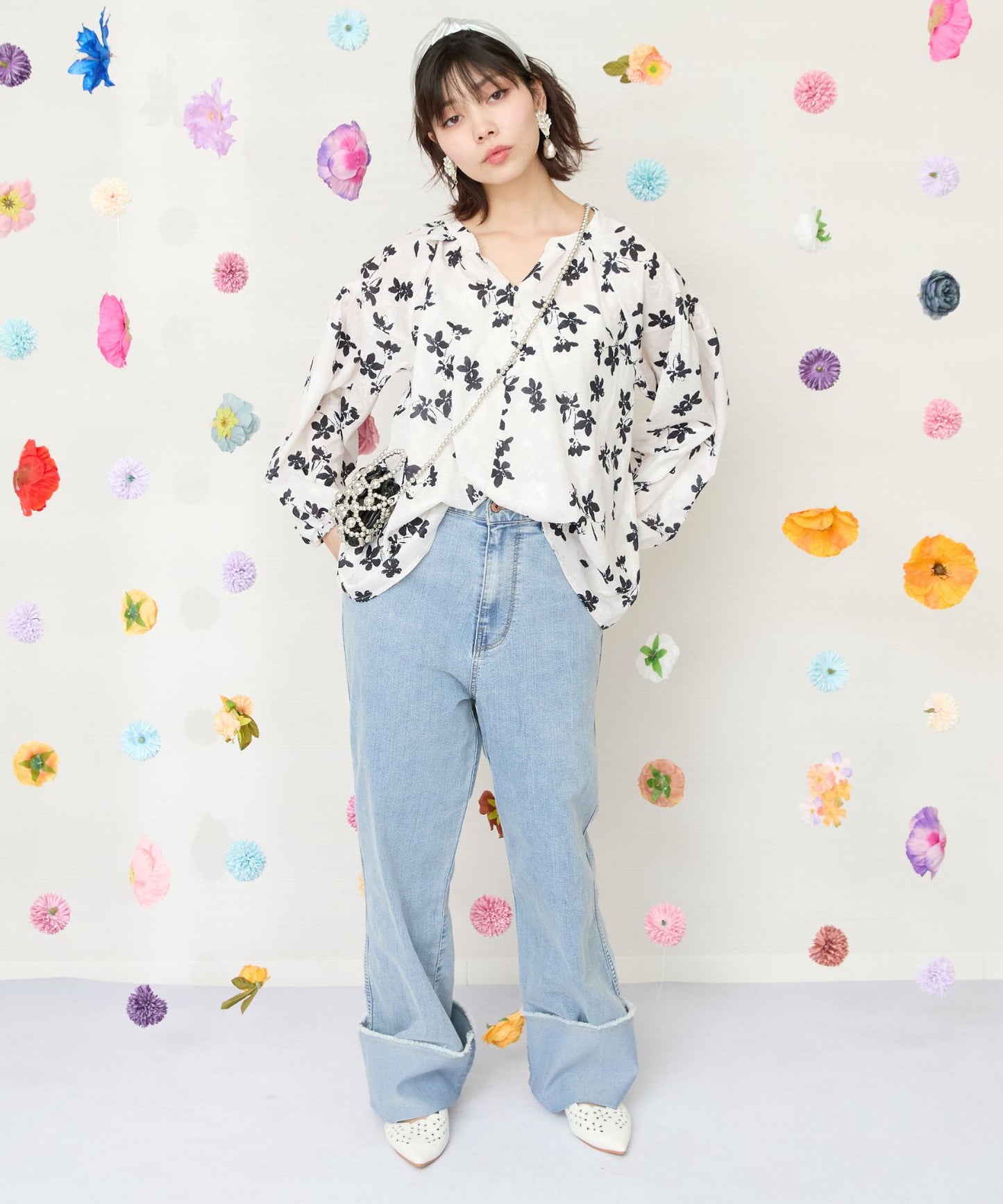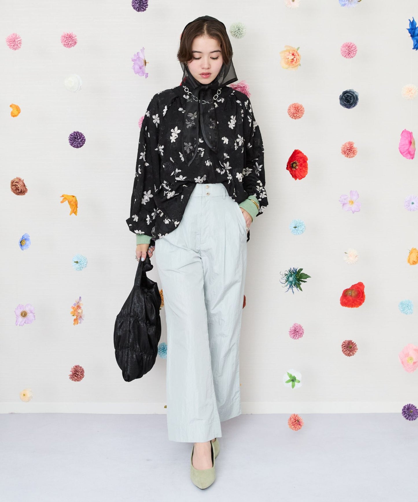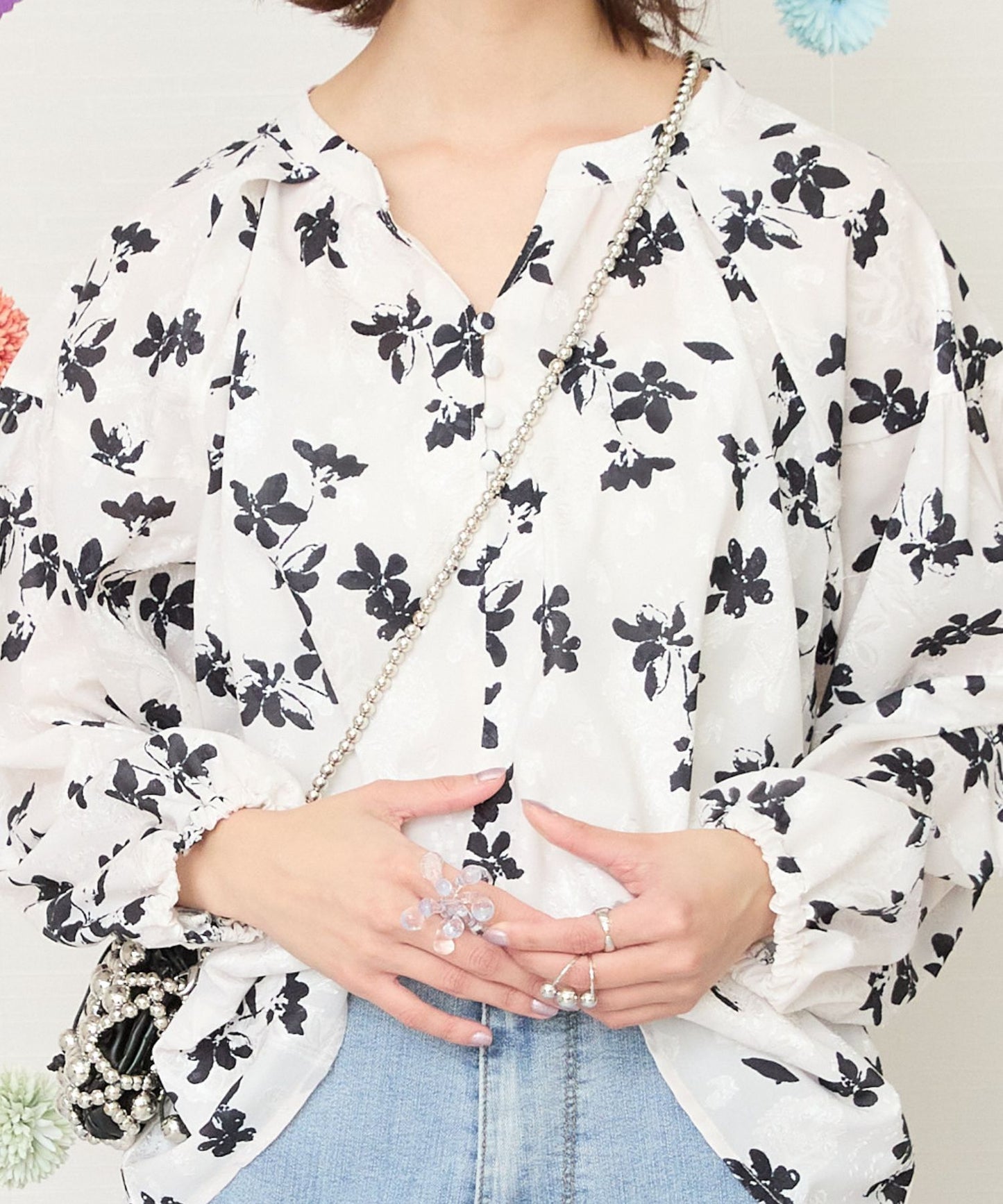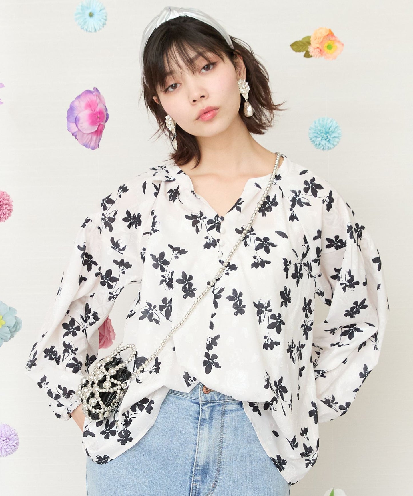 凹凸感のあるジャガード織りのシフォンにモノトーンのフラワープリントを施したクラシカルなブラウス。