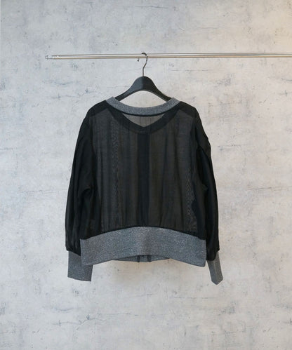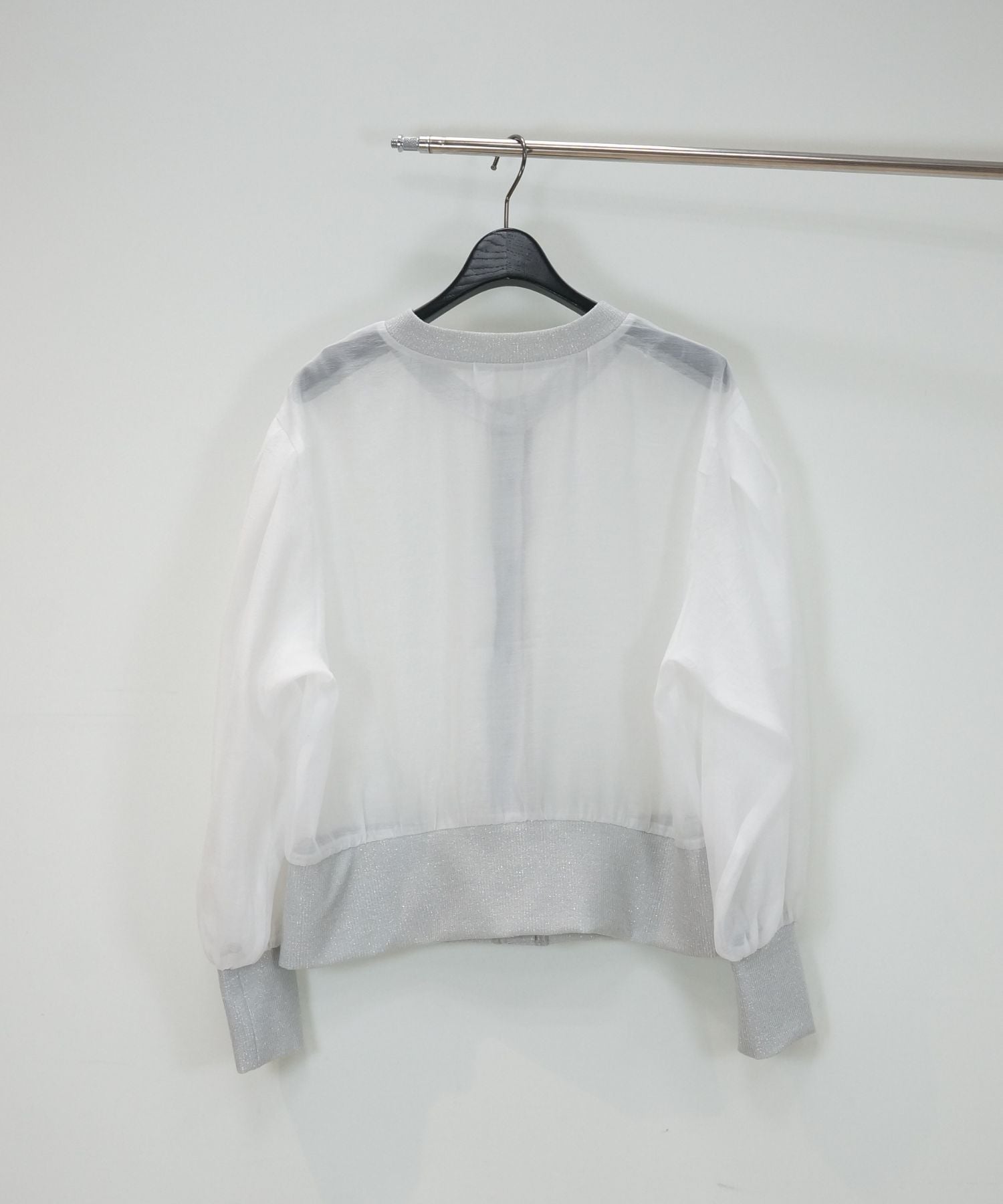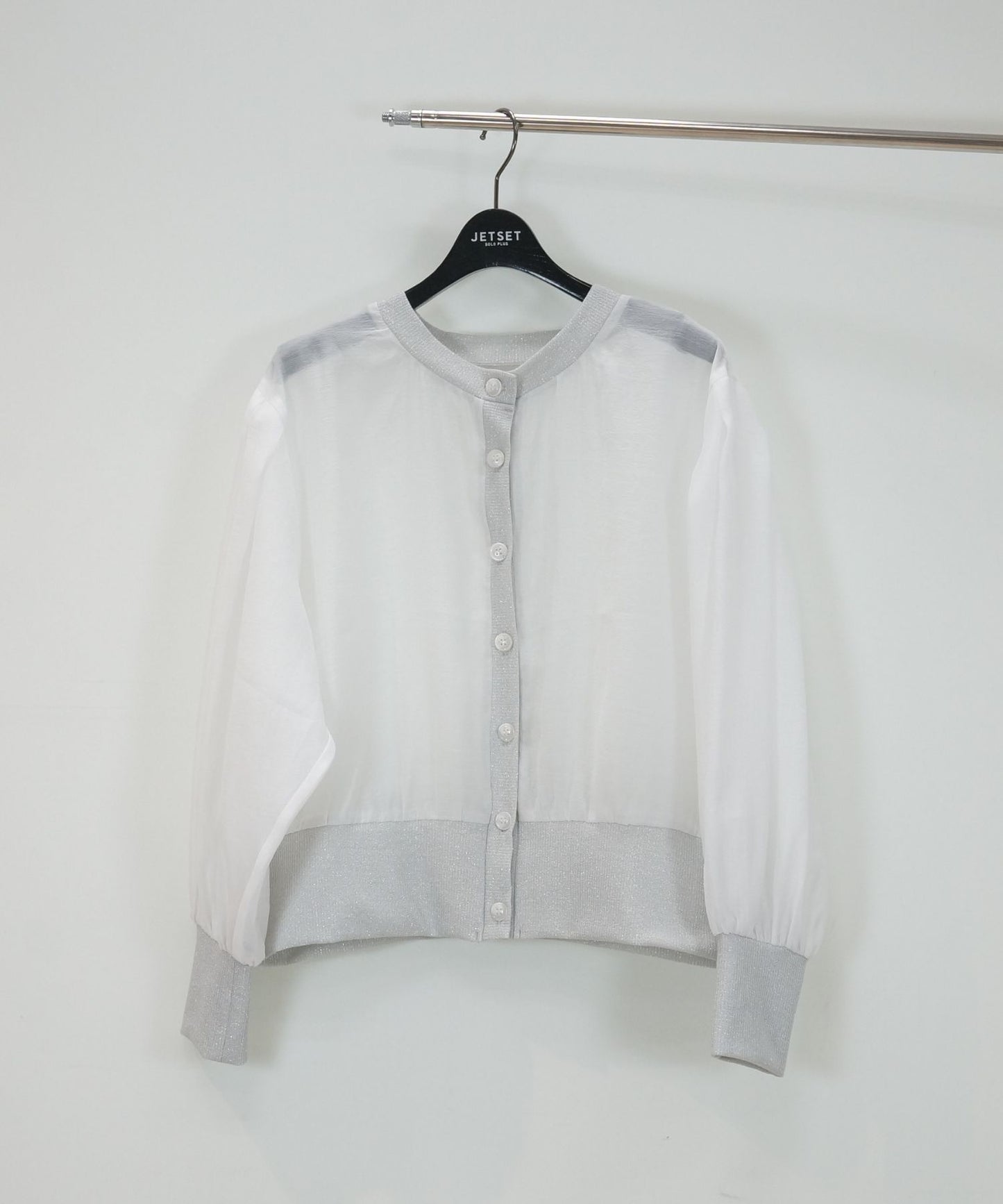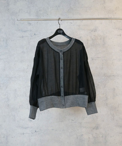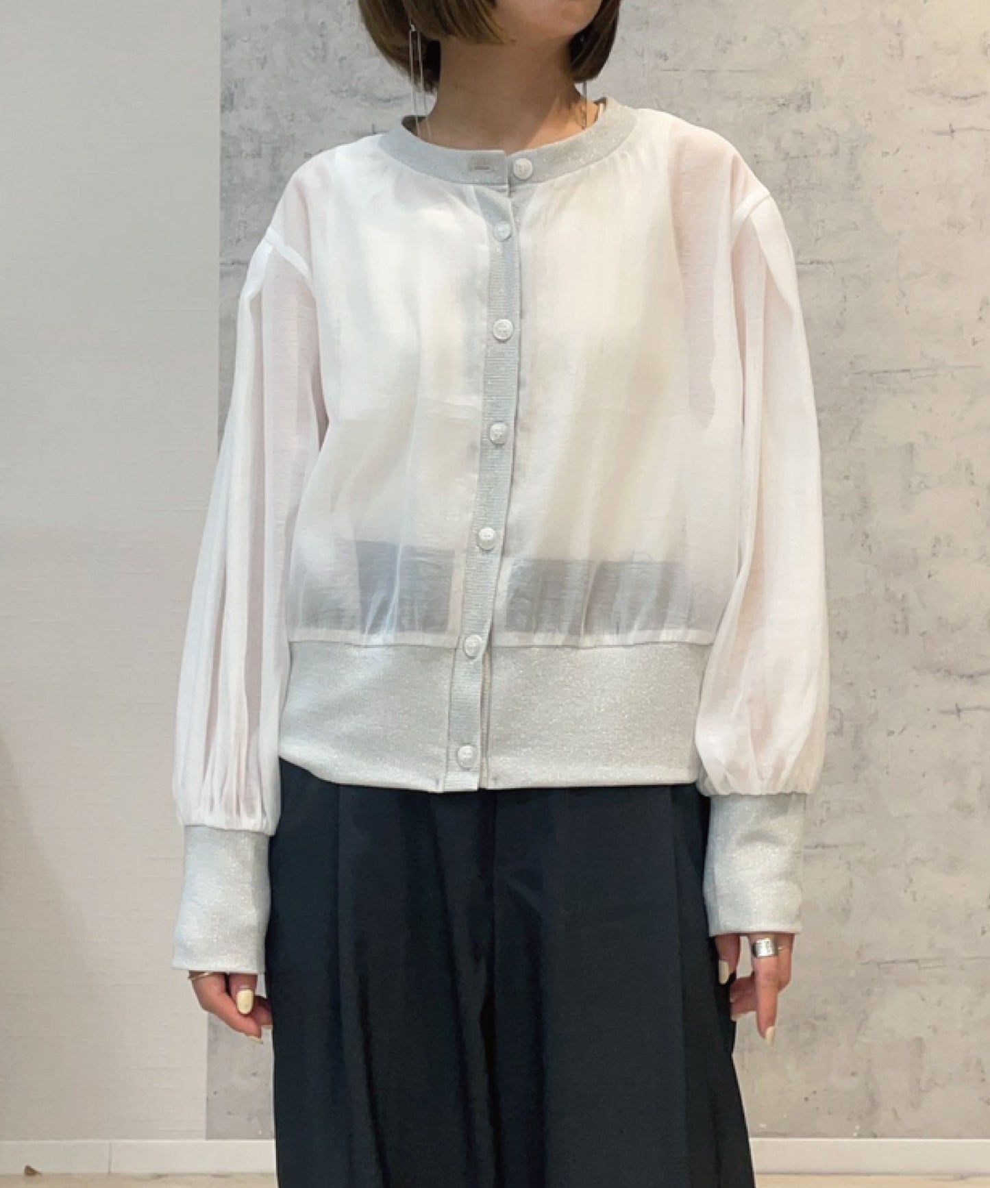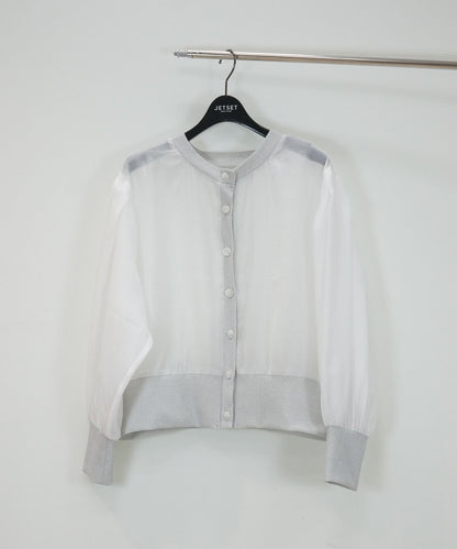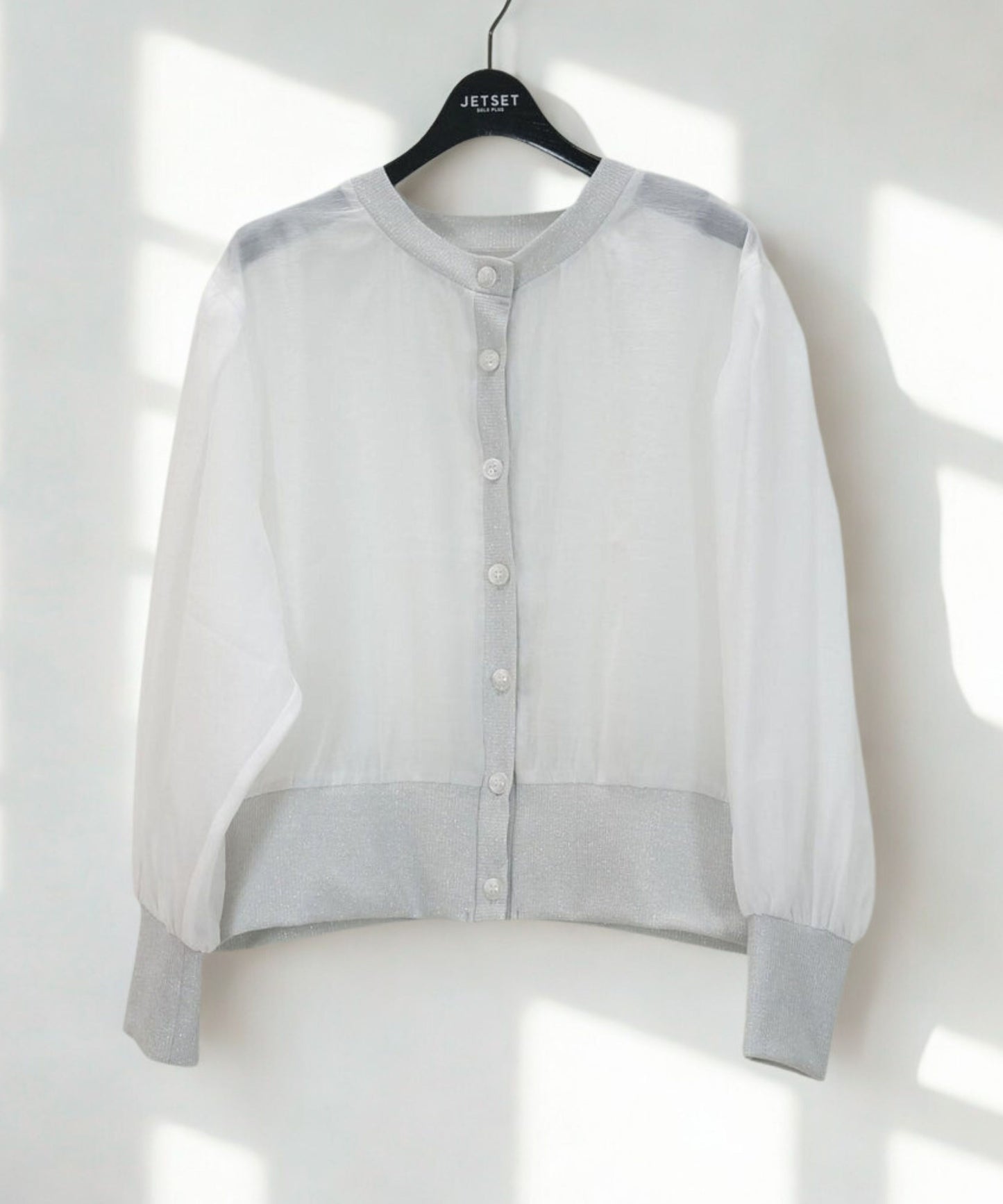 ネックや前立て、袖口にラメテレコ素材を配した、華やかさと清涼感を兼ね備えた前後2WAY仕様のシアーカーディガン。