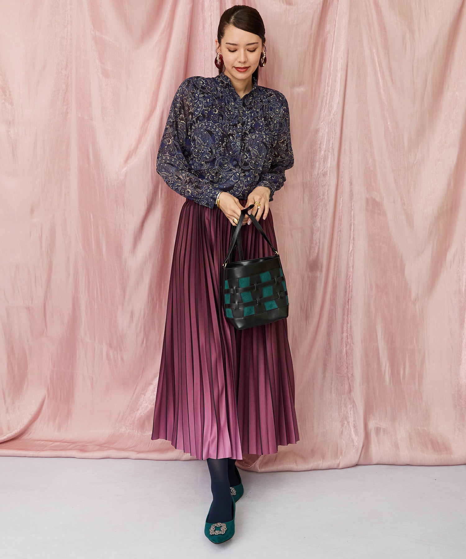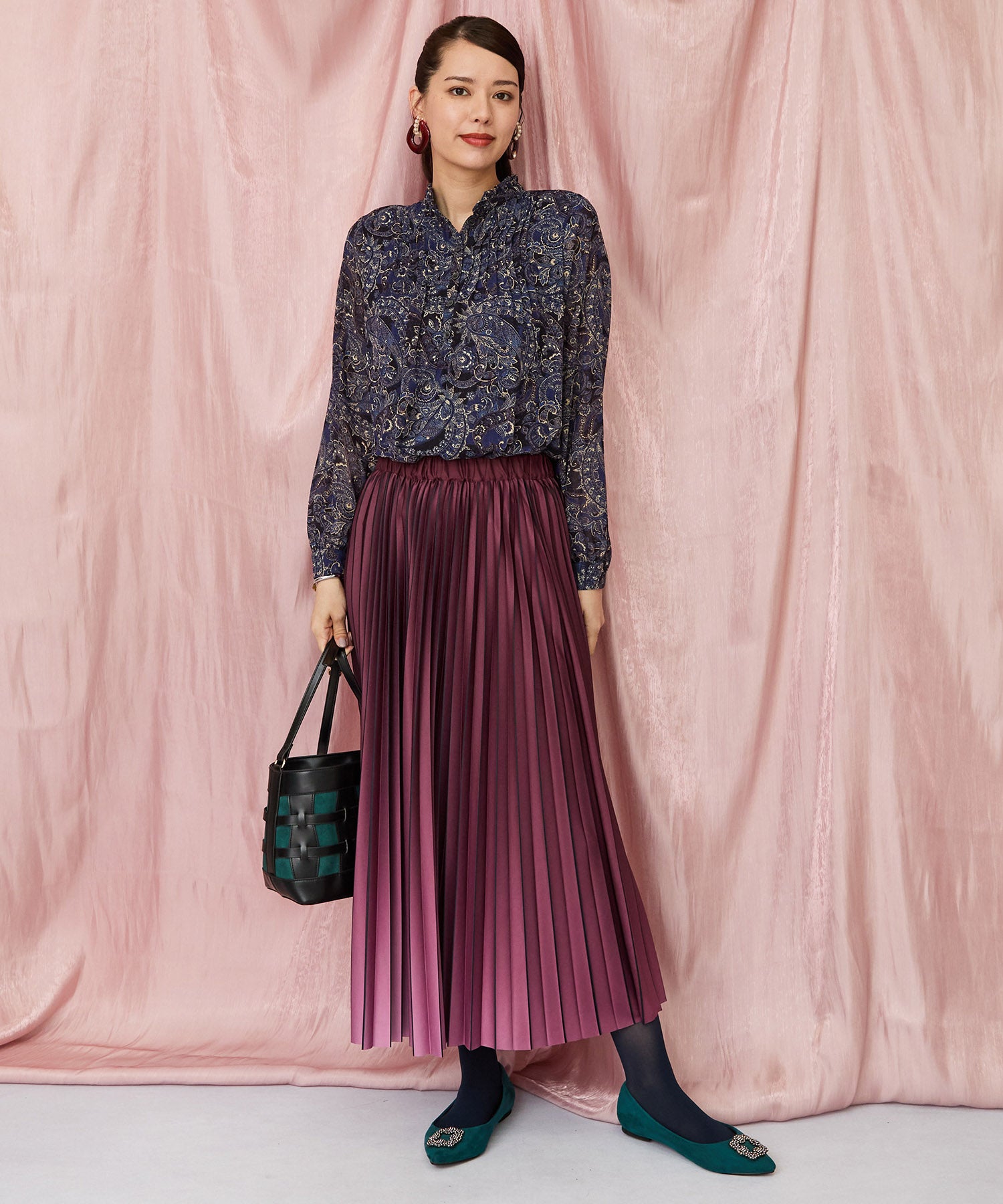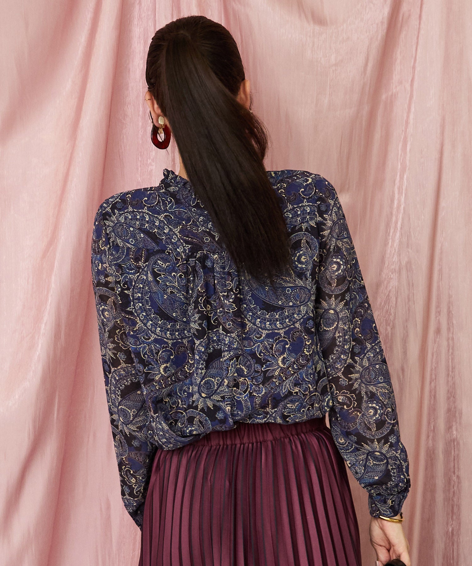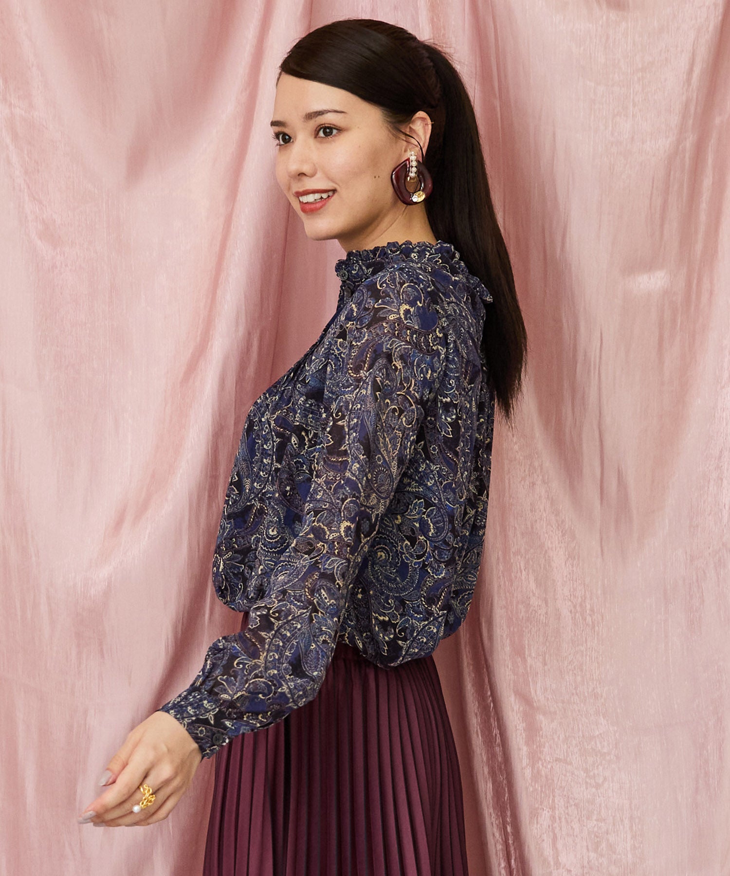 繊細なペイズリープリントとフロントのピンタックディテールが印象的なブラウス。落ち着いた色合いながら、上品な存在感を放つアイテムです。