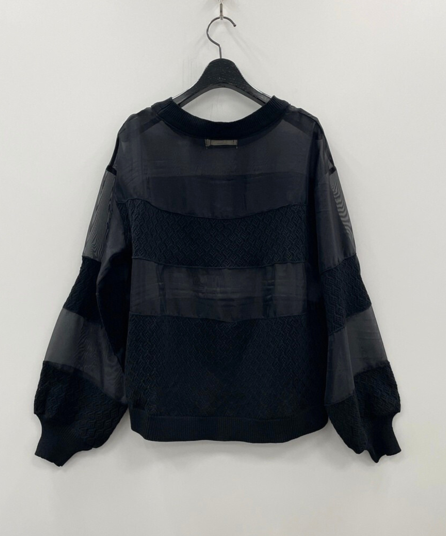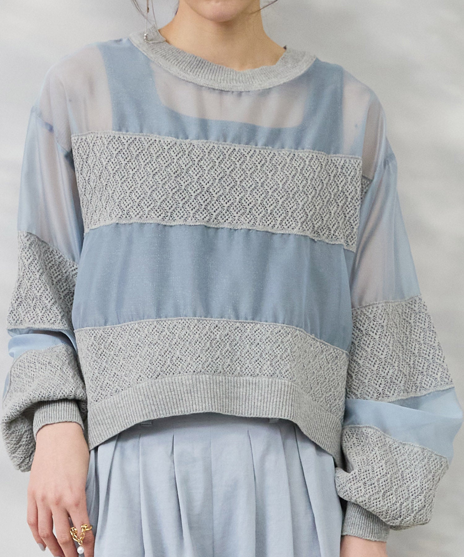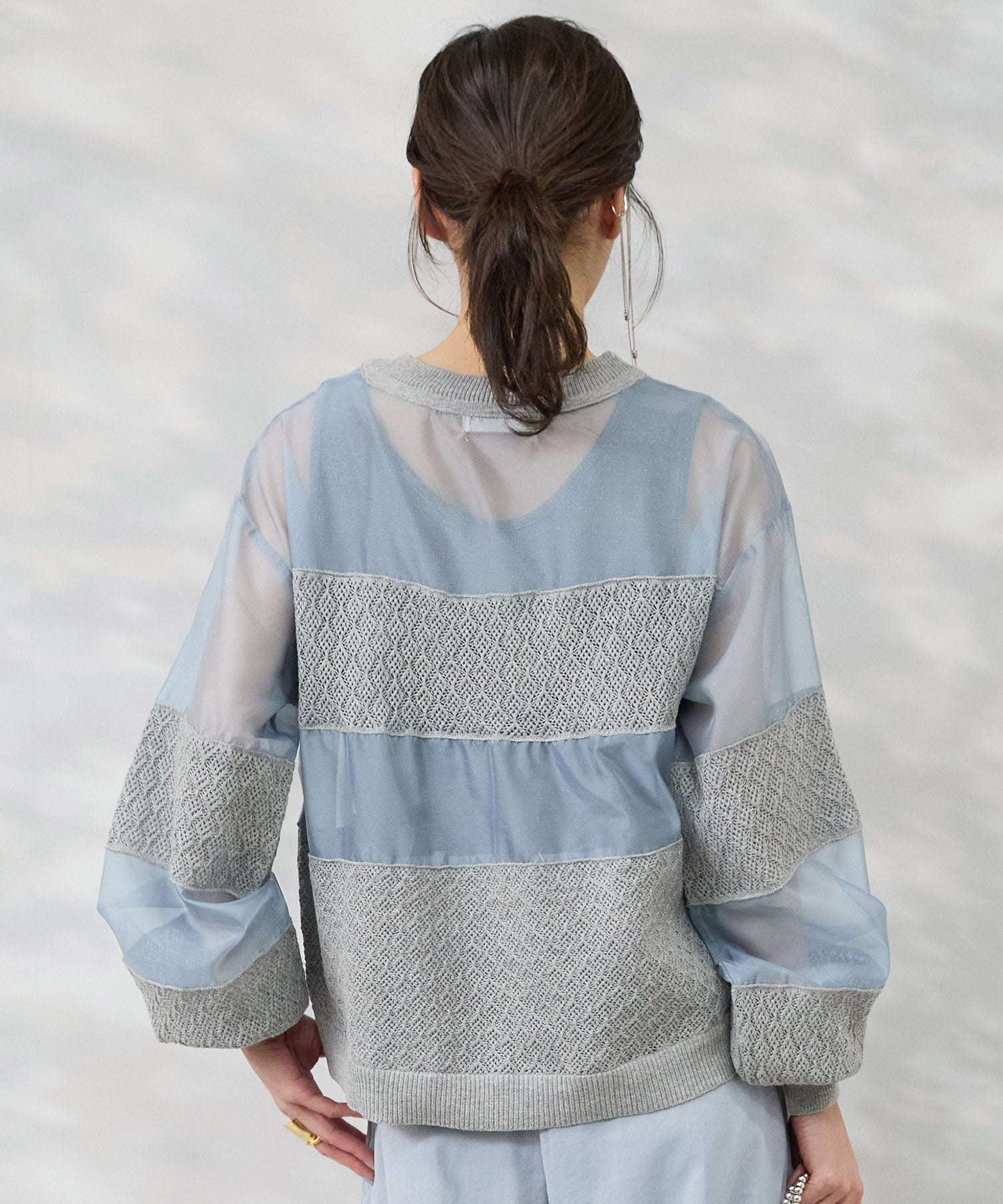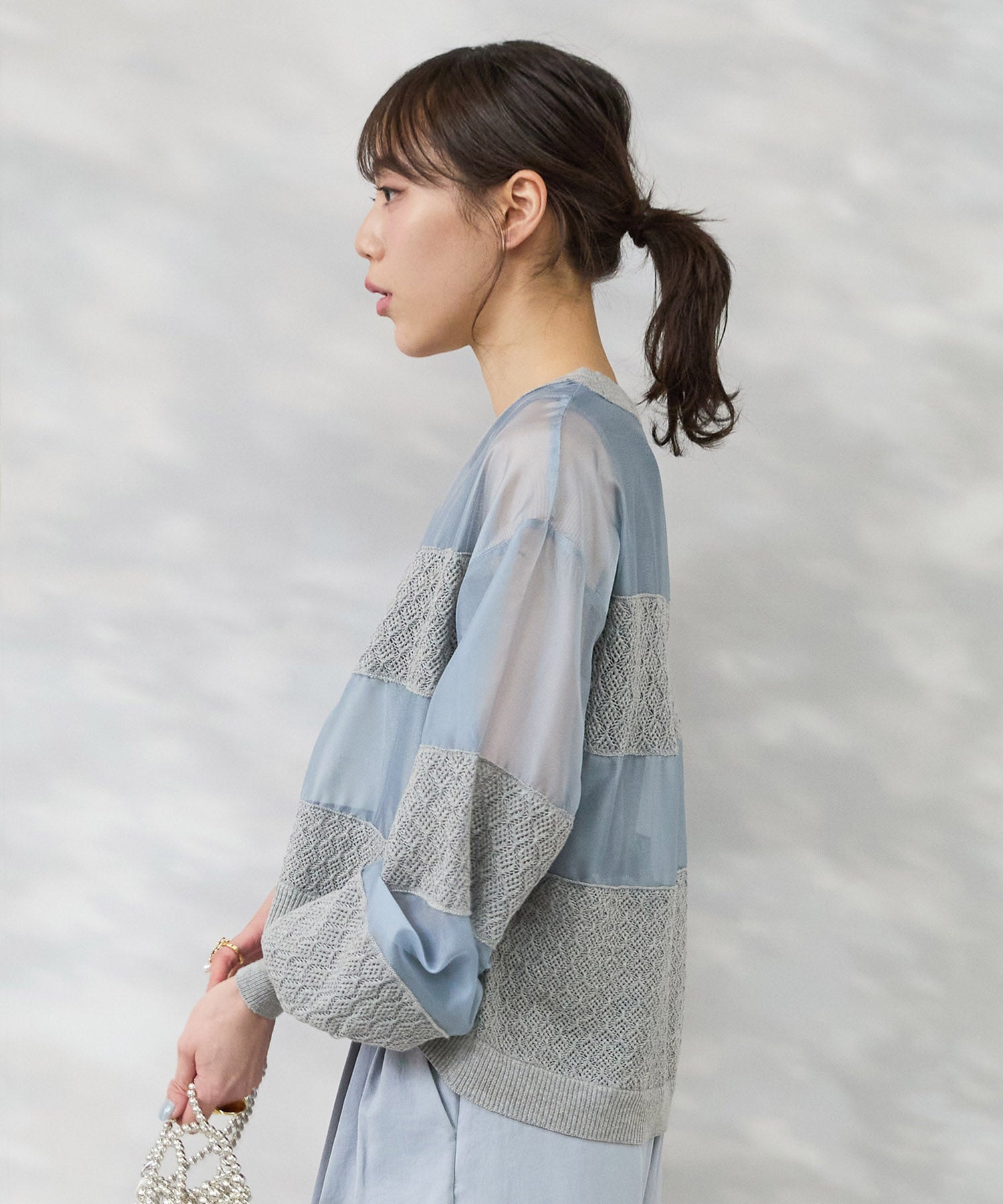 オーガンジーと透かし編みをボーダー状に重ねた、表情豊かなデザインブラウス。