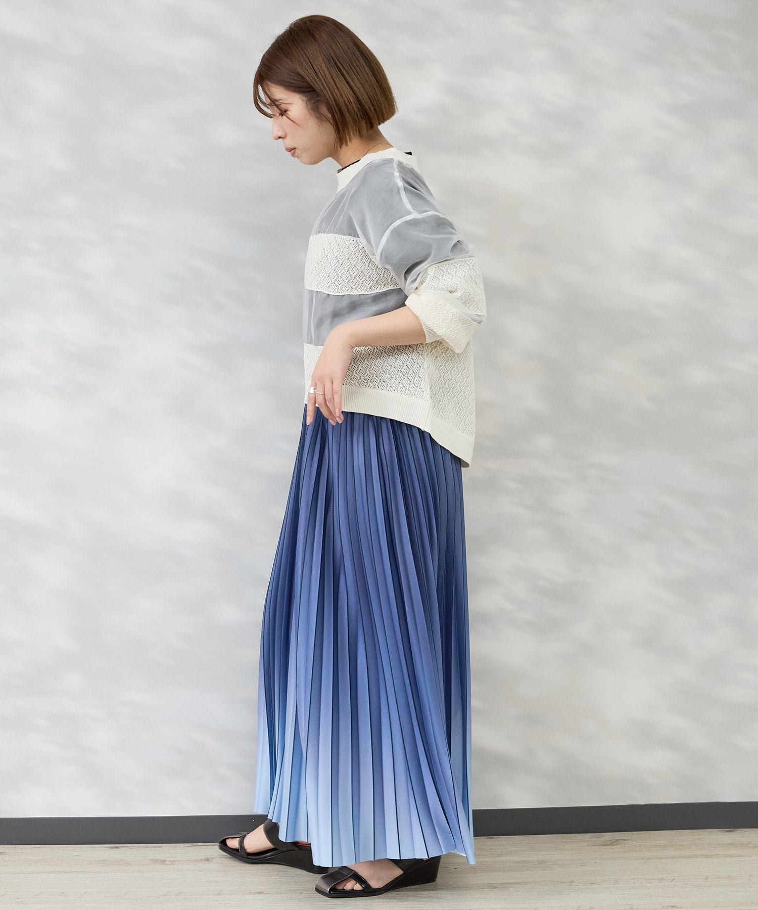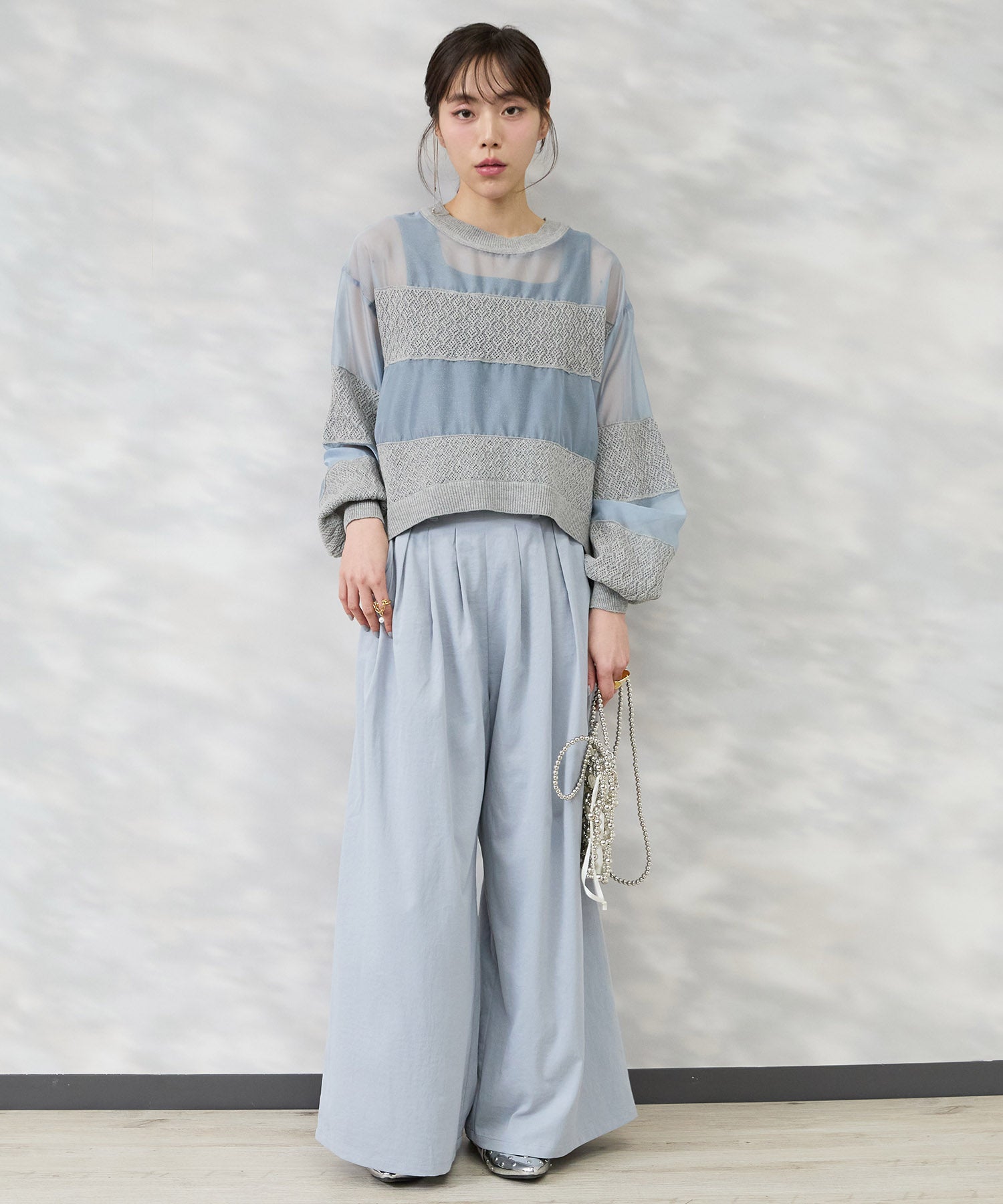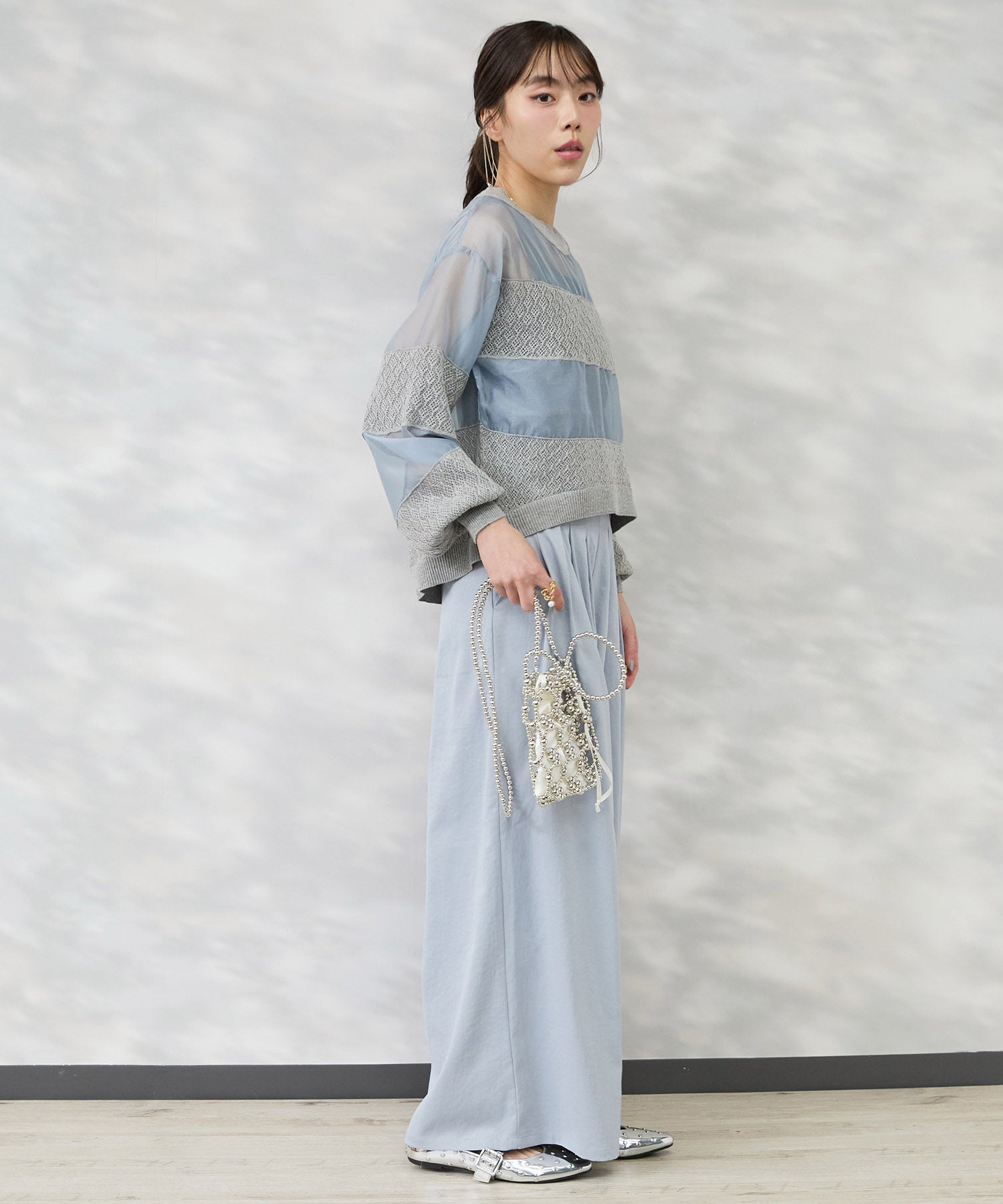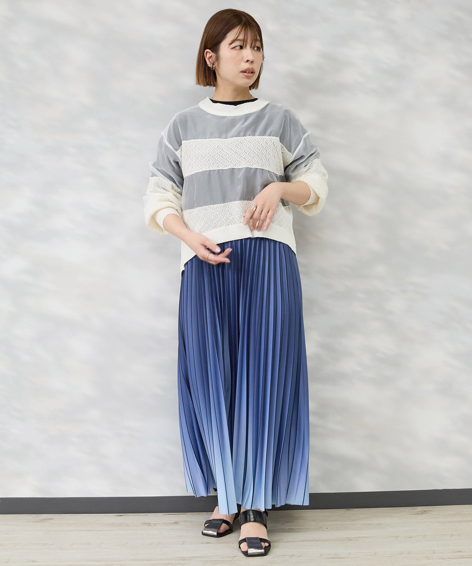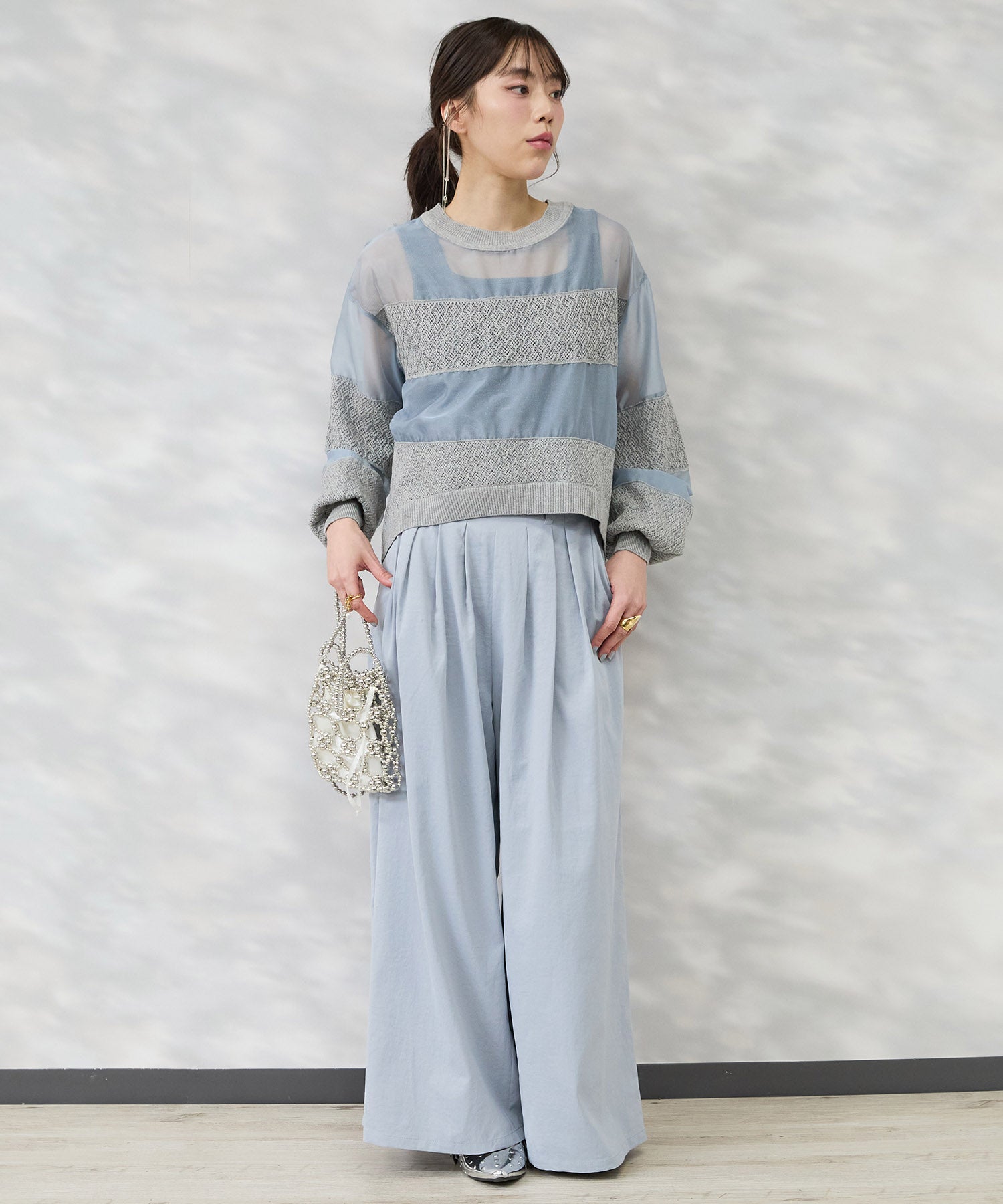 オーガンジーと透かし編みをボーダー状に重ねた、表情豊かなデザインブラウス。