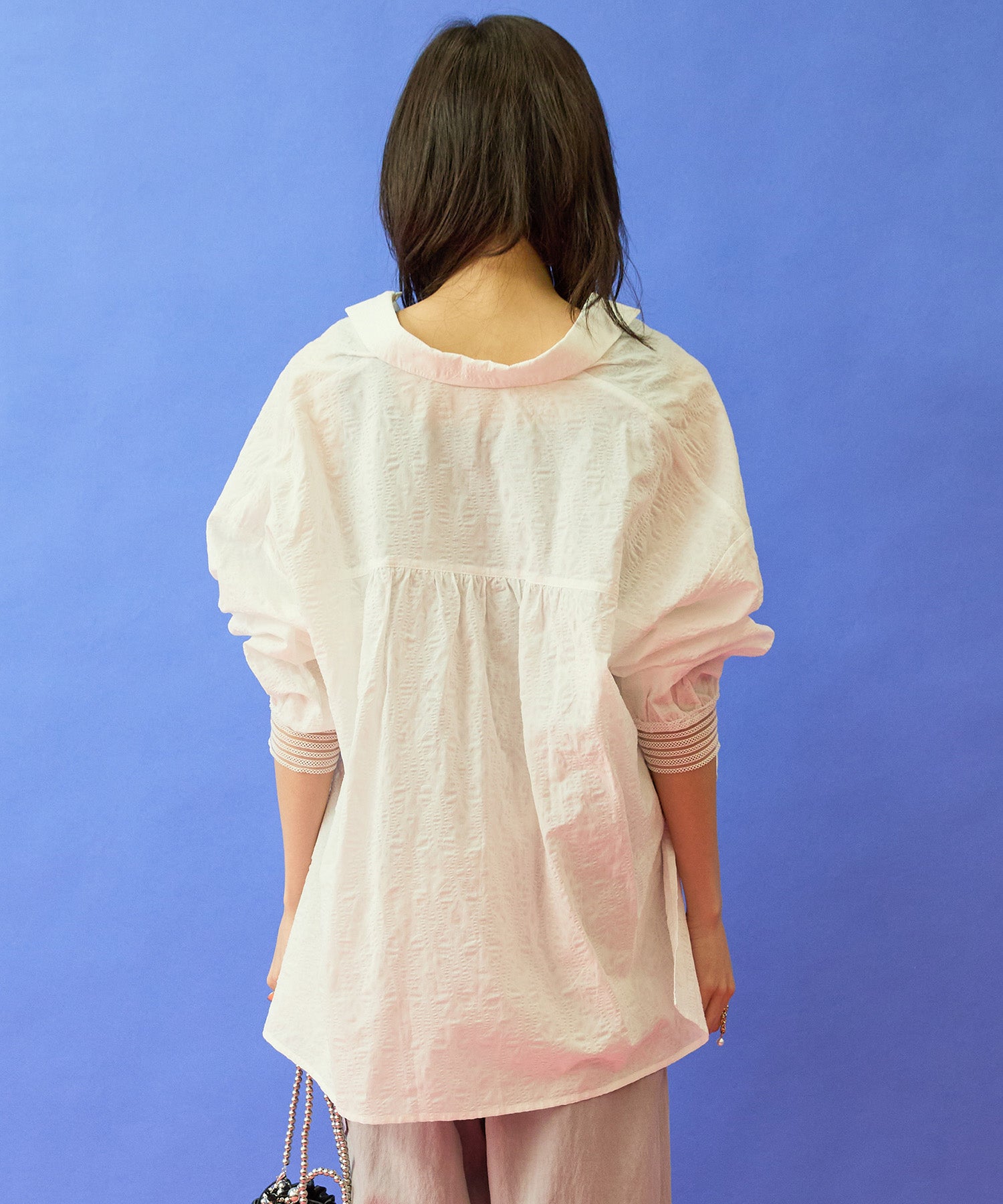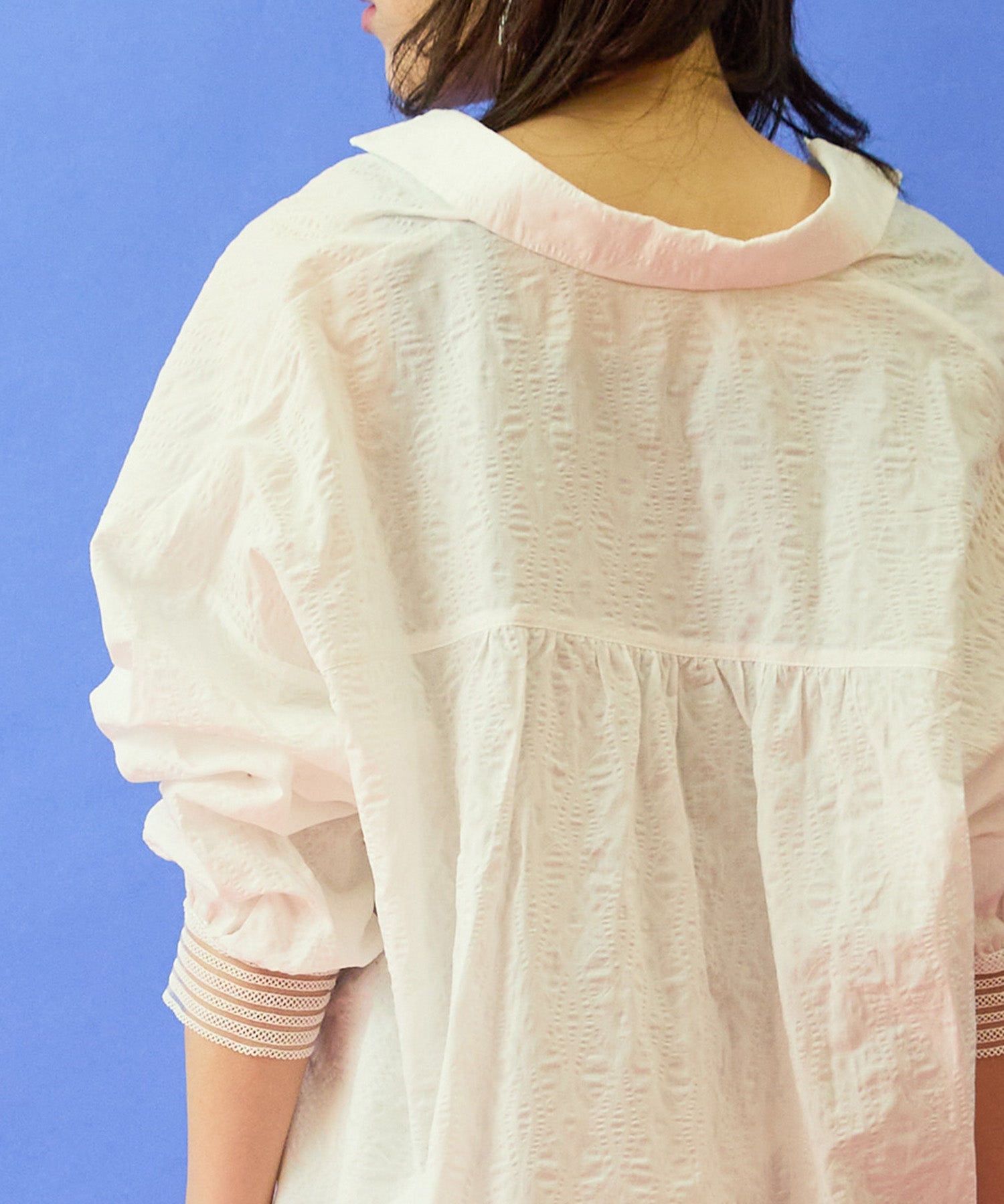 ランダムな凹凸感が印象的なサッカー素材に、スキッパーデザインの軽やかさをプラス。