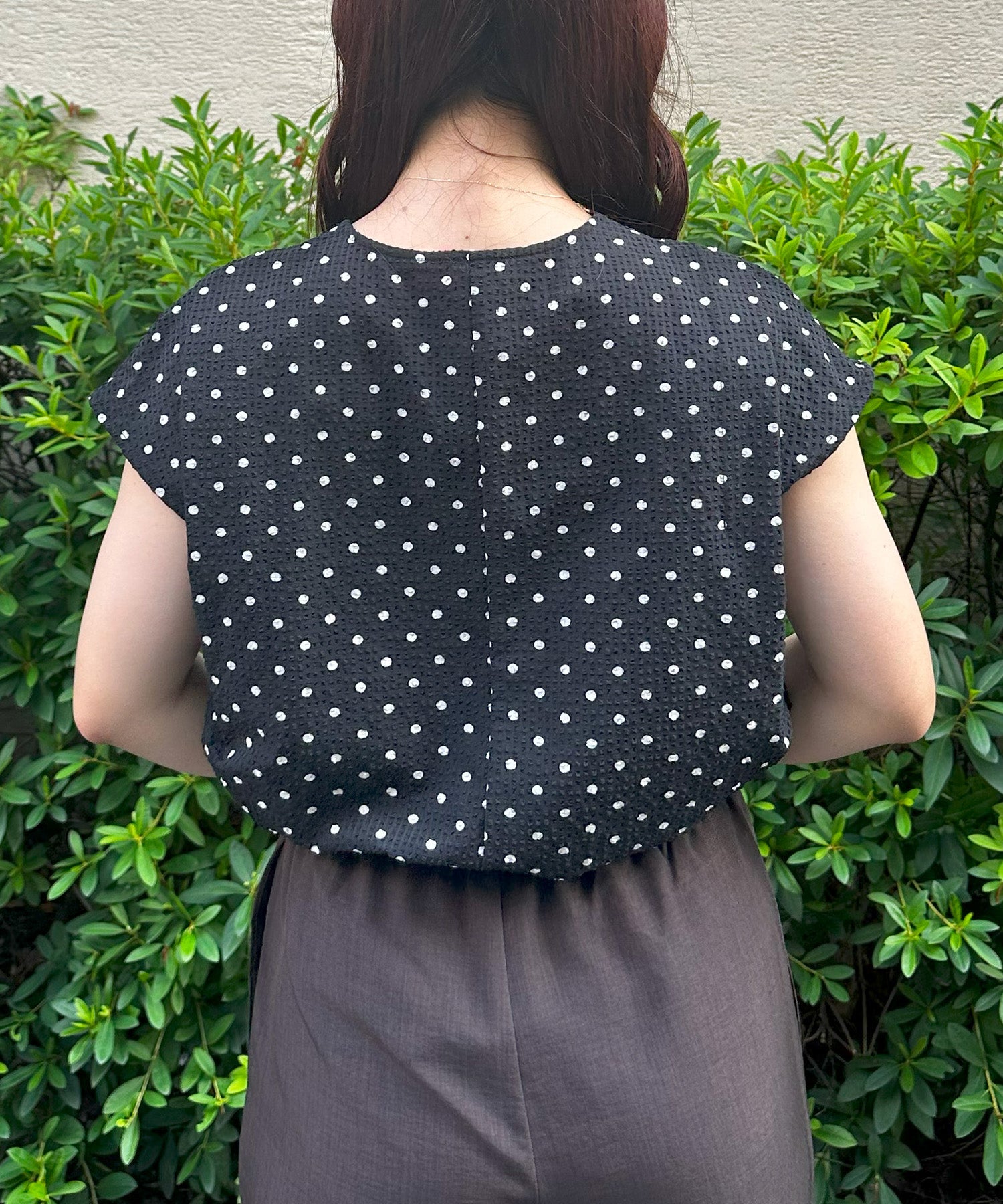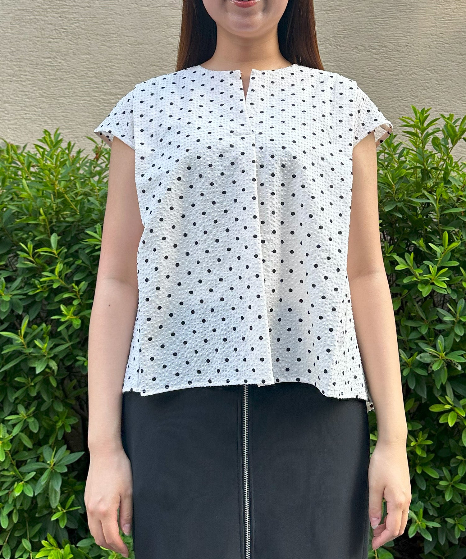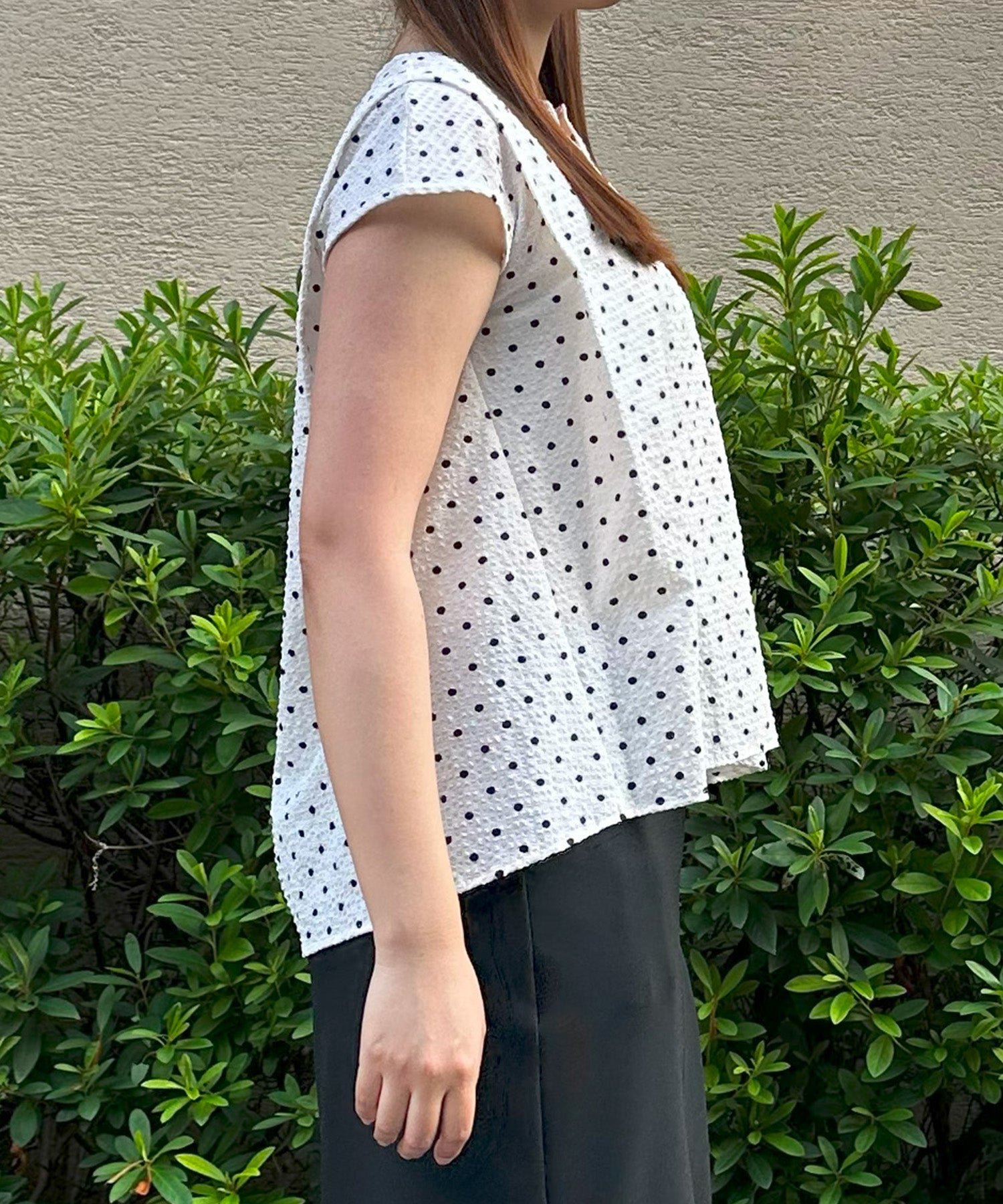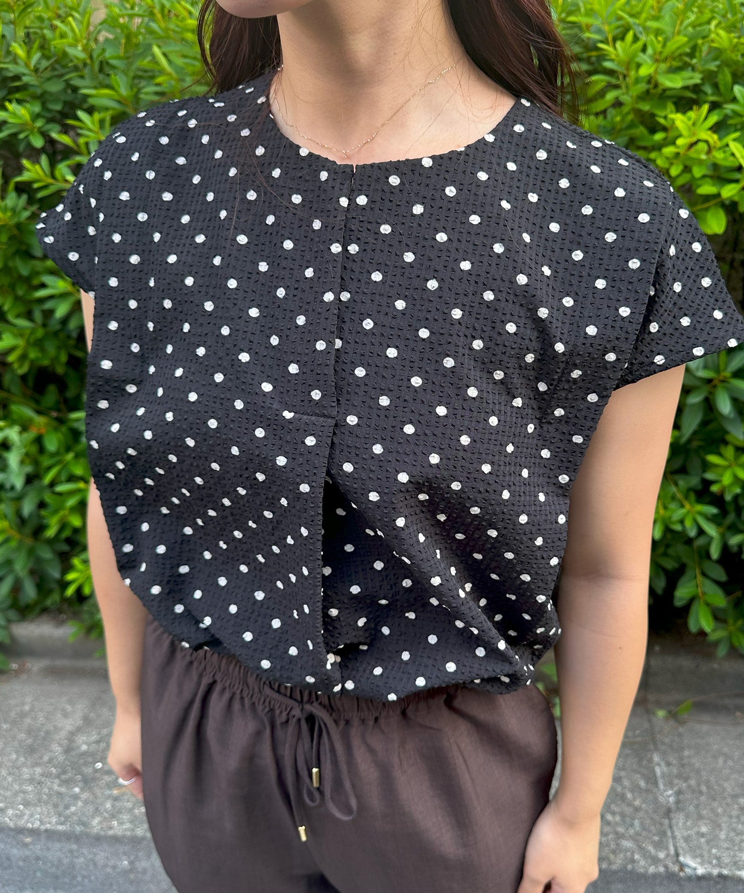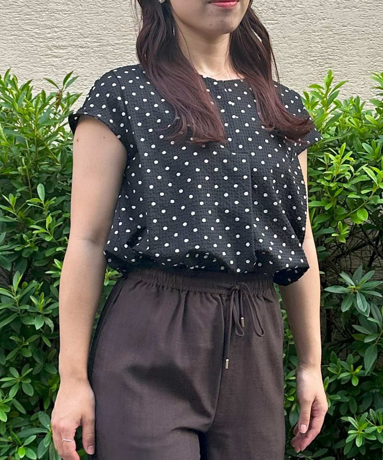 小さめドット×フレンチスリーブの組み合わせが、上品で愛らしい印象を与える夏ブラウス。