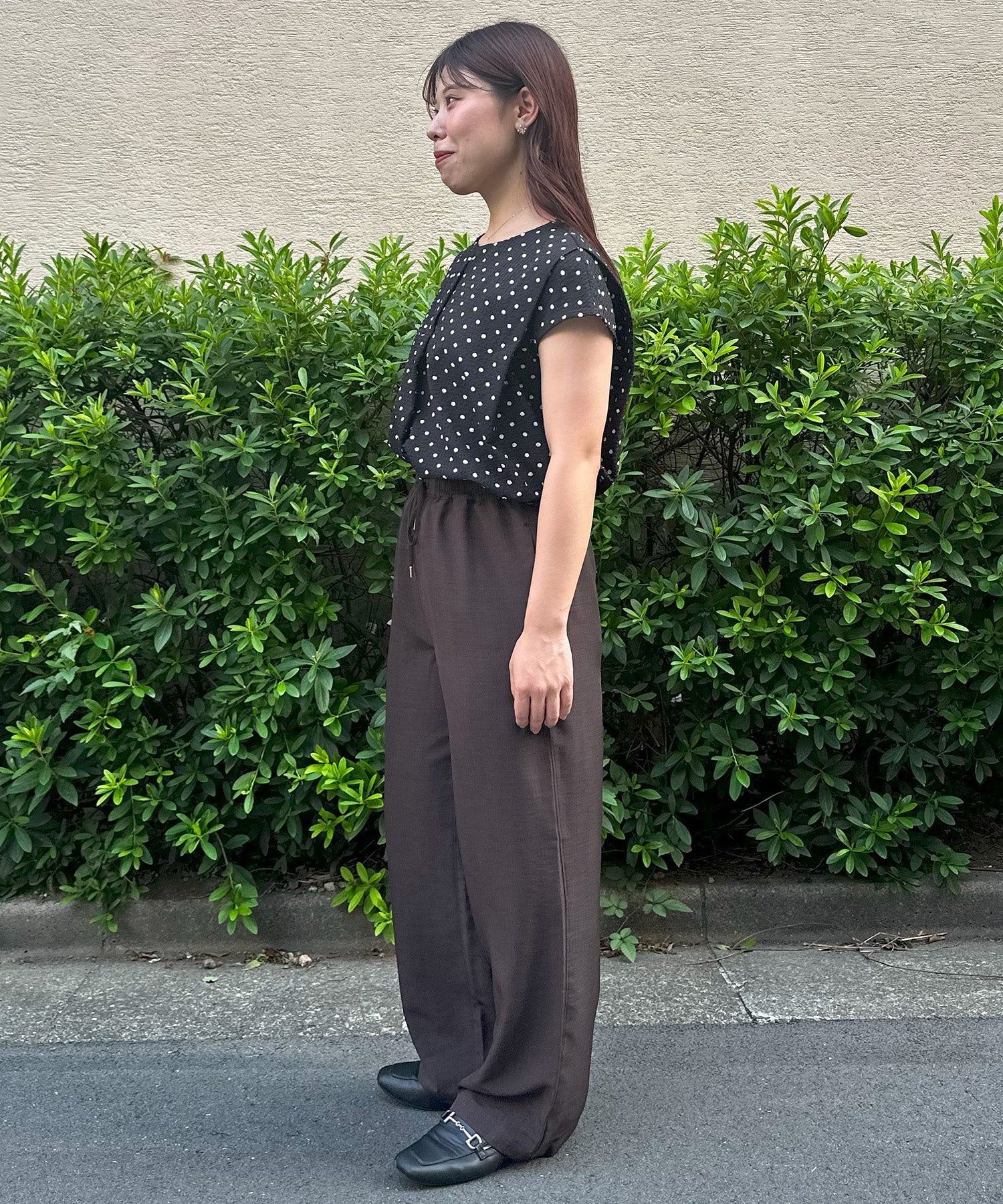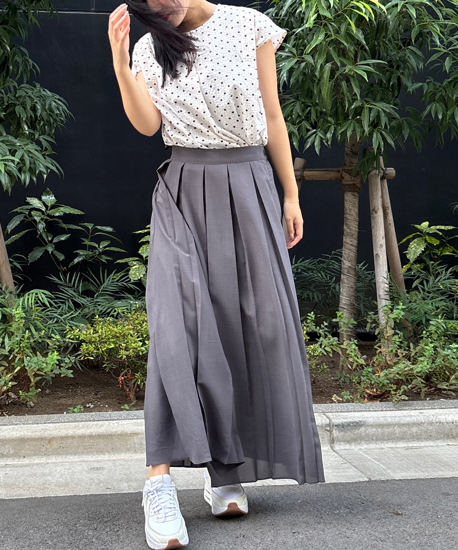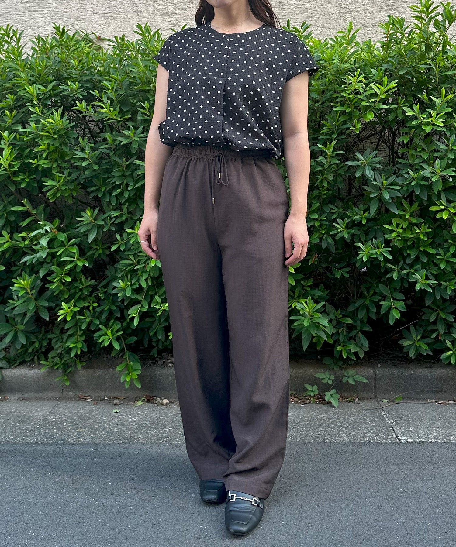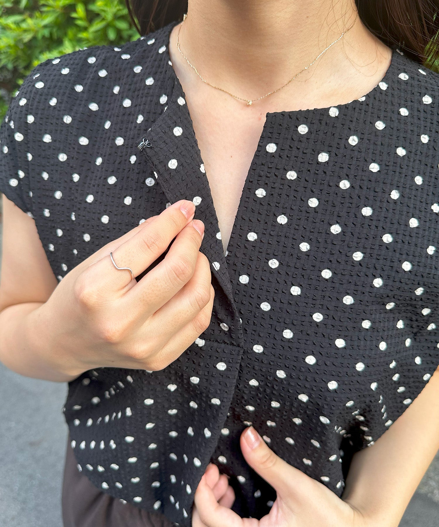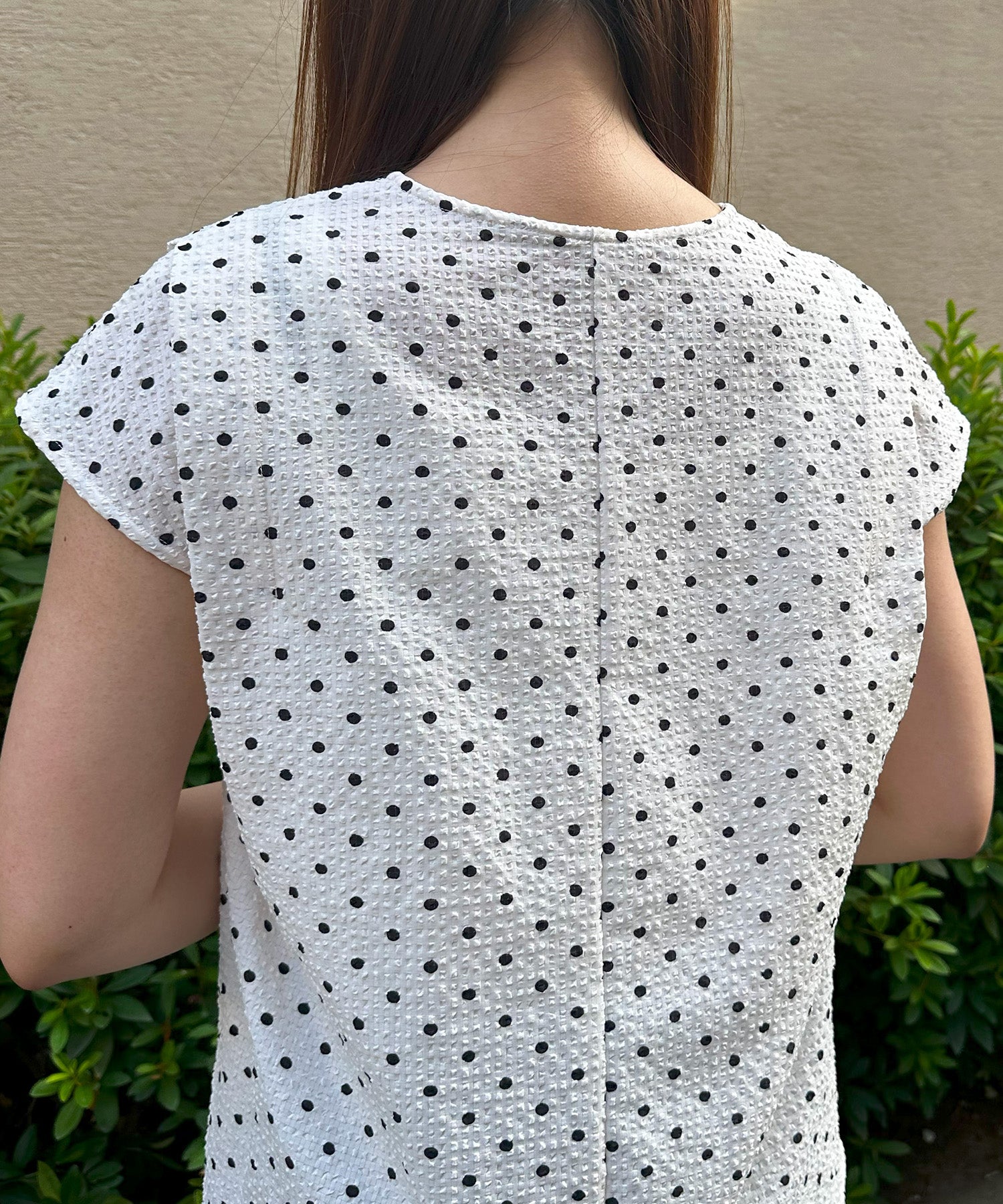 小さめドット×フレンチスリーブの組み合わせが、上品で愛らしい印象を与える夏ブラウス。