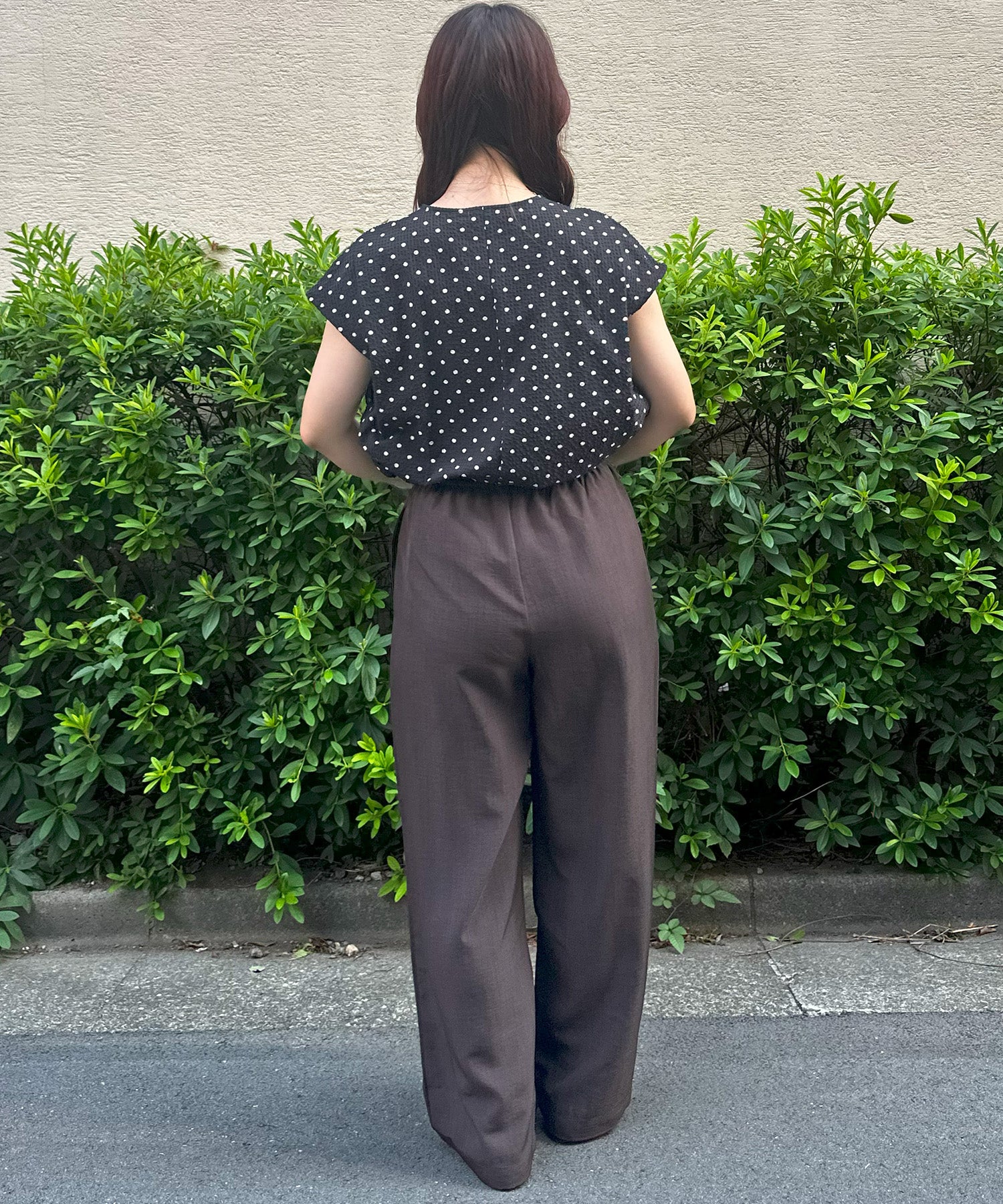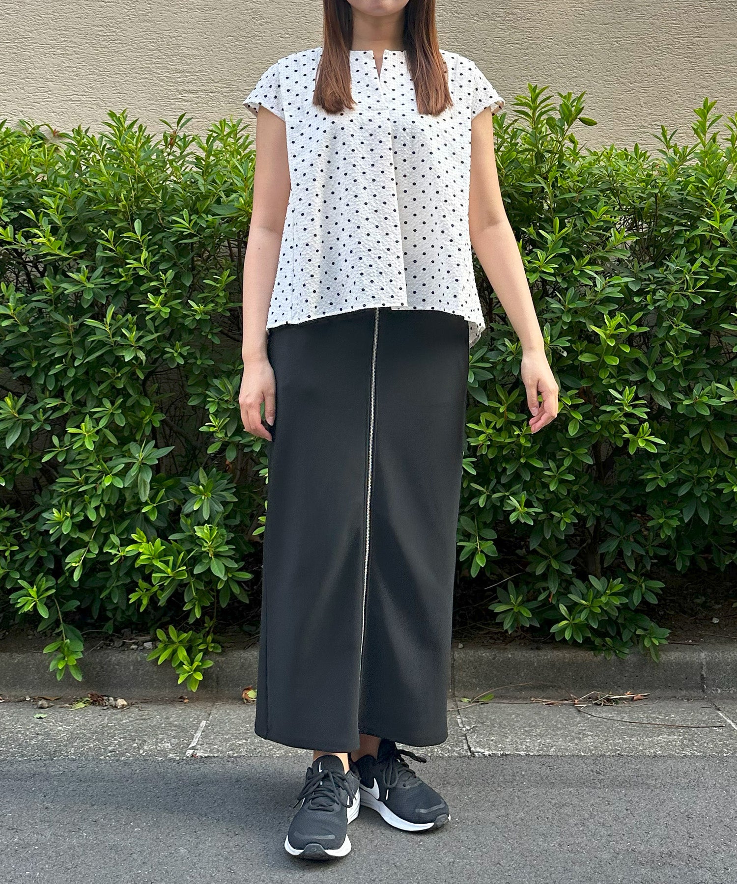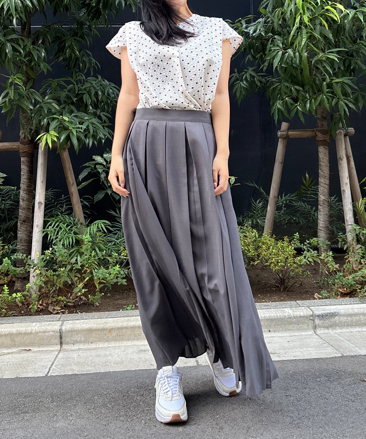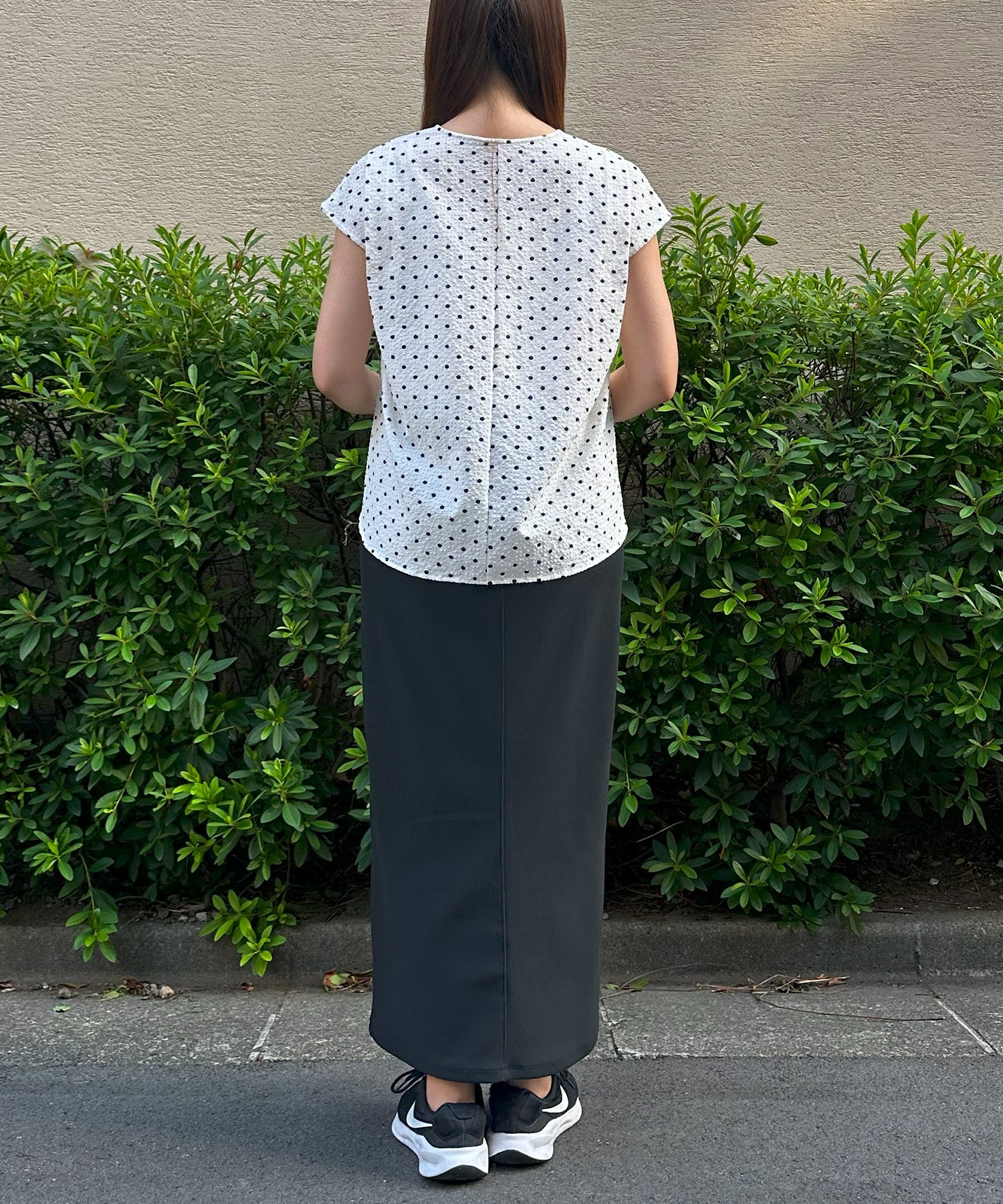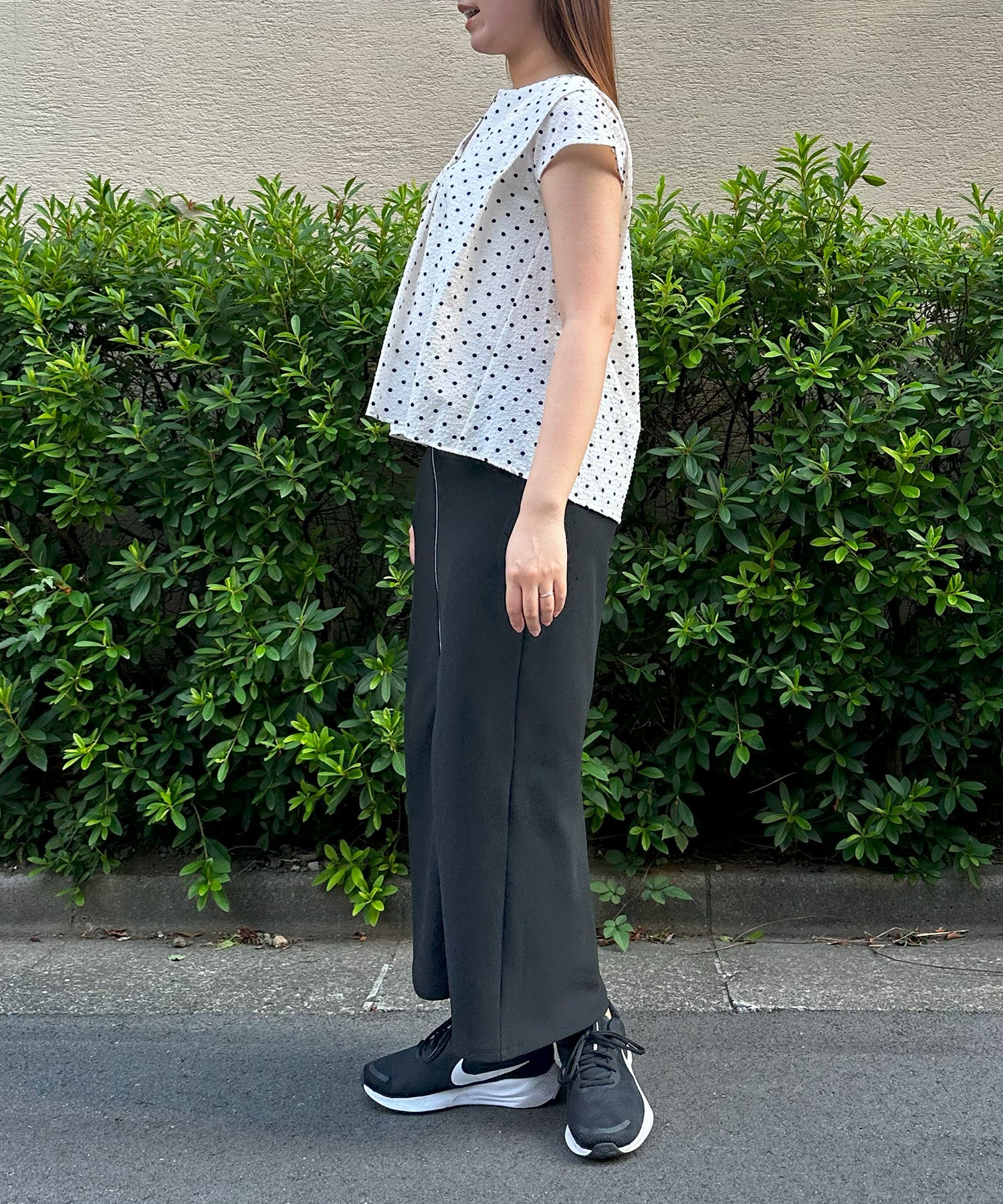 小さめドット×フレンチスリーブの組み合わせが、上品で愛らしい印象を与える夏ブラウス。