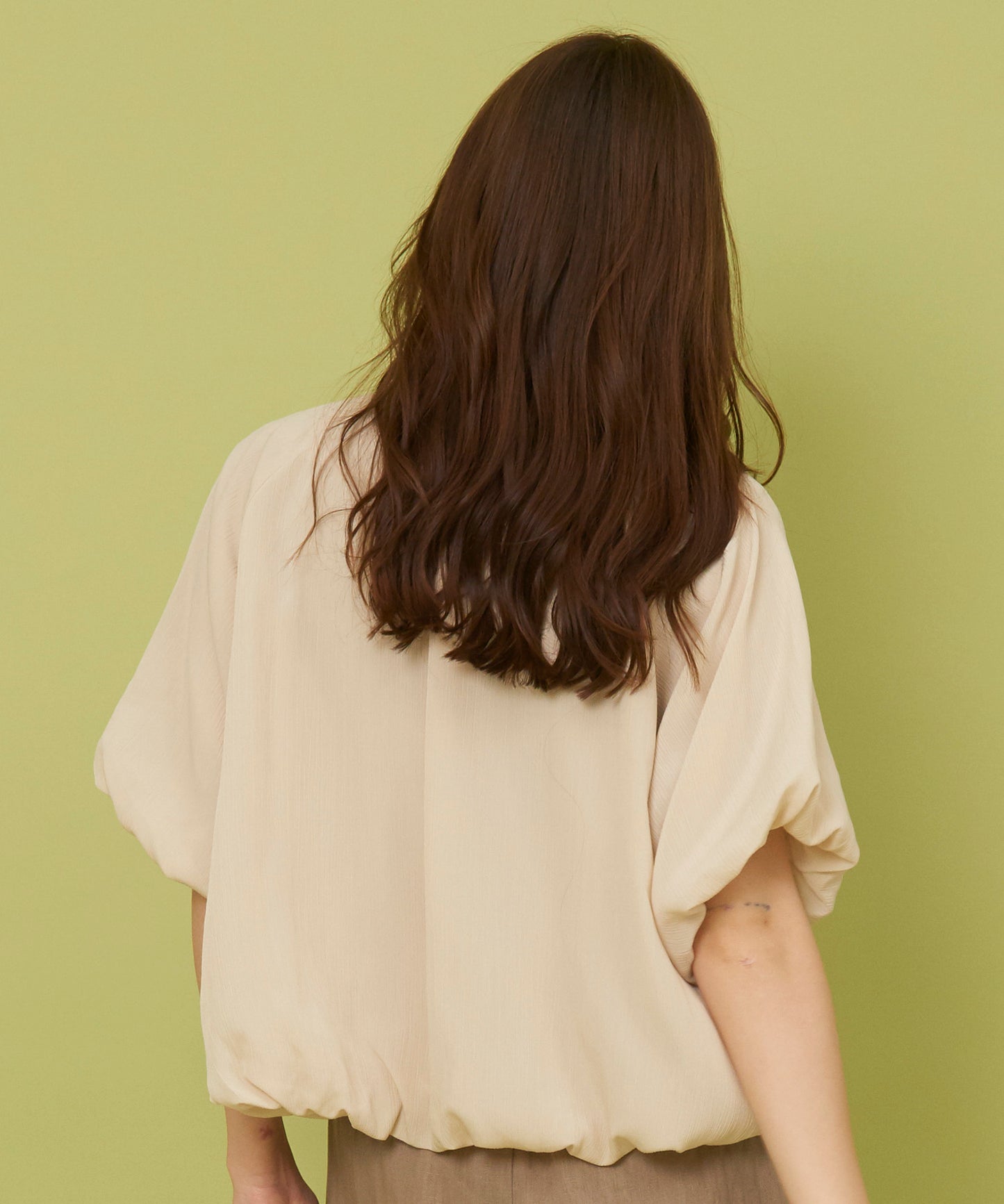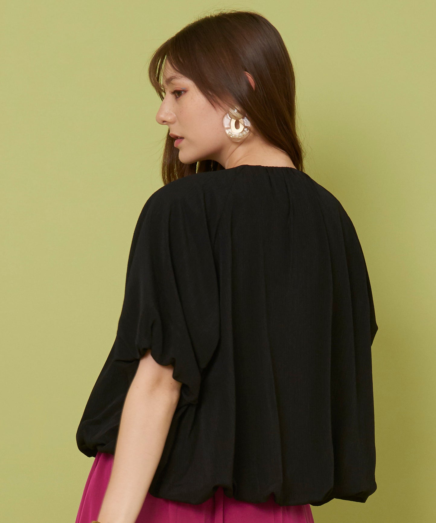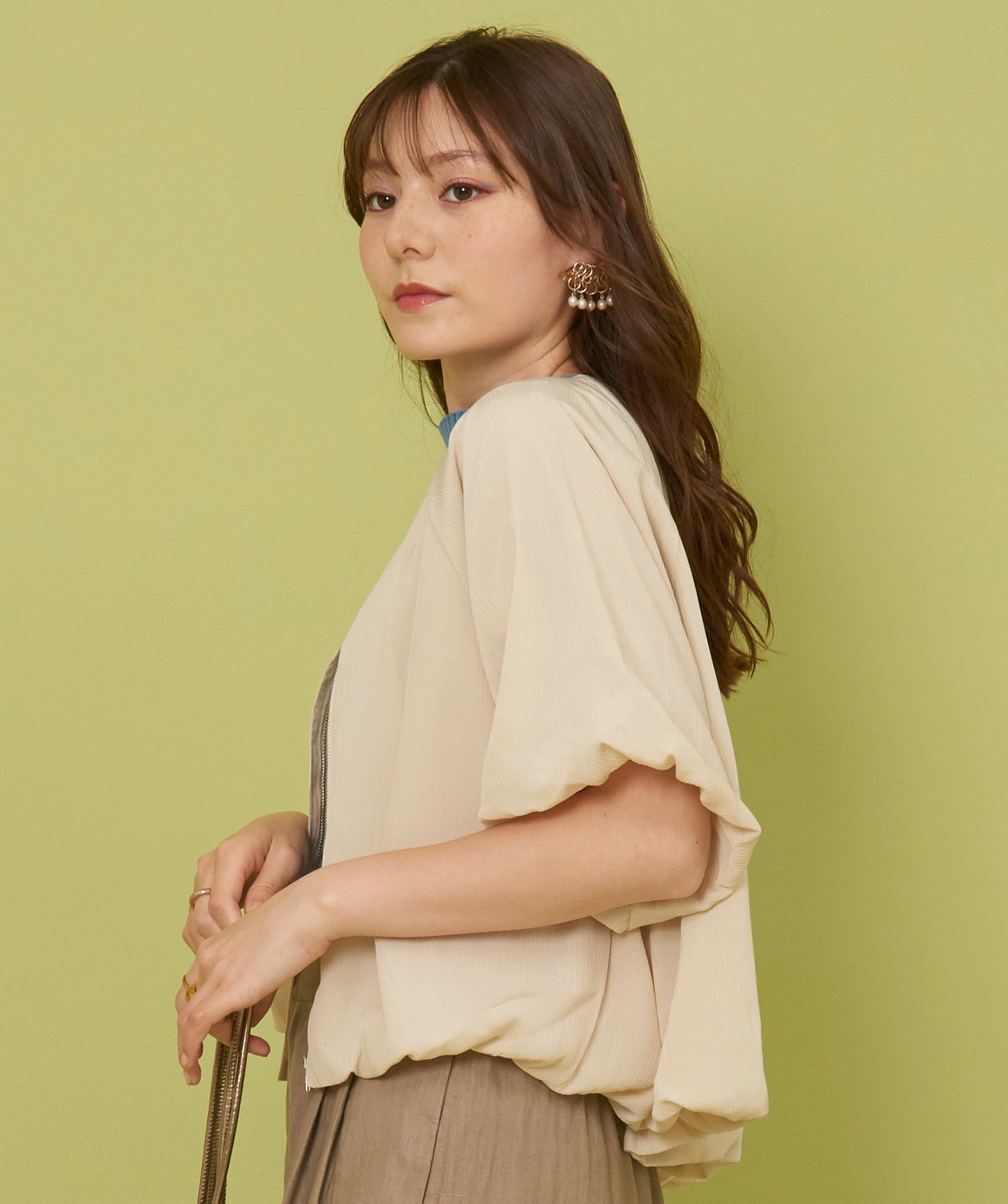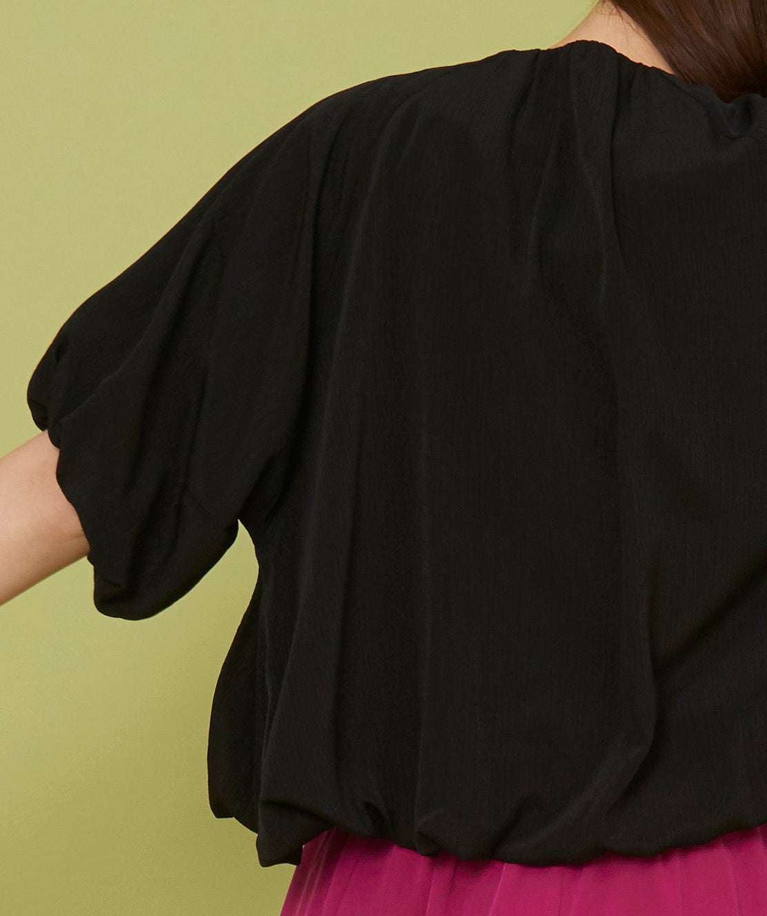袖は程よくふんわりとしたバルーンスリーブで華やかさをプラス。半袖よりもやや長めの袖丈が安心です。