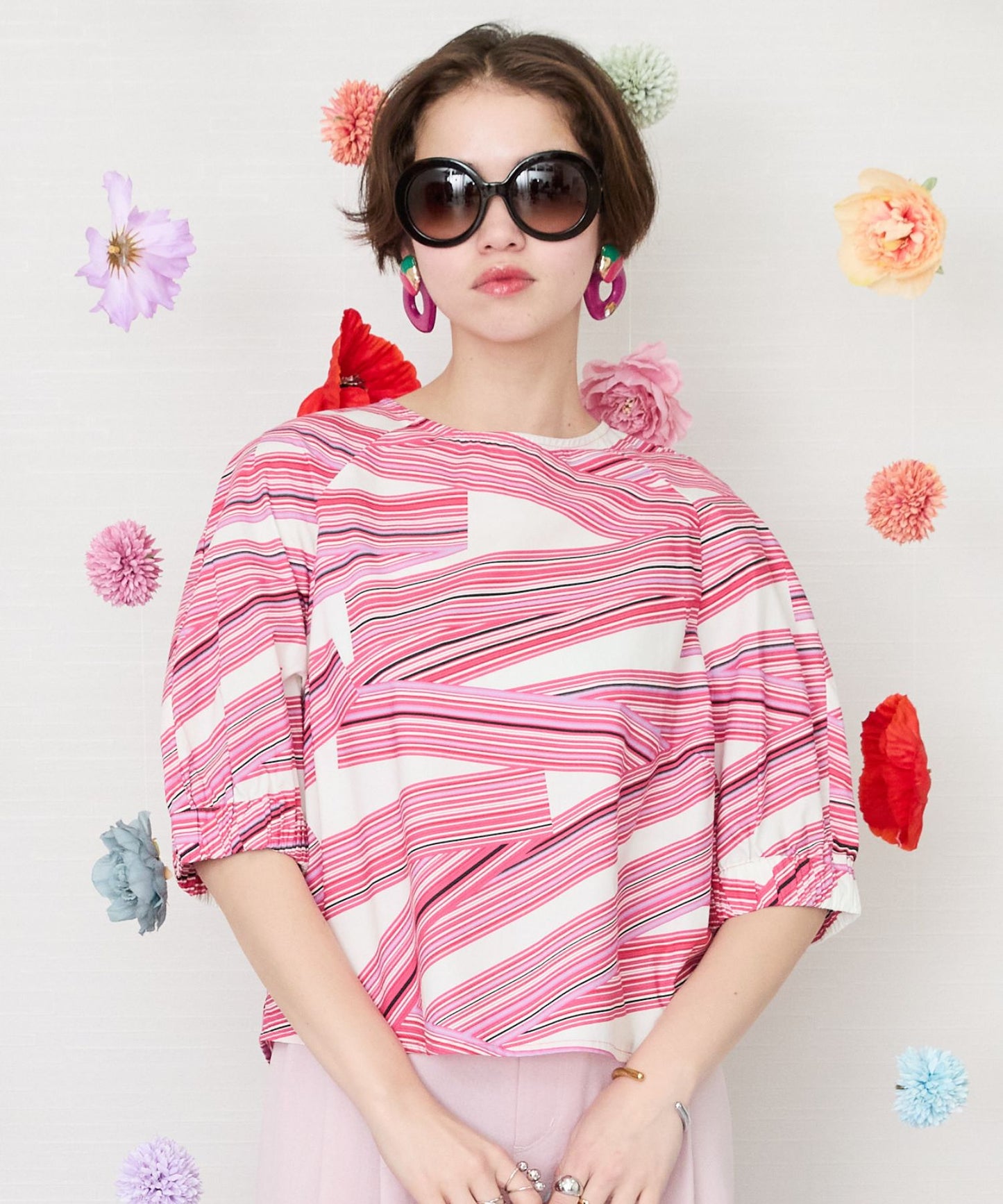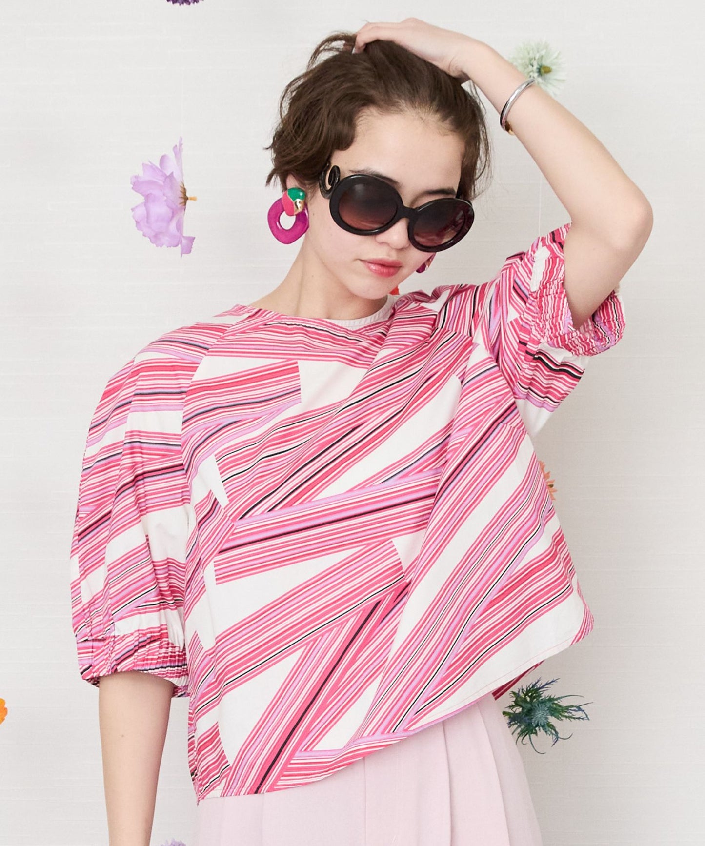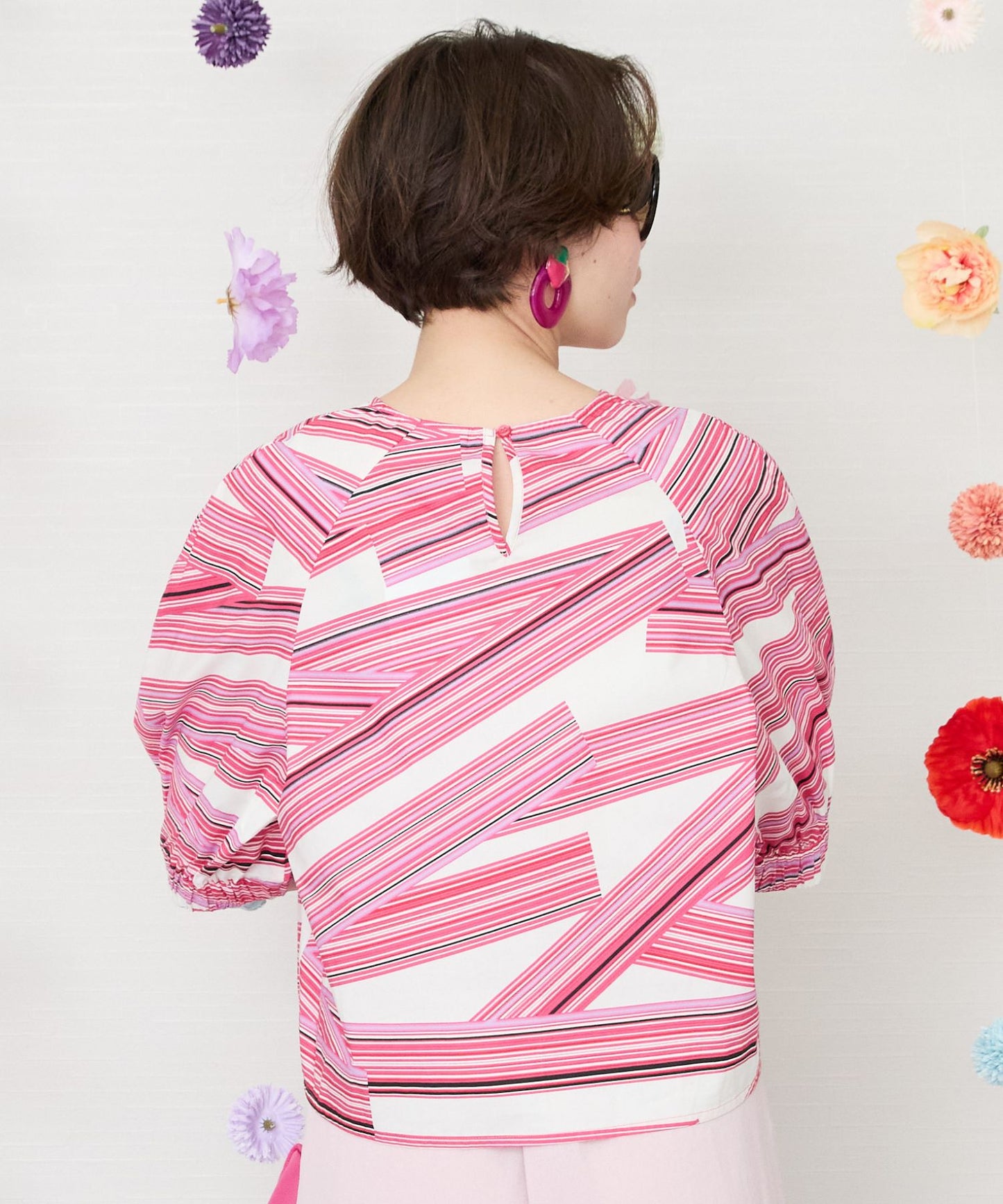 鮮やかなカラーと印象的なテーププリントが目を惹くブラウス。