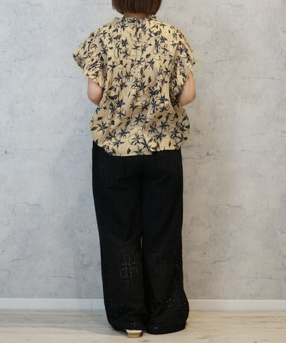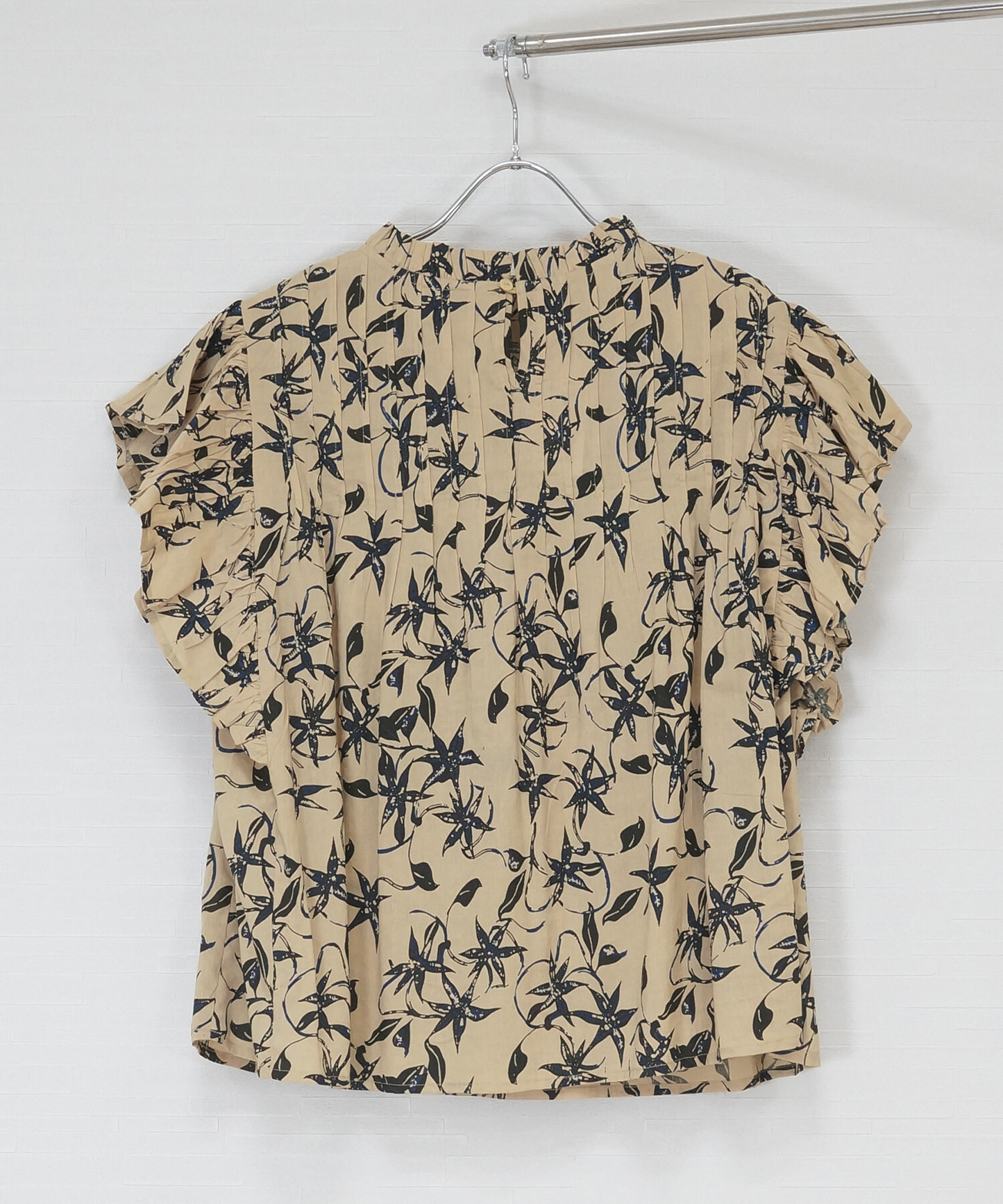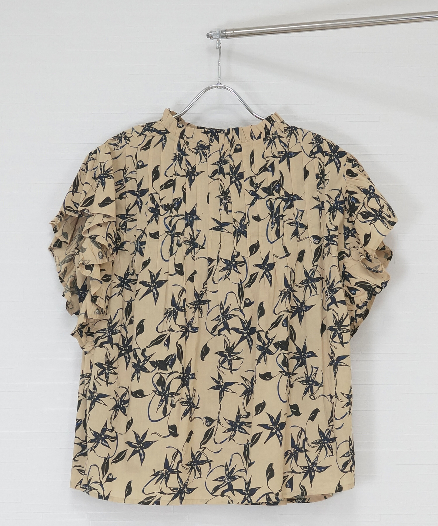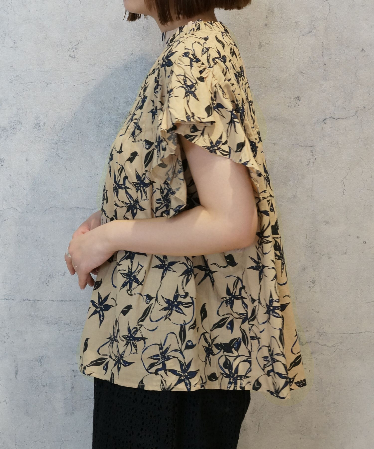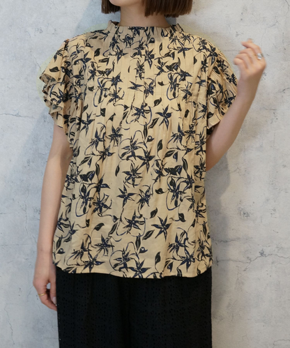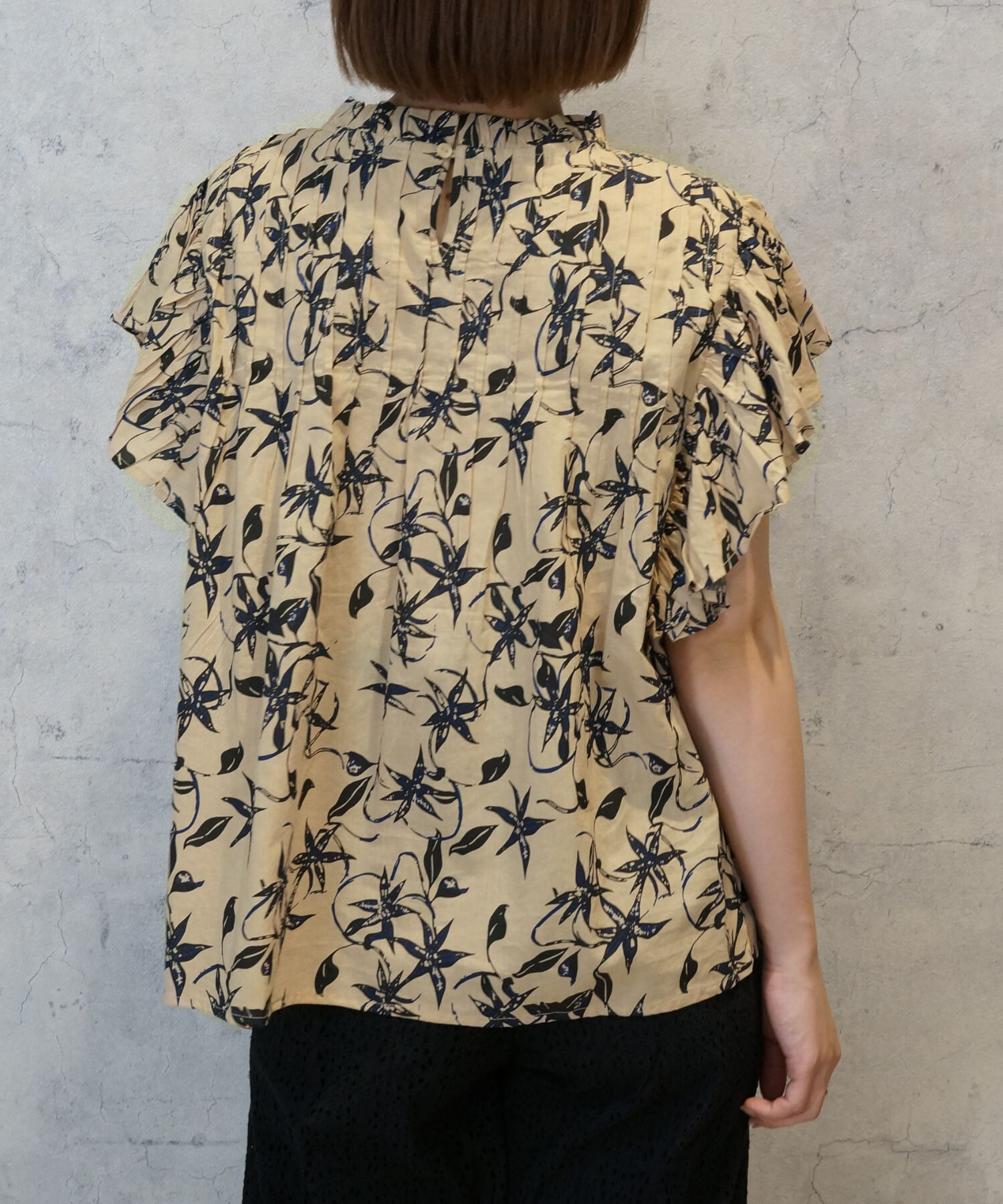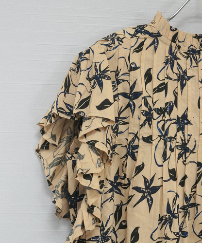 【INDUS luxury for JETSET SOLO PLUS】リーフプリントフリルスリーブブラウス