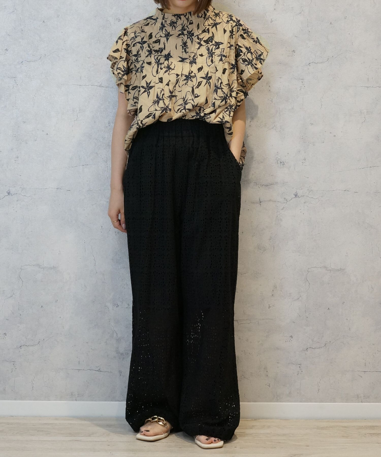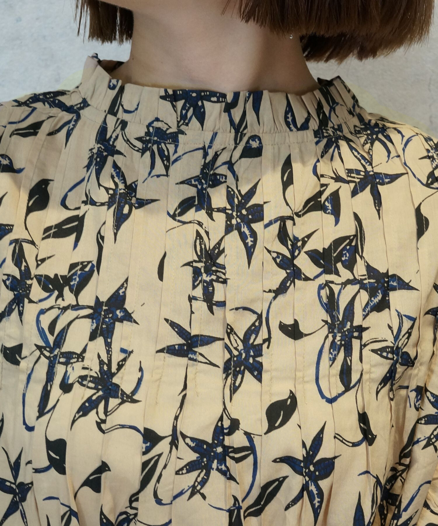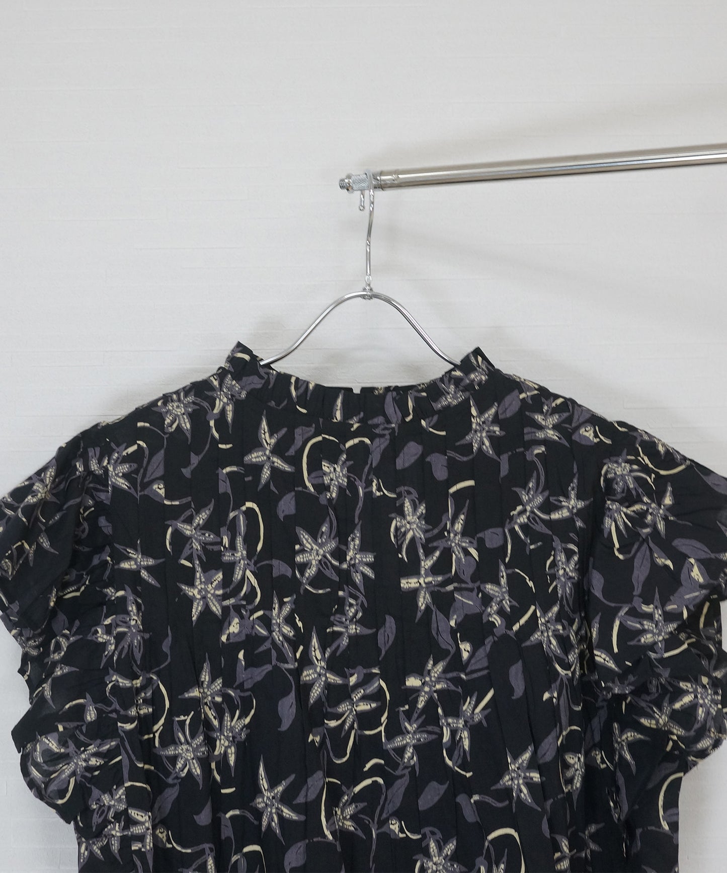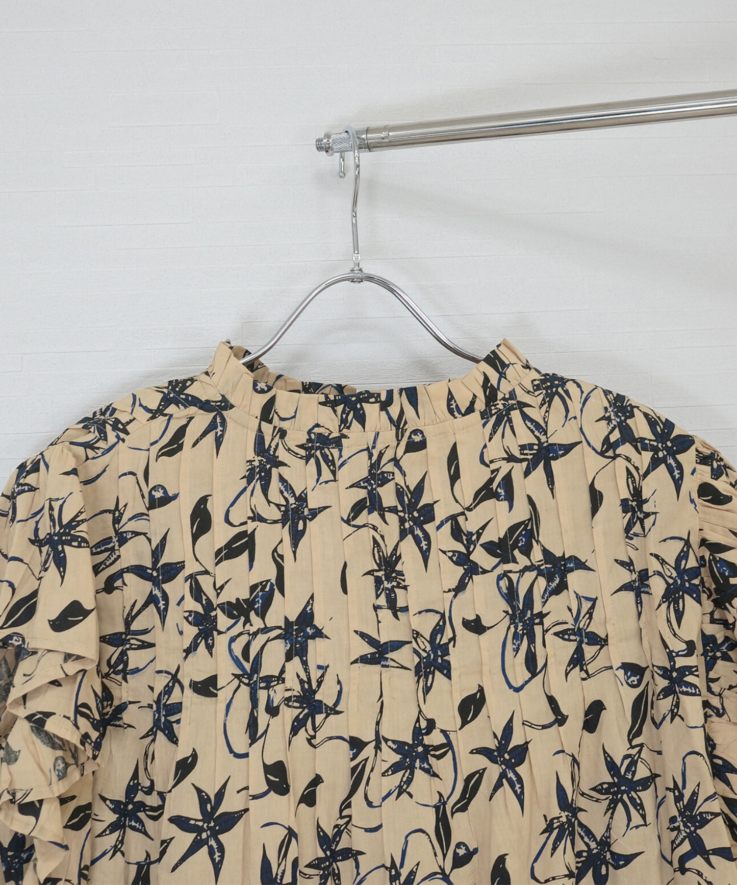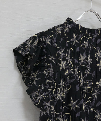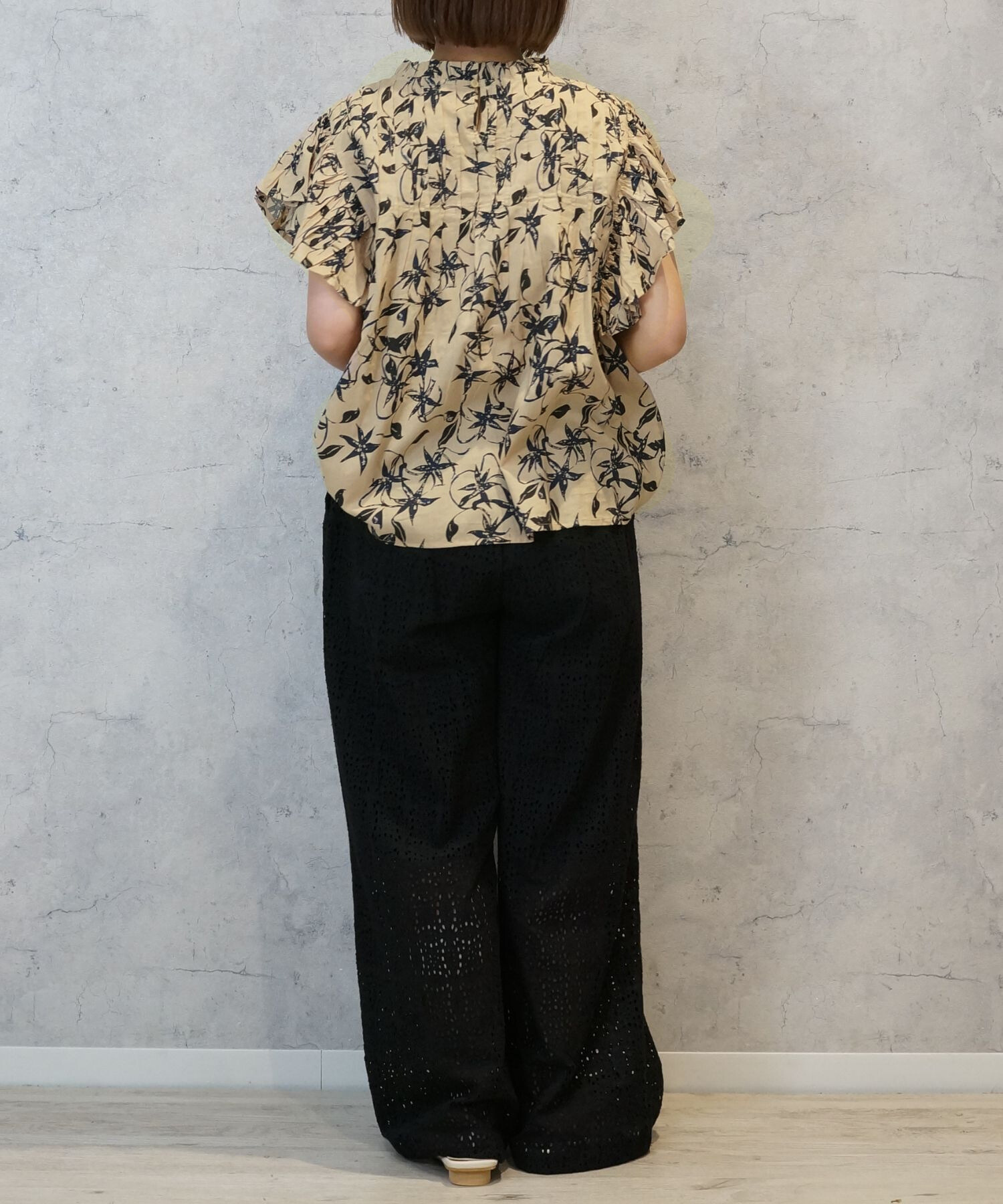 【INDUS luxury for JETSET SOLO PLUS】リーフプリントフリルスリーブブラウス
