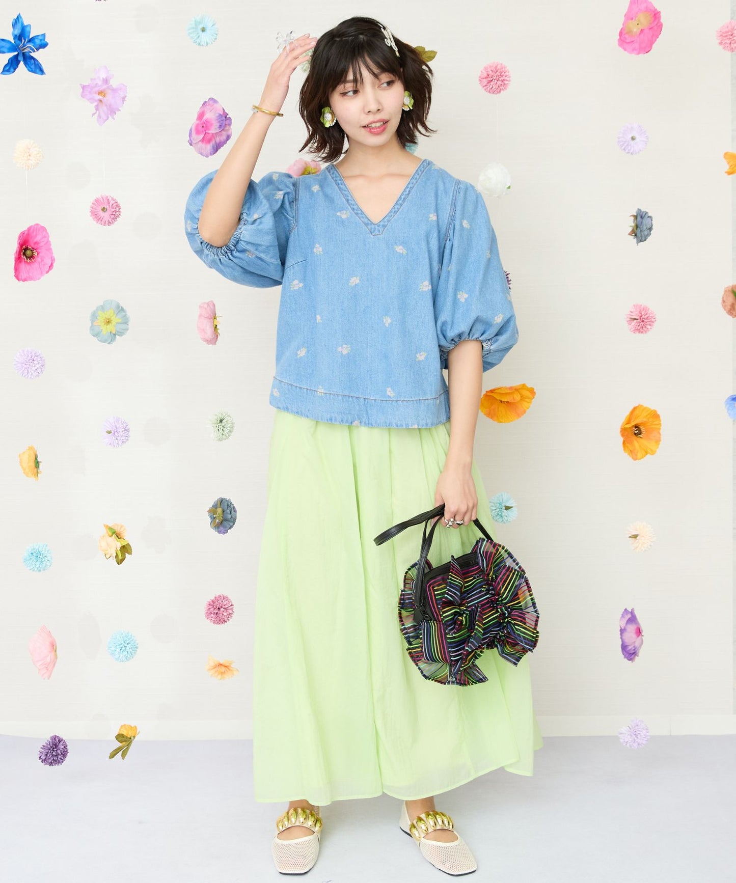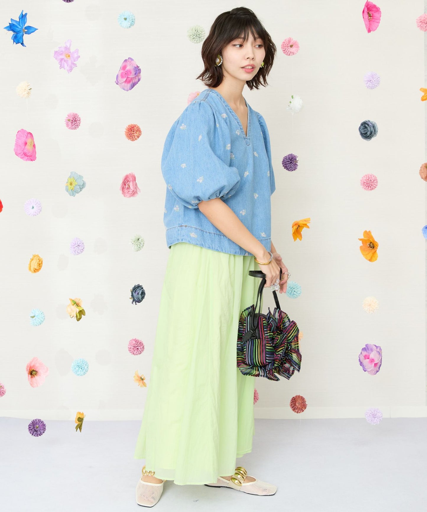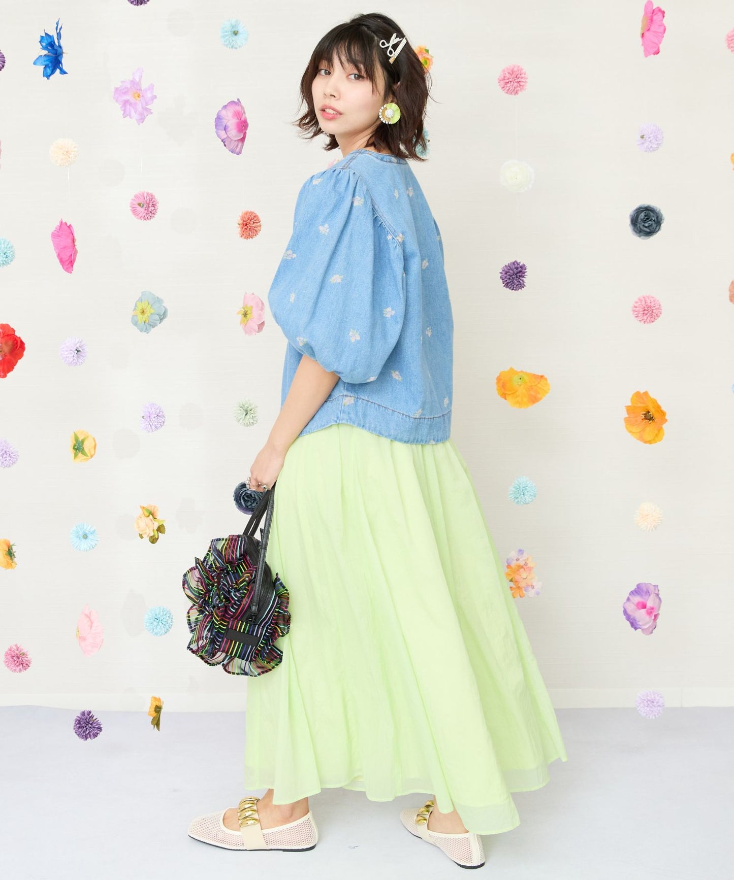 デニム特有の程よいカジュアル感と、プリントの華やかさが絶妙なバランスの仕上がりです。