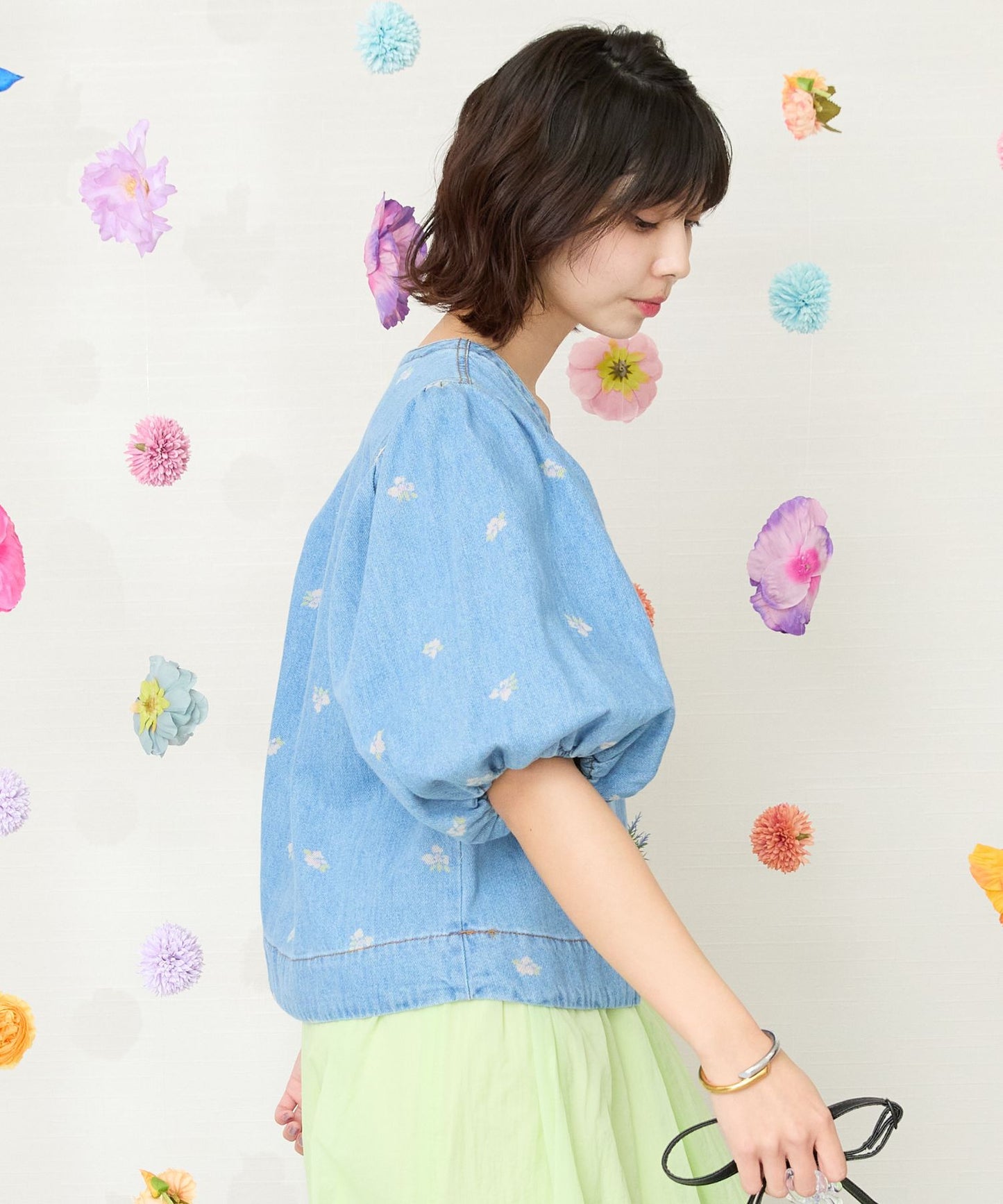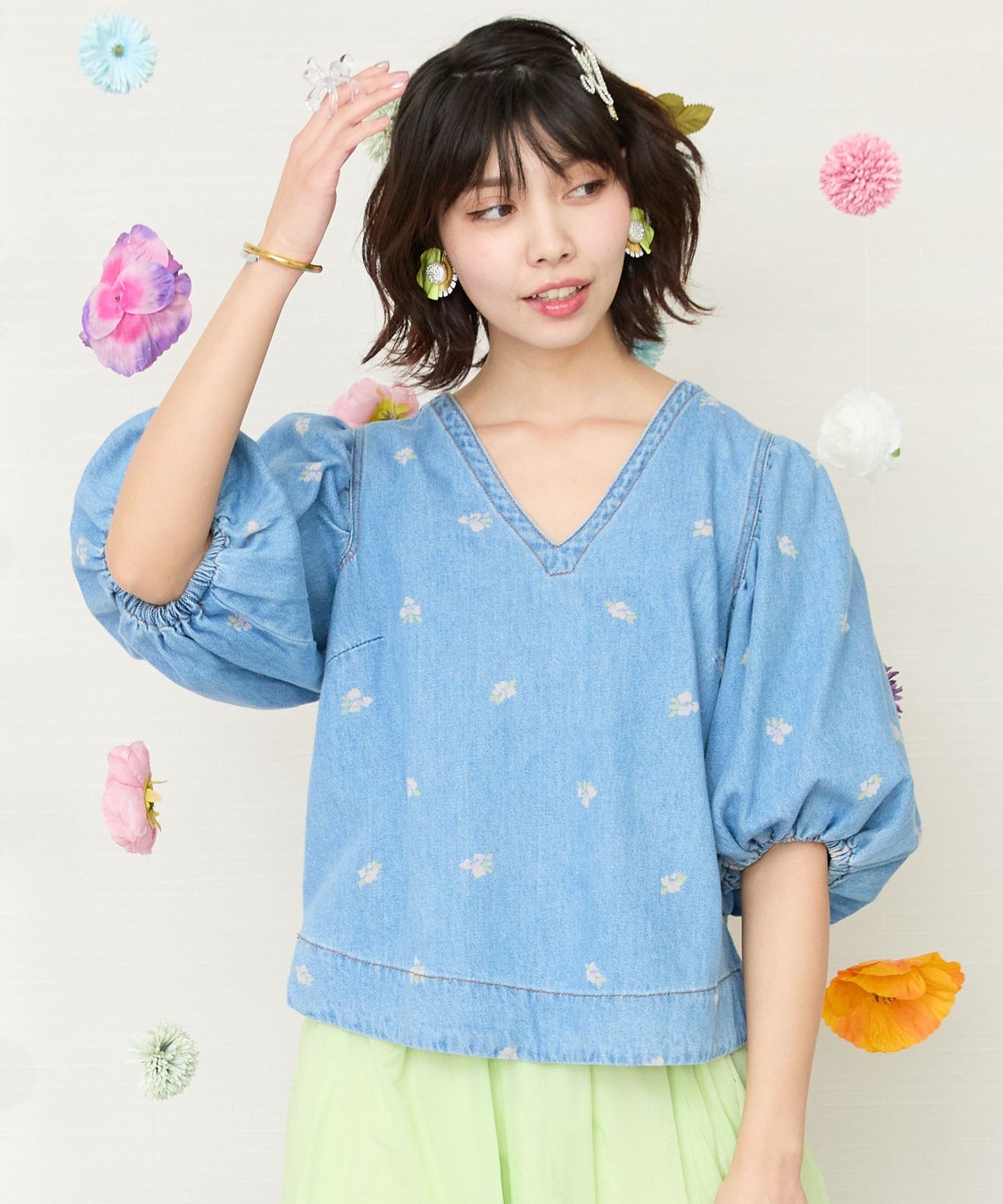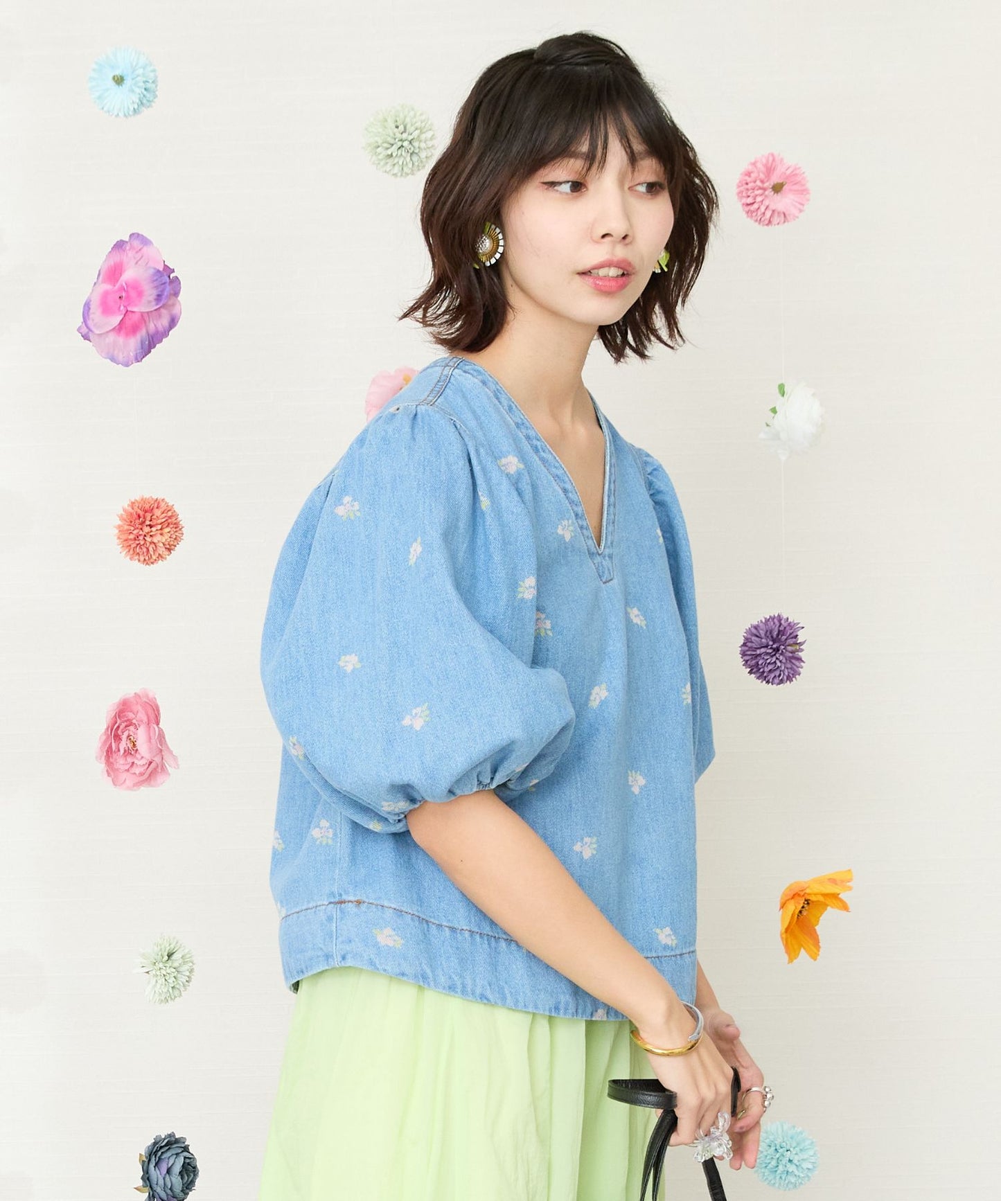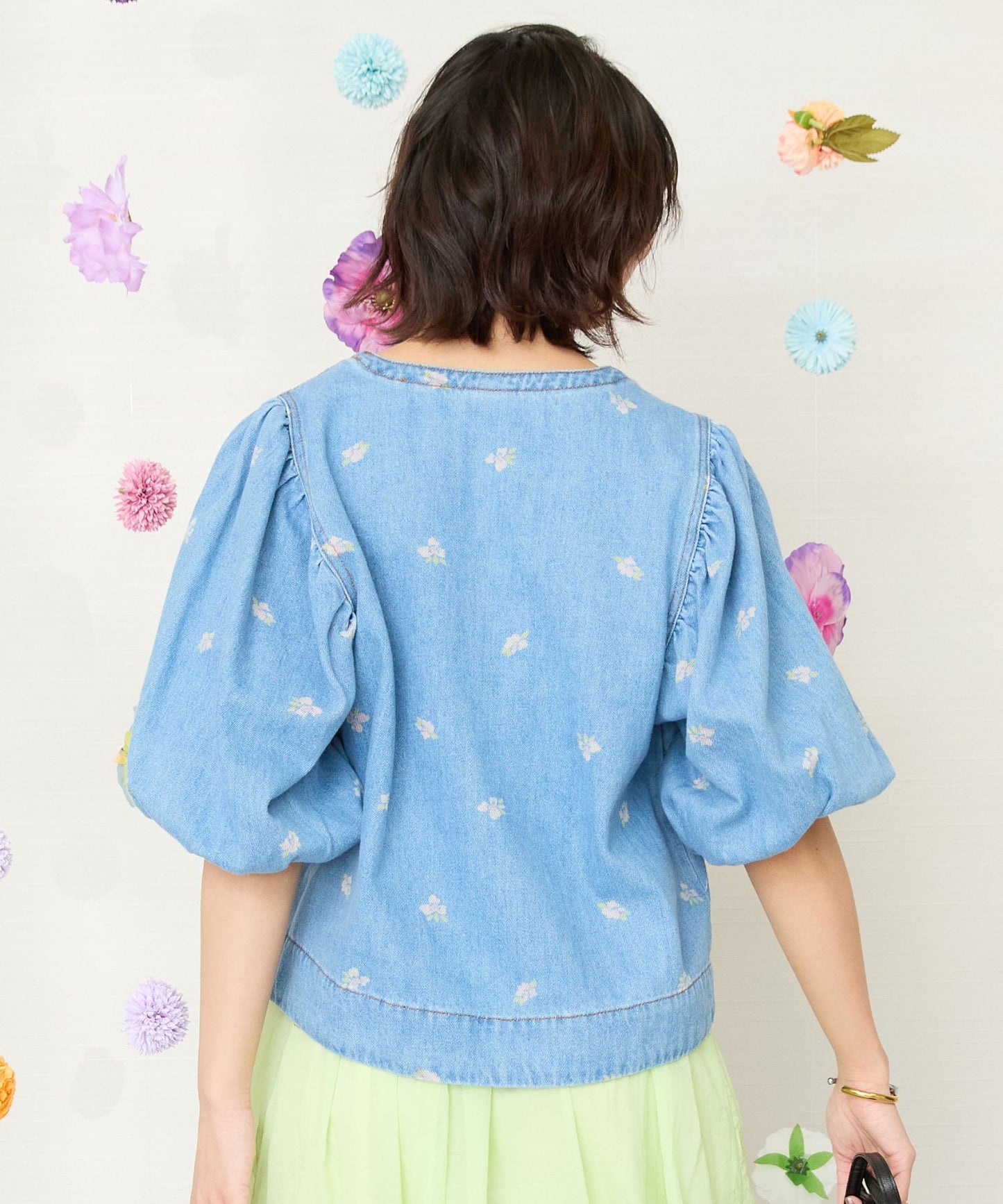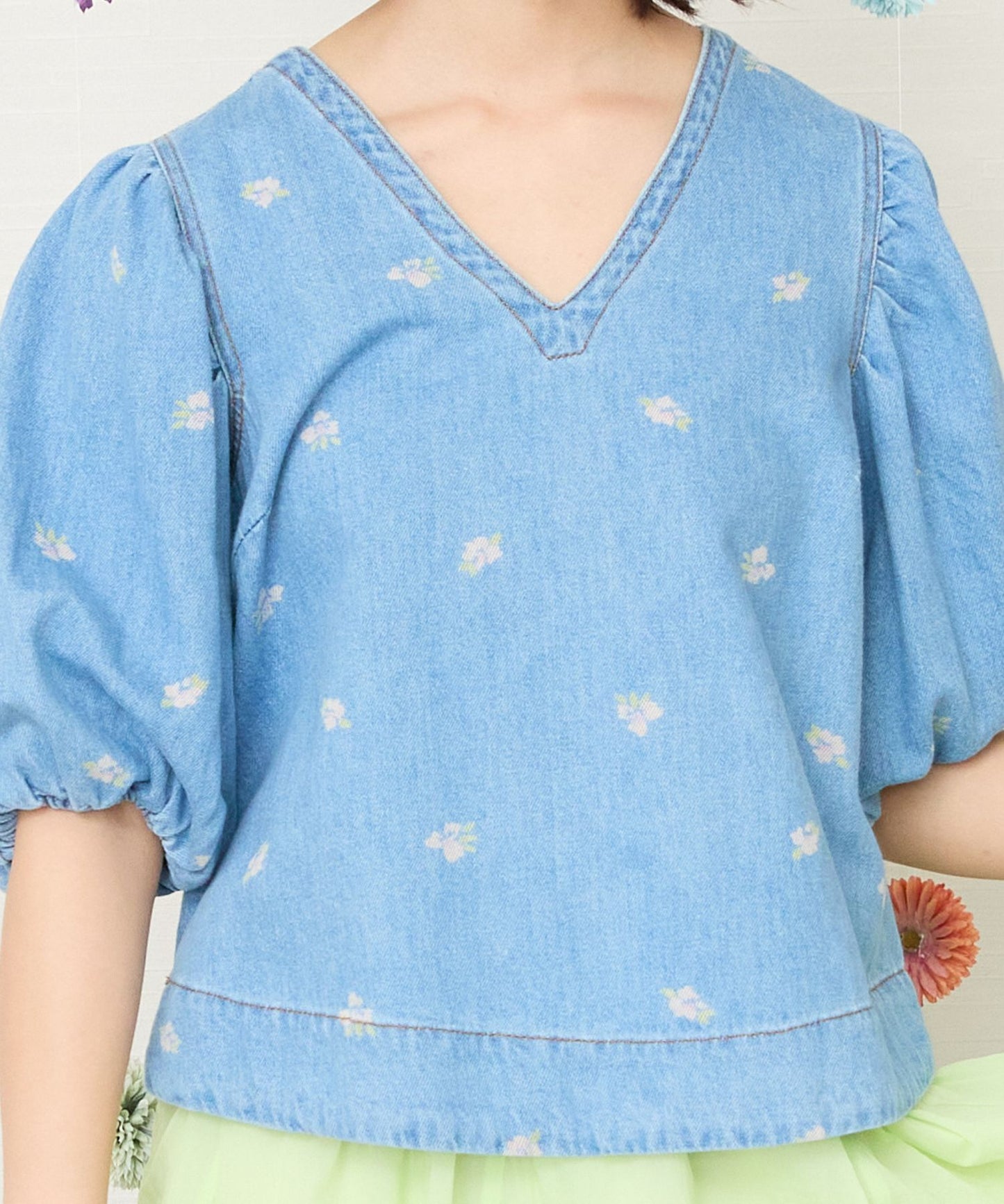 デニム素材にフラワープリントを施した、大人可愛いブラウス。