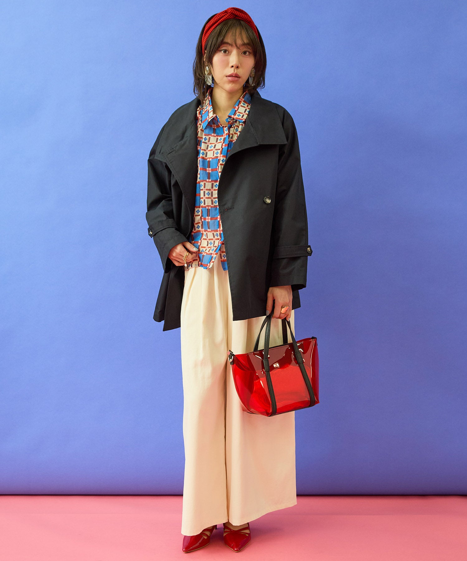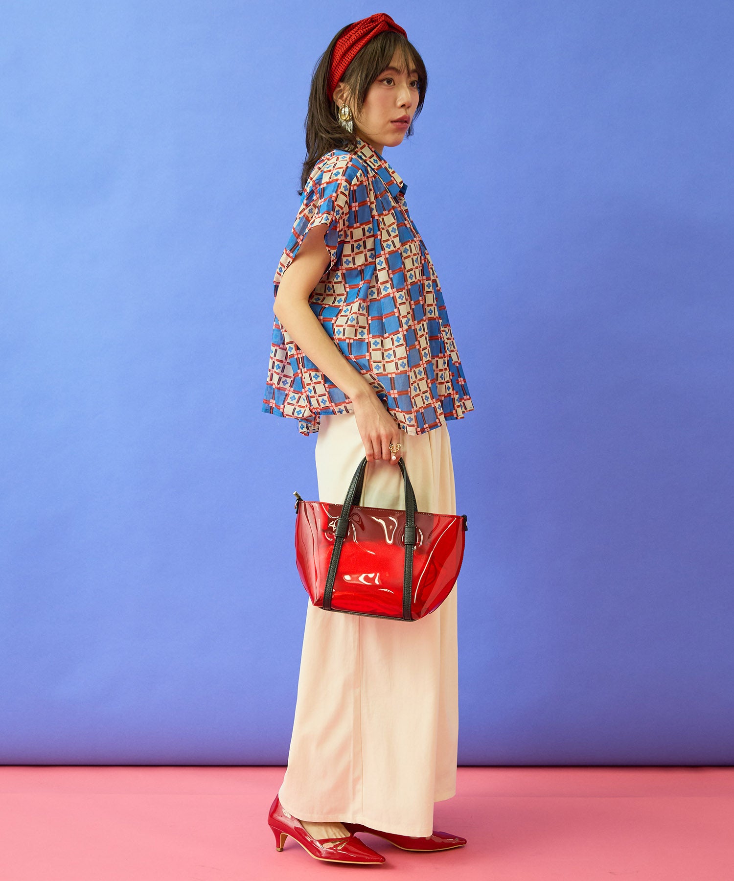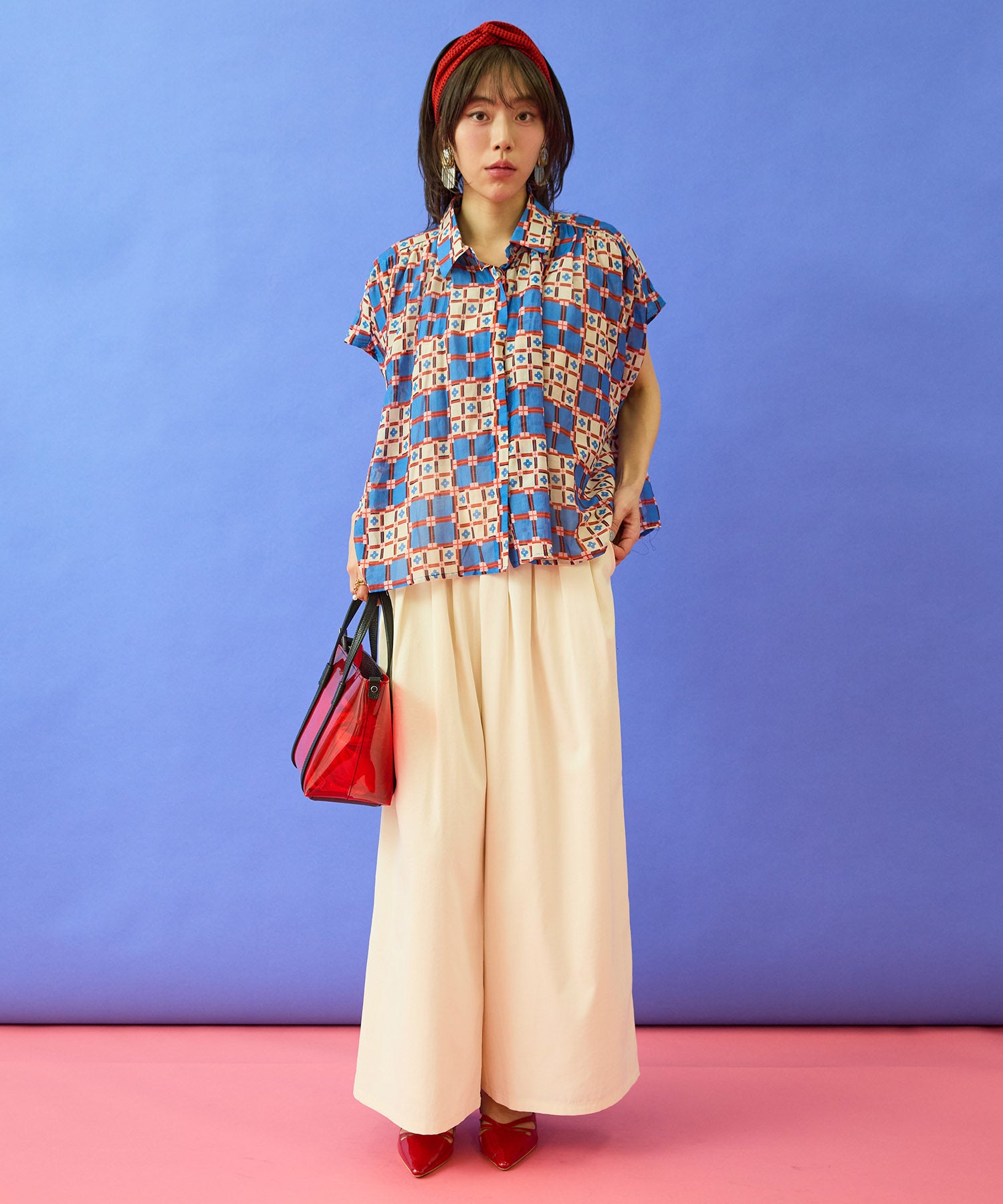 無地のテーパードパンツやスカートと合わせて、柄を主役にしたきれいめスタイルに。