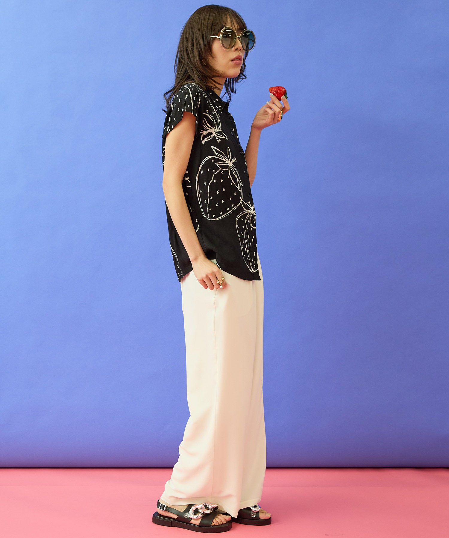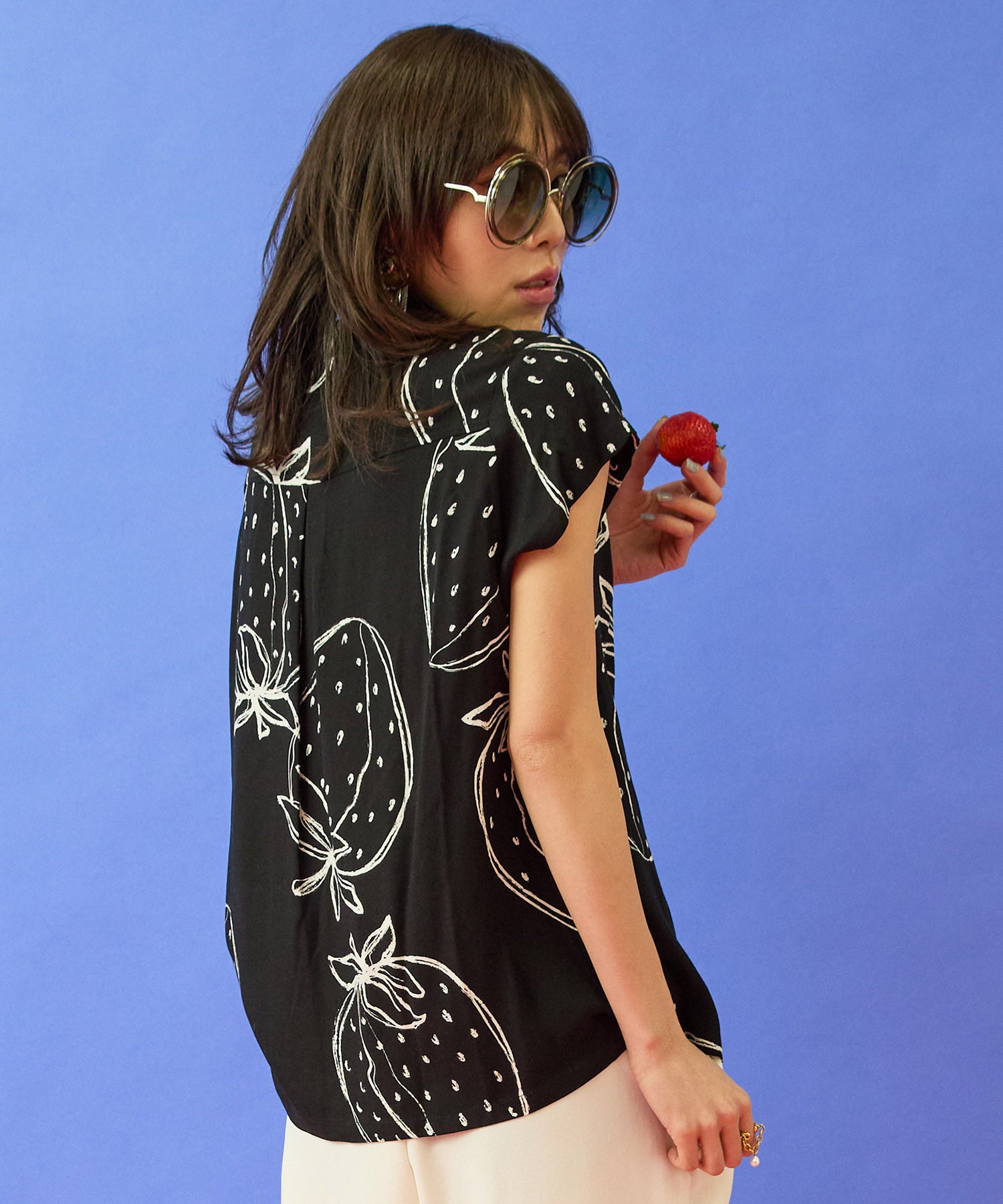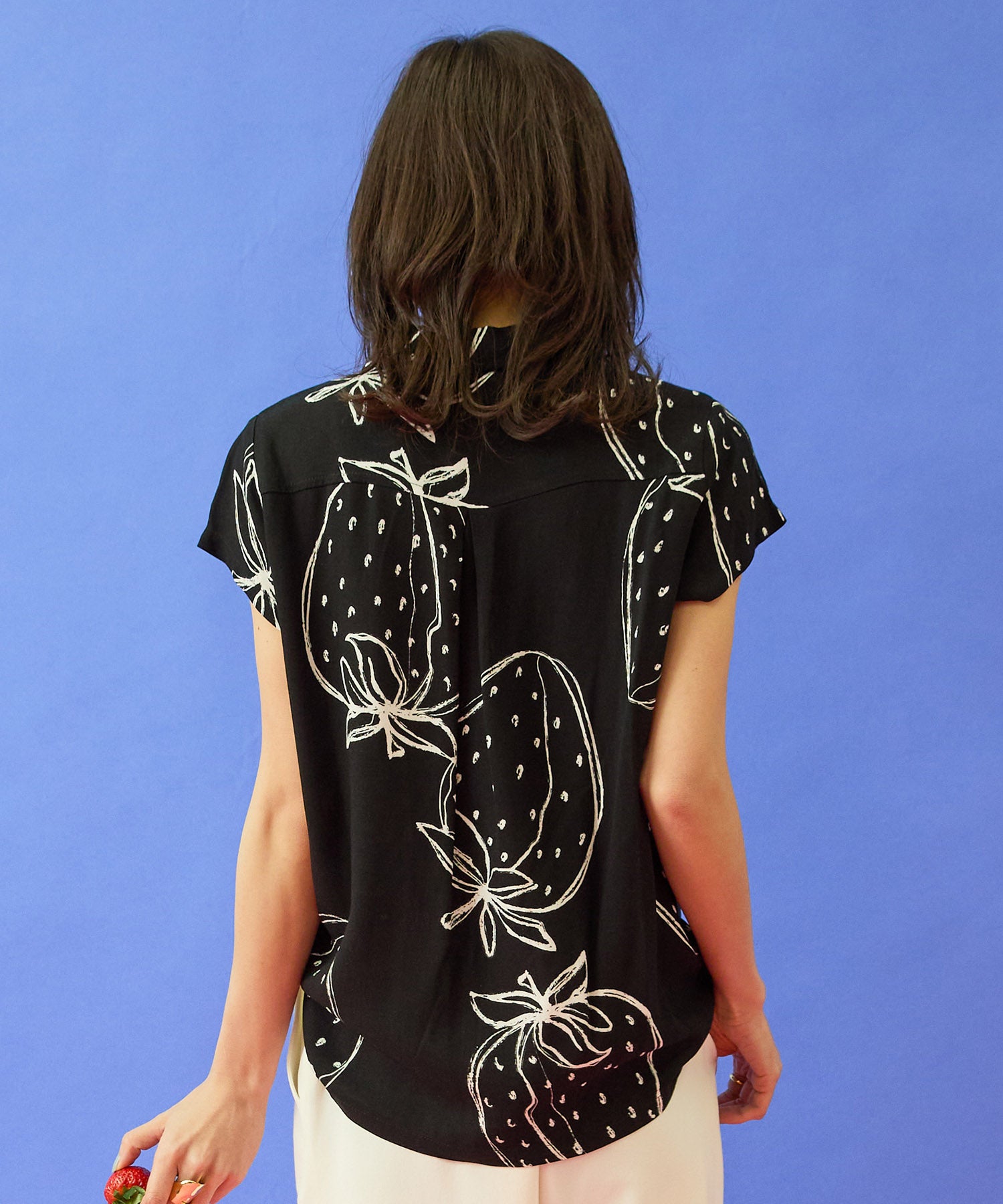 ストロベリーモチーフをモノトーンで描いた、印象的なプリントシャツ。