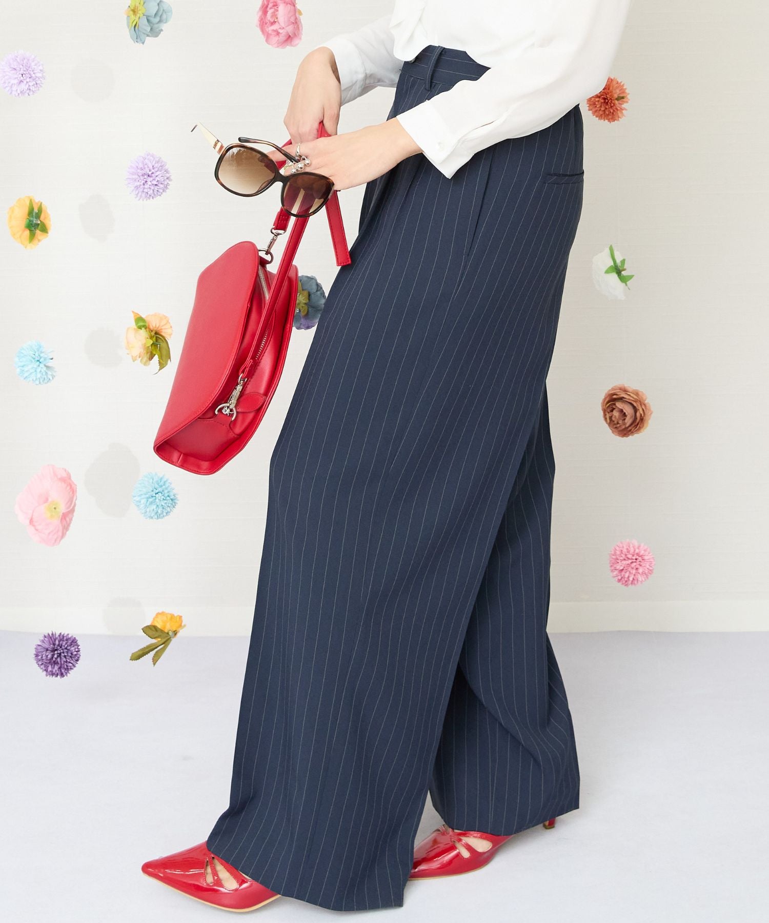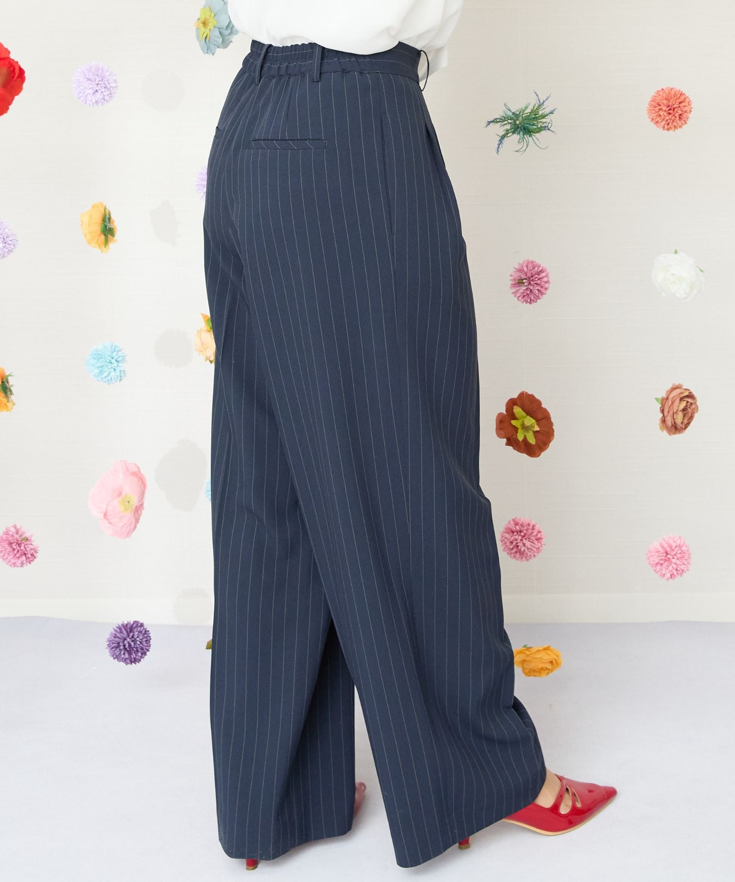 繊細なピンストライプがハンサムな印象を与えるワイドパンツ。