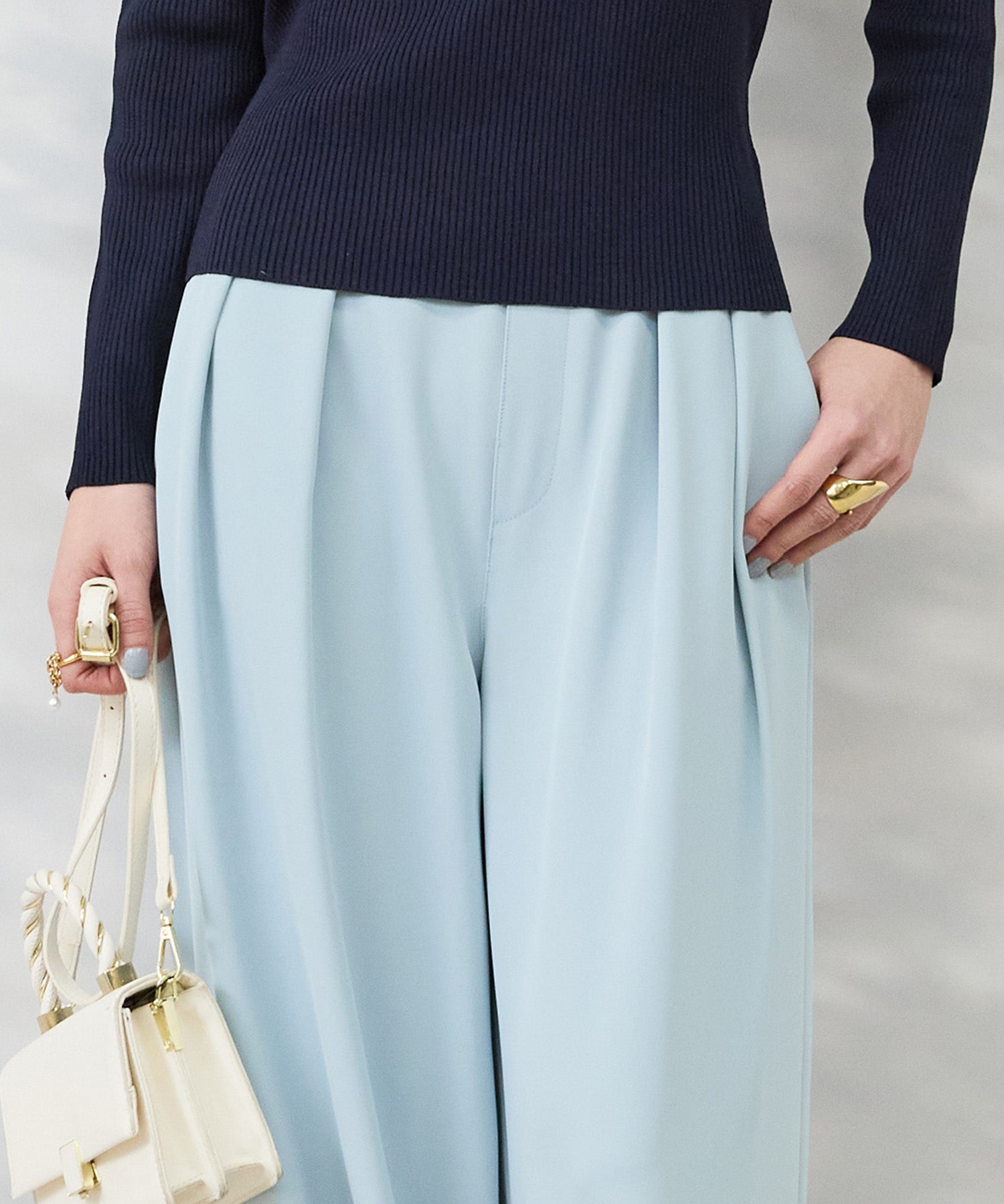 ショート丈トップスやジャケットとも相性がよく、バランスよく決まります。