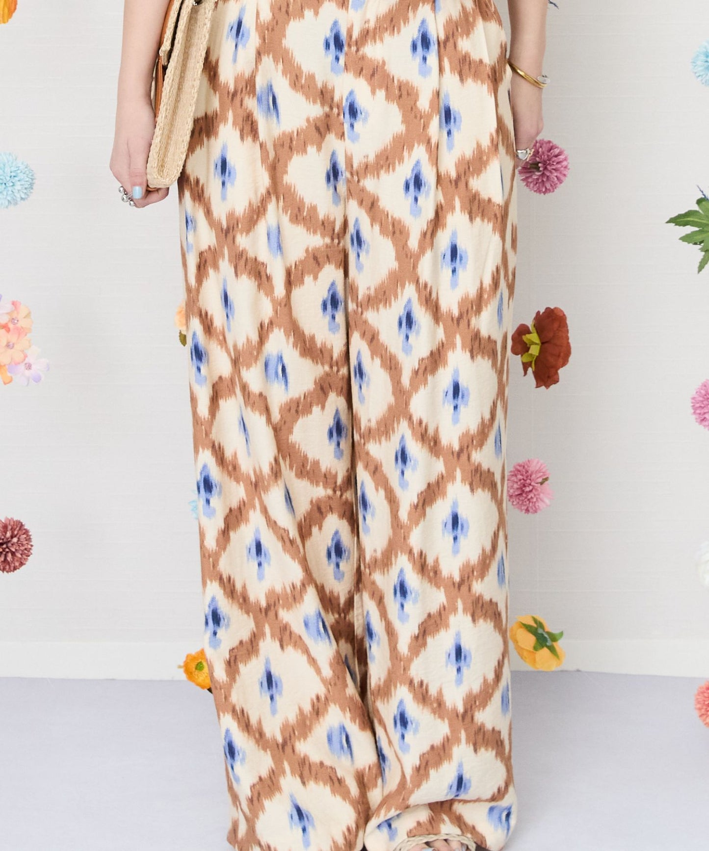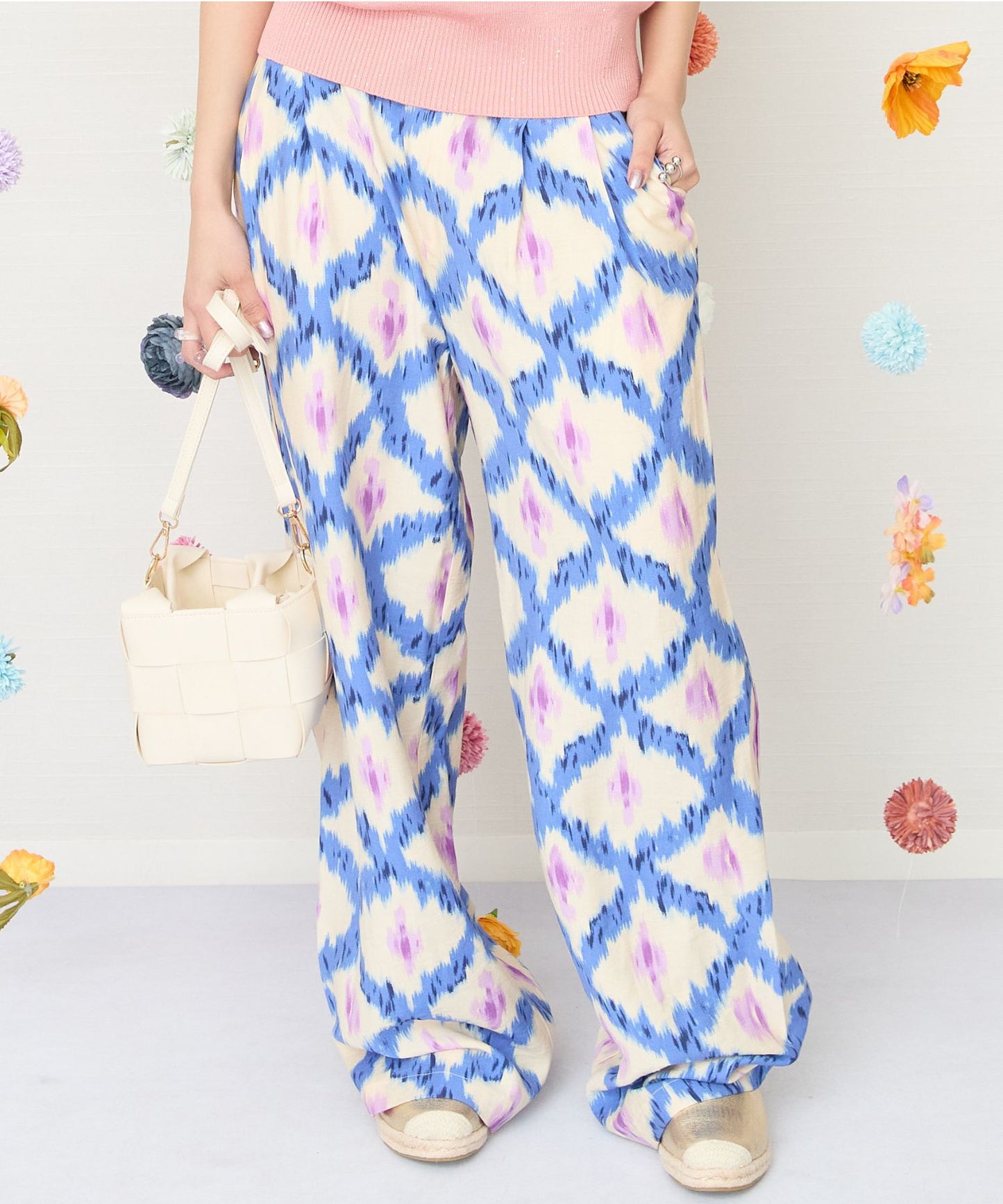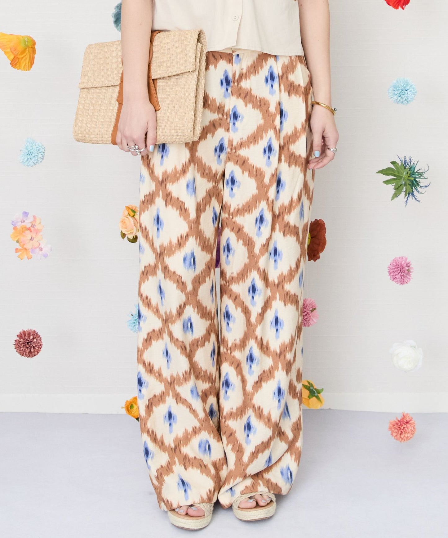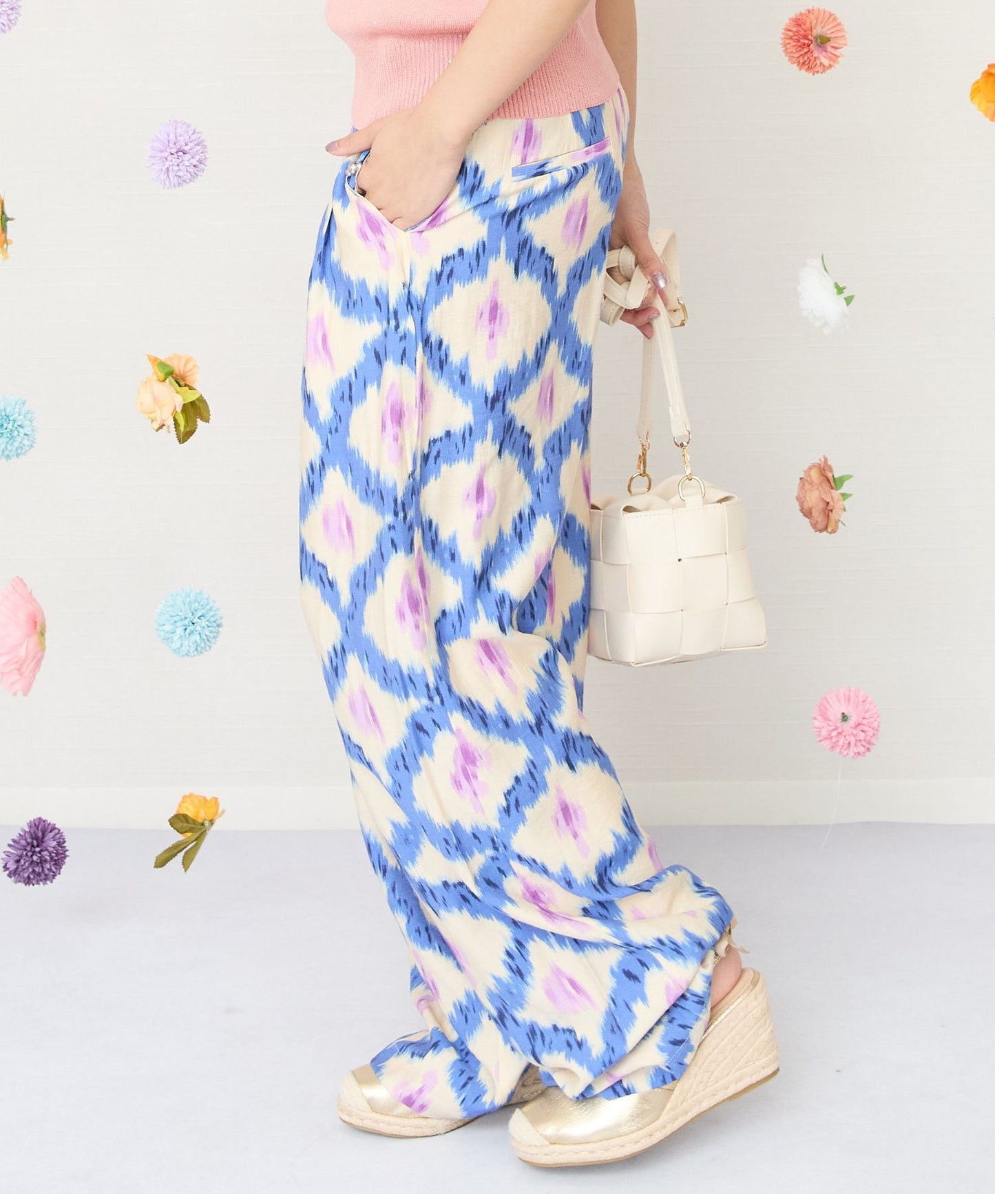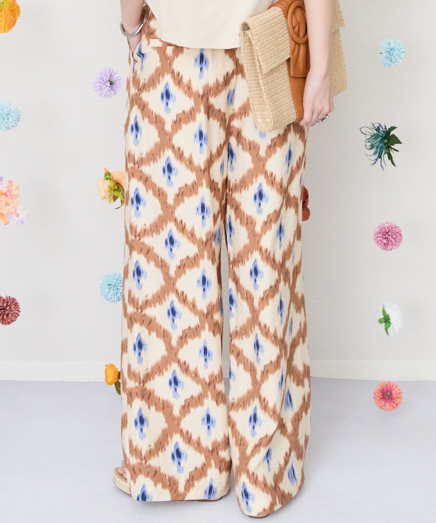 大胆なジオメトリック柄が目を引くワイドパンツ。