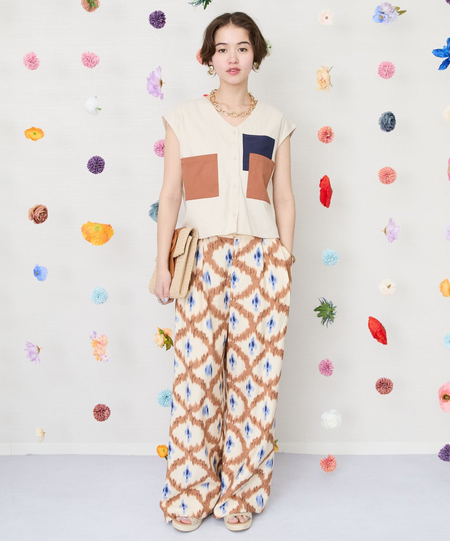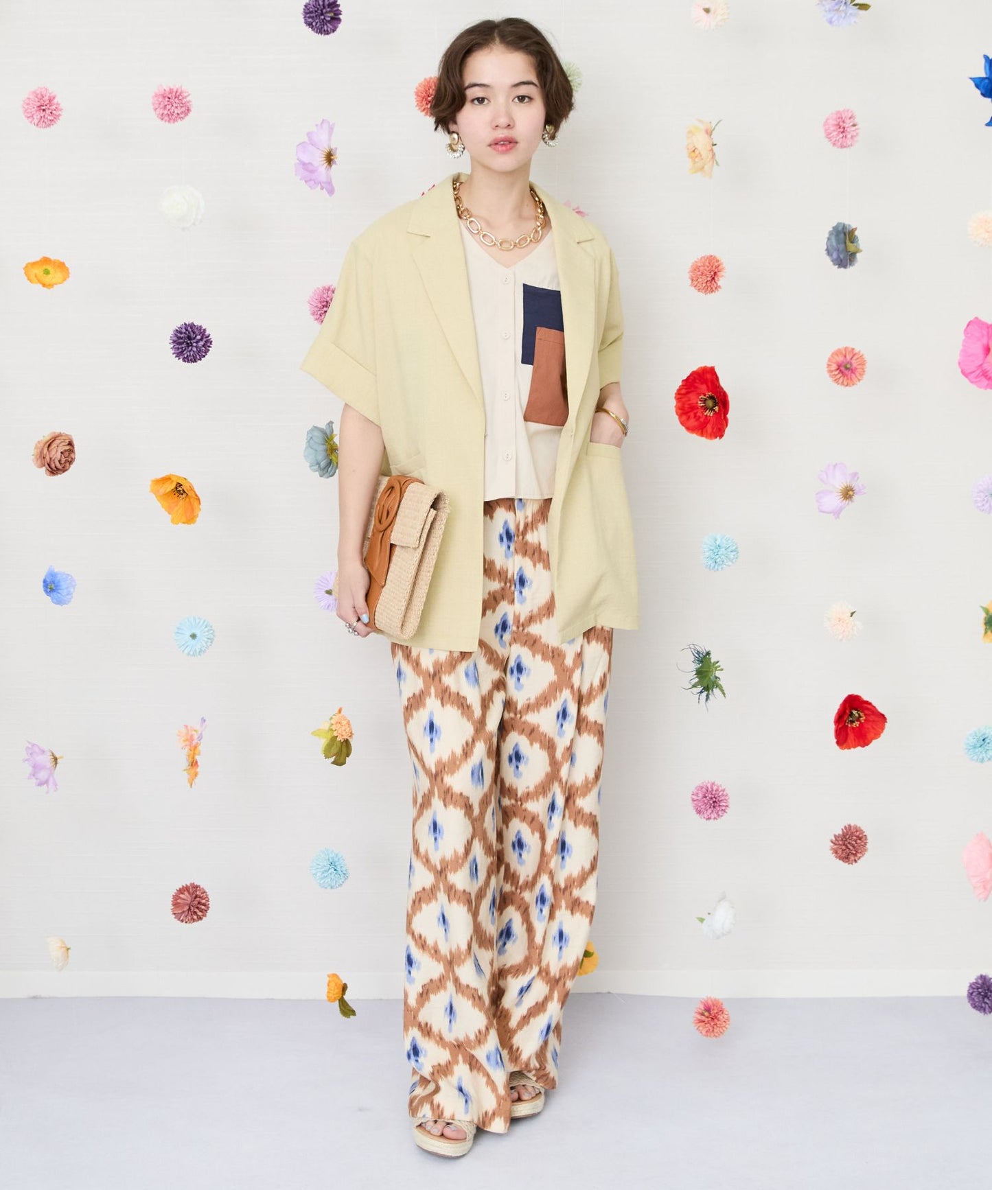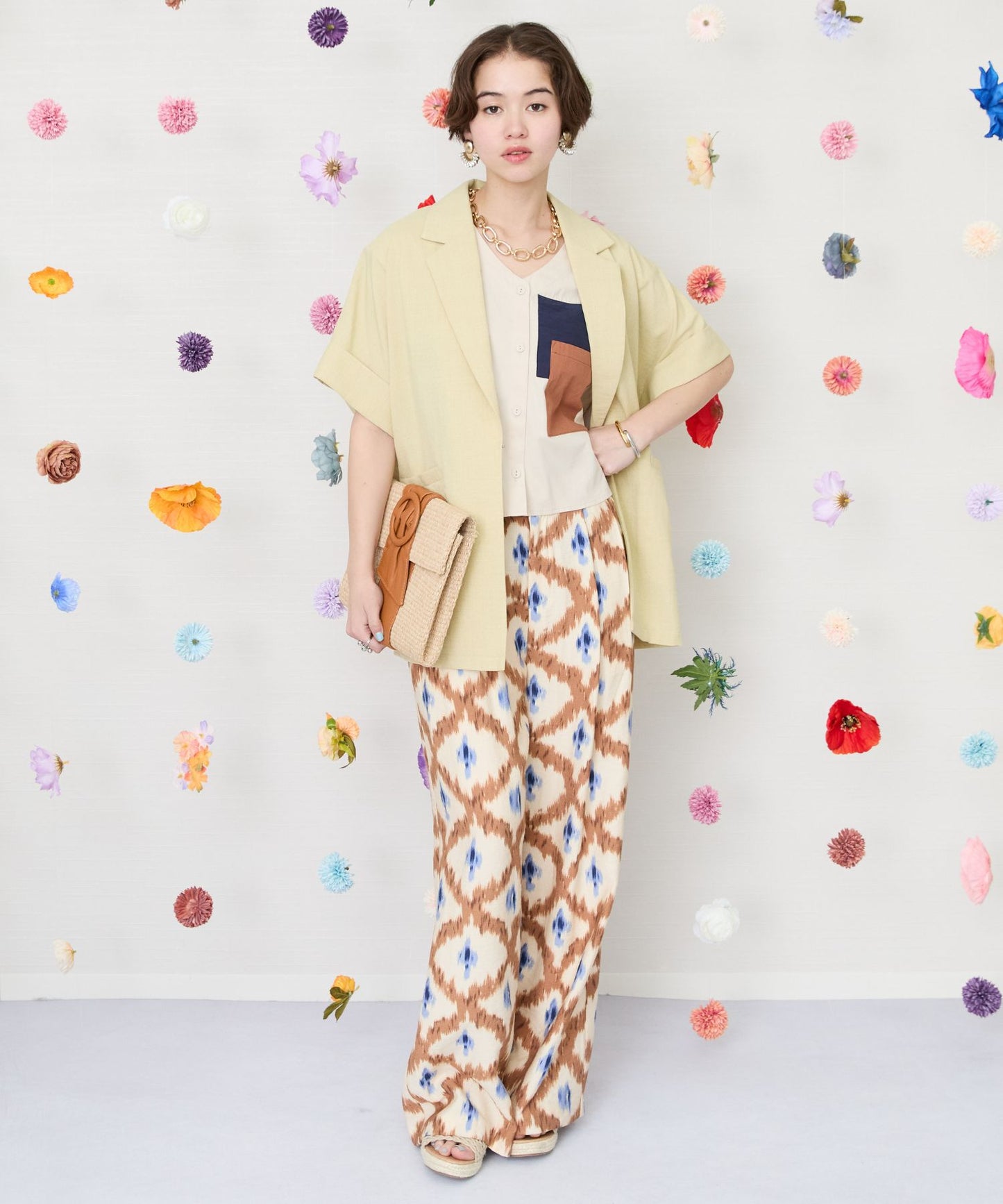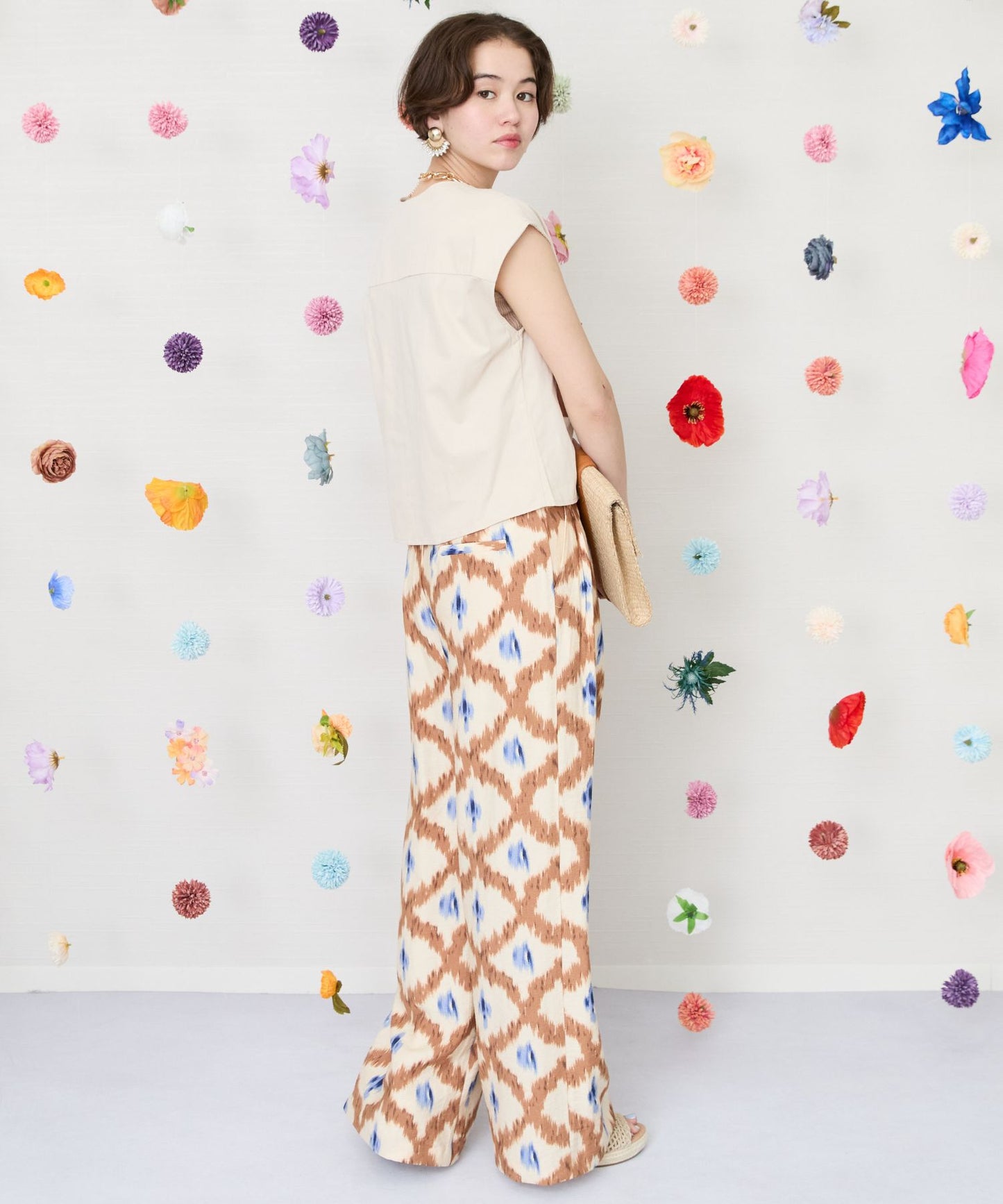 大胆なジオメトリック柄が目を引くワイドパンツ。