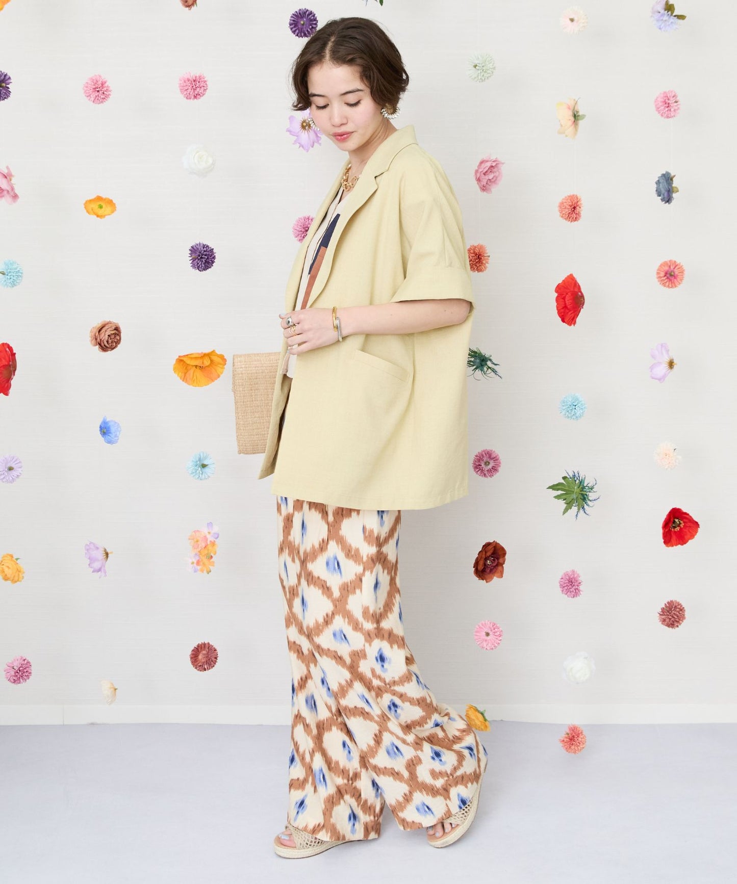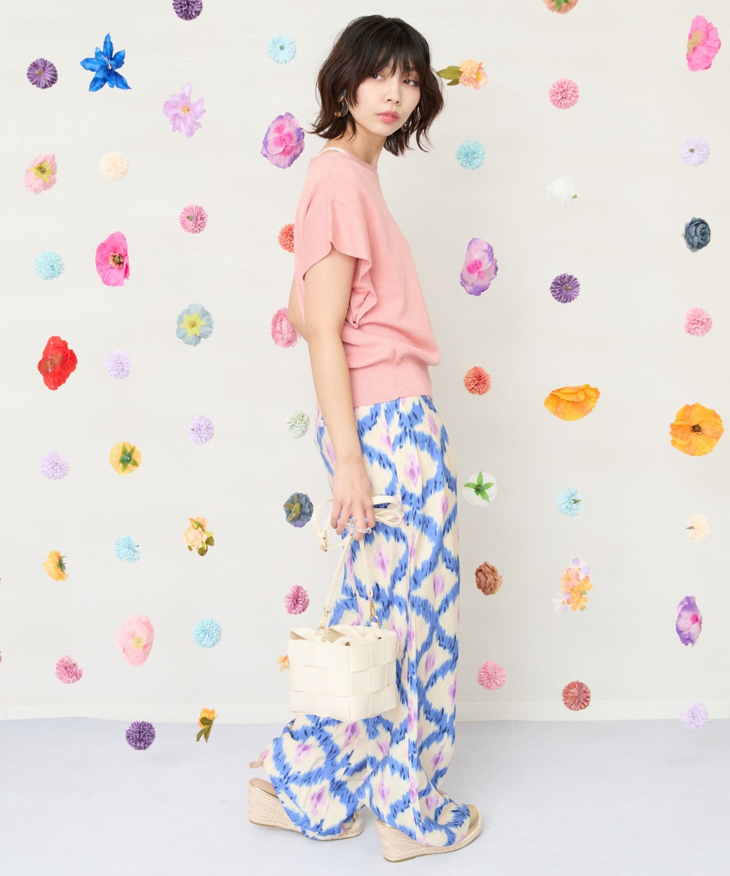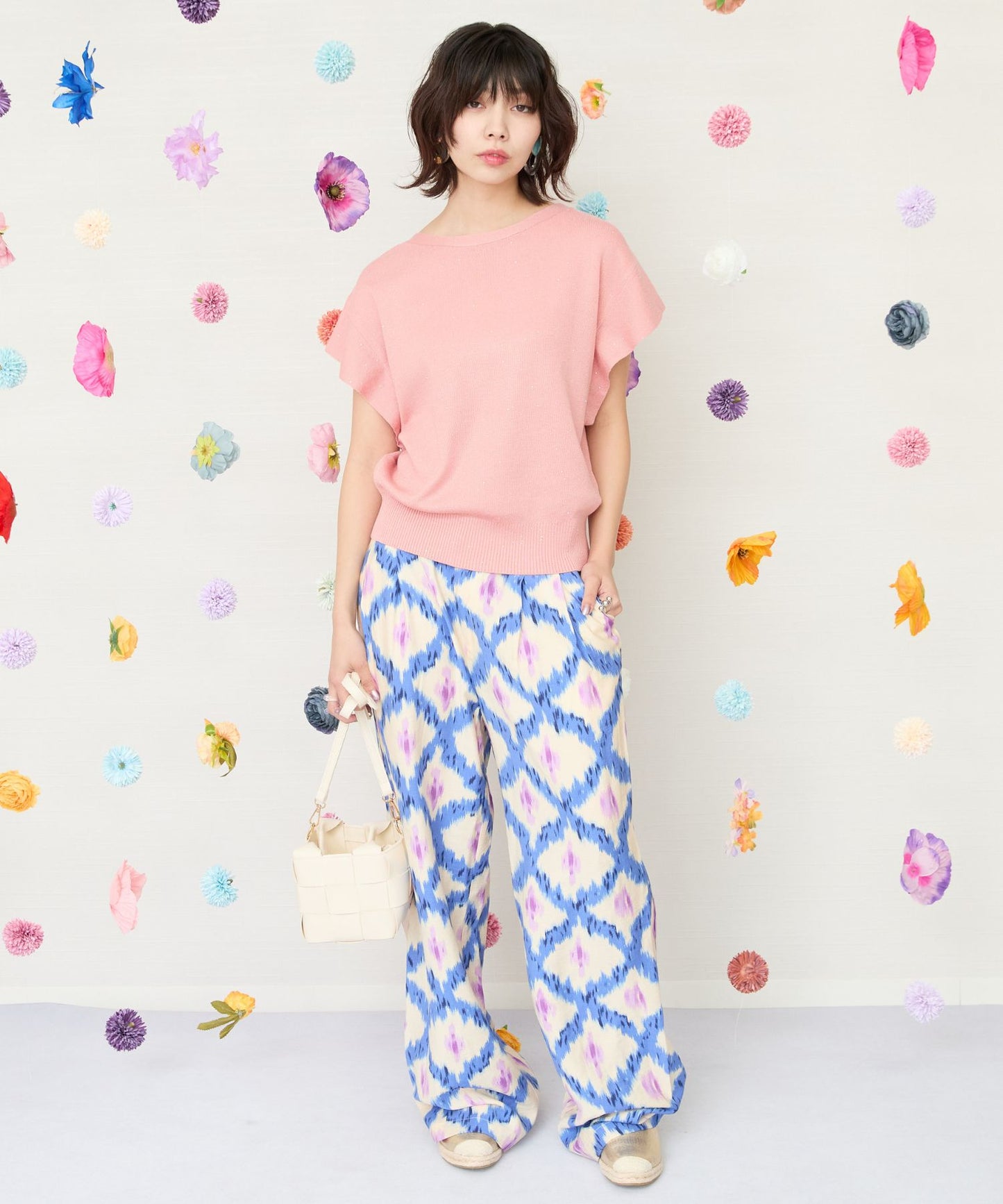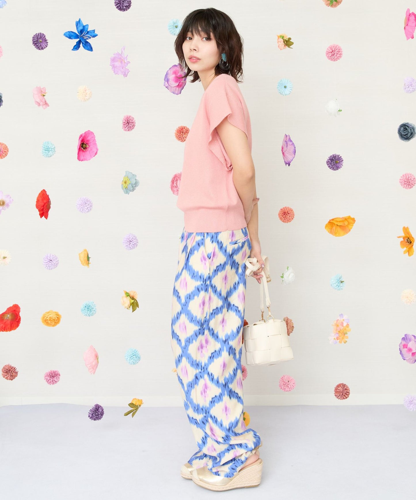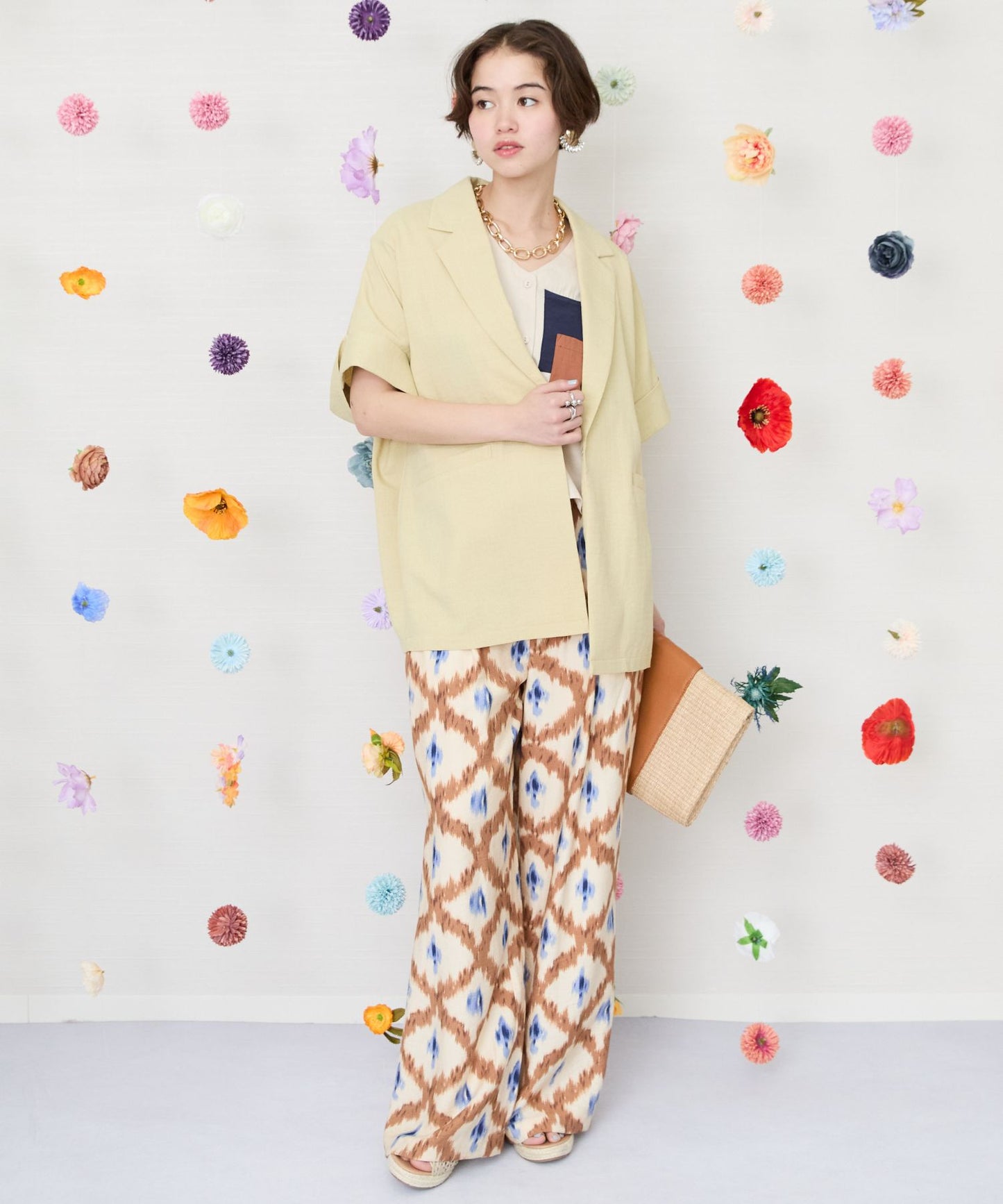 大胆なジオメトリック柄が目を引くワイドパンツ。