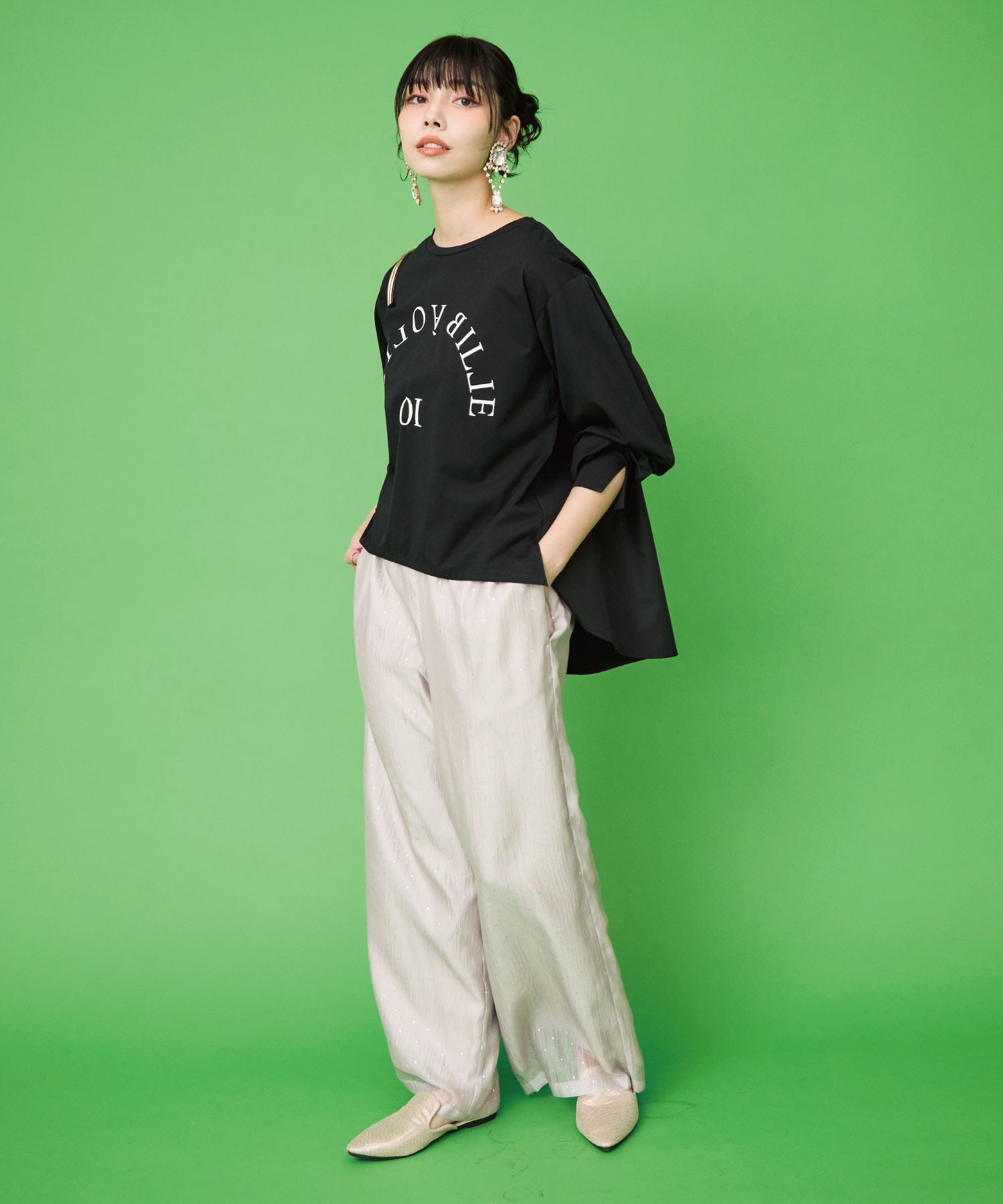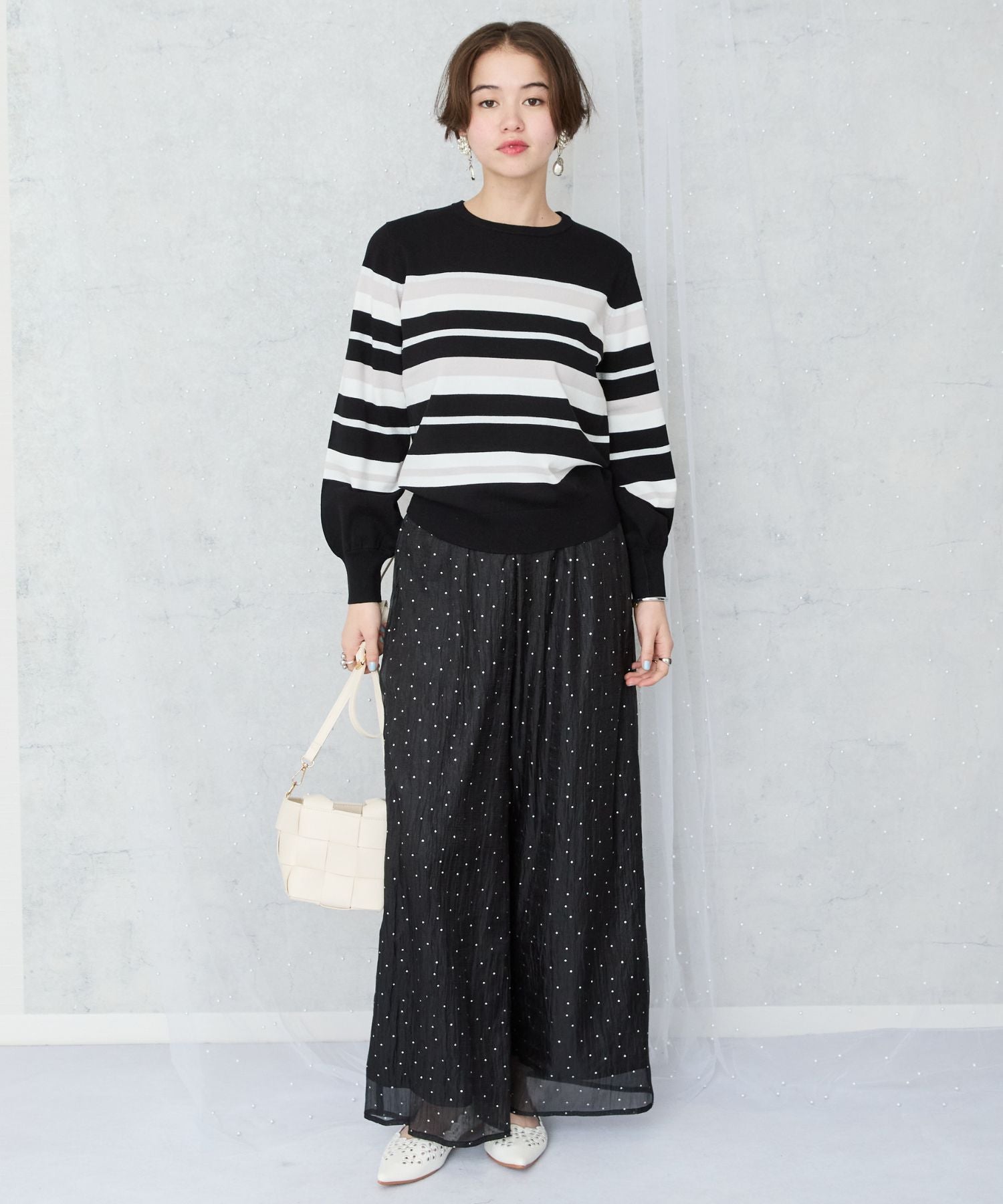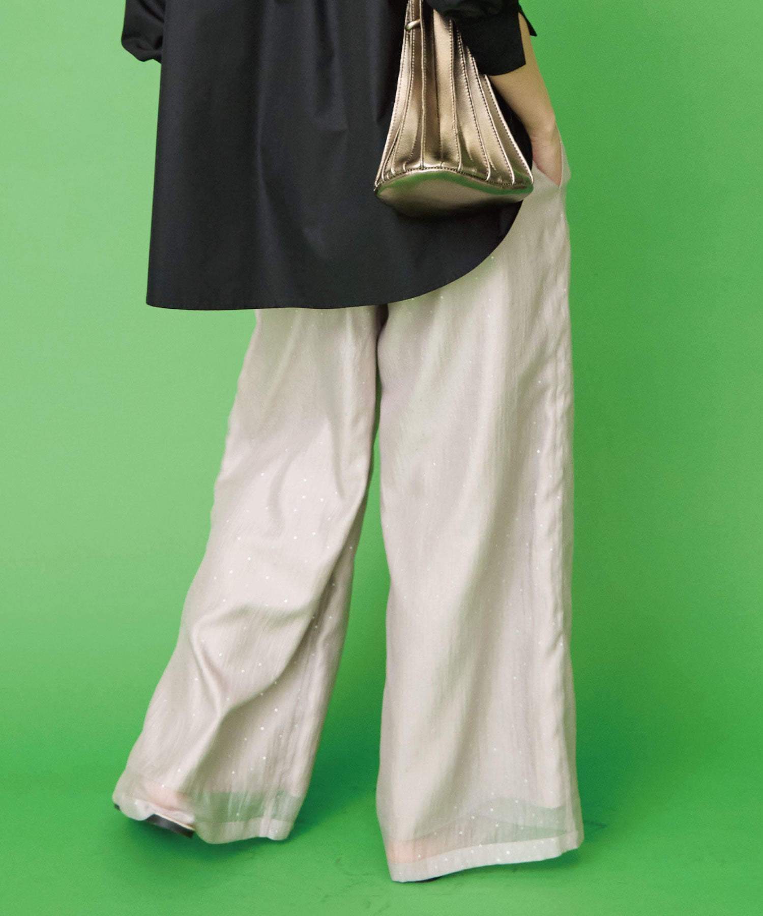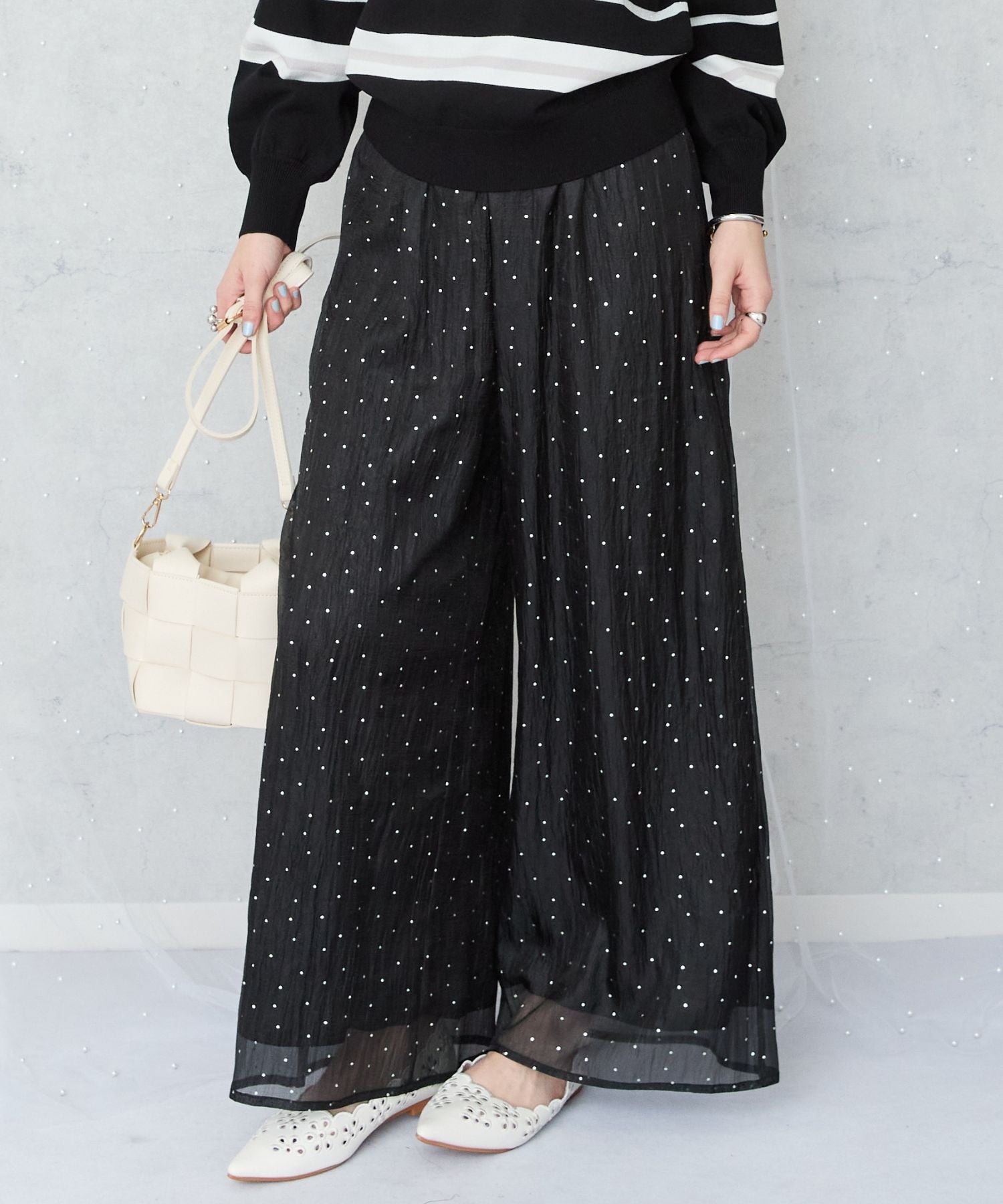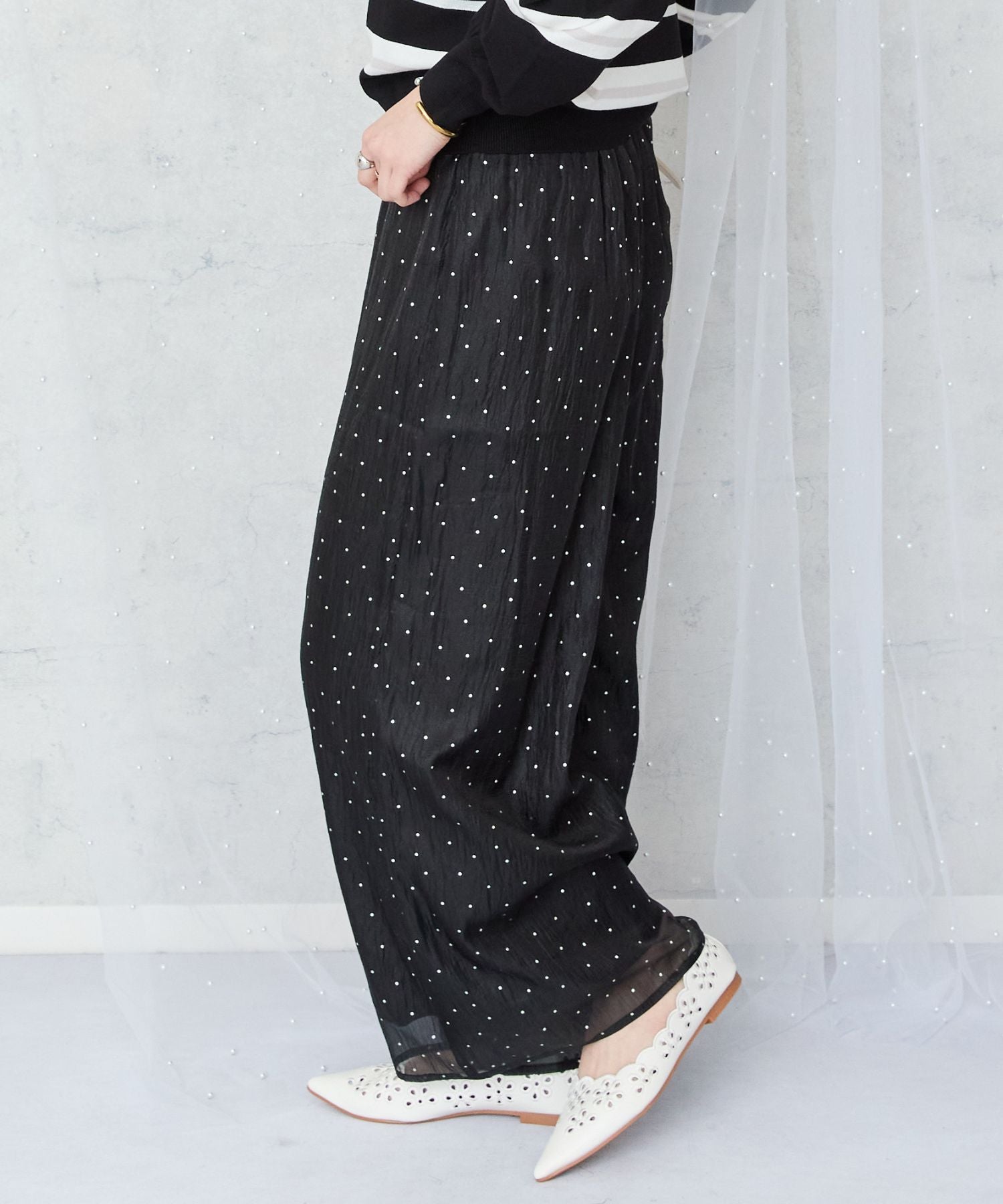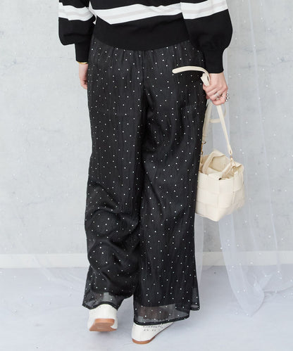 さりげない小さな箔ドットプリントが、上品な輝きをプラスするイージーワイドパンツ。