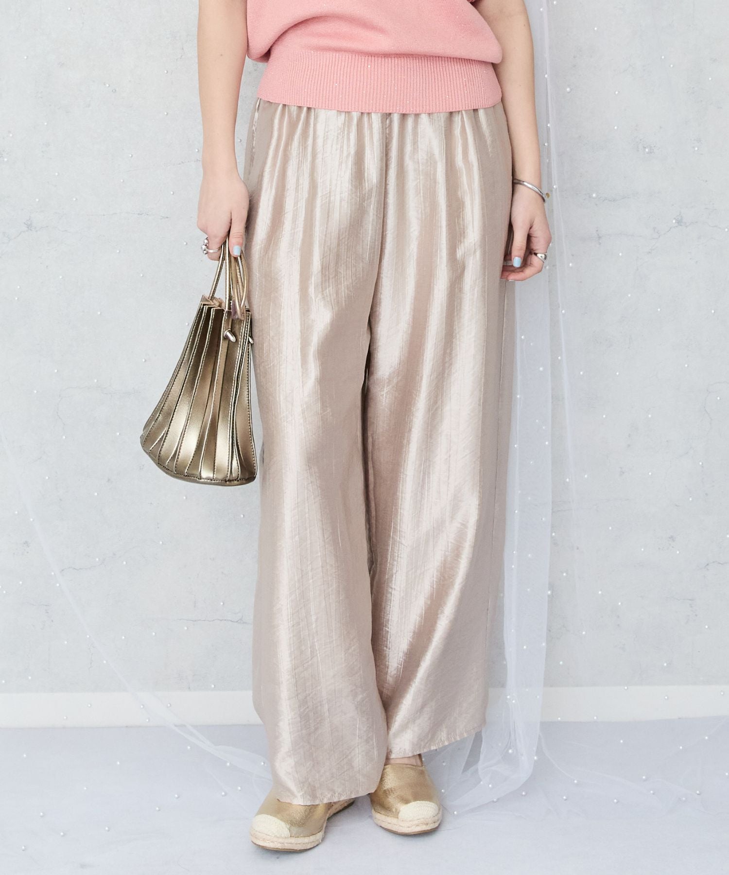 きれいめな光沢素材を使用したリラックス感のあるワイドパンツ。