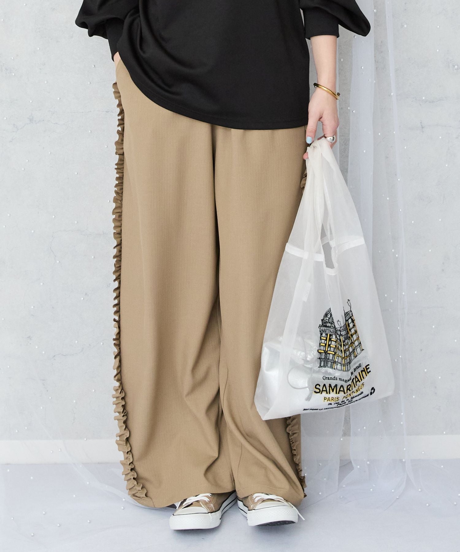 サイドにあしらったフリルがアクセントのワイドパンツ。
