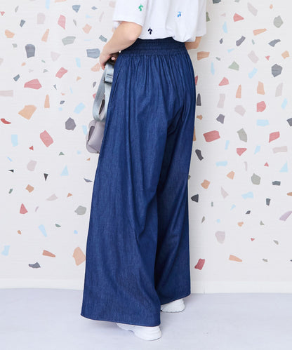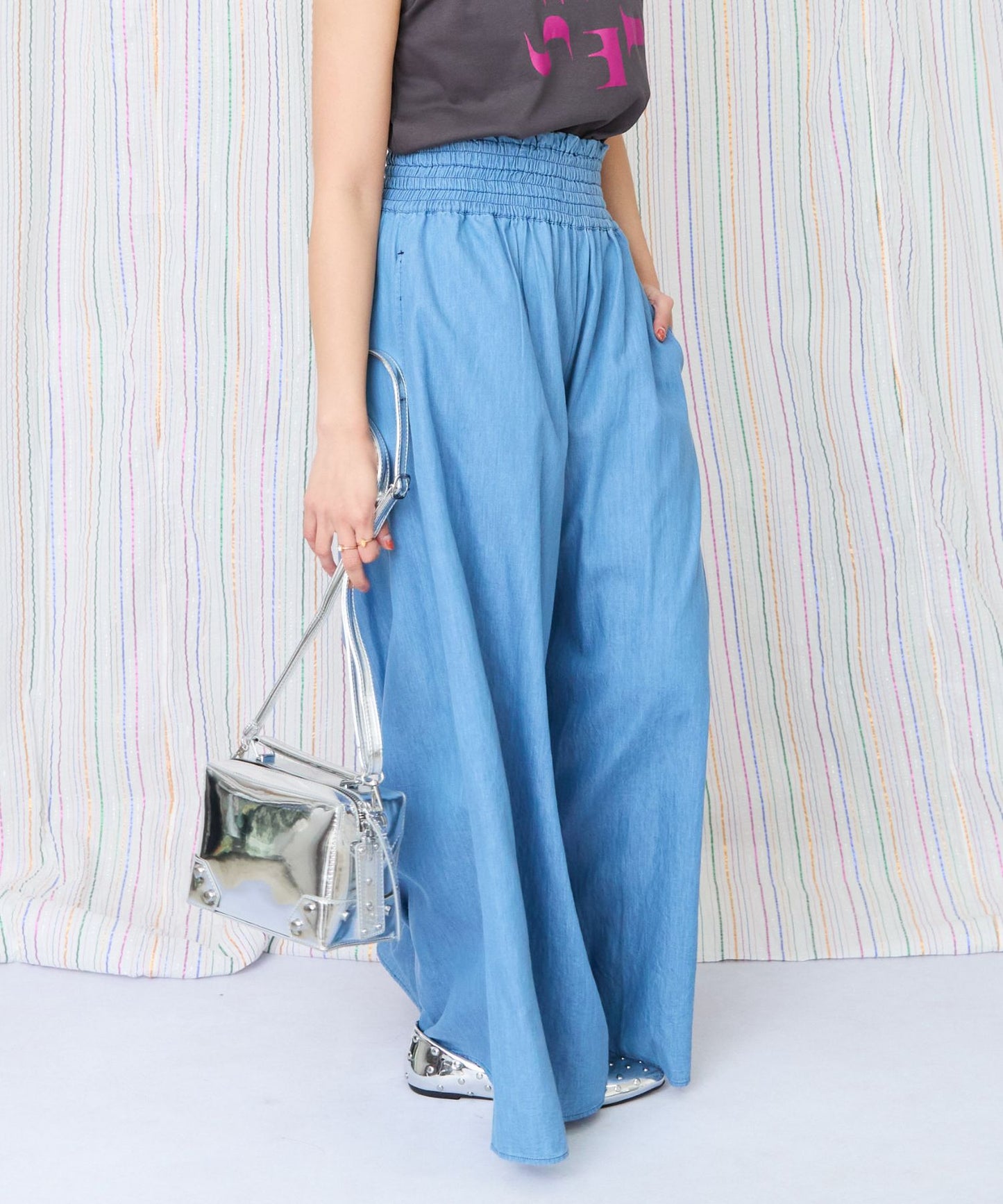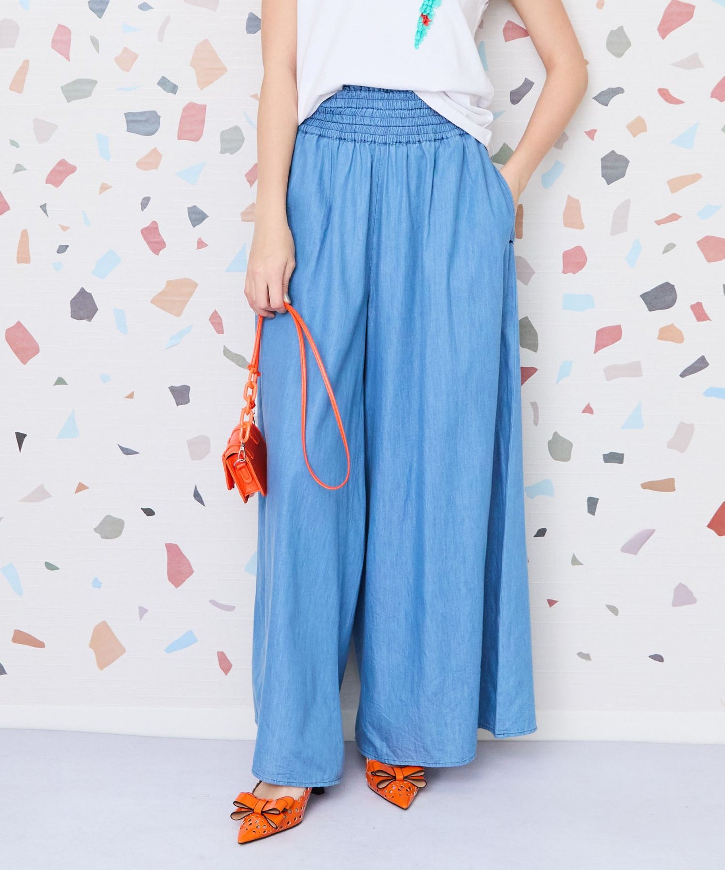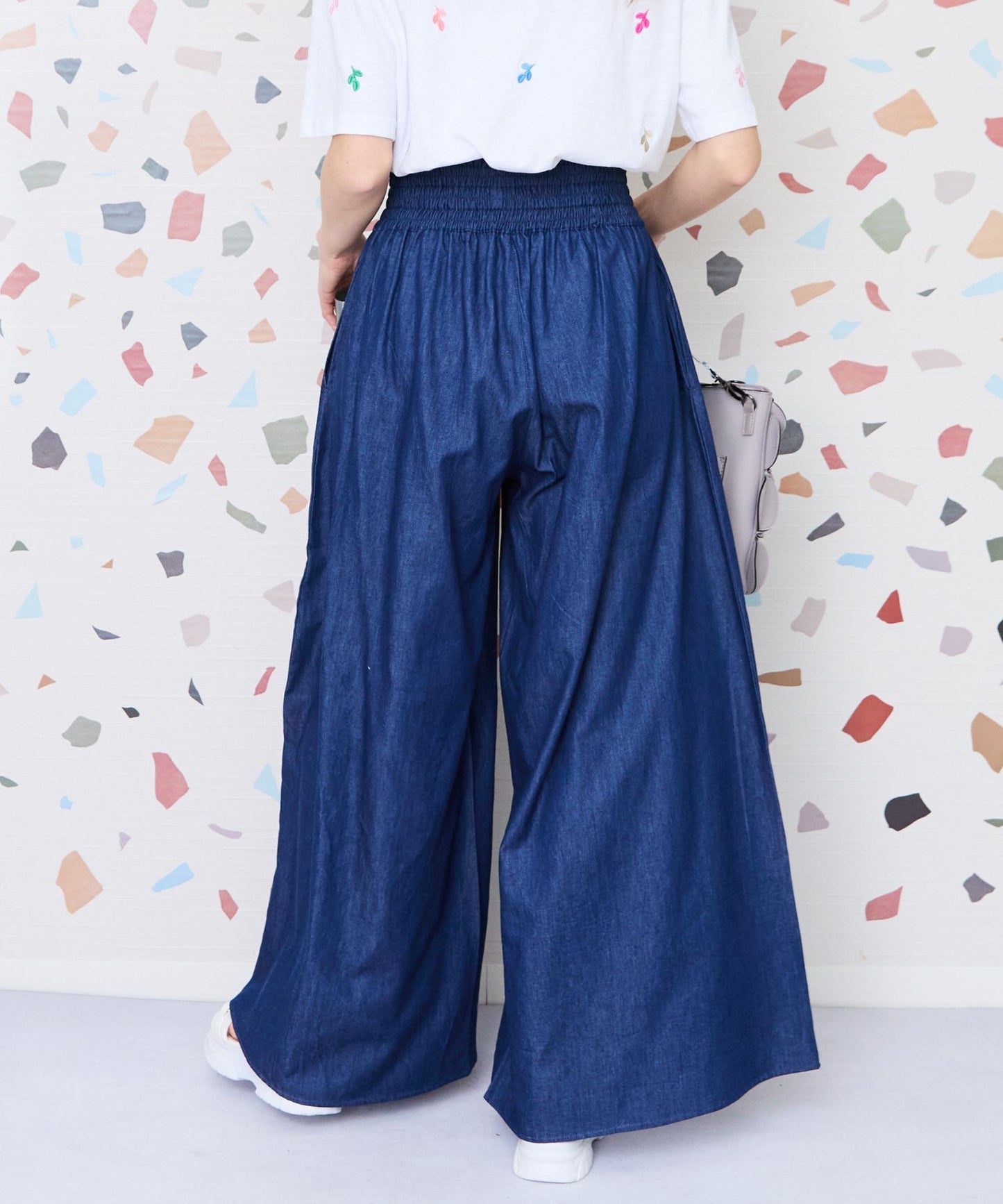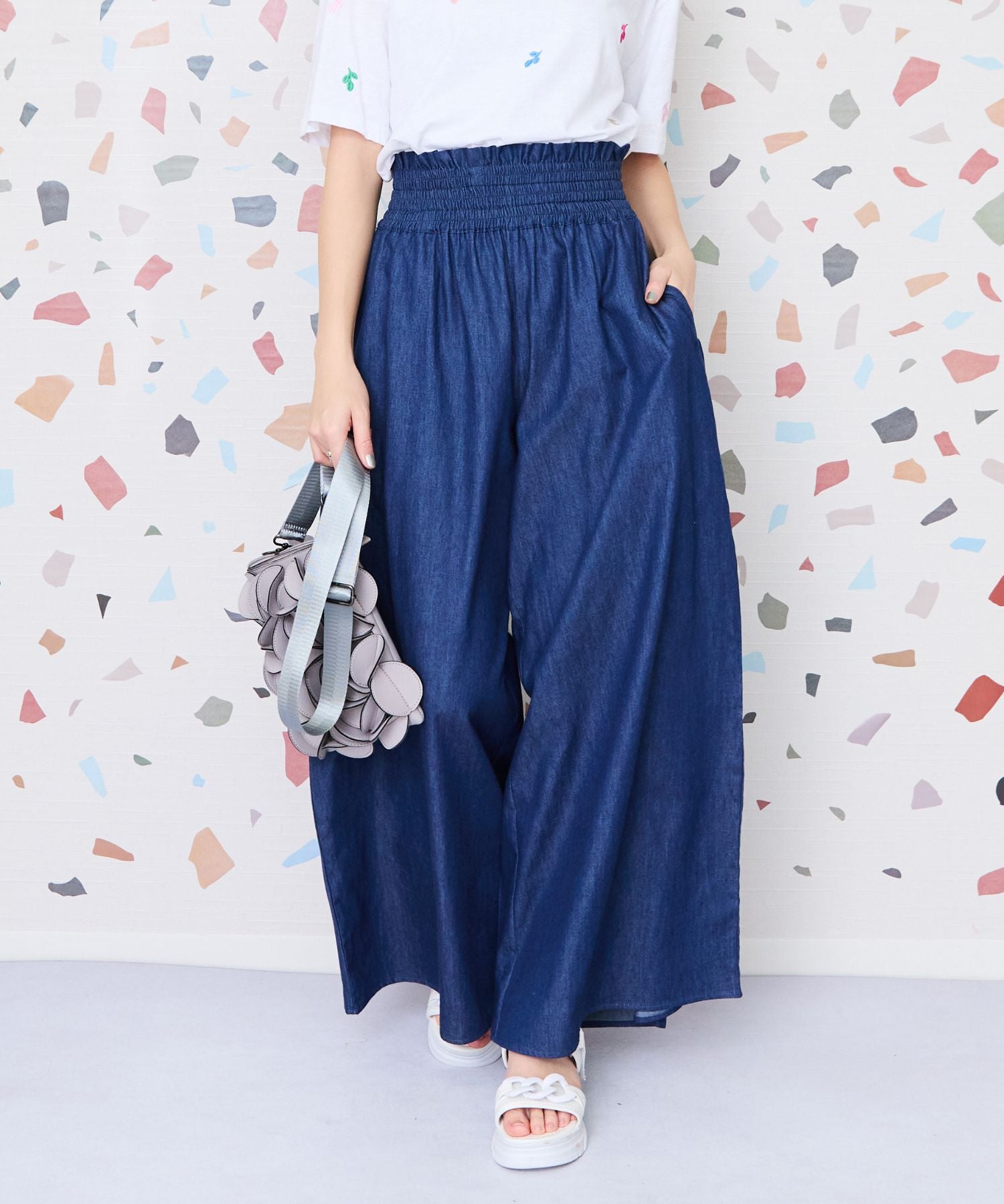 ウエスト部分のゴムシャーリングがアクセントになった、女性らしさ漂うデニムワイドパンツ。