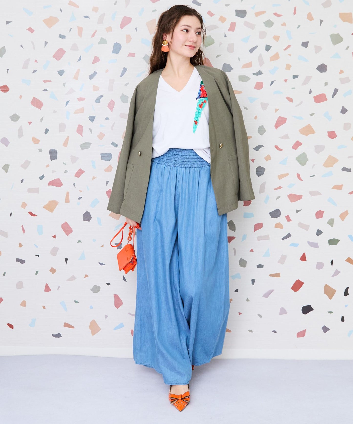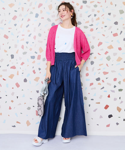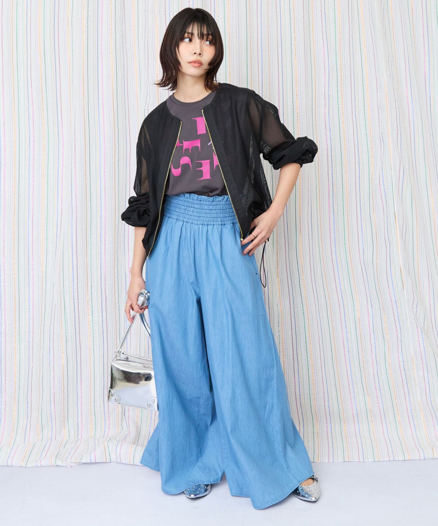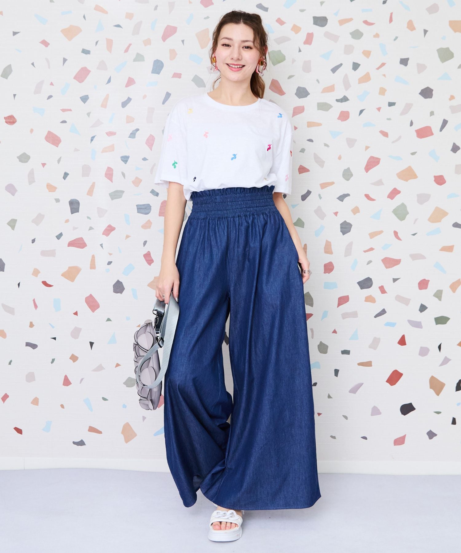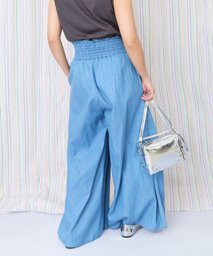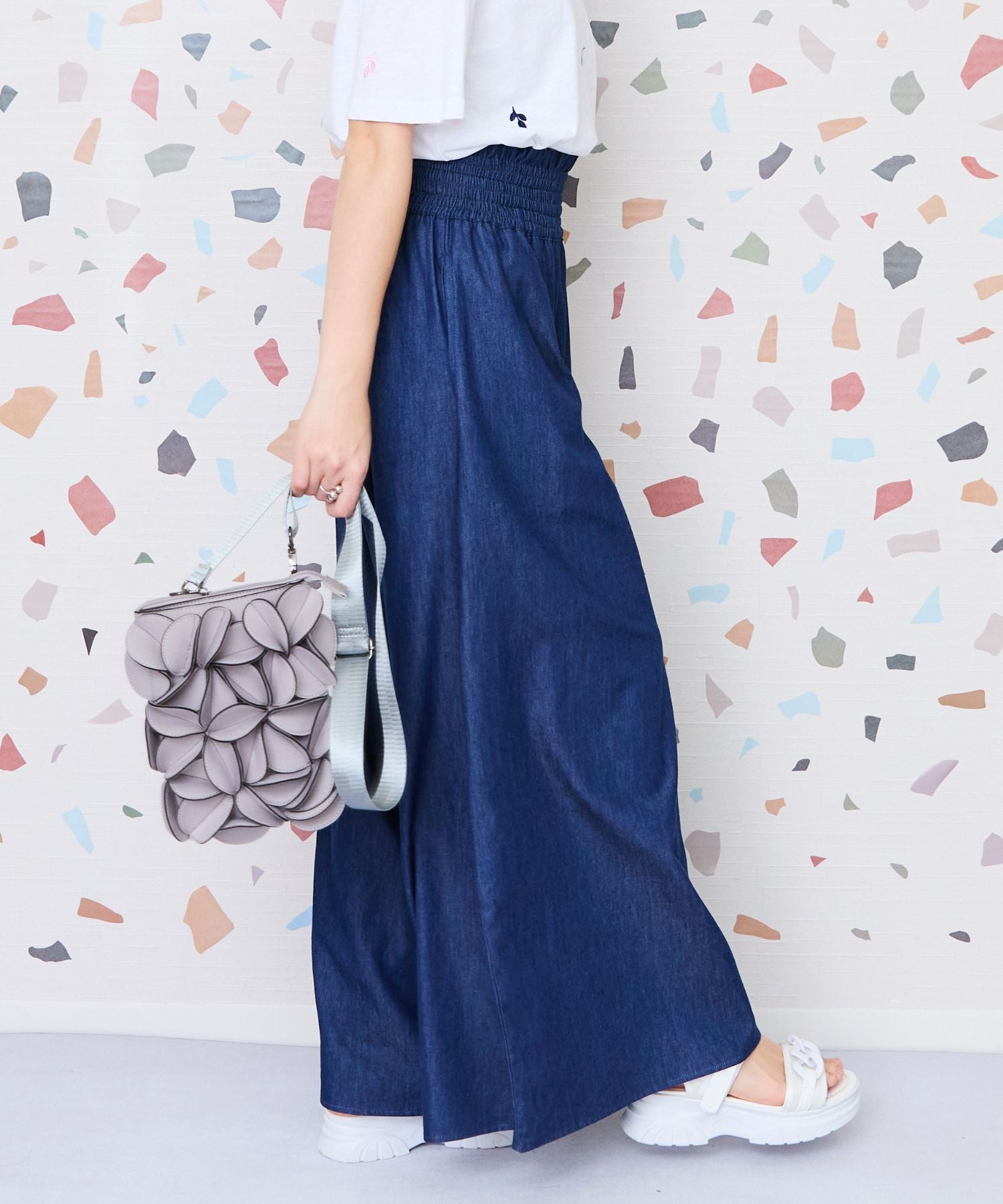 ウエスト部分のゴムシャーリングがアクセントになった、女性らしさ漂うデニムワイドパンツ。