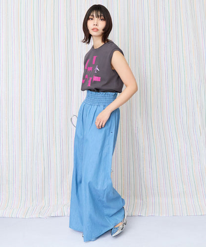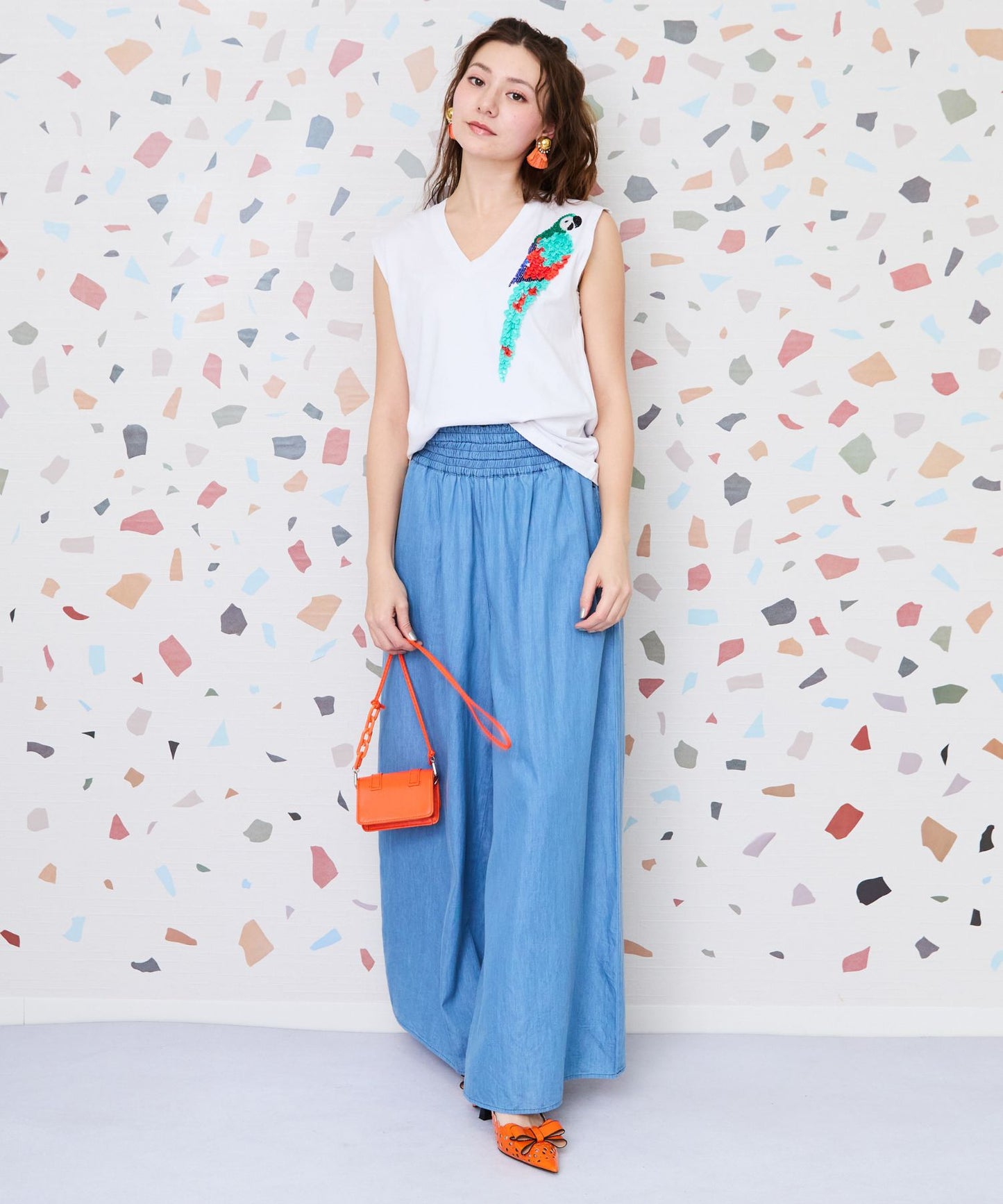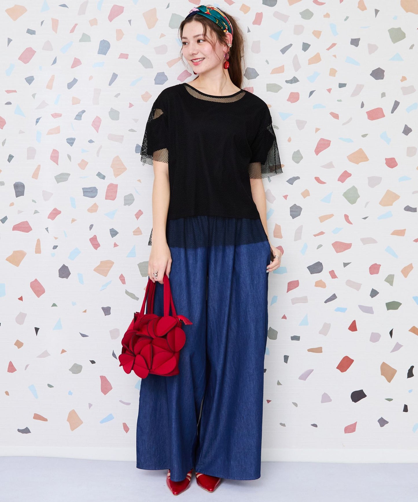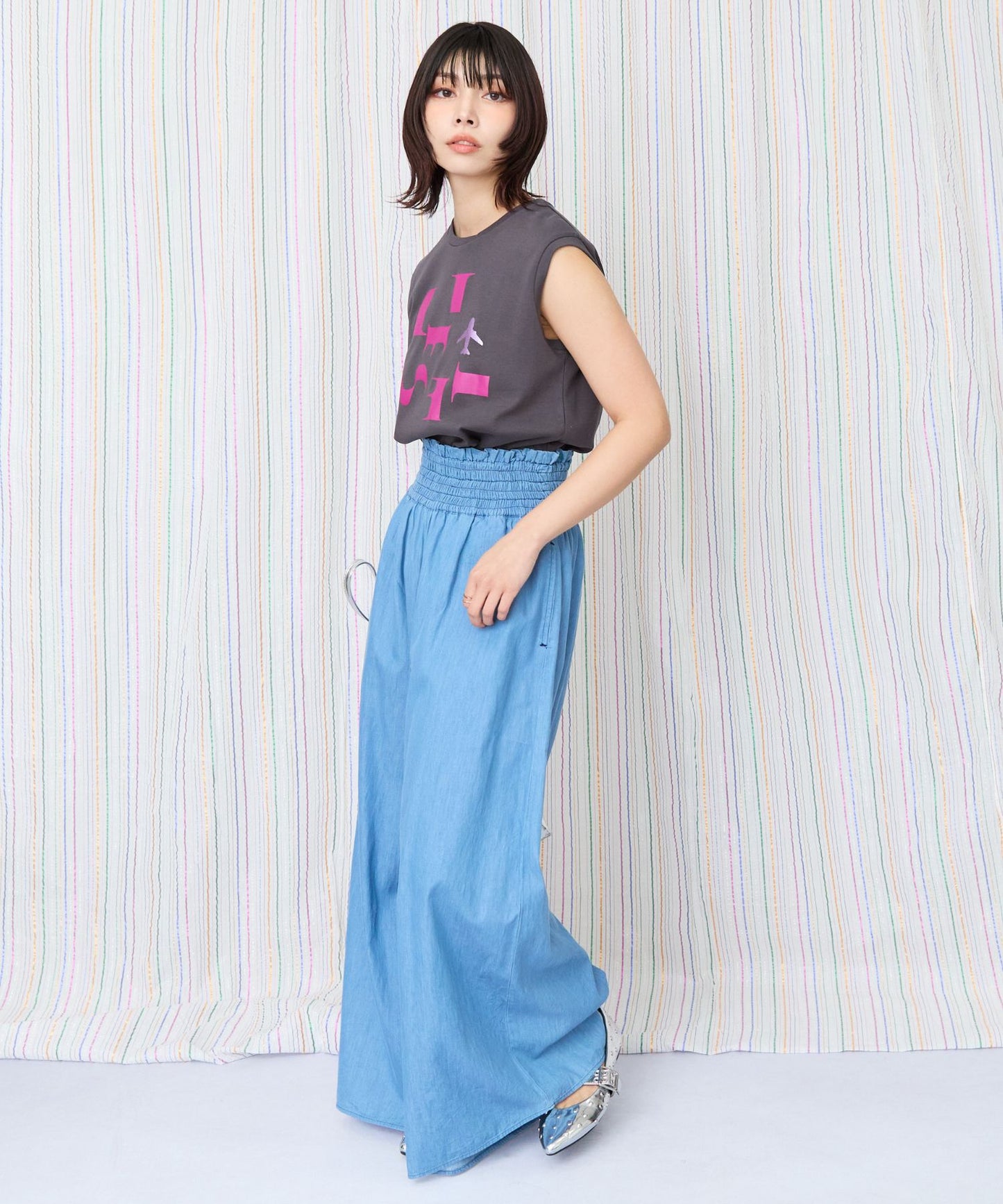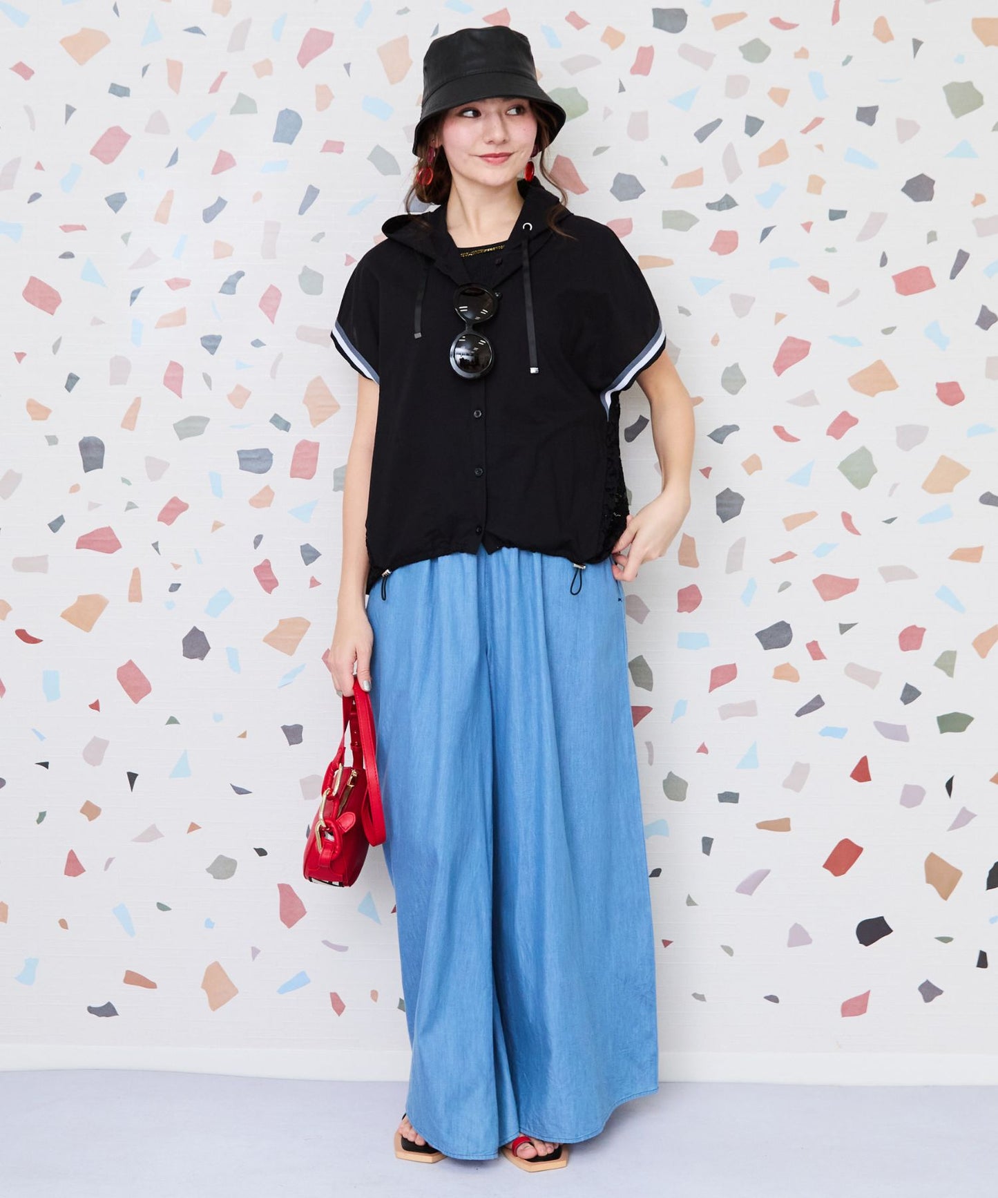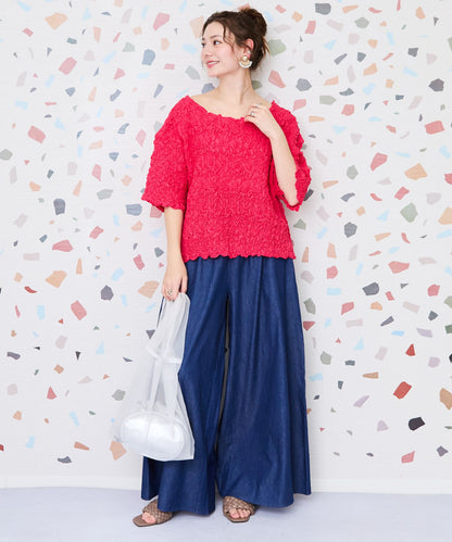 ウエスト部分のゴムシャーリングがアクセントになった、女性らしさ漂うデニムワイドパンツ。