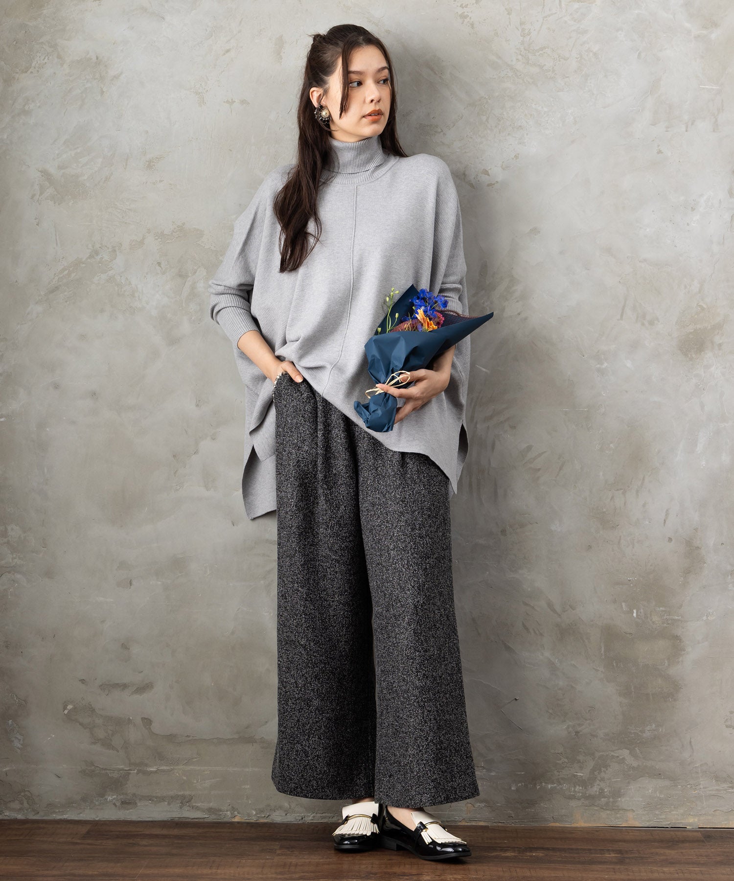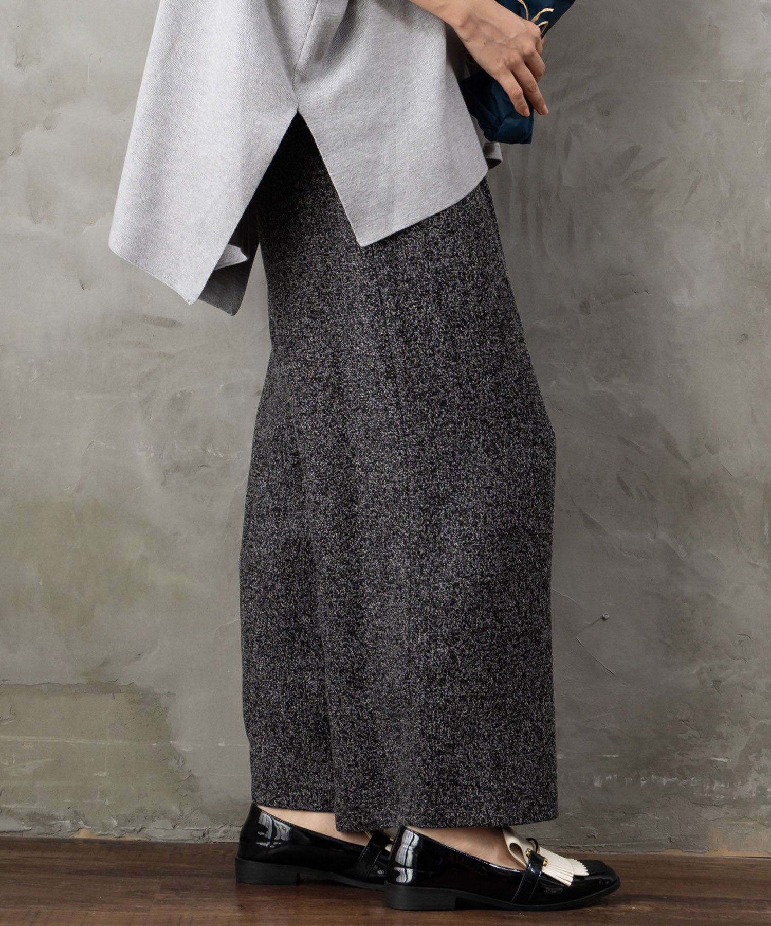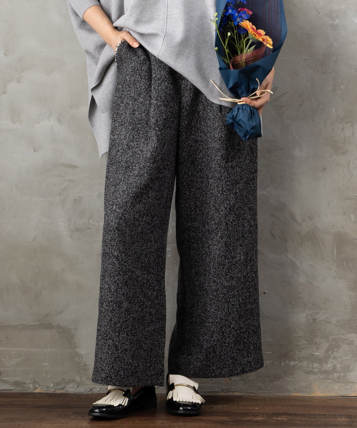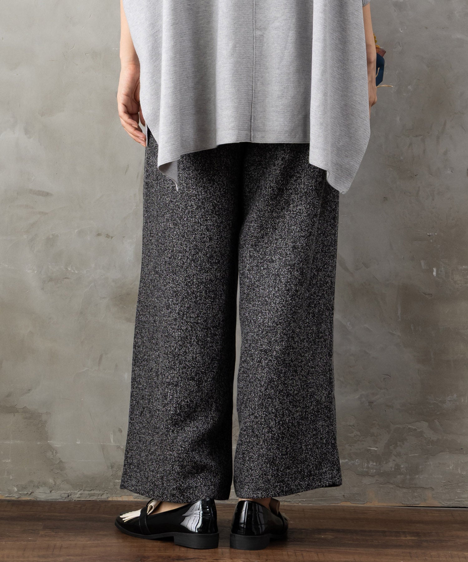 ツイード素材ならではの表情が魅力のワイドパンツ。