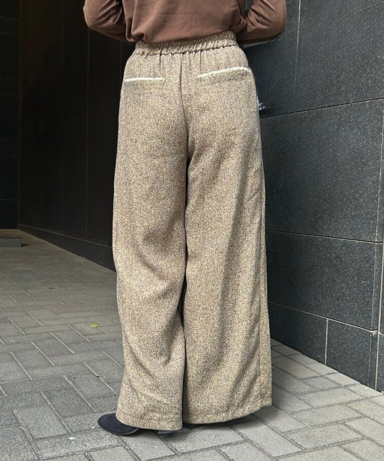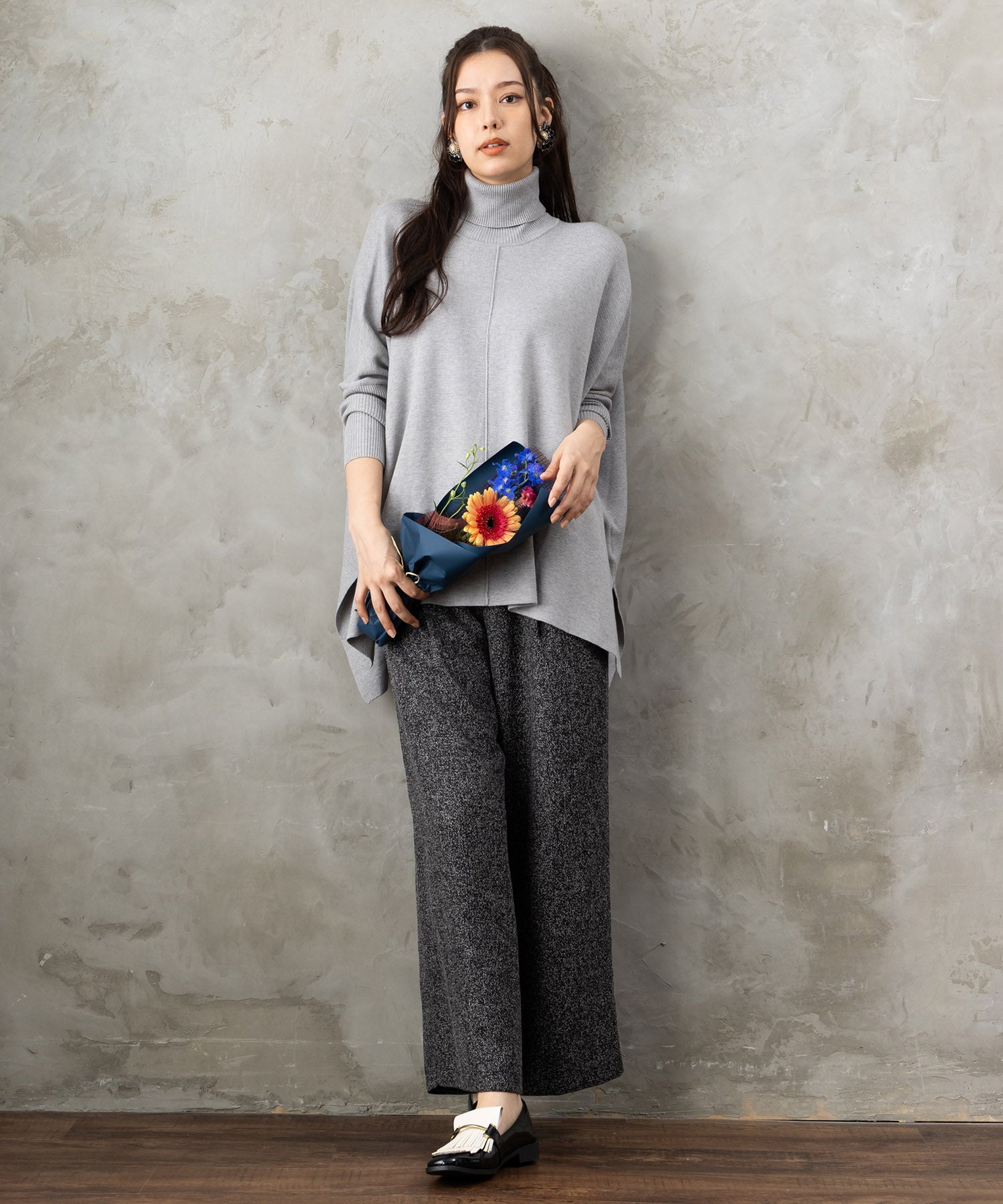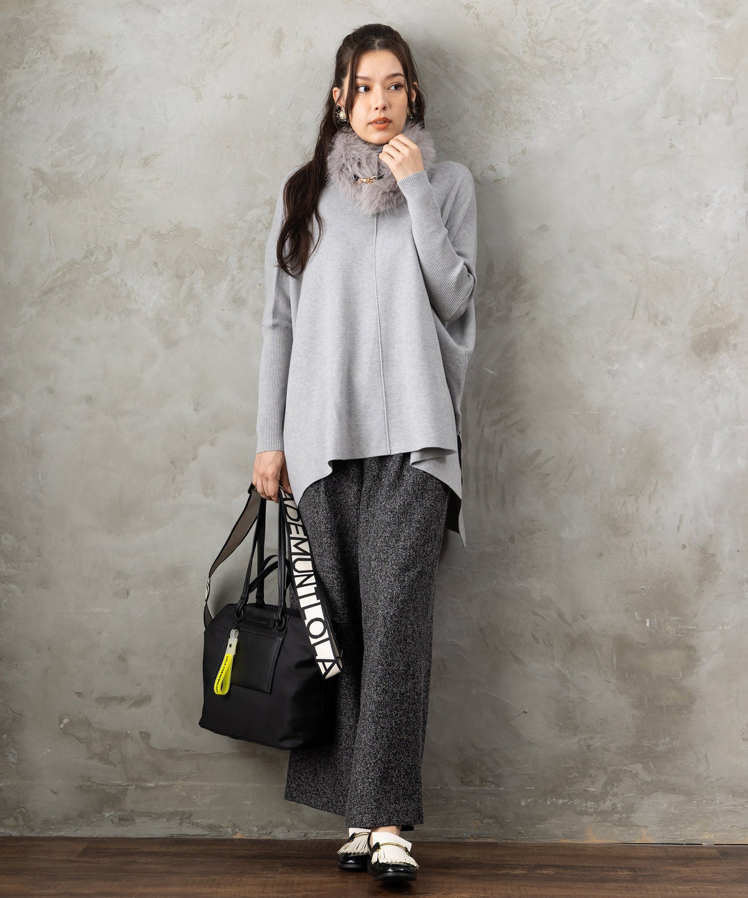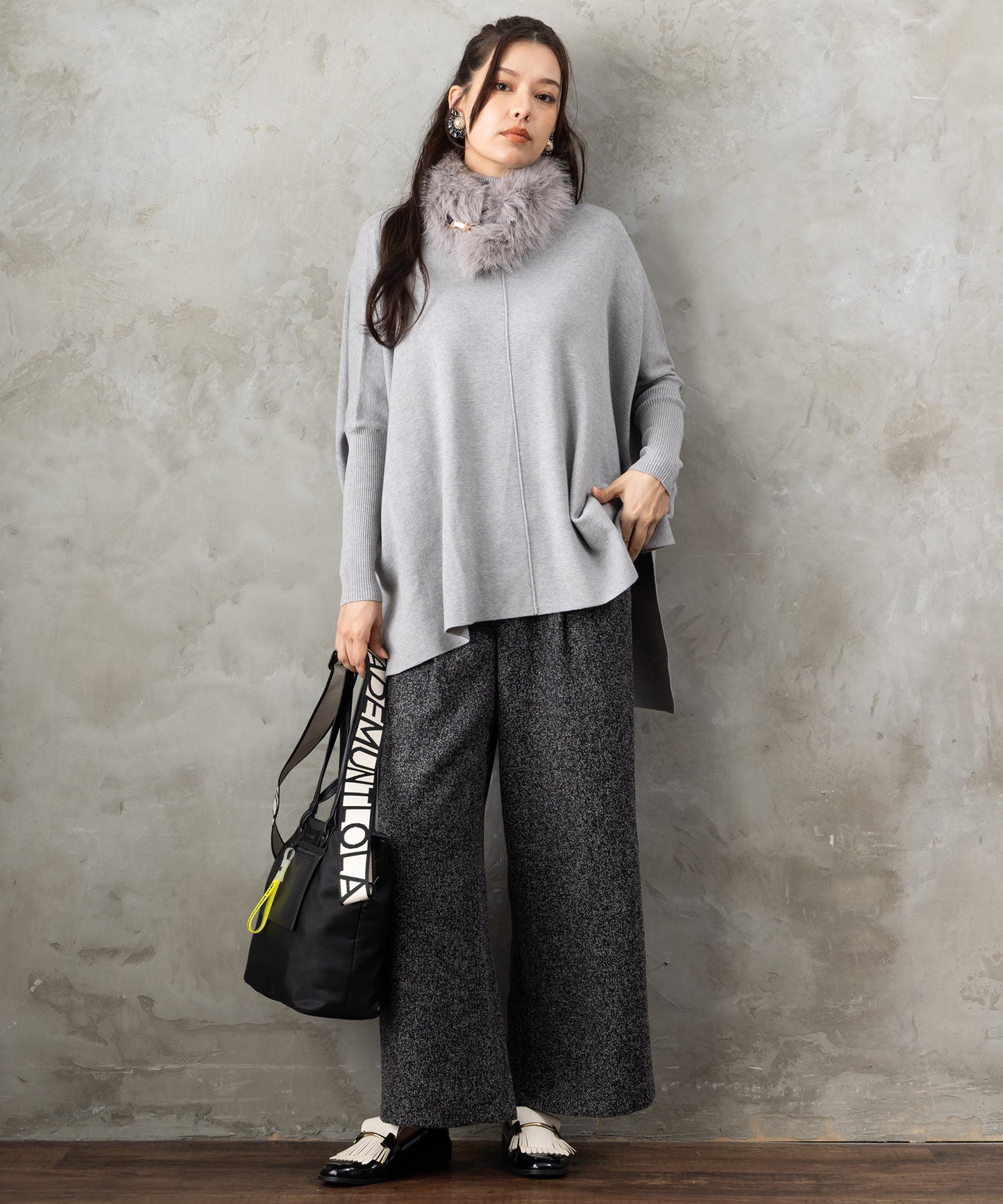 ツイード素材ならではの表情が魅力のワイドパンツ。