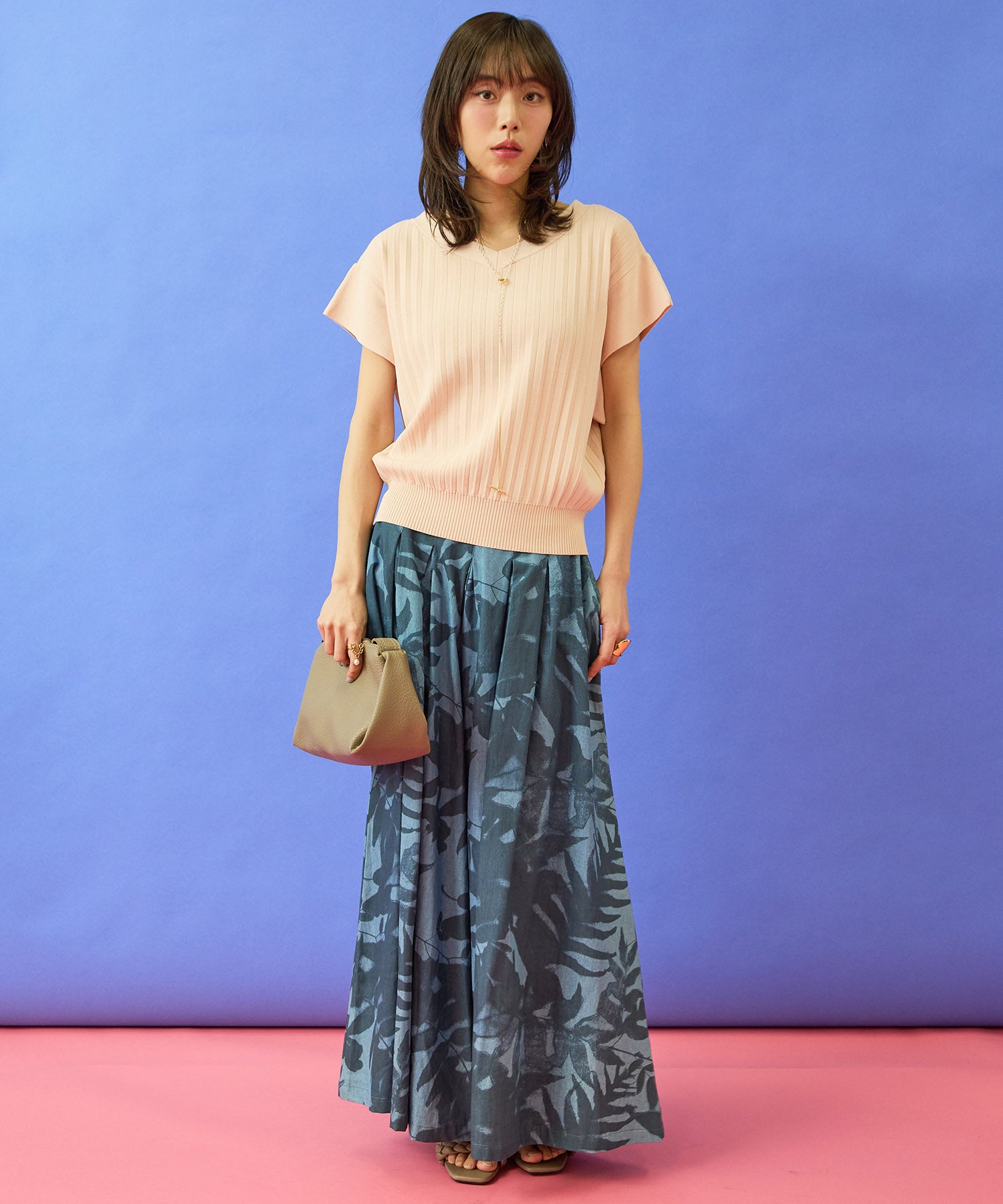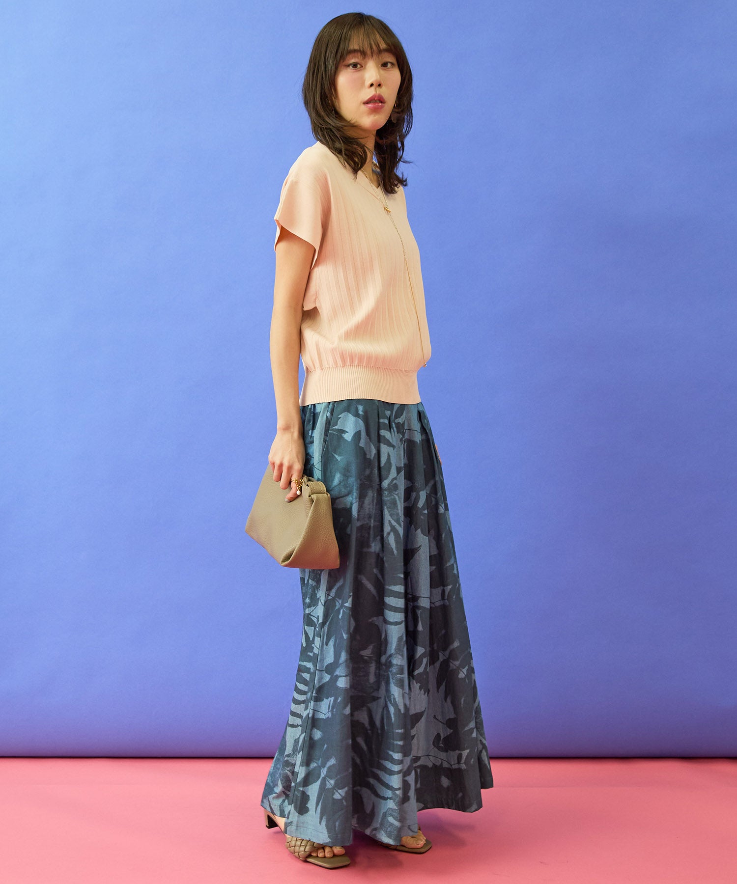 デニム調のベースに、ボタニカルプリントを重ねたフレアワイドパンツ。