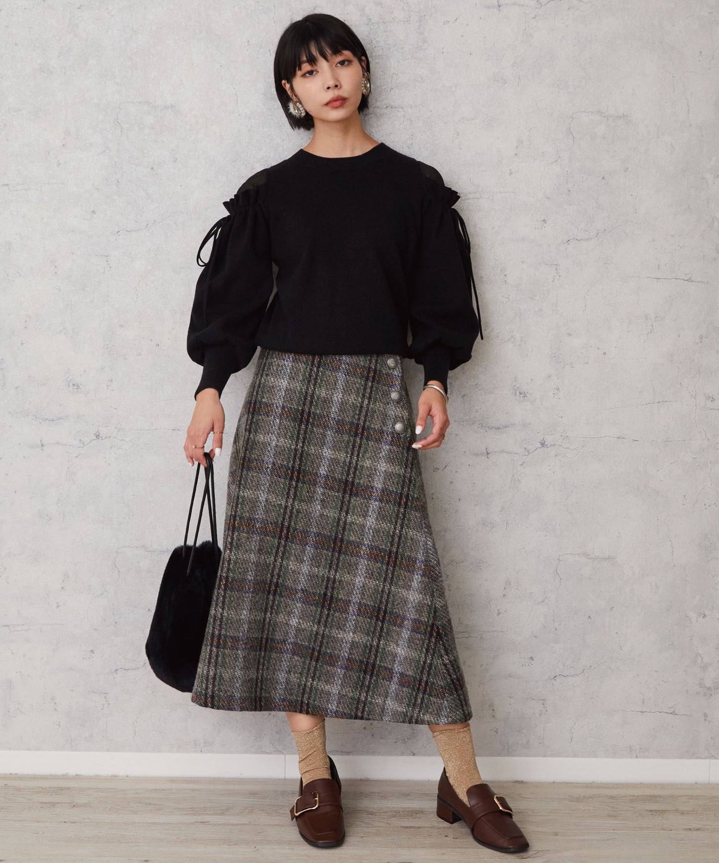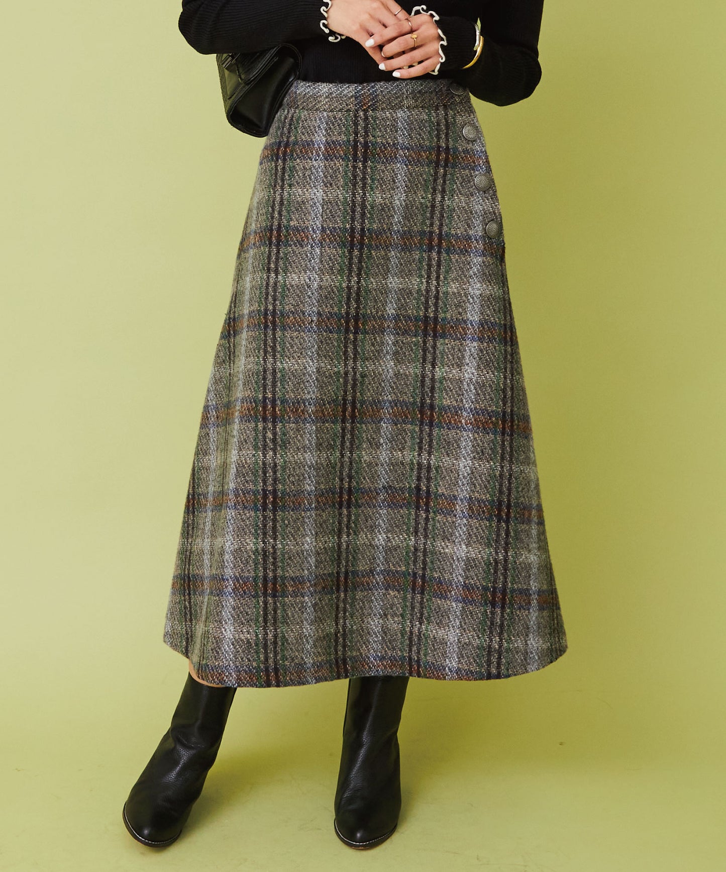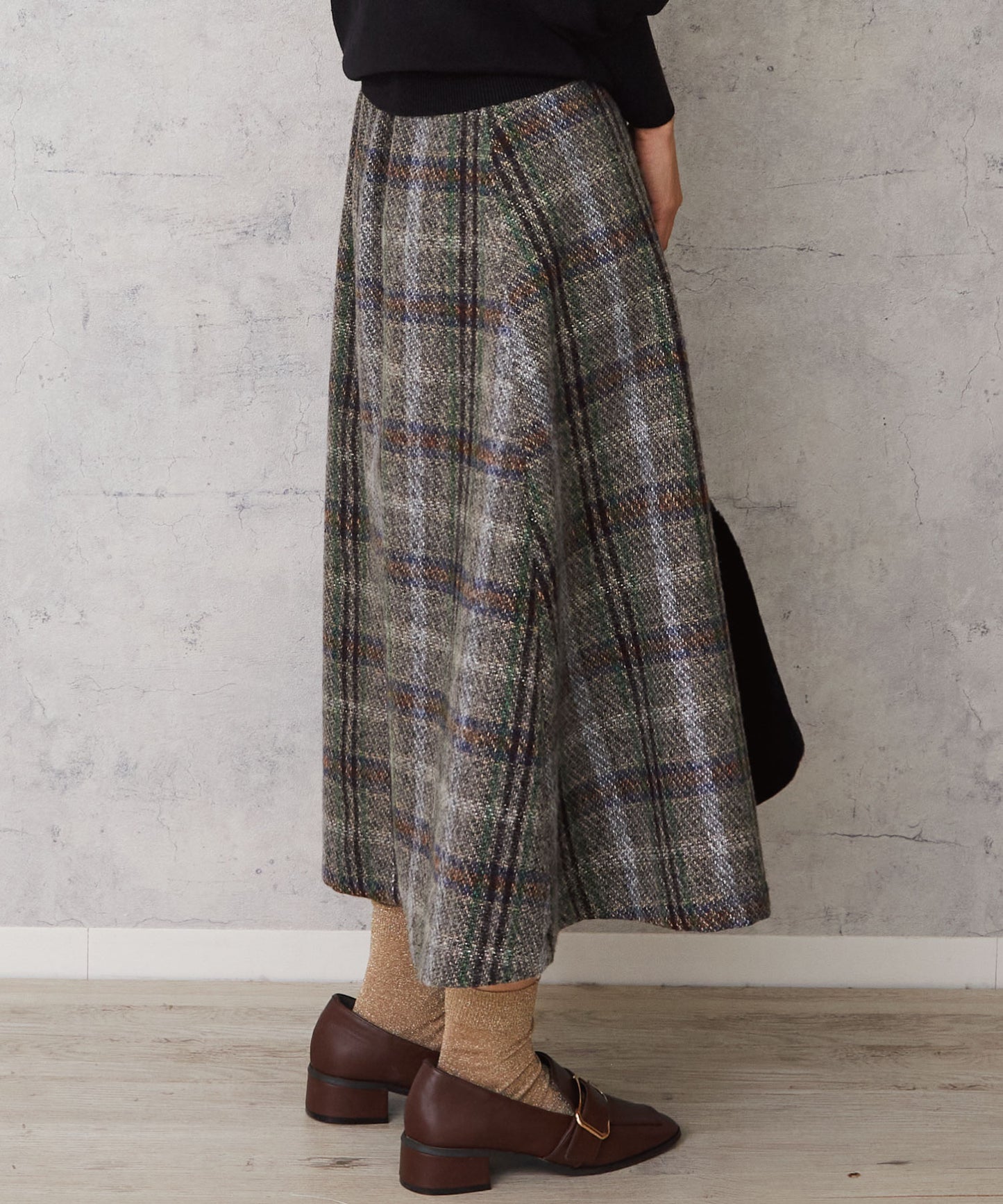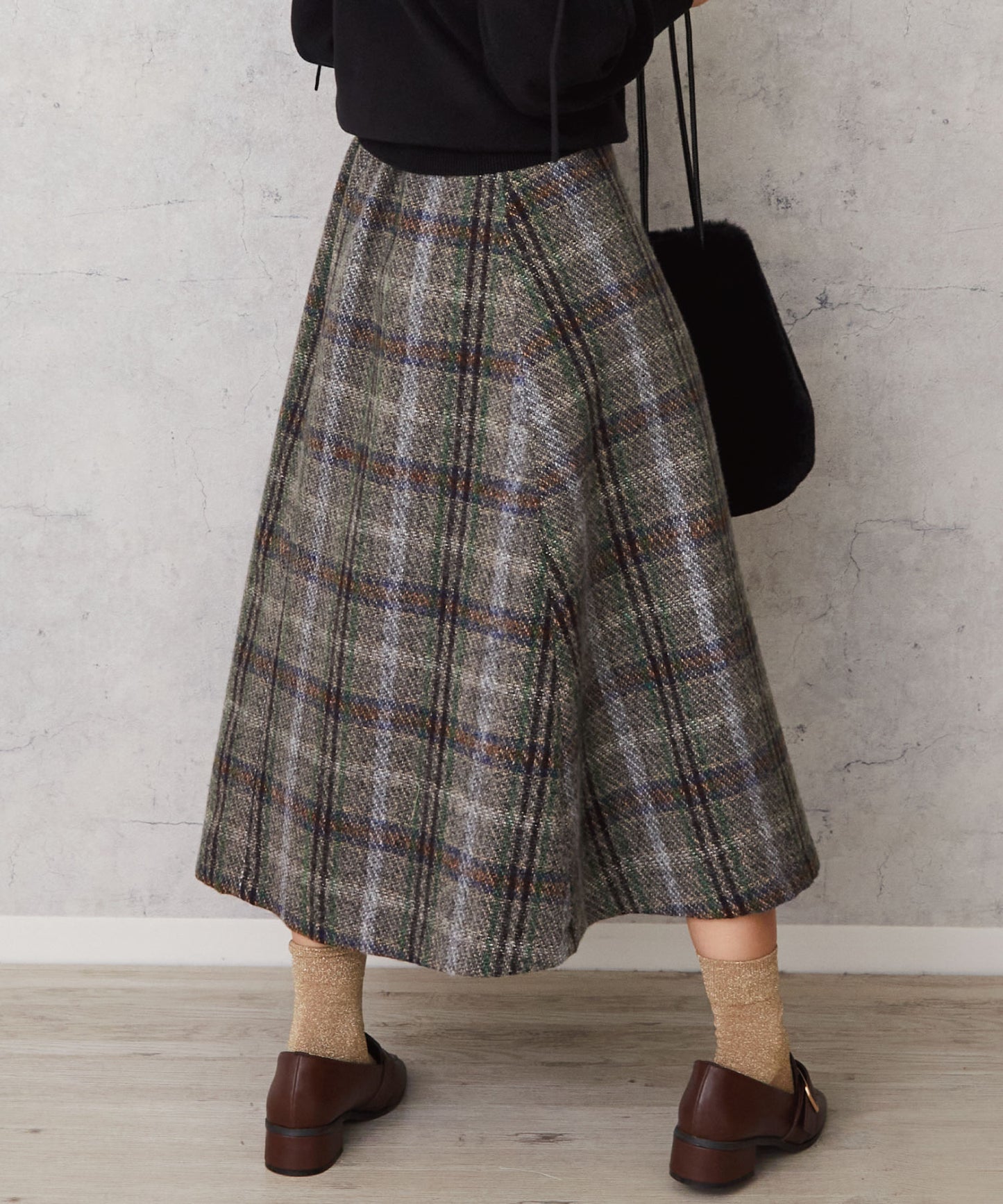 レトロなチェック柄と温かみのあるカルゼツイード生地がウィンタームードを高めるフレアスカート。