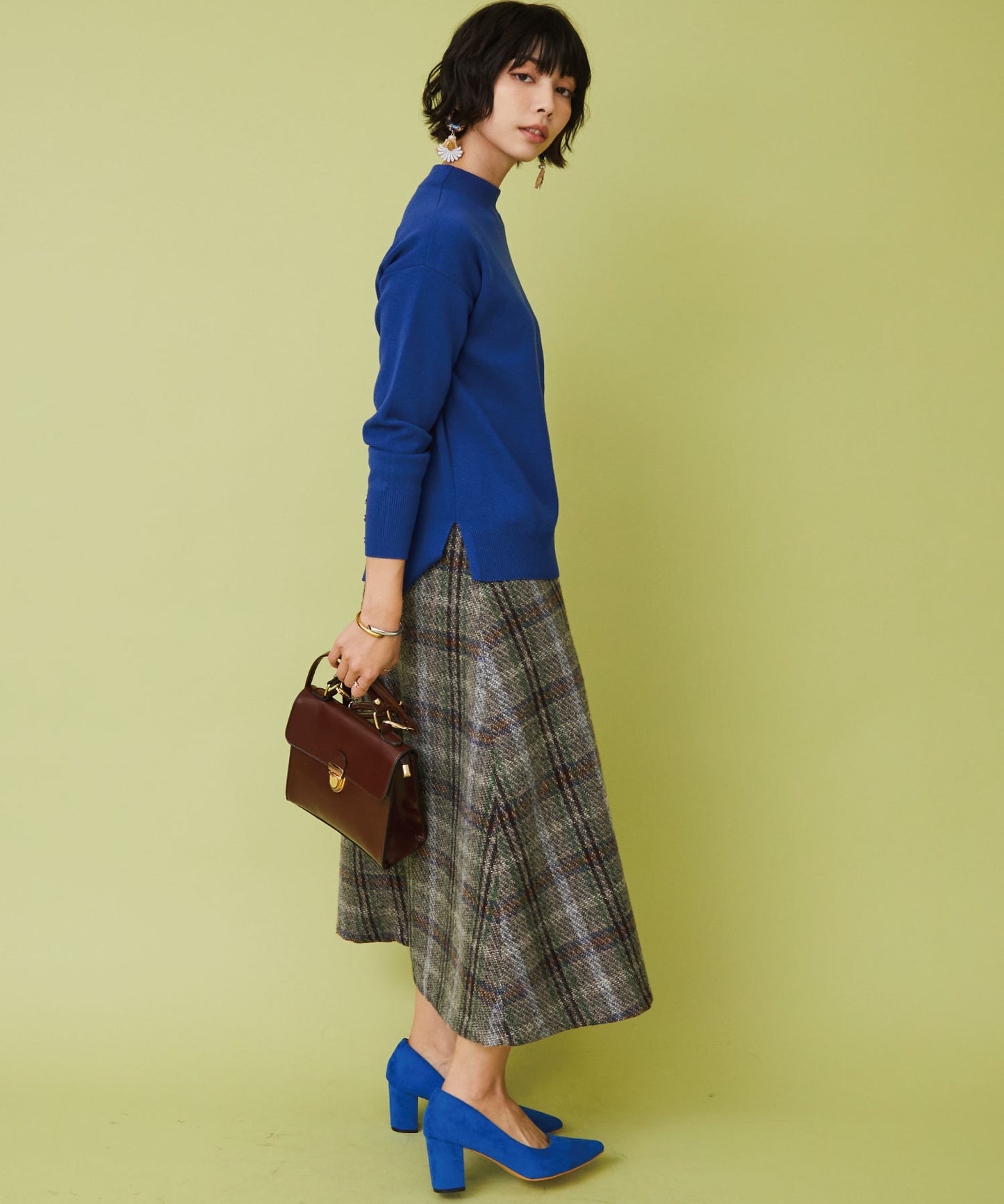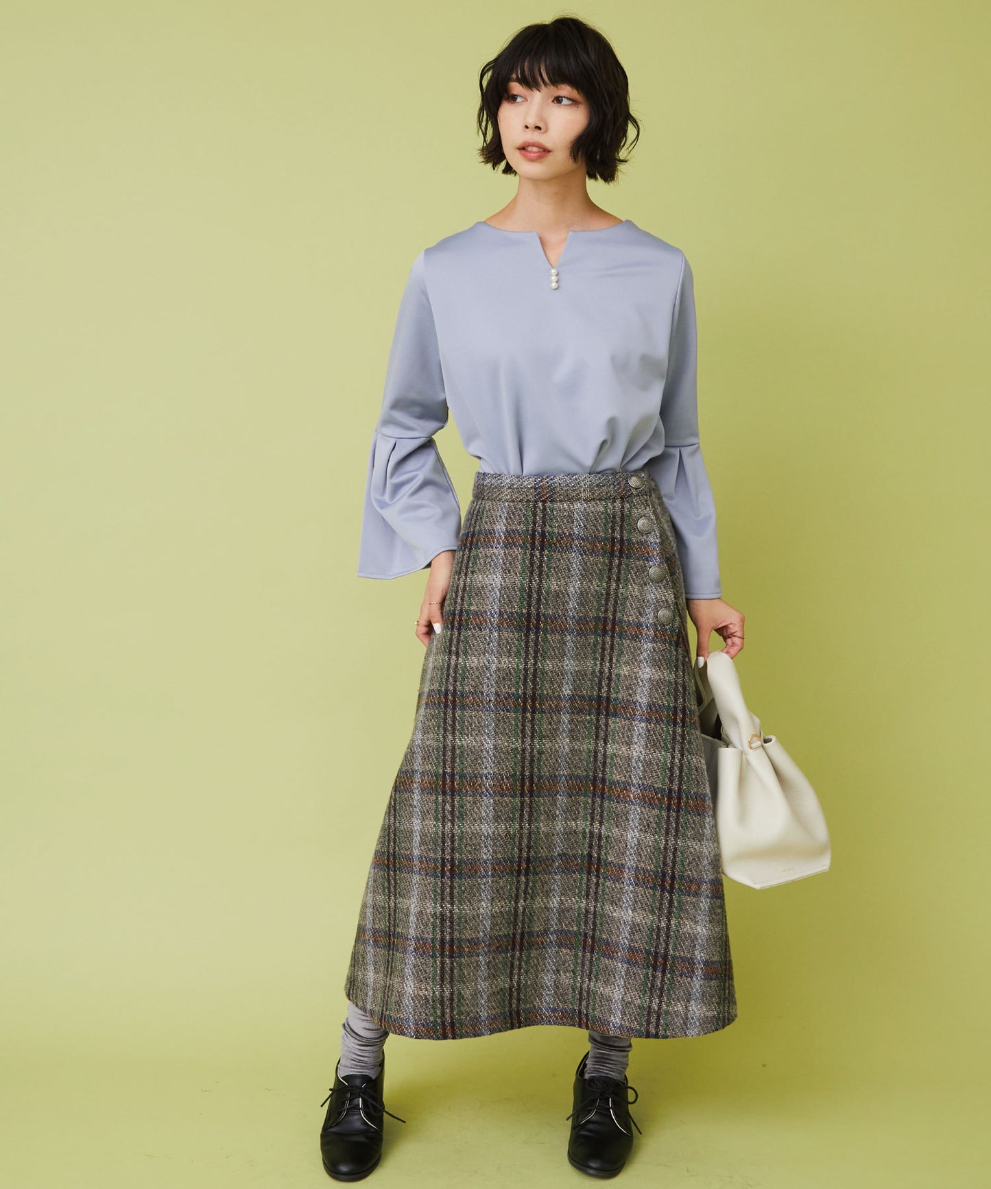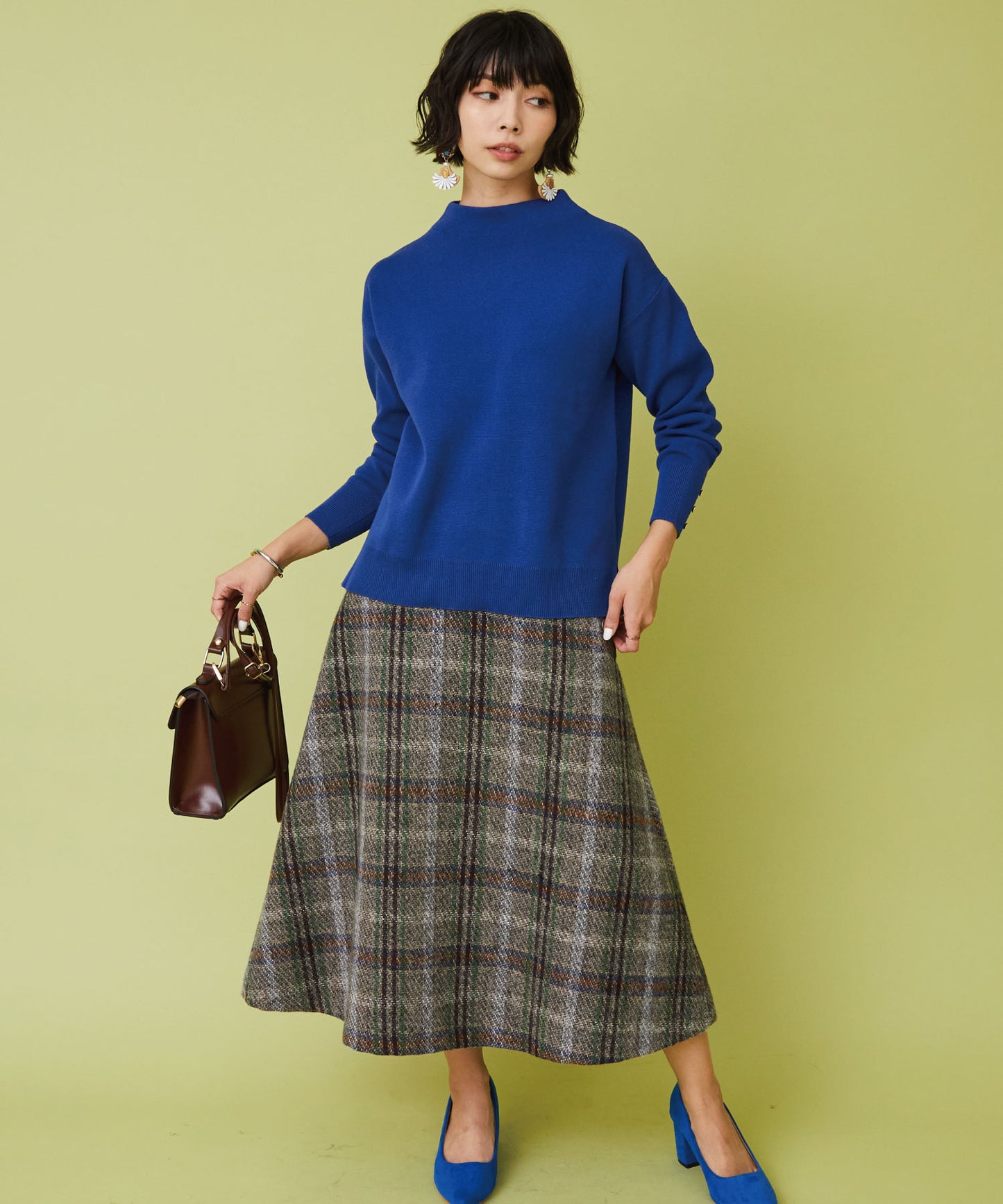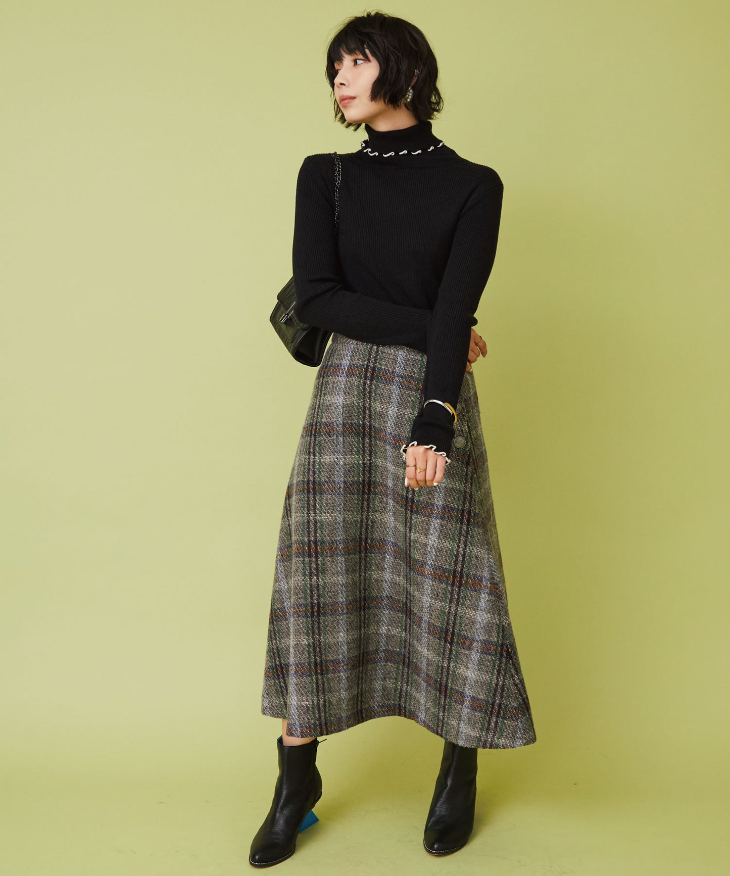 レトロなチェック柄と温かみのあるカルゼツイード生地がウィンタームードを高めるフレアスカート。