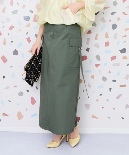 サイドには同素材のカーゴポケットを施し、長めの共布紐を垂らすことで動くたび揺れるさりげないアクセントに。