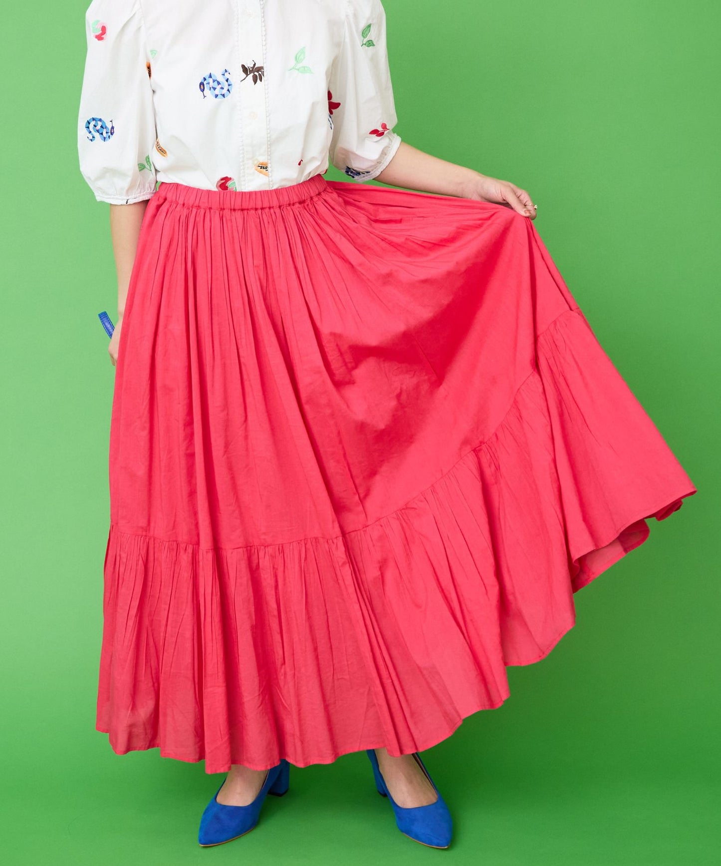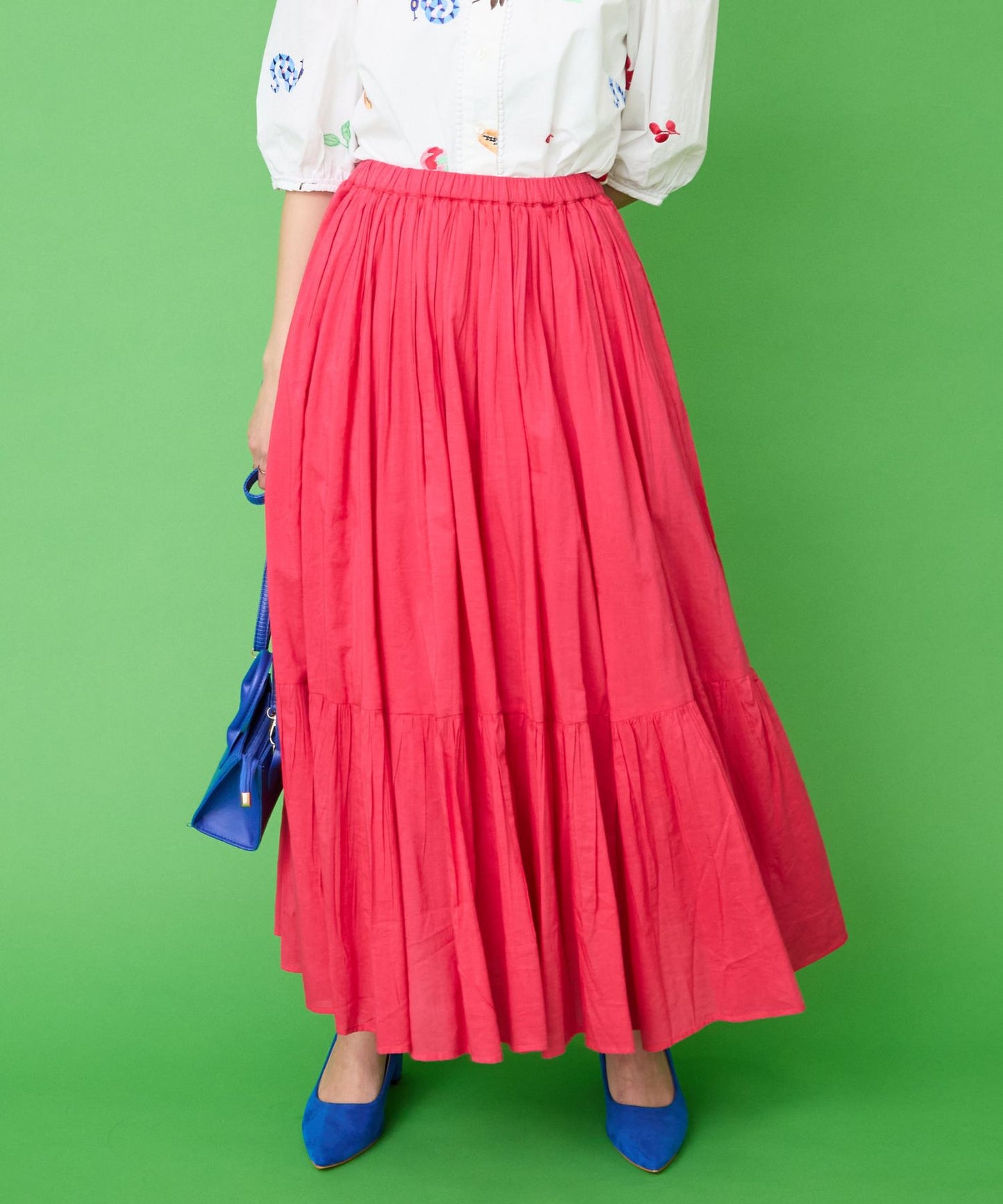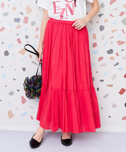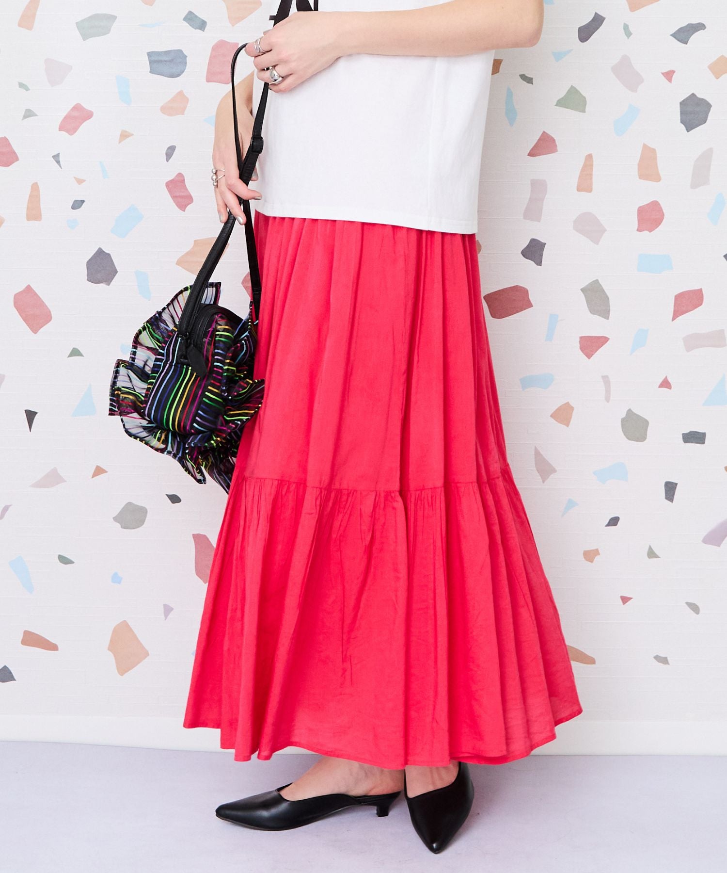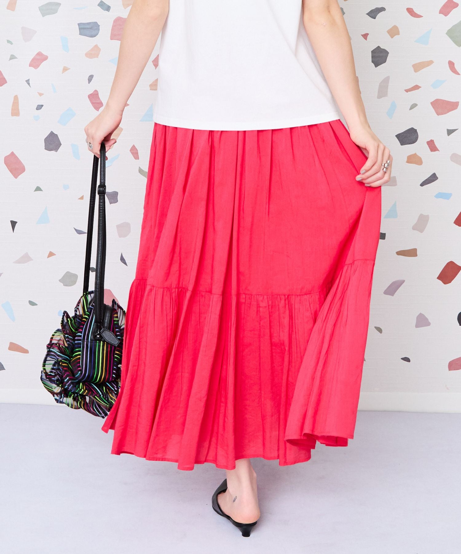 たっぷりとギャザーを寄せた贅沢なシルエットながら、薄手のボイル素材が腰まわりをすっきりと見せてくれます。
