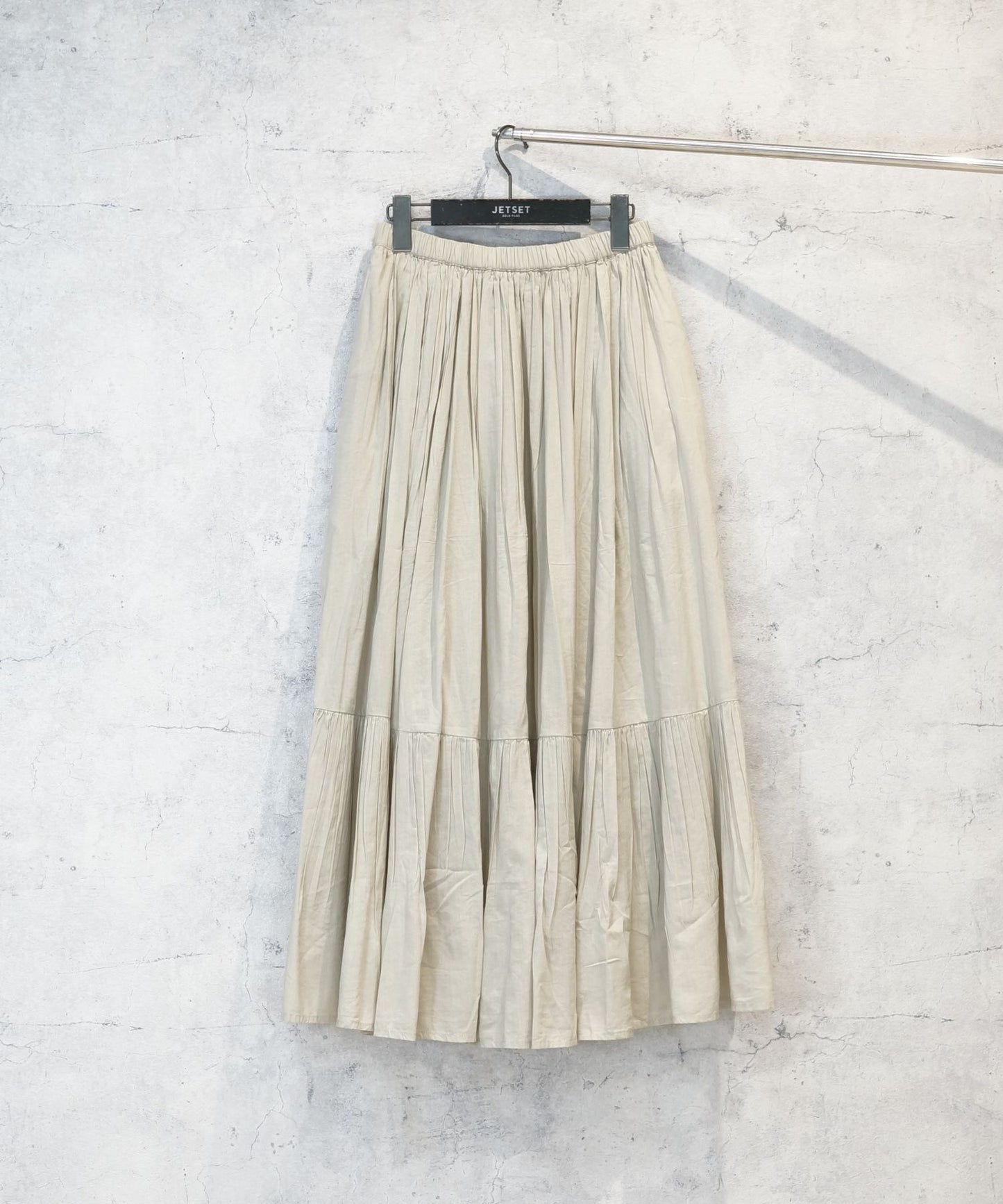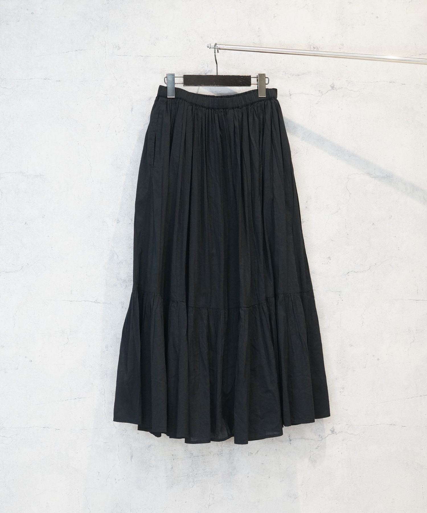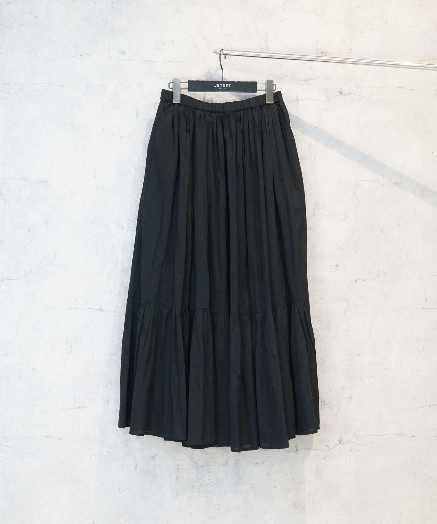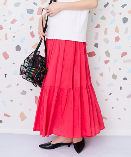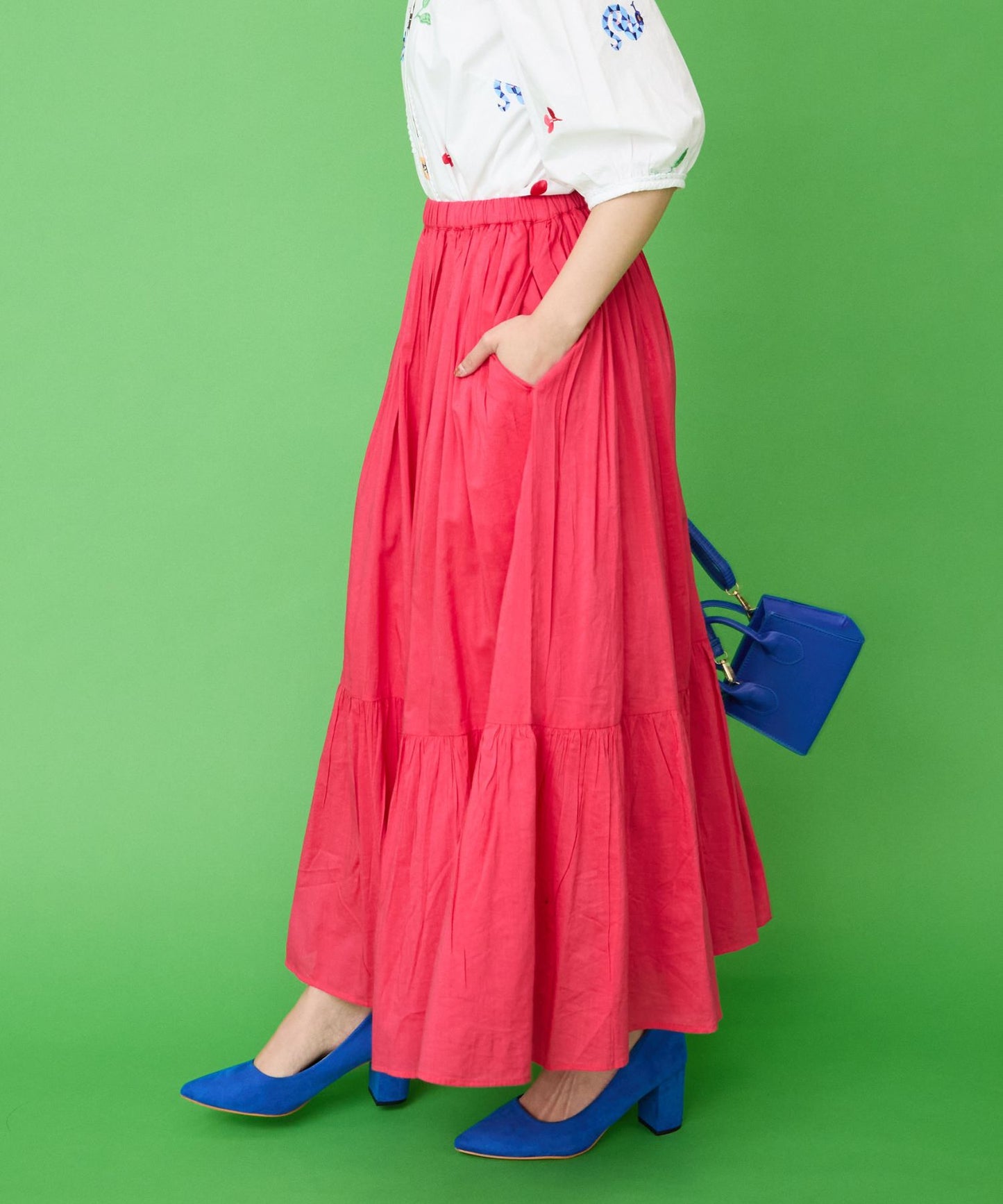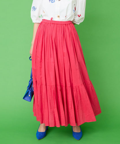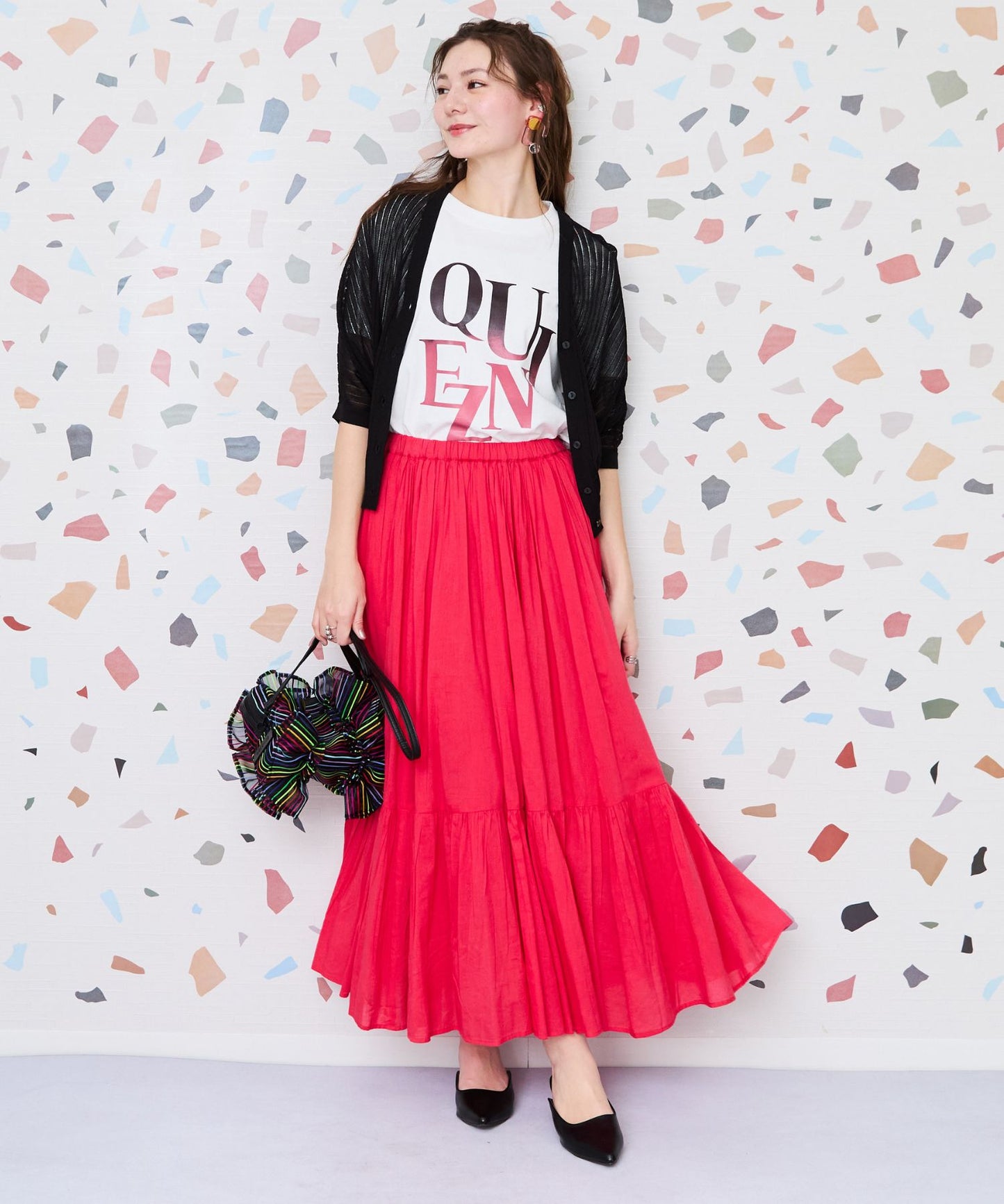 たっぷりとギャザーを寄せた贅沢なシルエットながら、薄手のボイル素材が腰まわりをすっきりと見せてくれます。