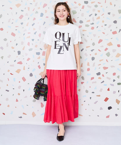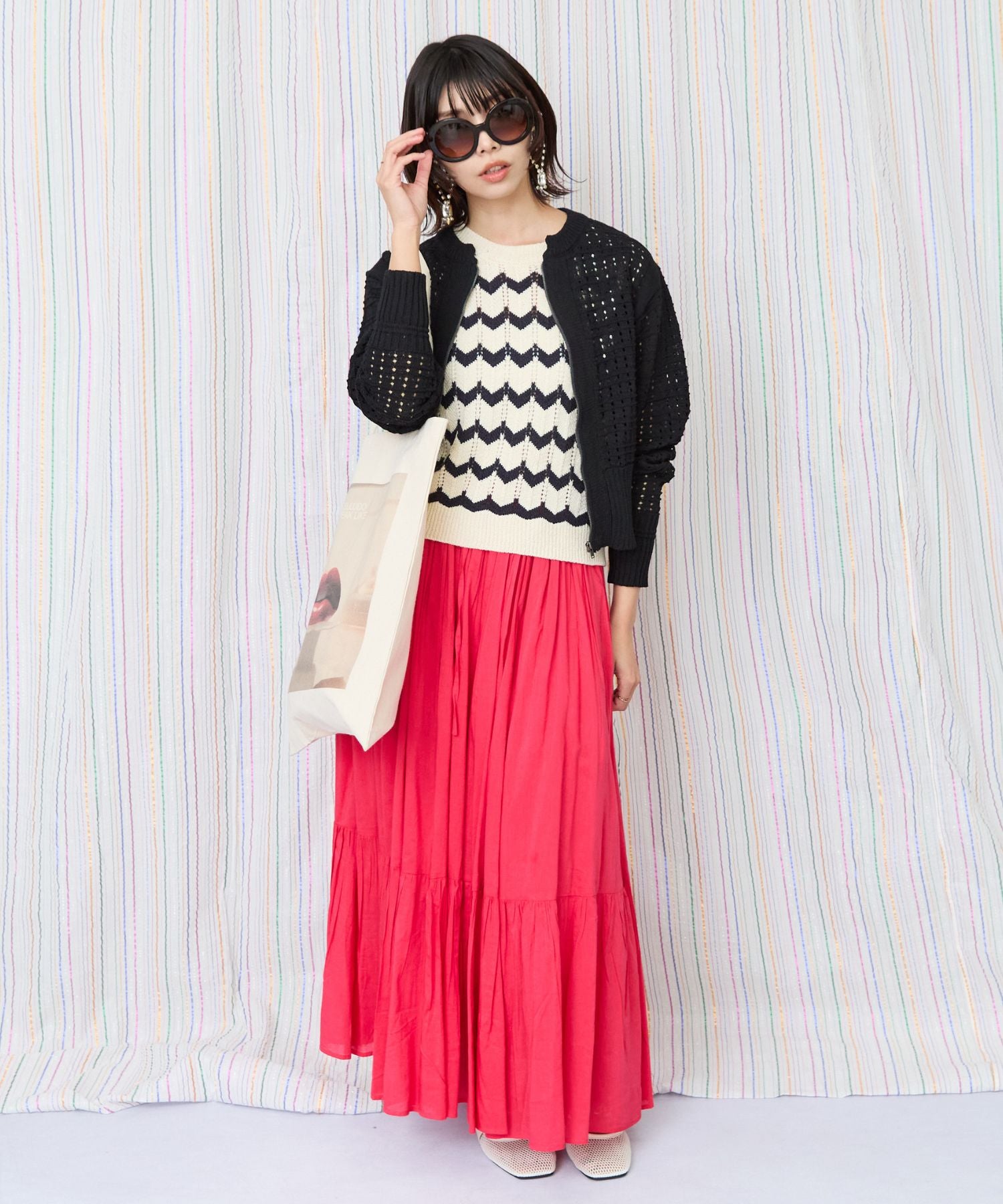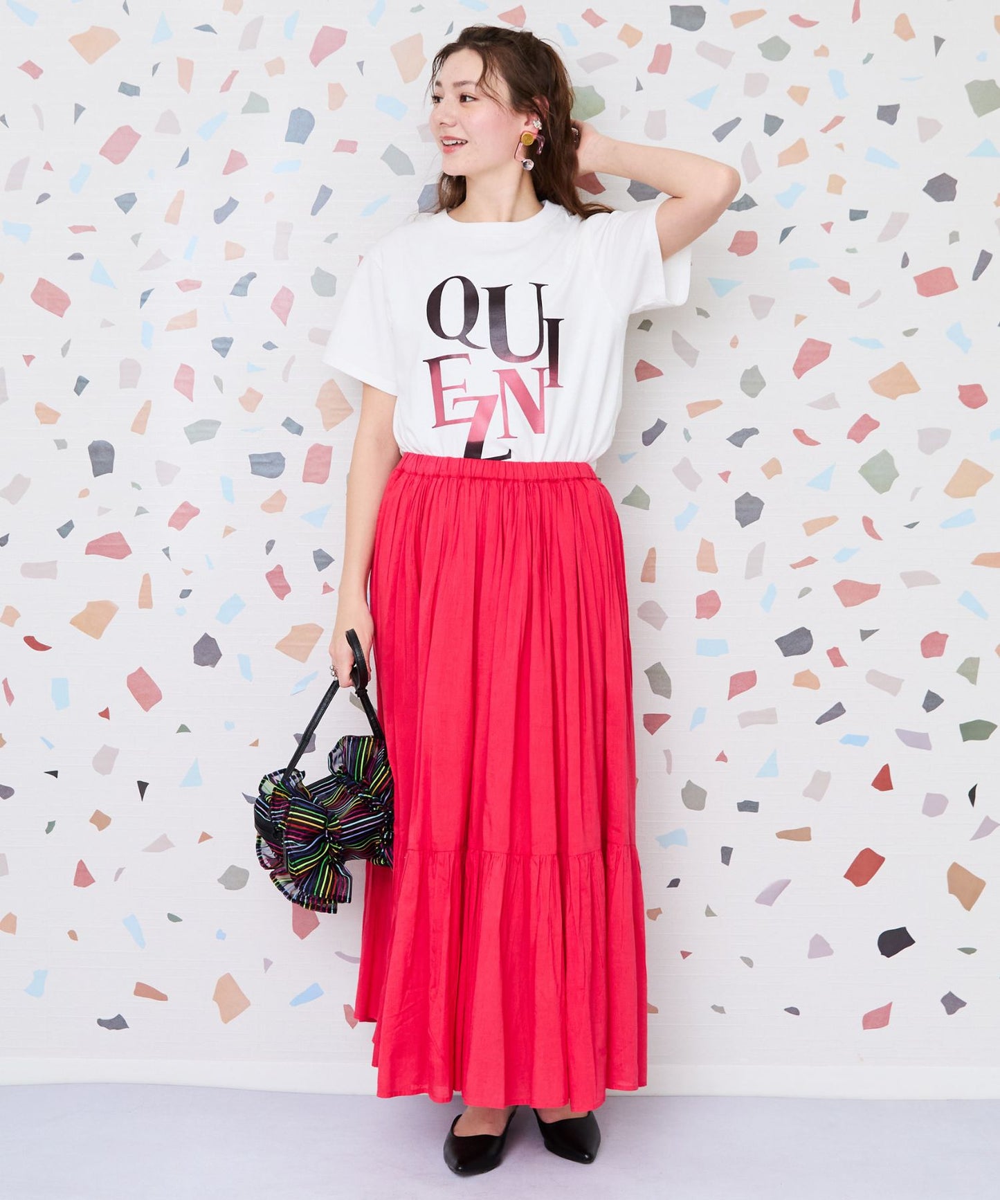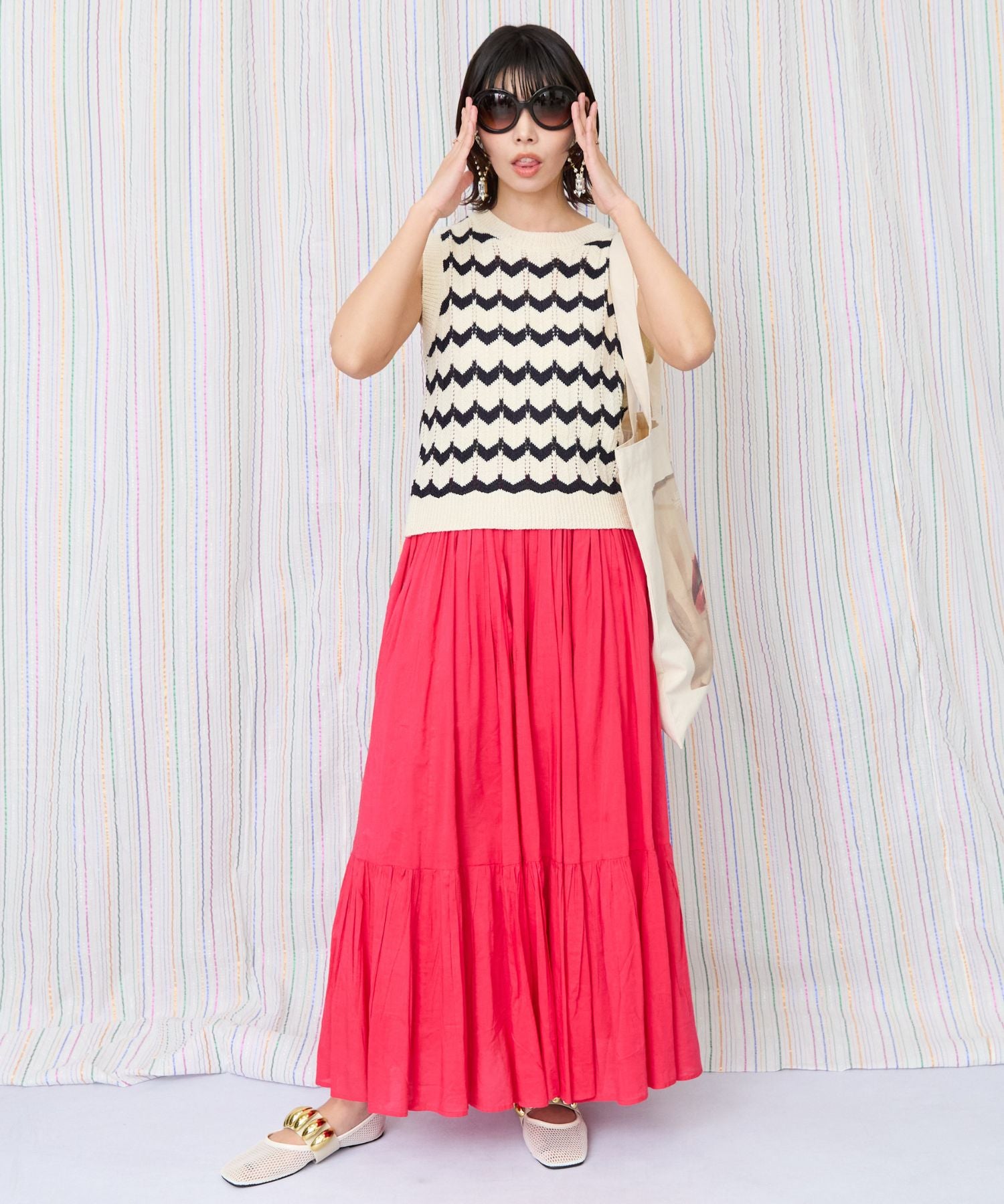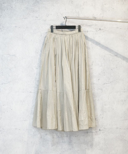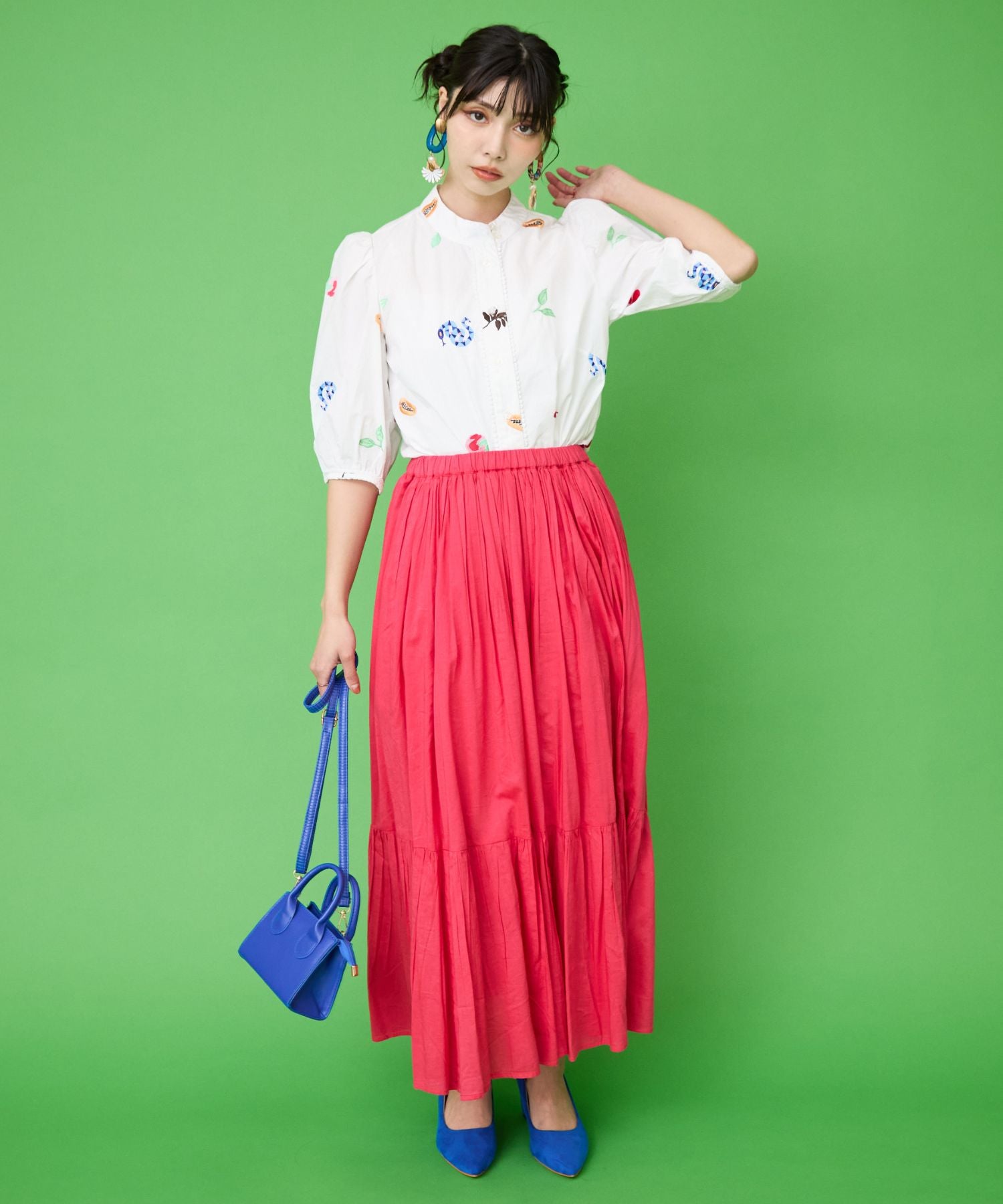 たっぷりとギャザーを寄せた贅沢なシルエットながら、薄手のボイル素材が腰まわりをすっきりと見せてくれます。