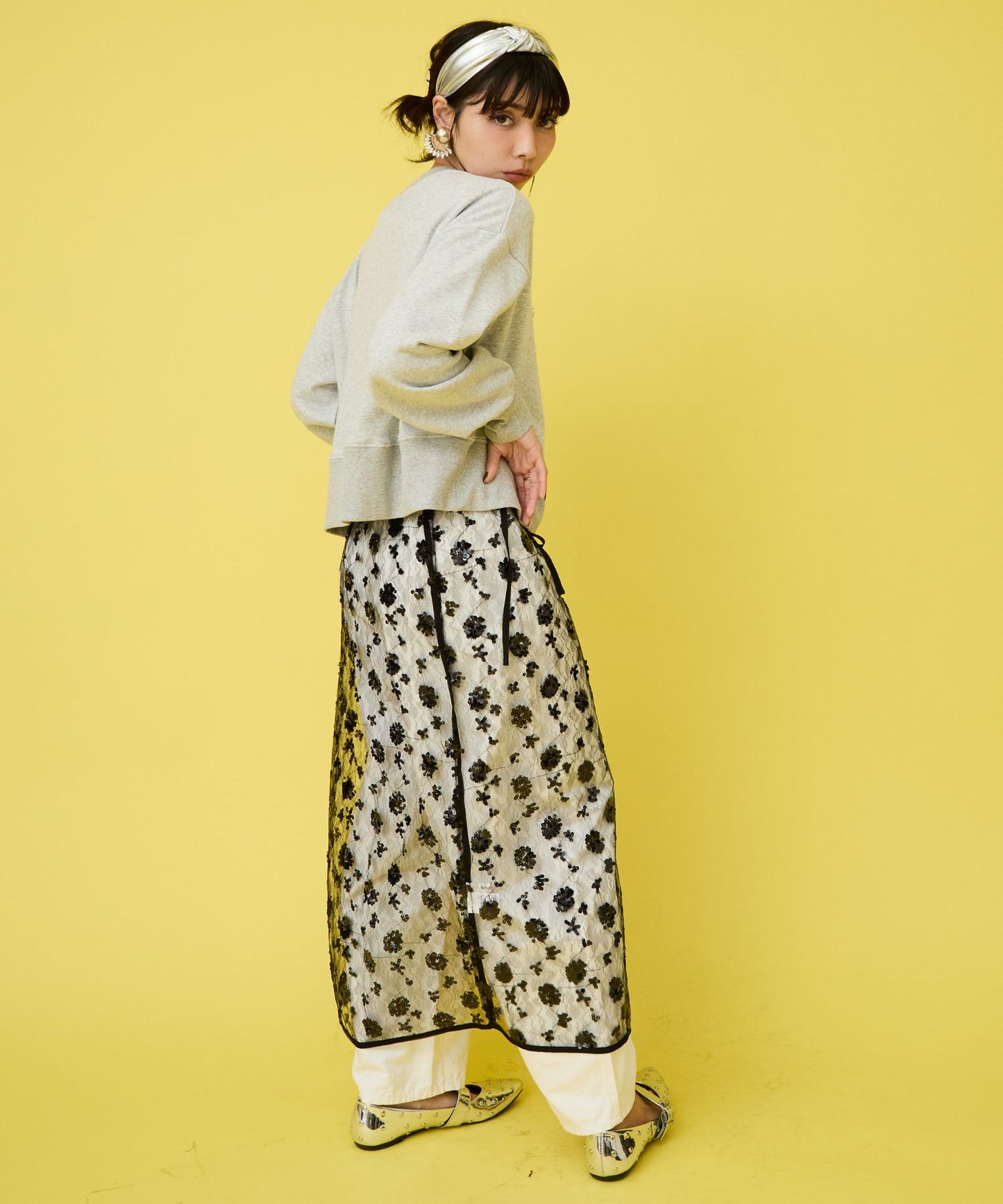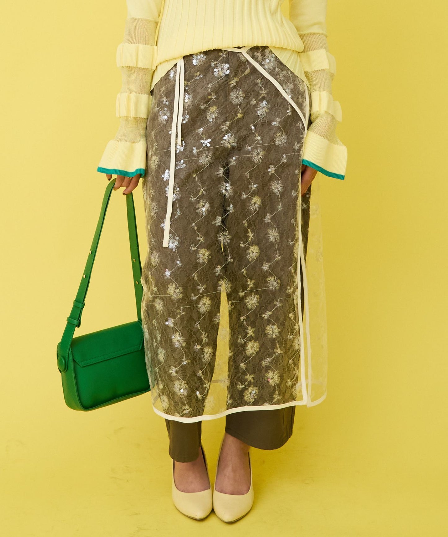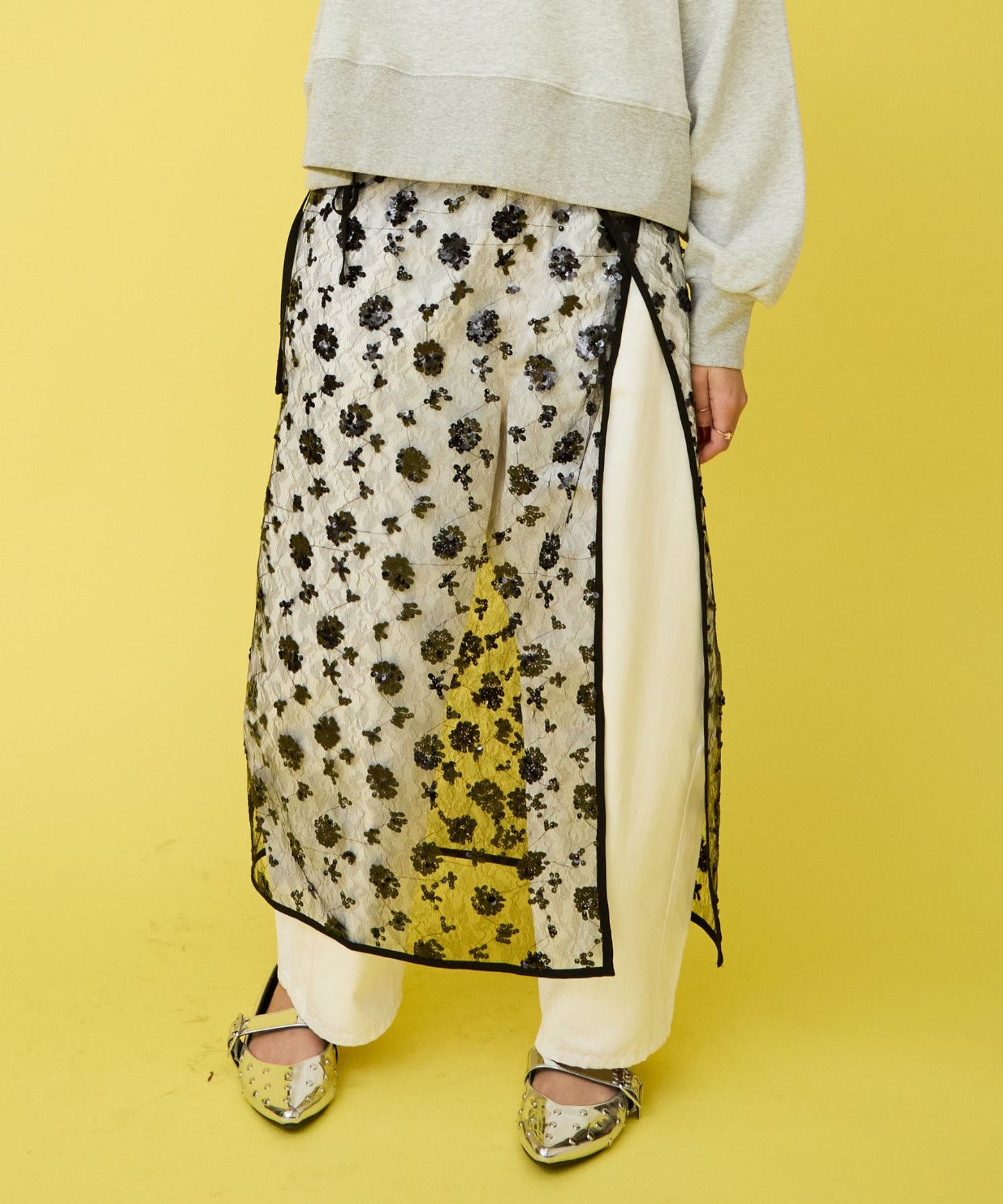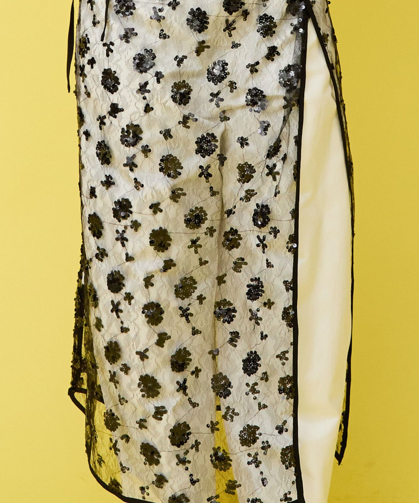 チュール素材にフラワー柄をスパンコール刺繍で表現した、トレンド感溢れるラップスカート。