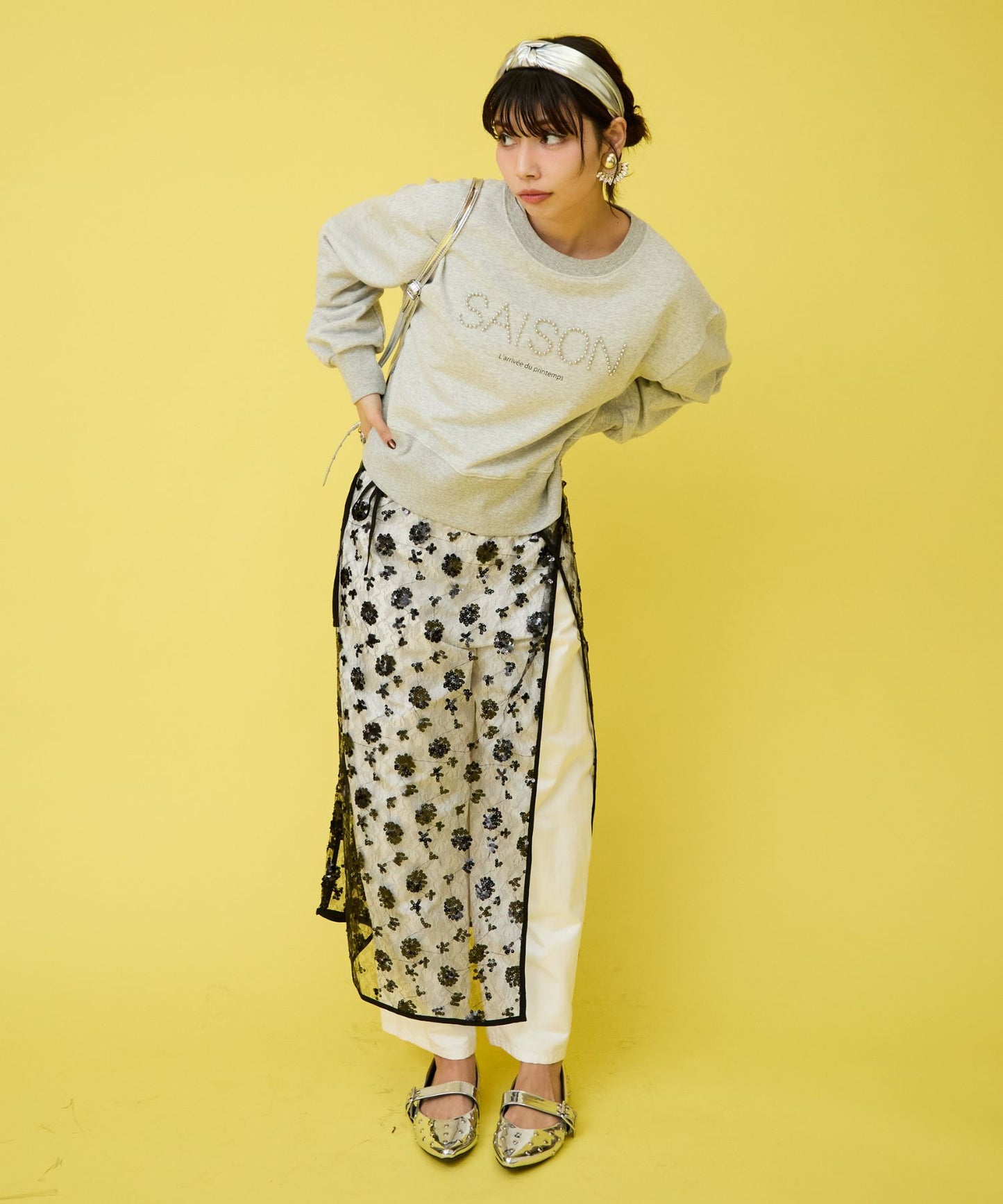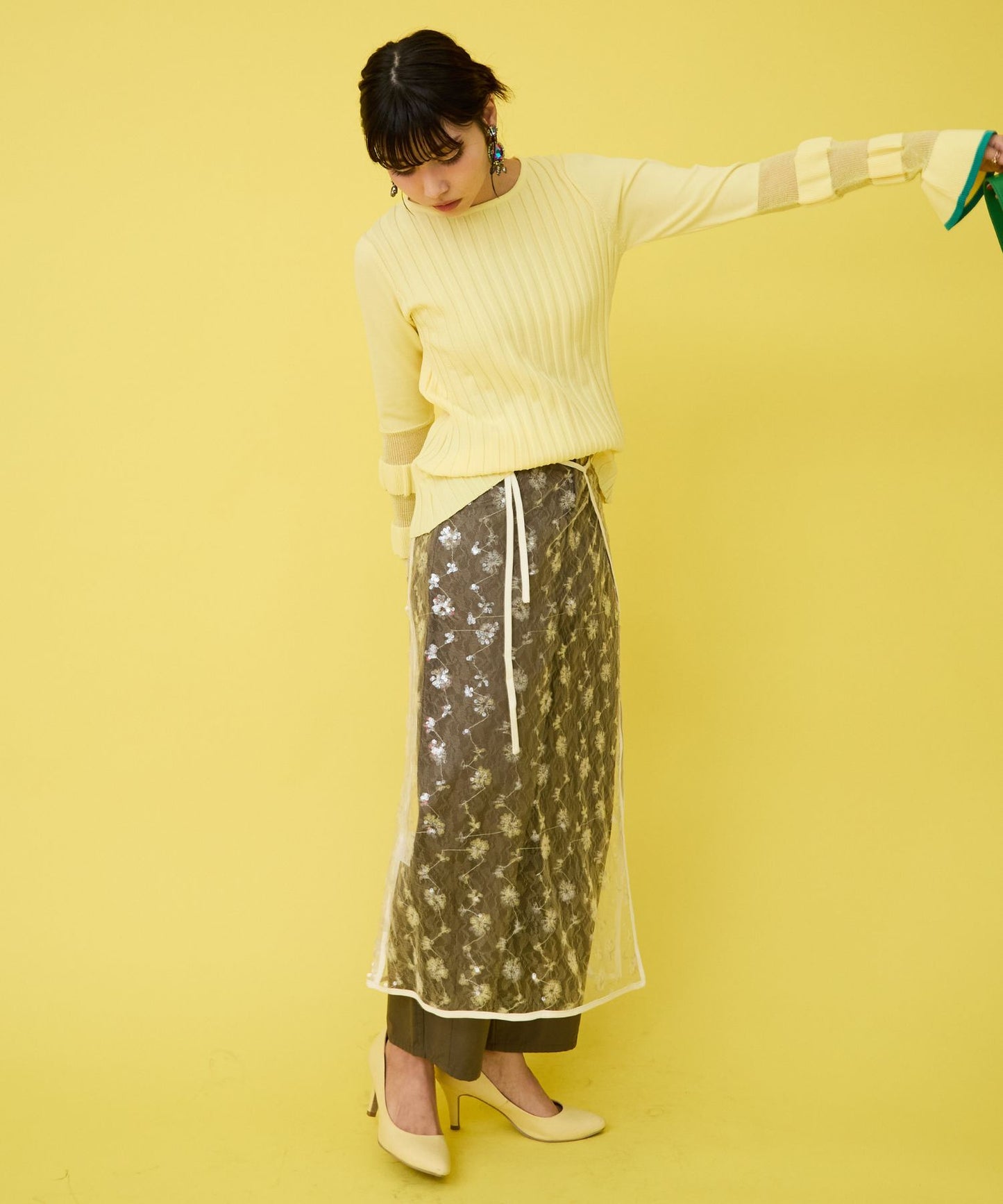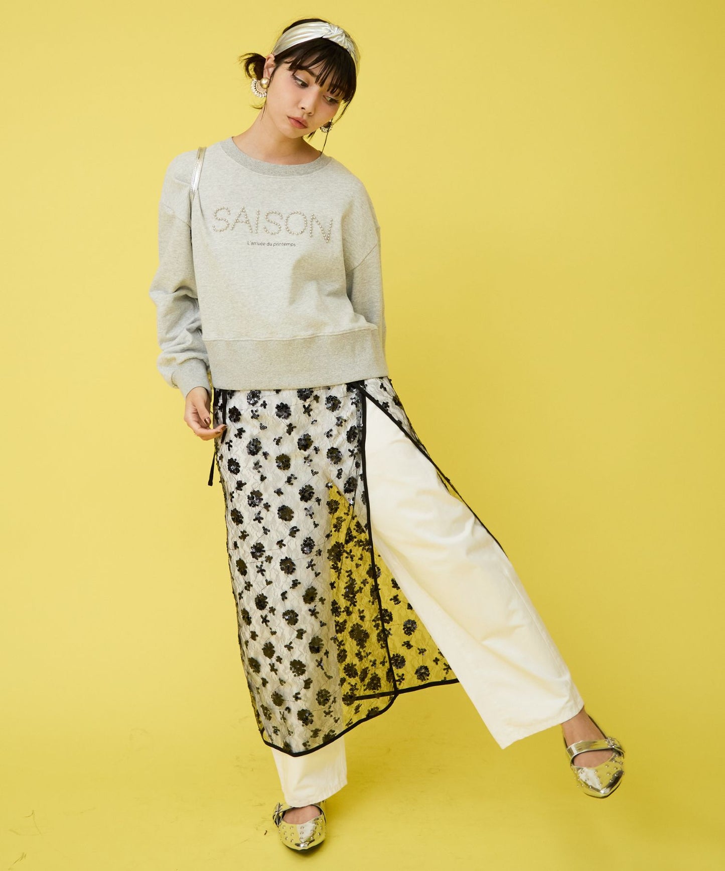 チュール素材にフラワー柄をスパンコール刺繍で表現した、トレンド感溢れるラップスカート。