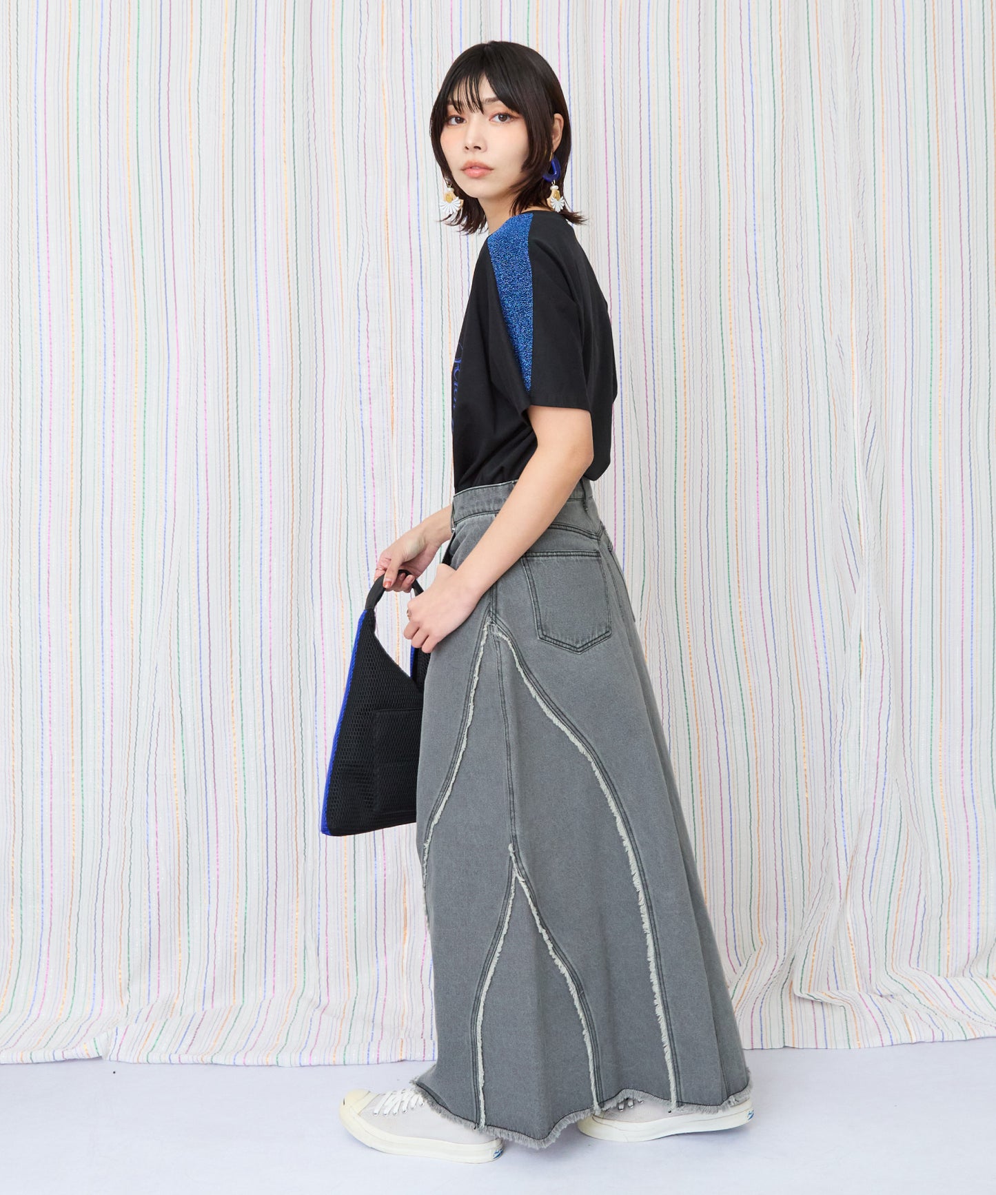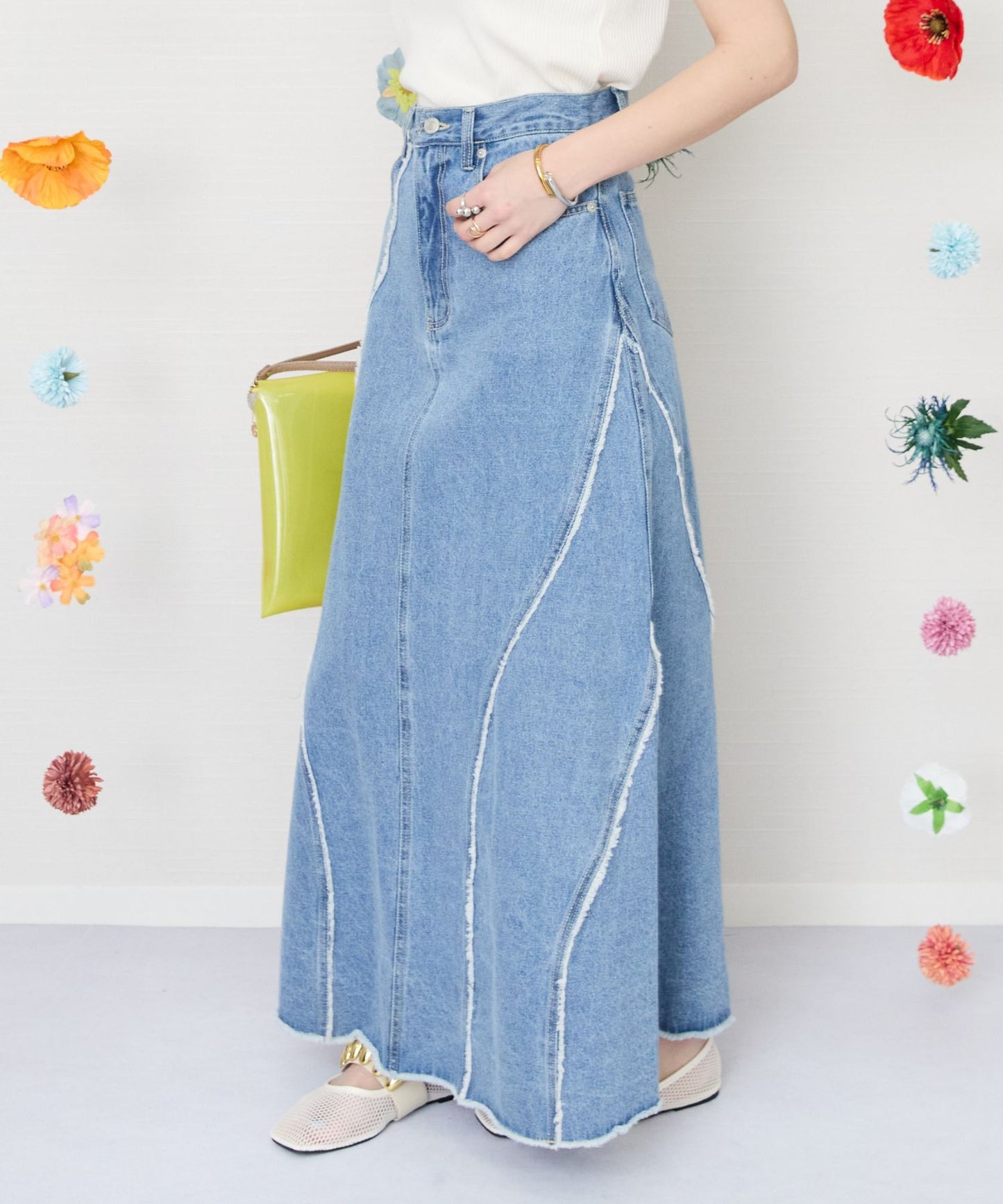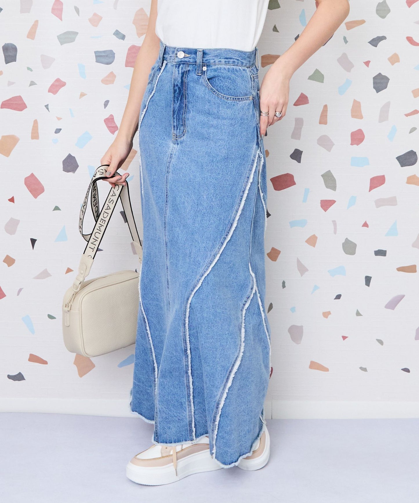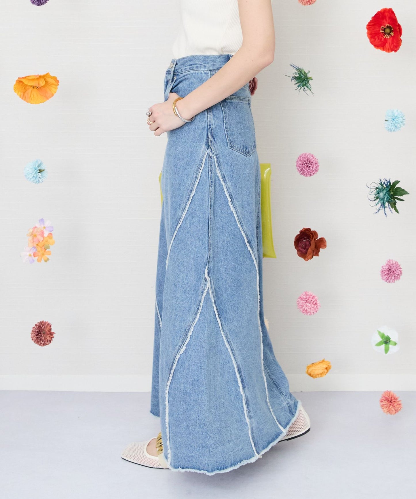 縦に切り替えたウェーブカッティングとフリンジが印象的なデニムスカート。