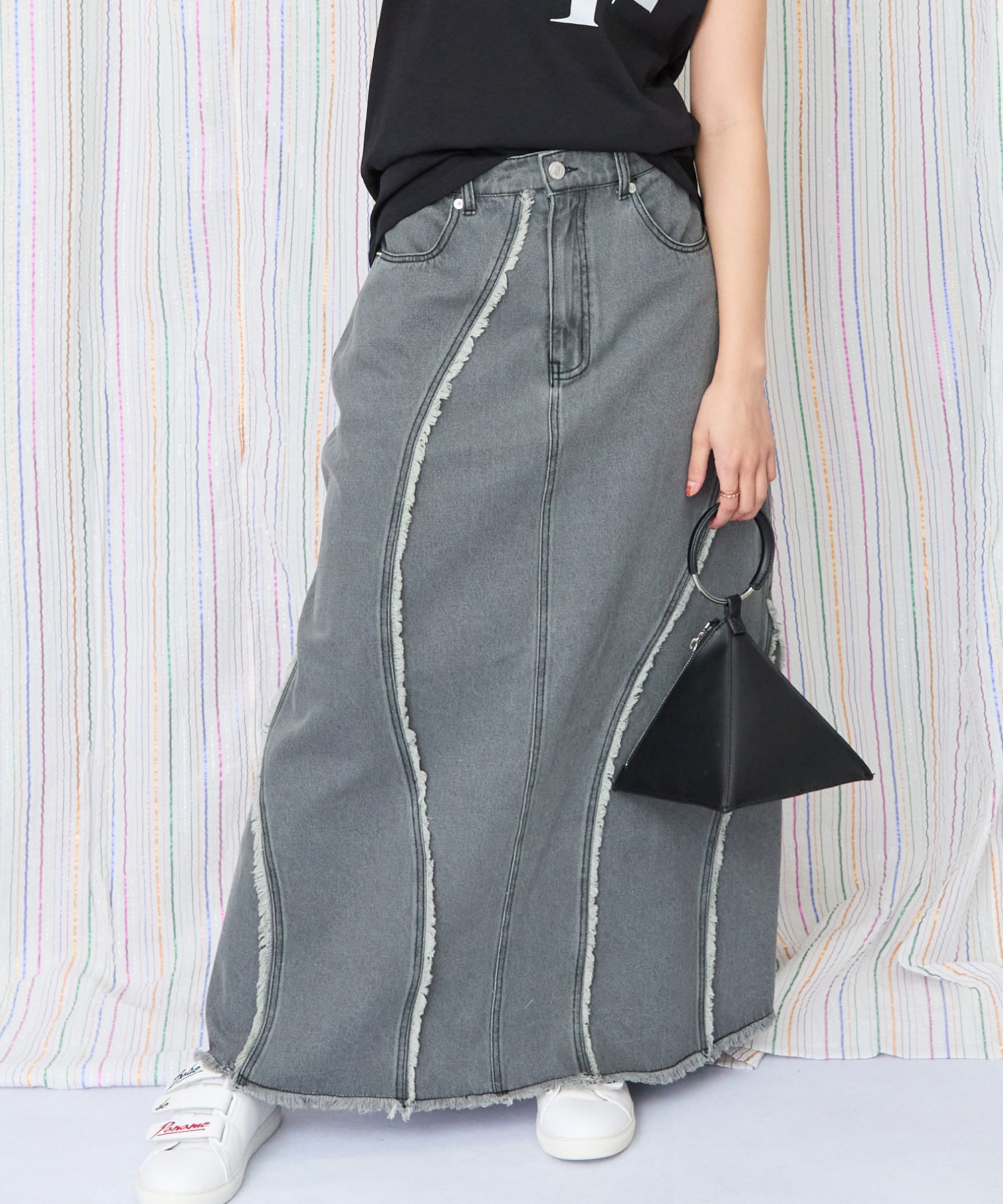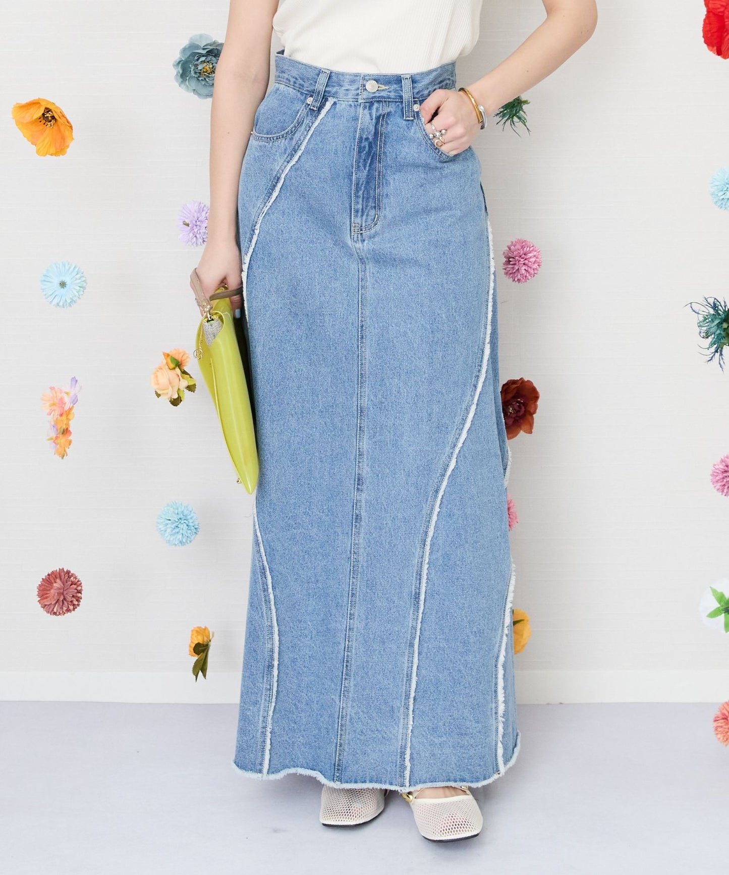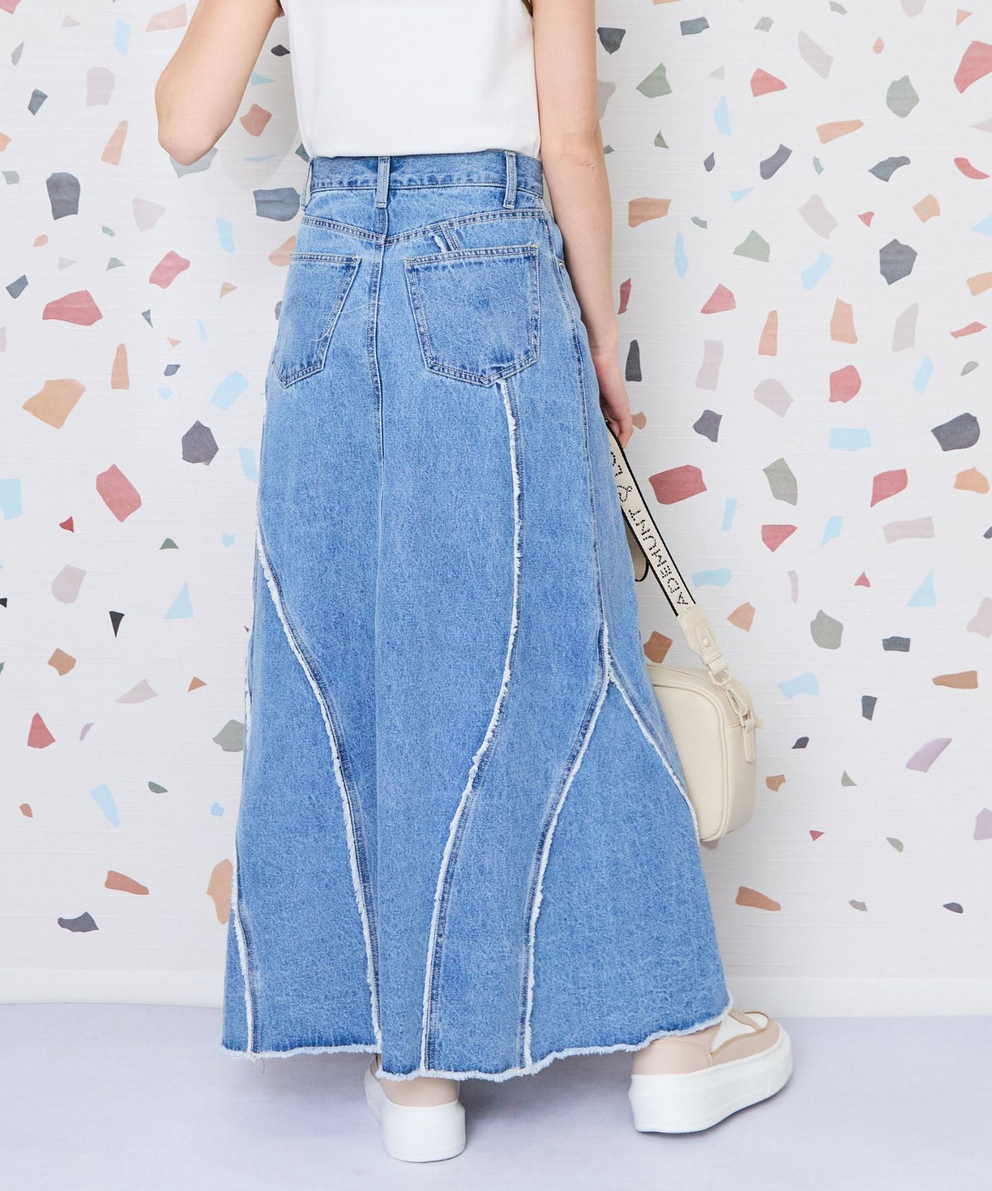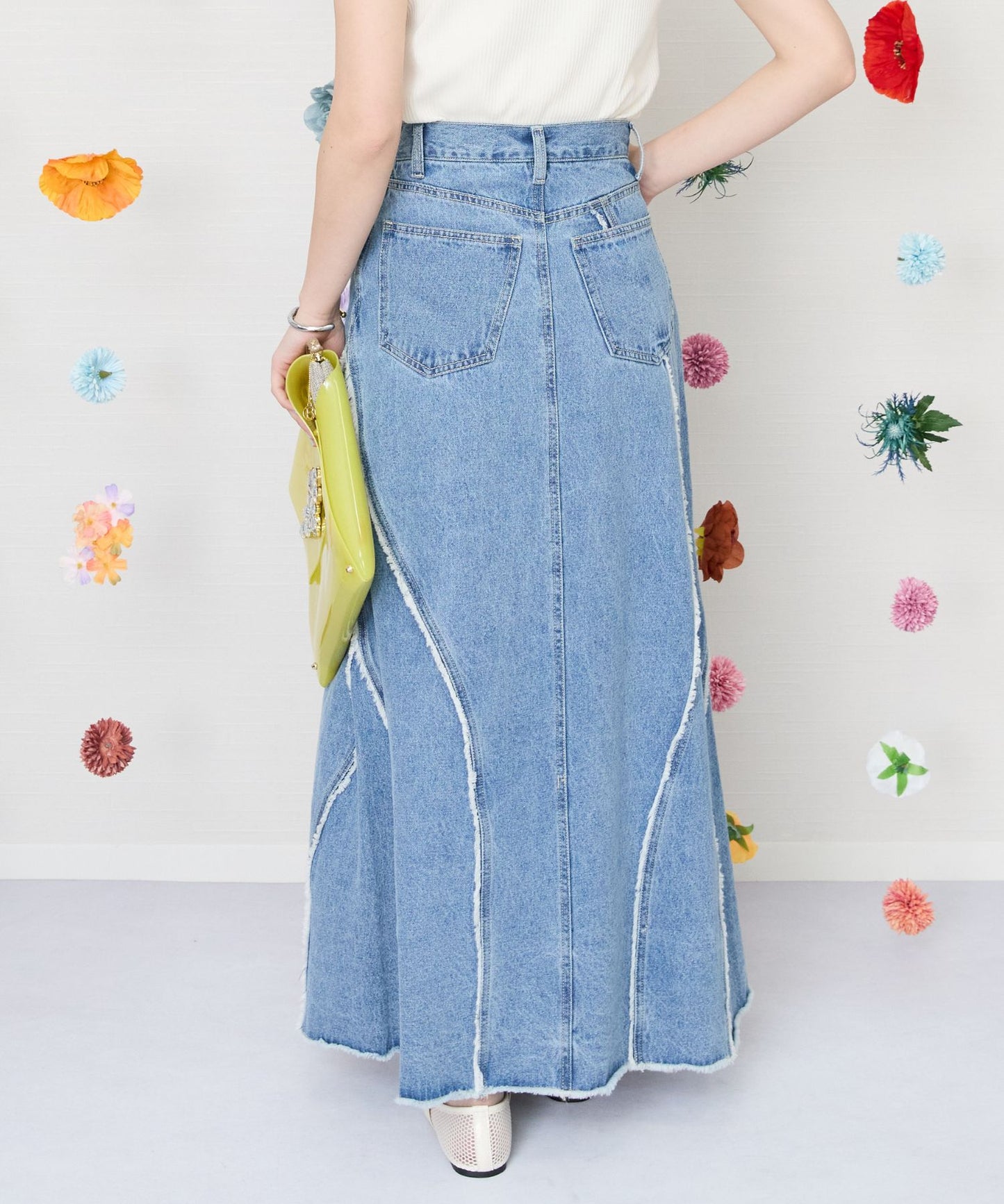 縦に切り替えたウェーブカッティングとフリンジが印象的なデニムスカート。