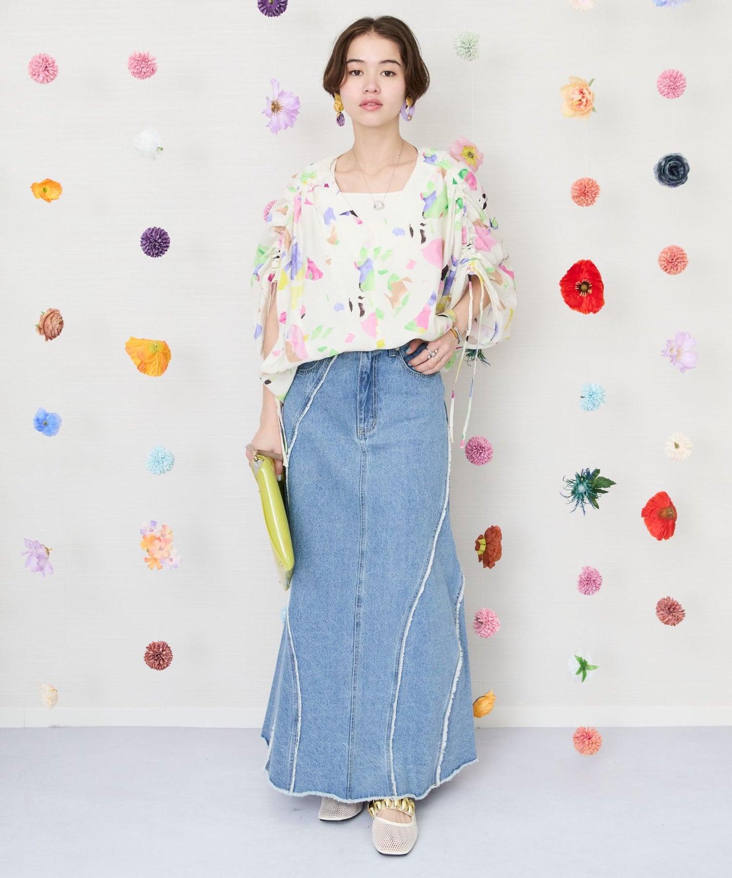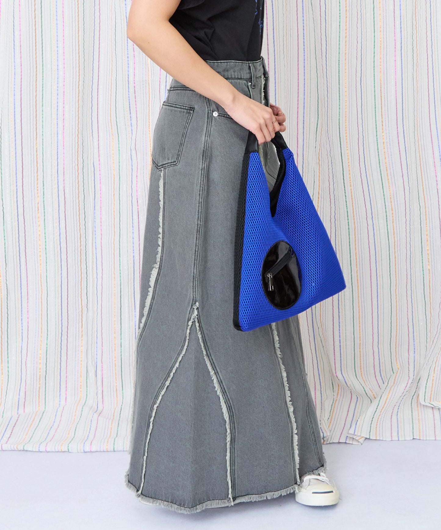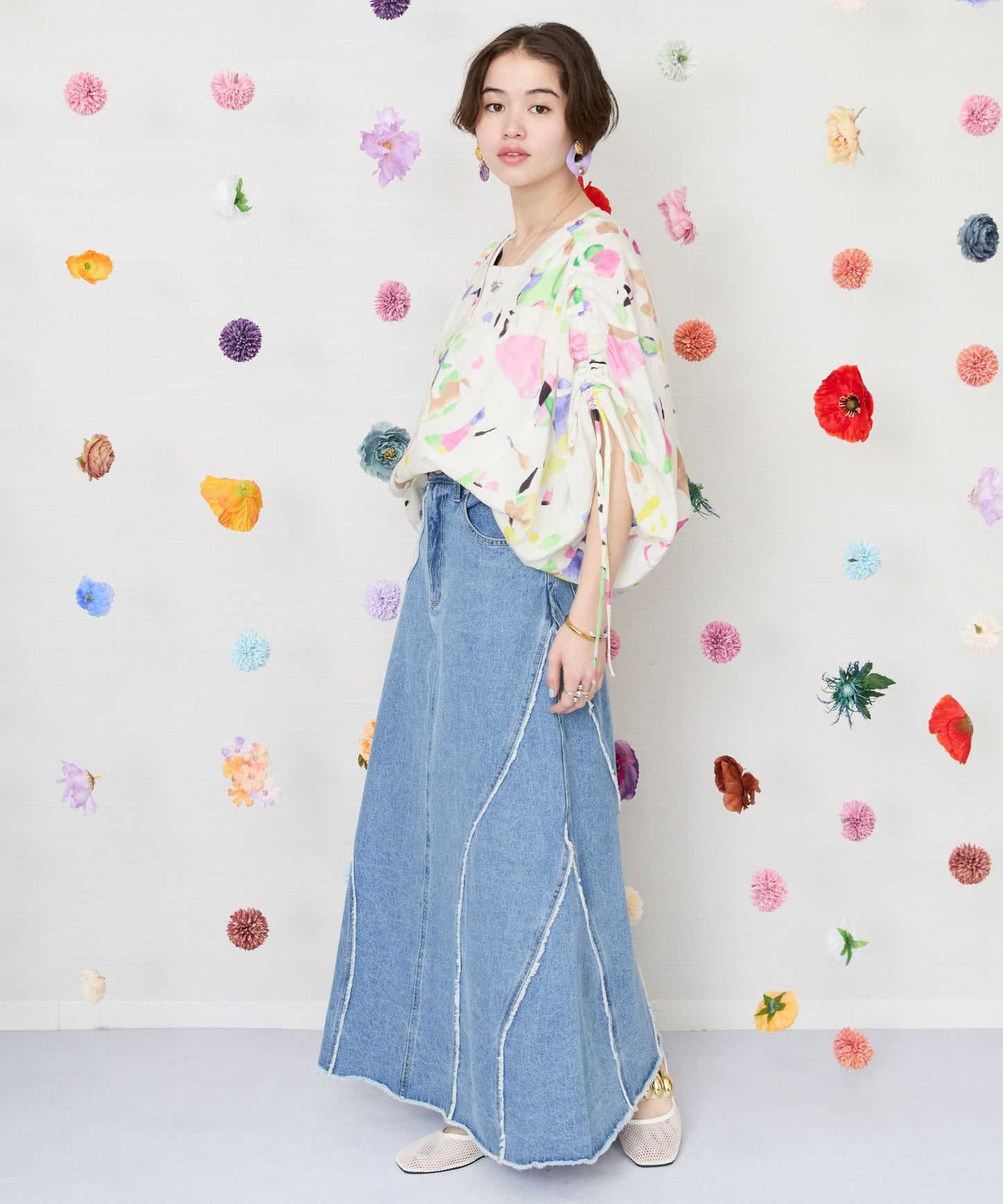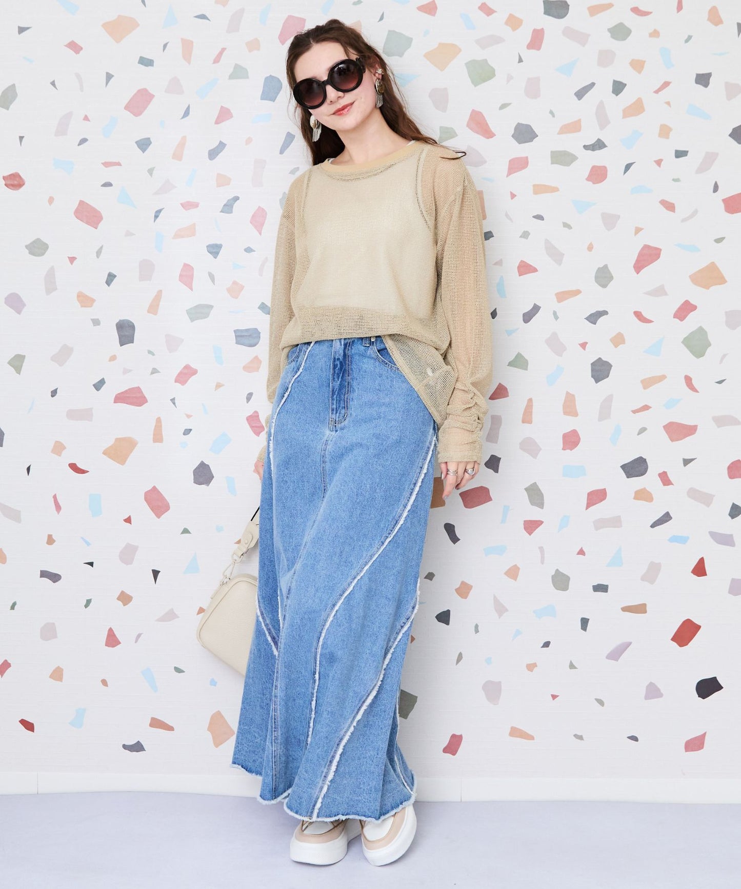 縦に切り替えたウェーブカッティングとフリンジが印象的なデニムスカート。