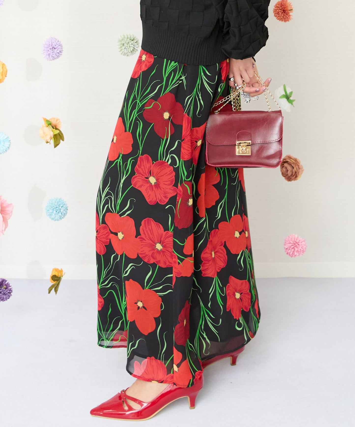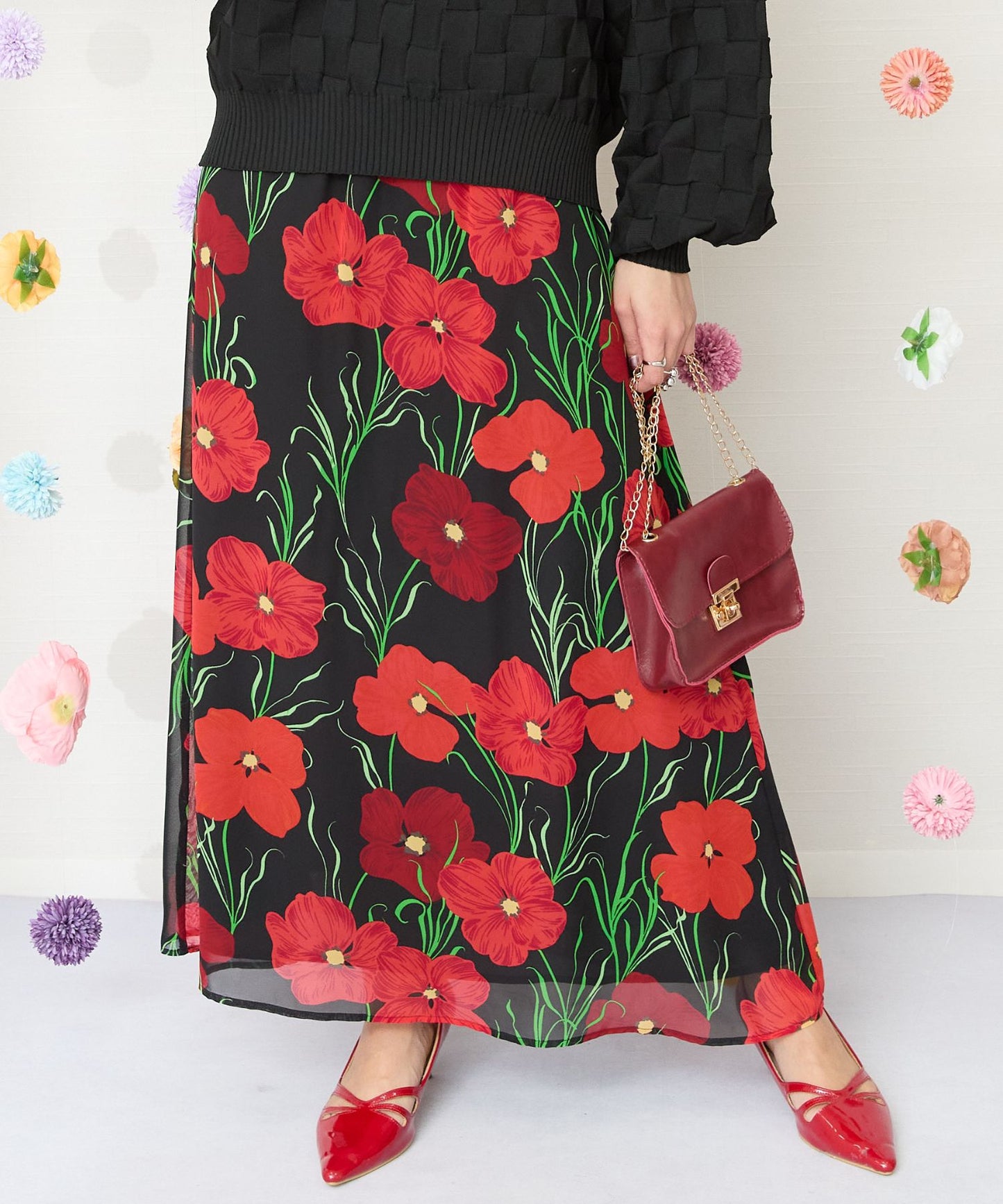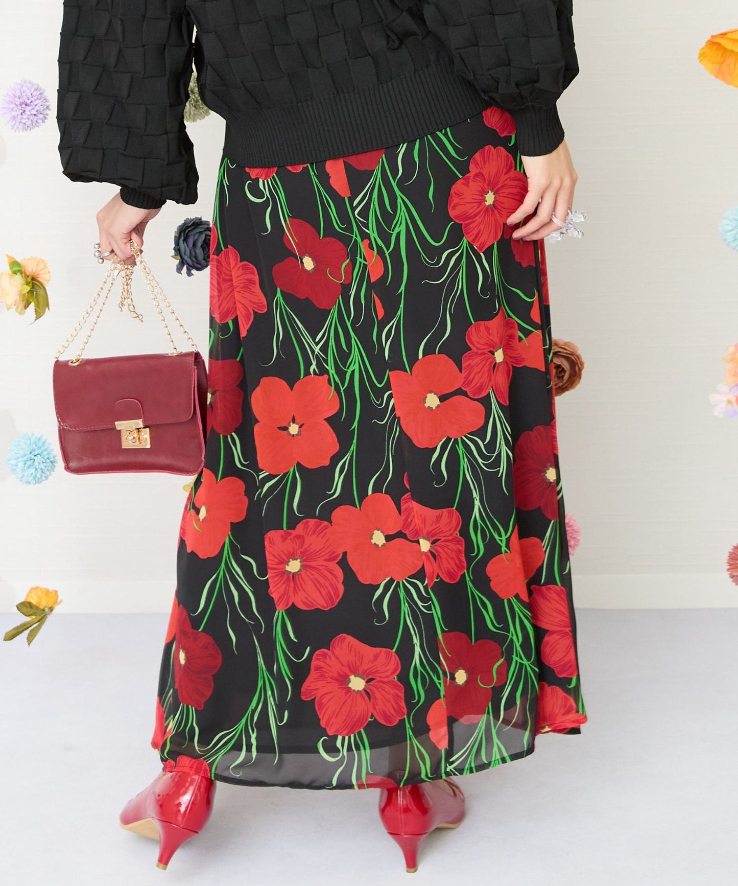 黒ベースに赤い花柄が映える、シックで華やかなスカート。