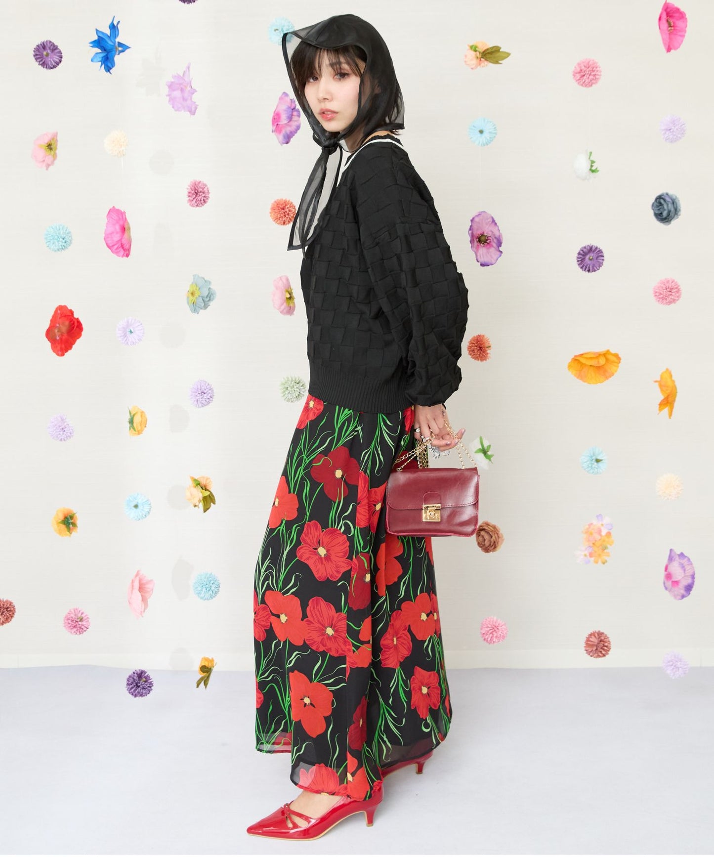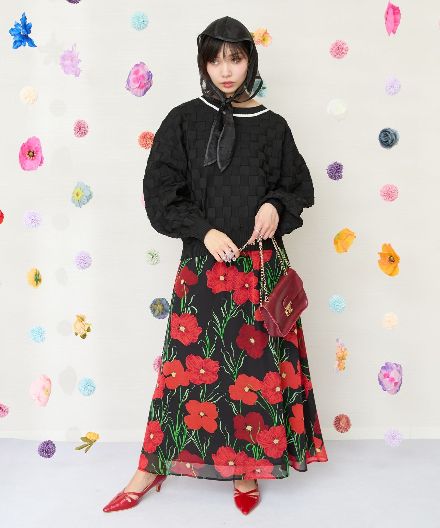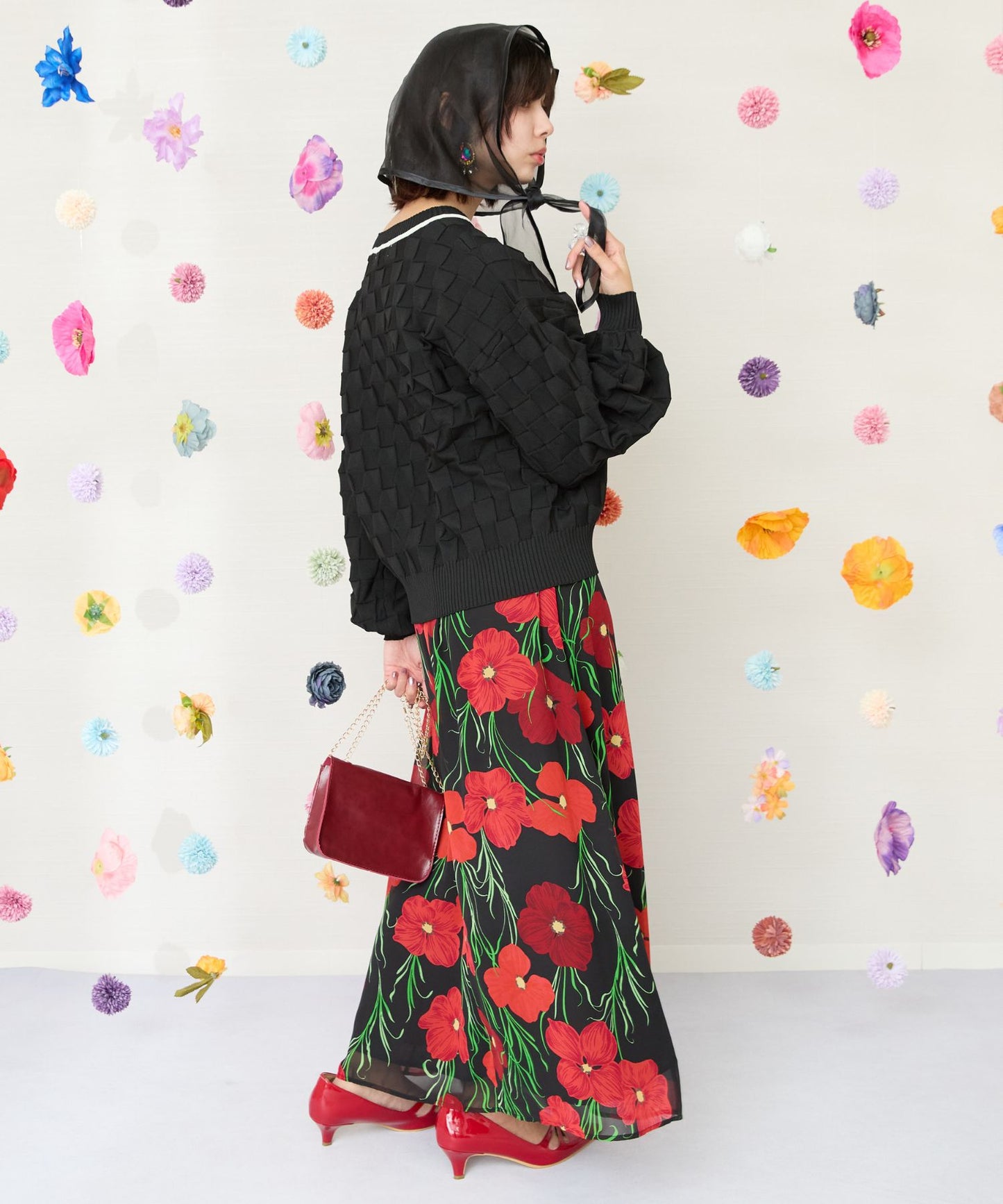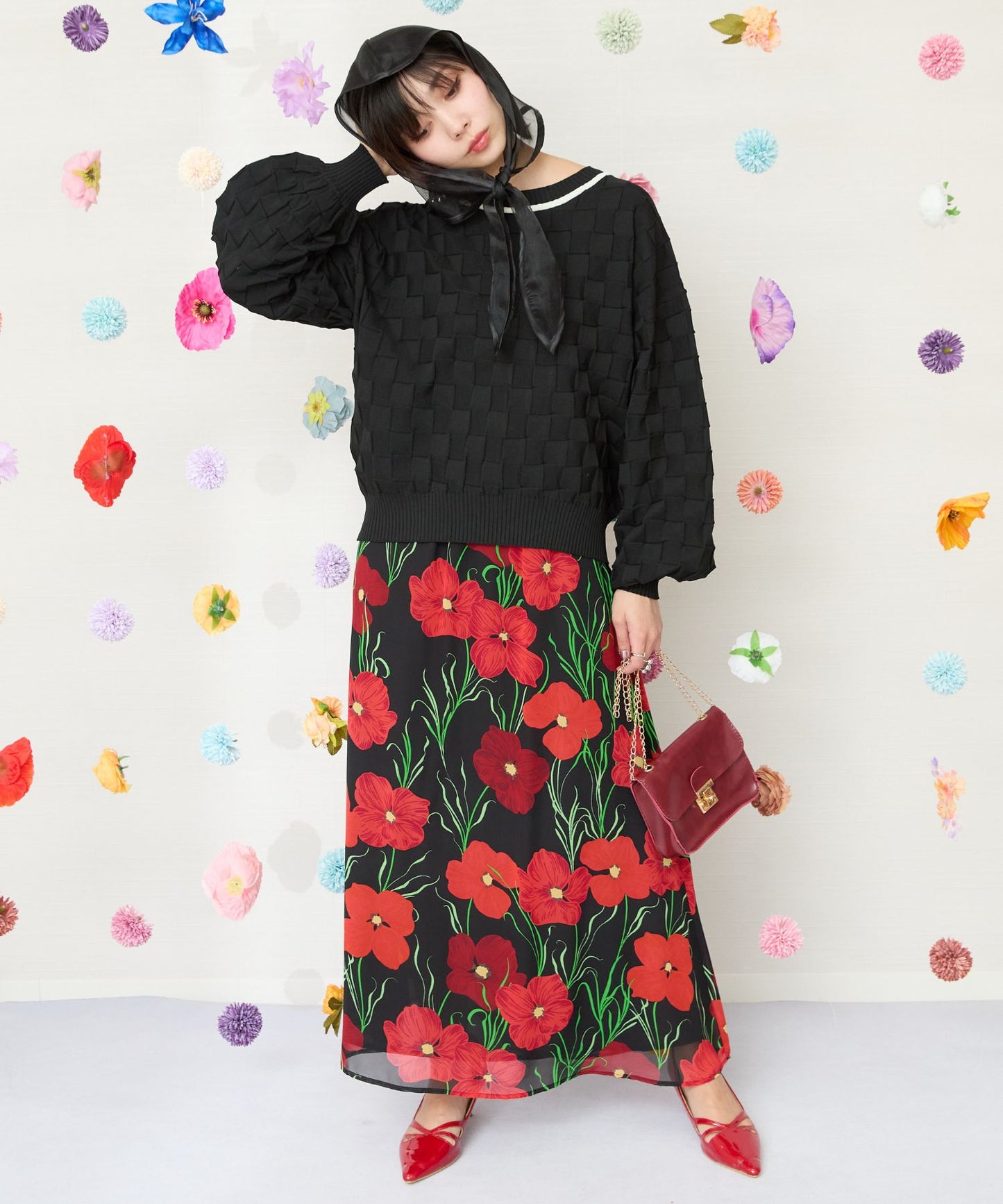 黒ベースに赤い花柄が映える、シックで華やかなスカート。